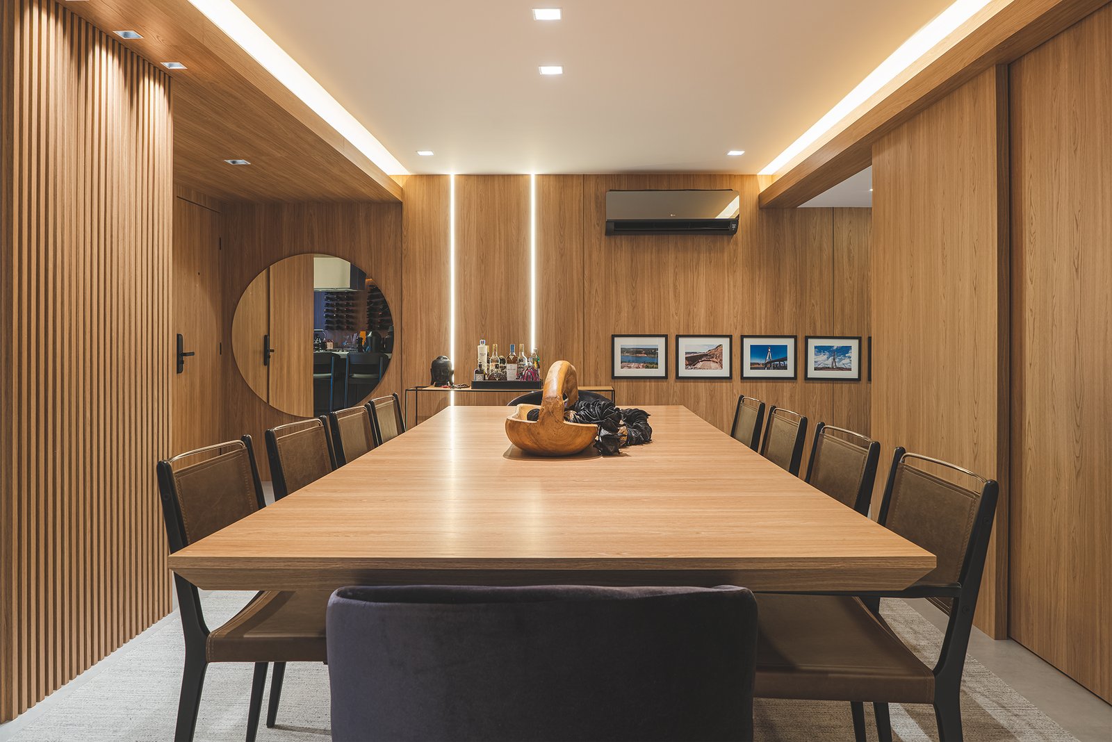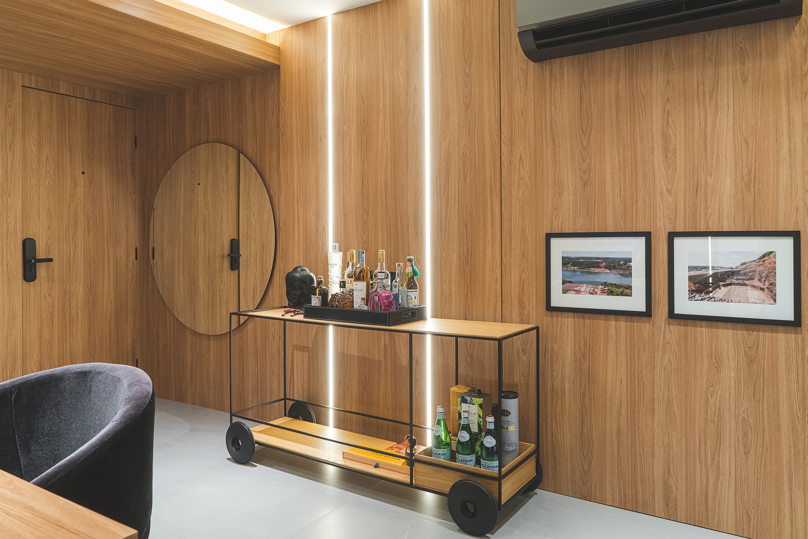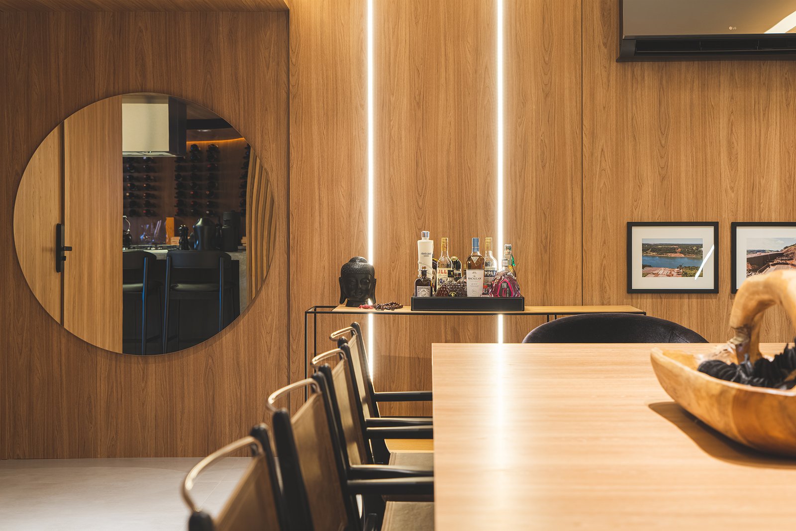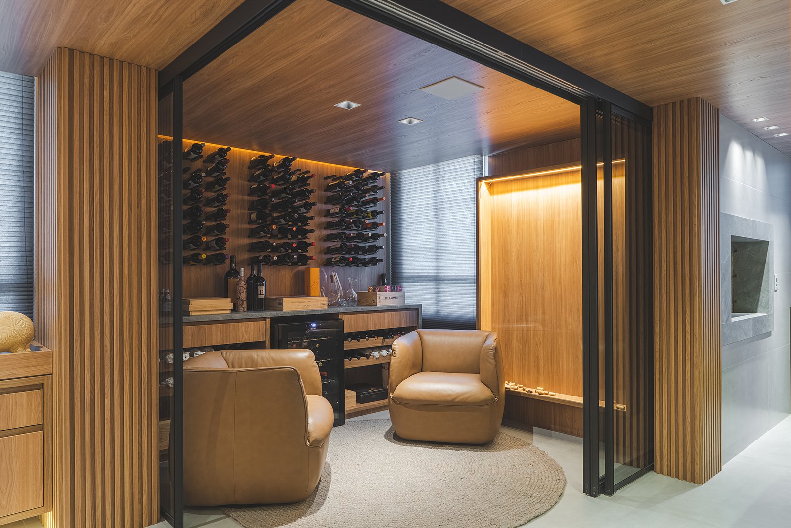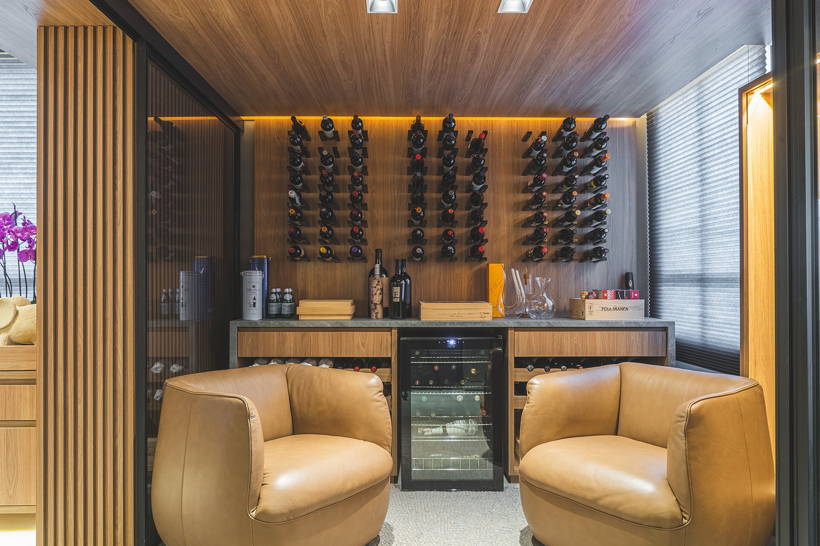 Sofisticação, beleza e exuberância num projeto com paleta autoral com móveis assinados e cheio de requinte. A adega do projeto 902 foi projetada como um espaço acolhedor e sofisticado, pensado para momentos de pausa e apreciação.