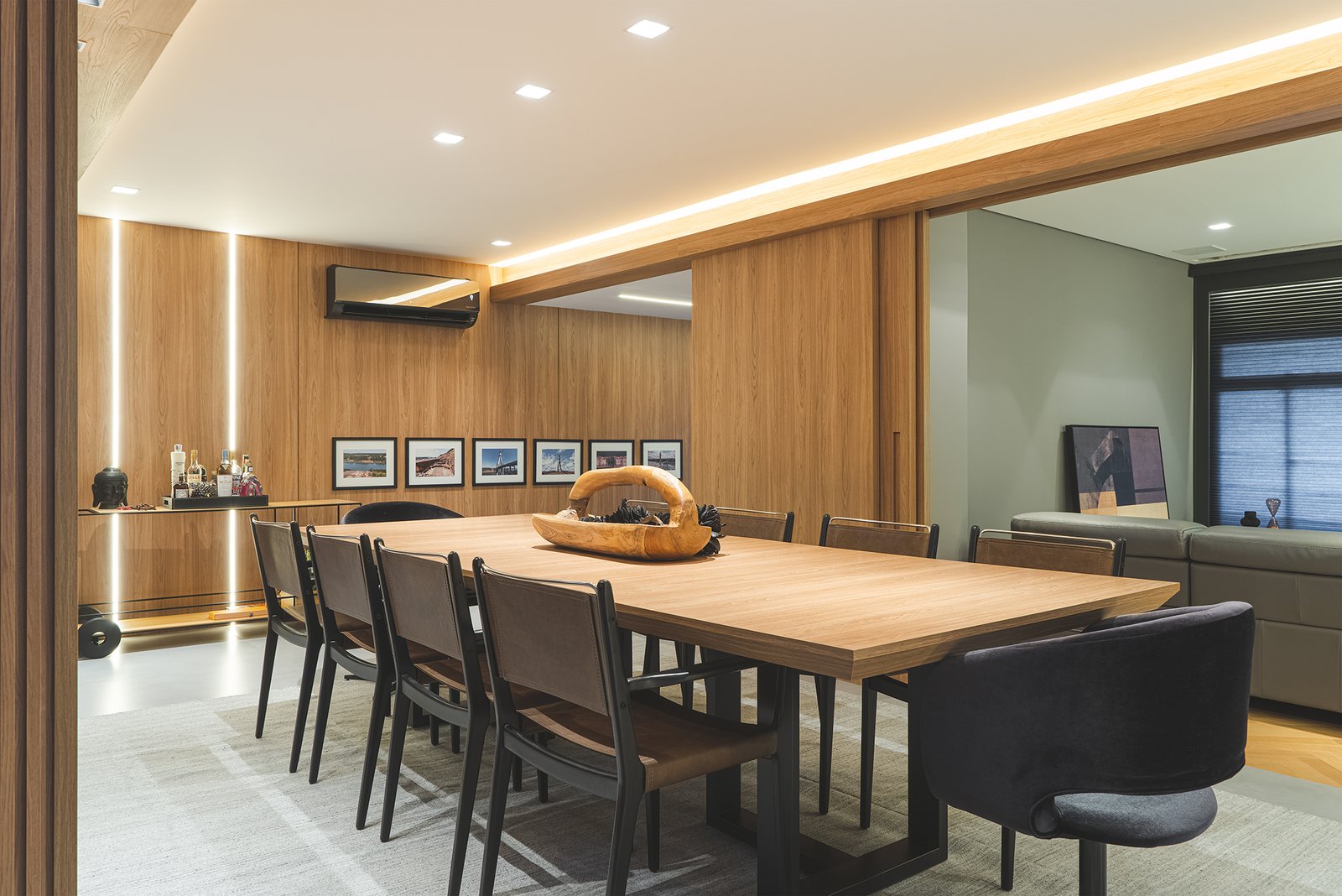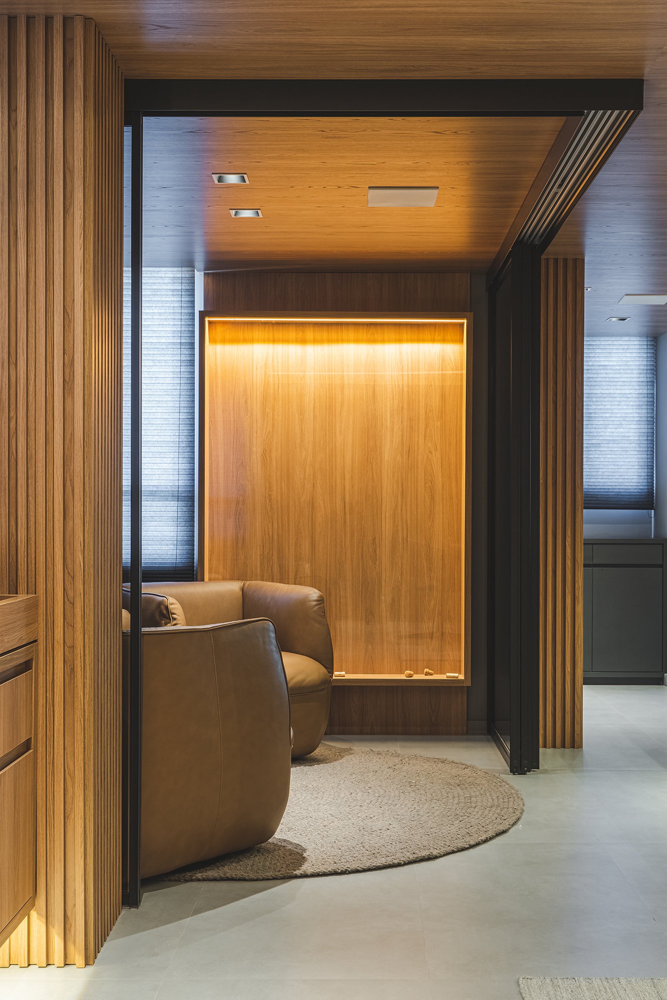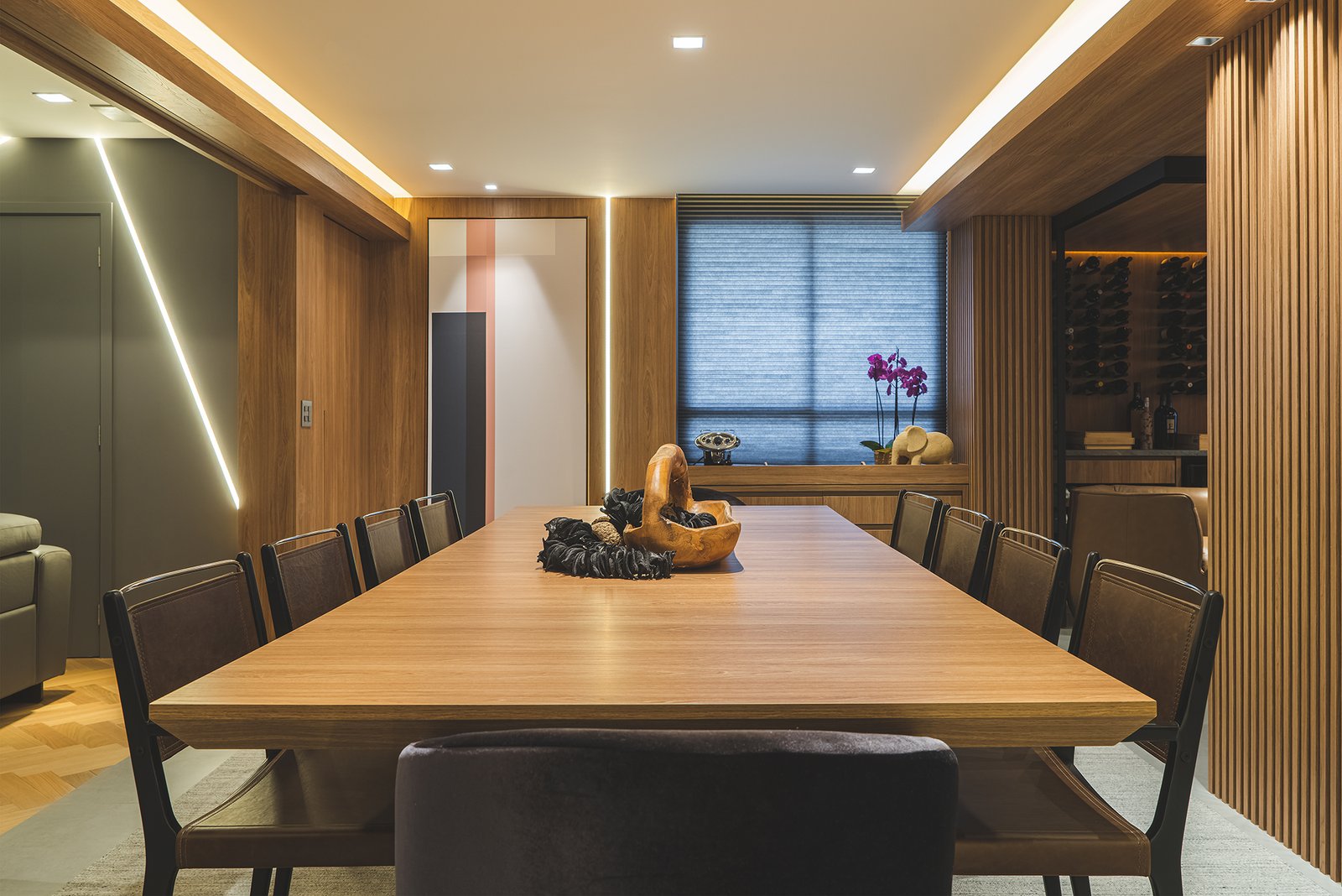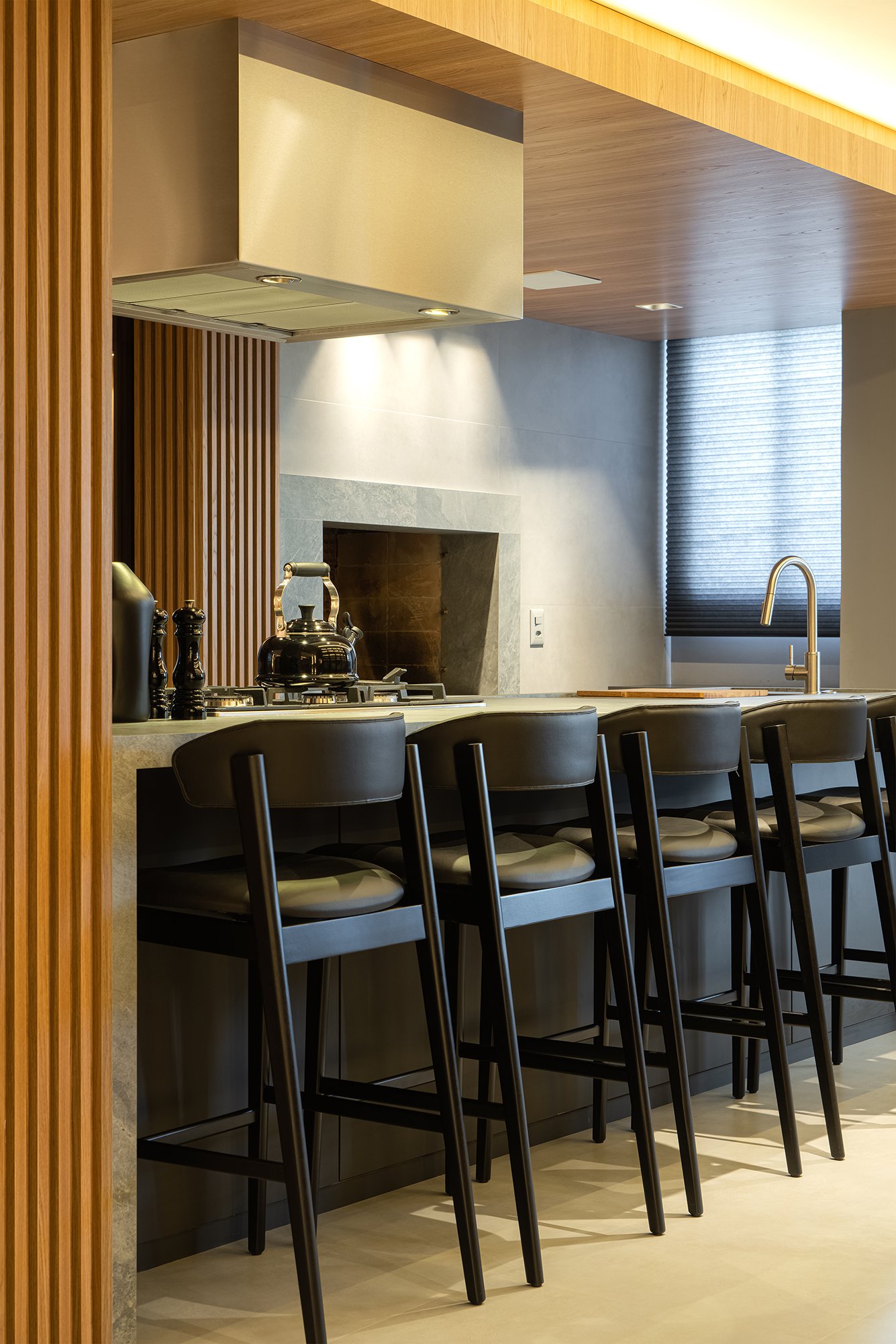 Sofisticação, beleza e exuberância num projeto com paleta autoral com móveis assinados e cheio de requinte. A adega do projeto 902 foi projetada como um espaço acolhedor e sofisticado, pensado para momentos de pausa e apreciação.