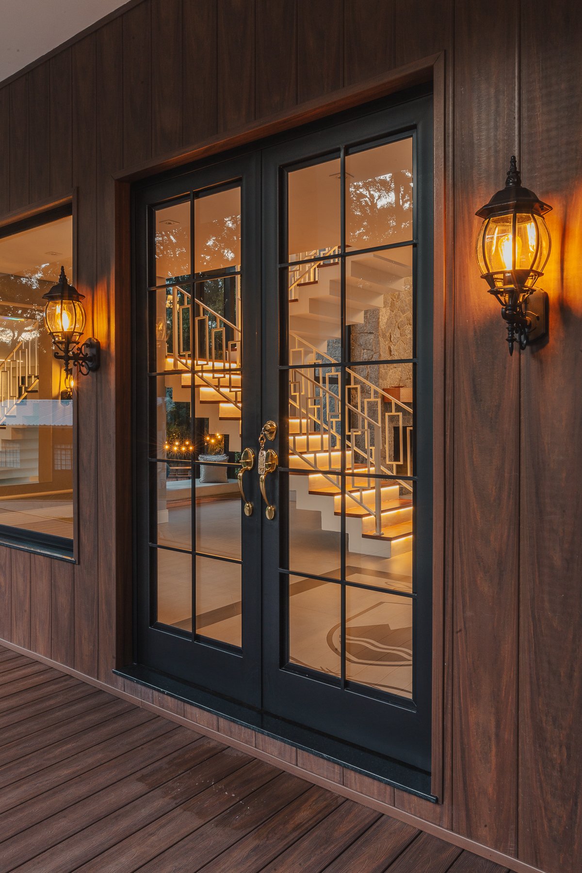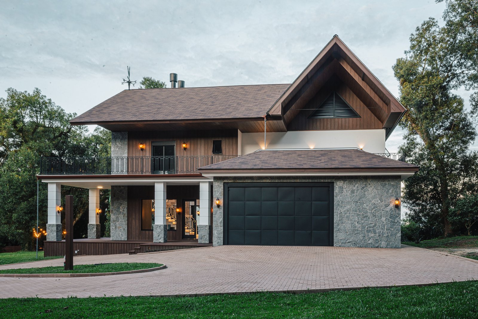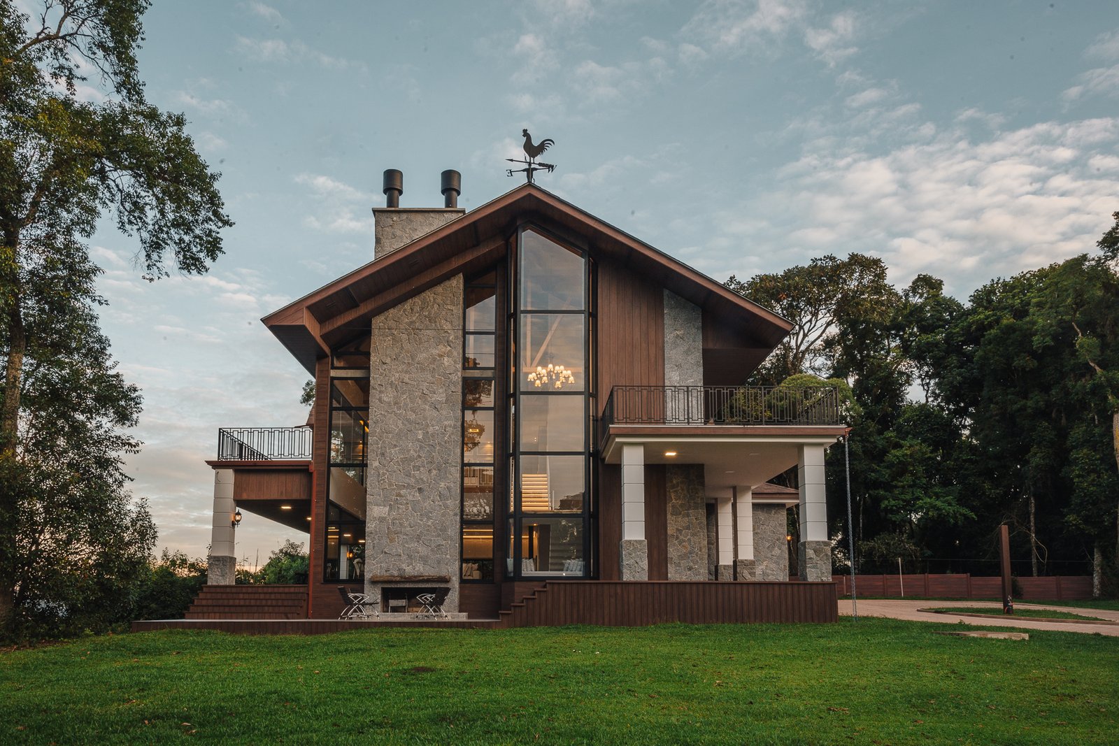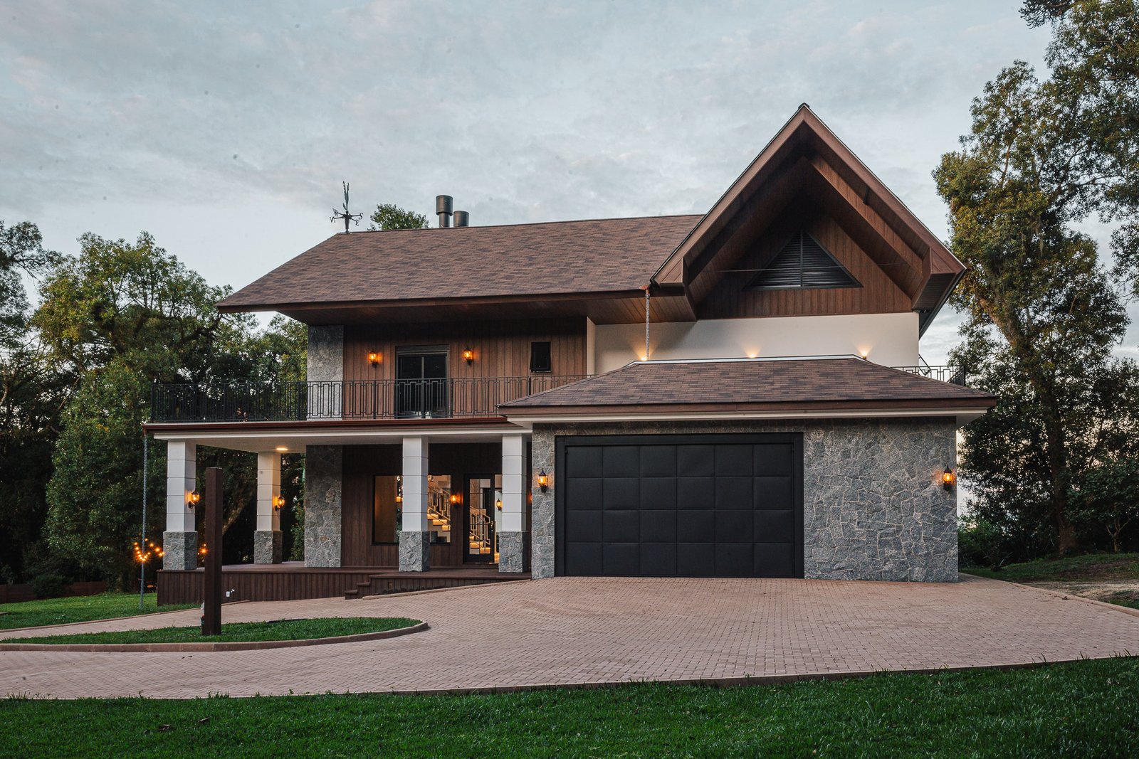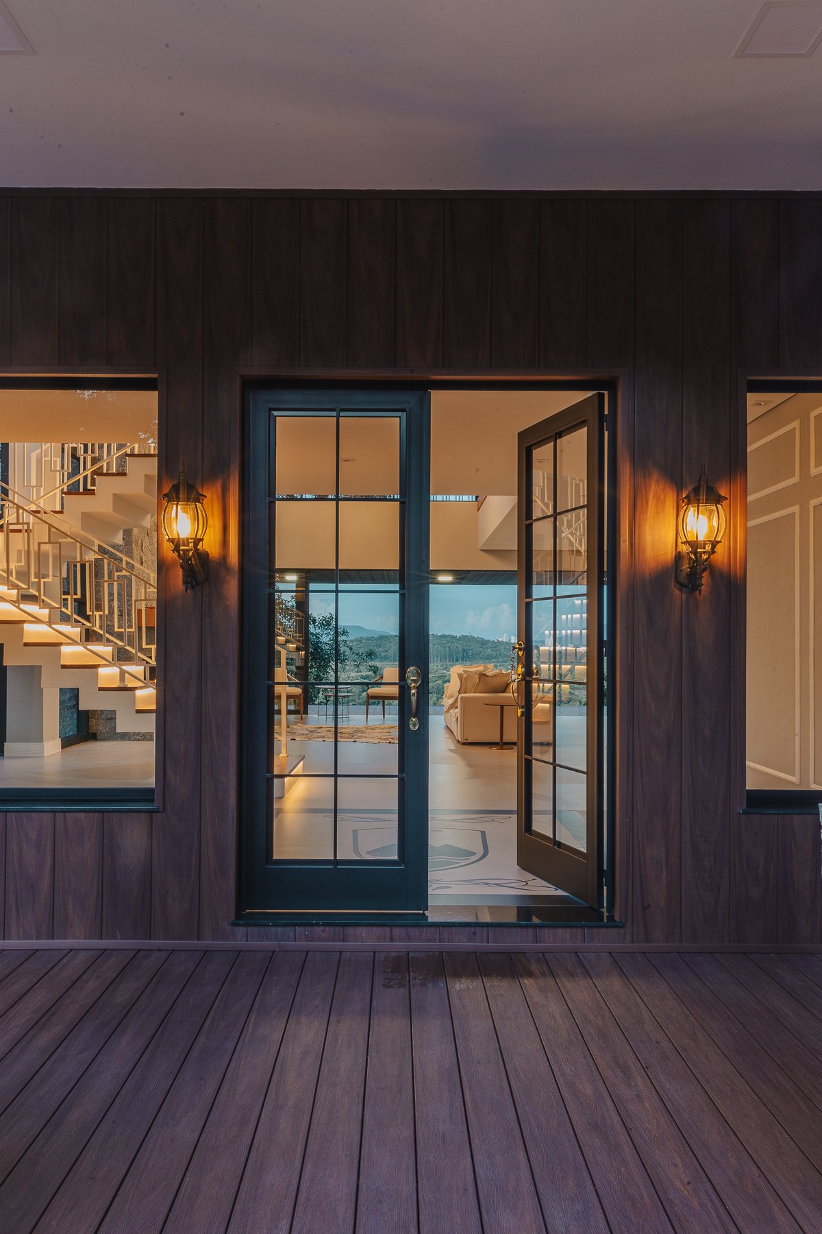 Destaca-se pela luminotécnica noturna, que valoriza cada elemento arquitetônico e potencializa a atmosfera acolhedora da residência.