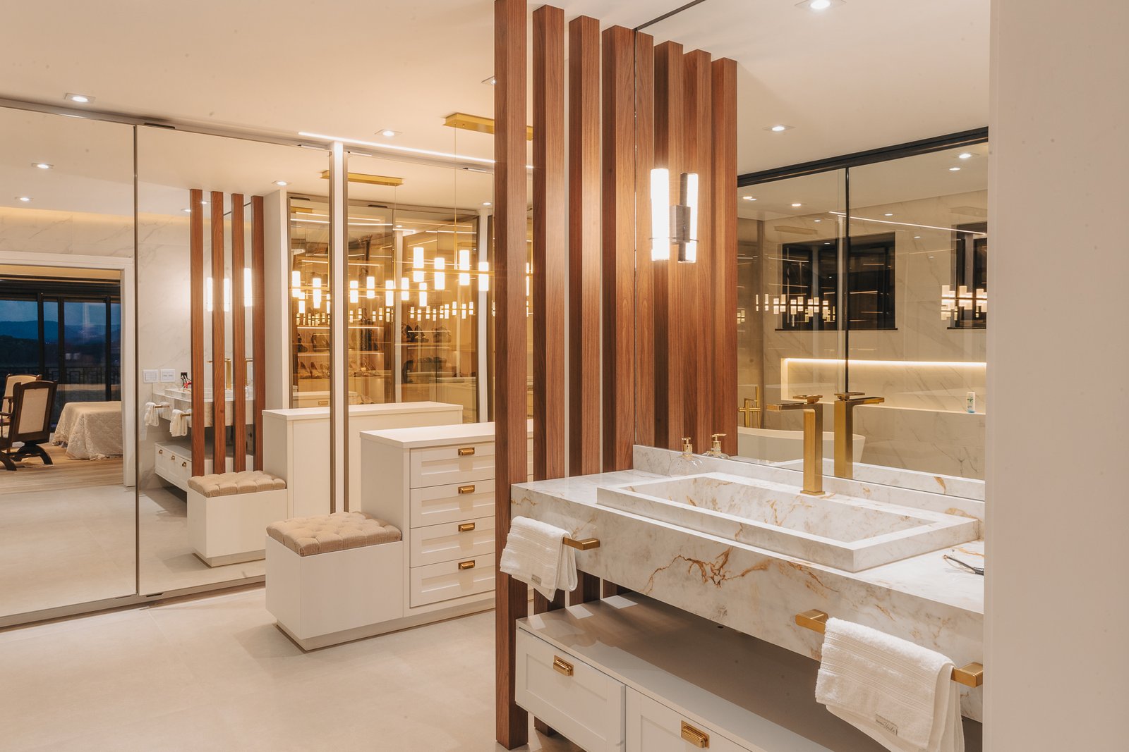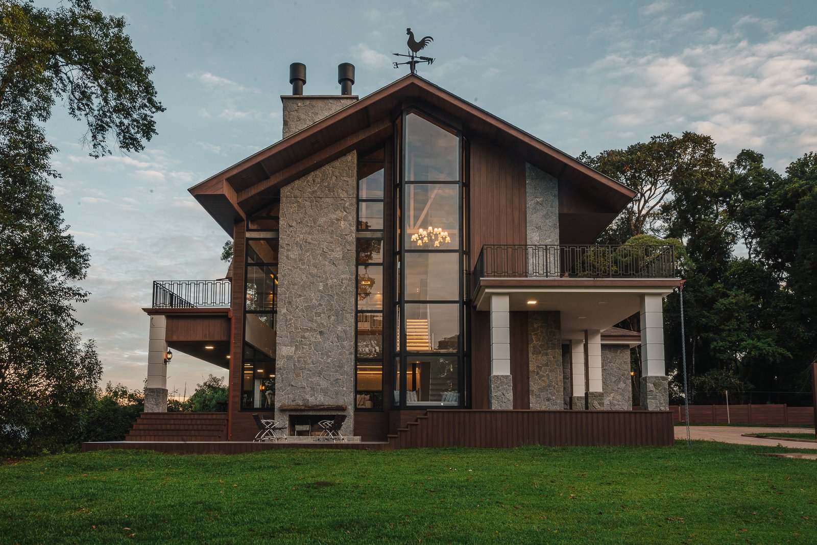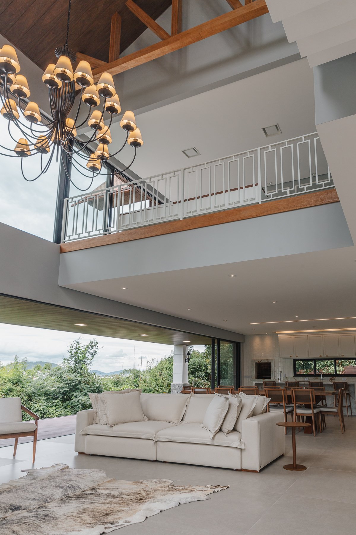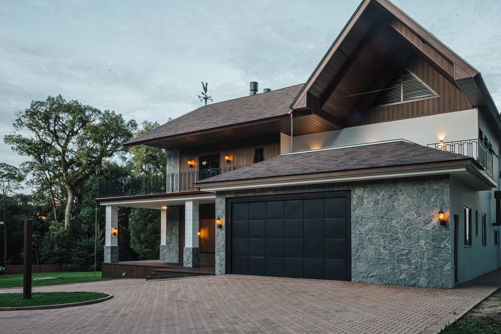 Destaca-se pela luminotécnica noturna, que valoriza cada elemento arquitetônico e potencializa a atmosfera acolhedora da residência.