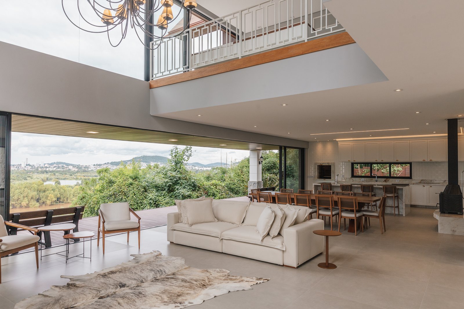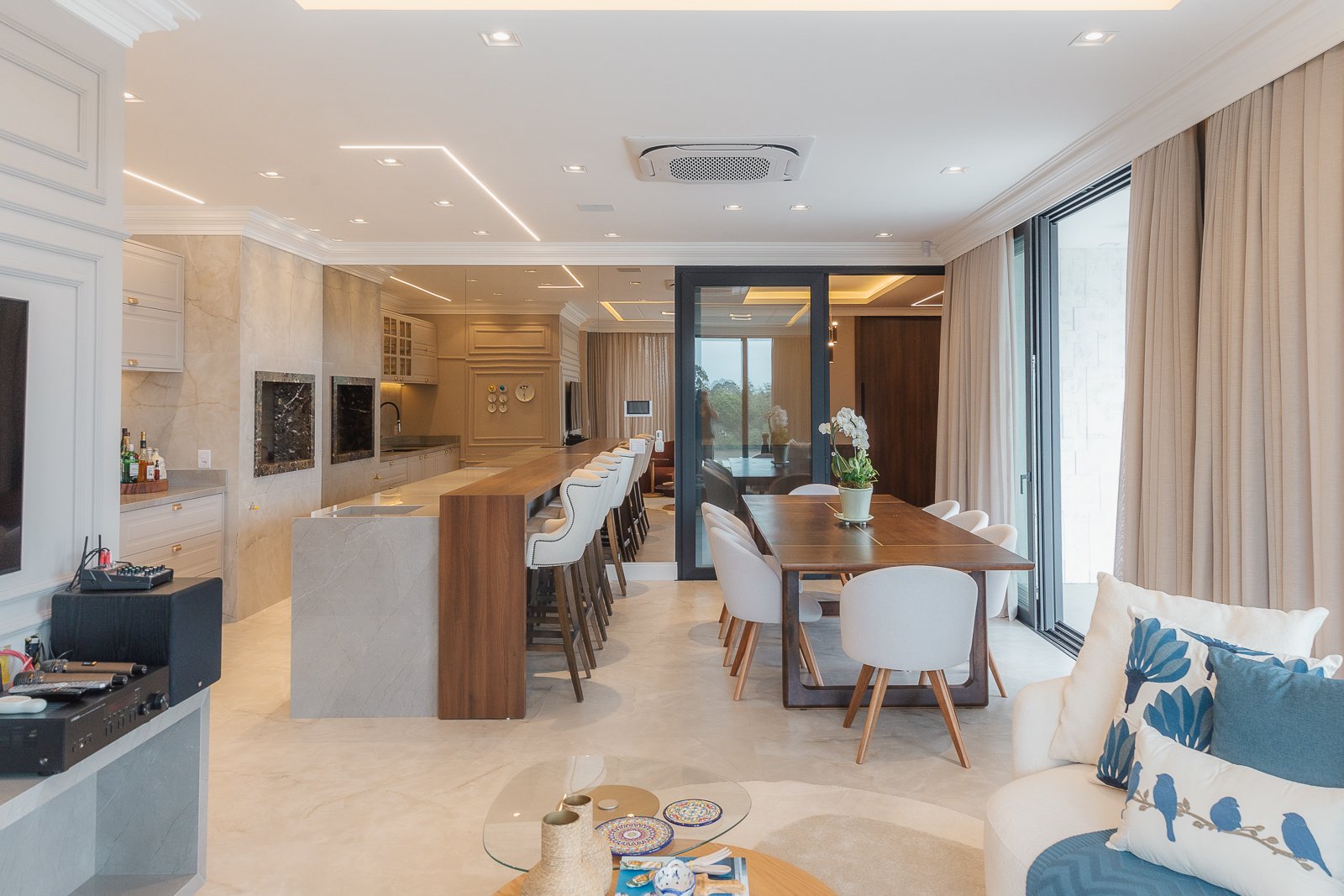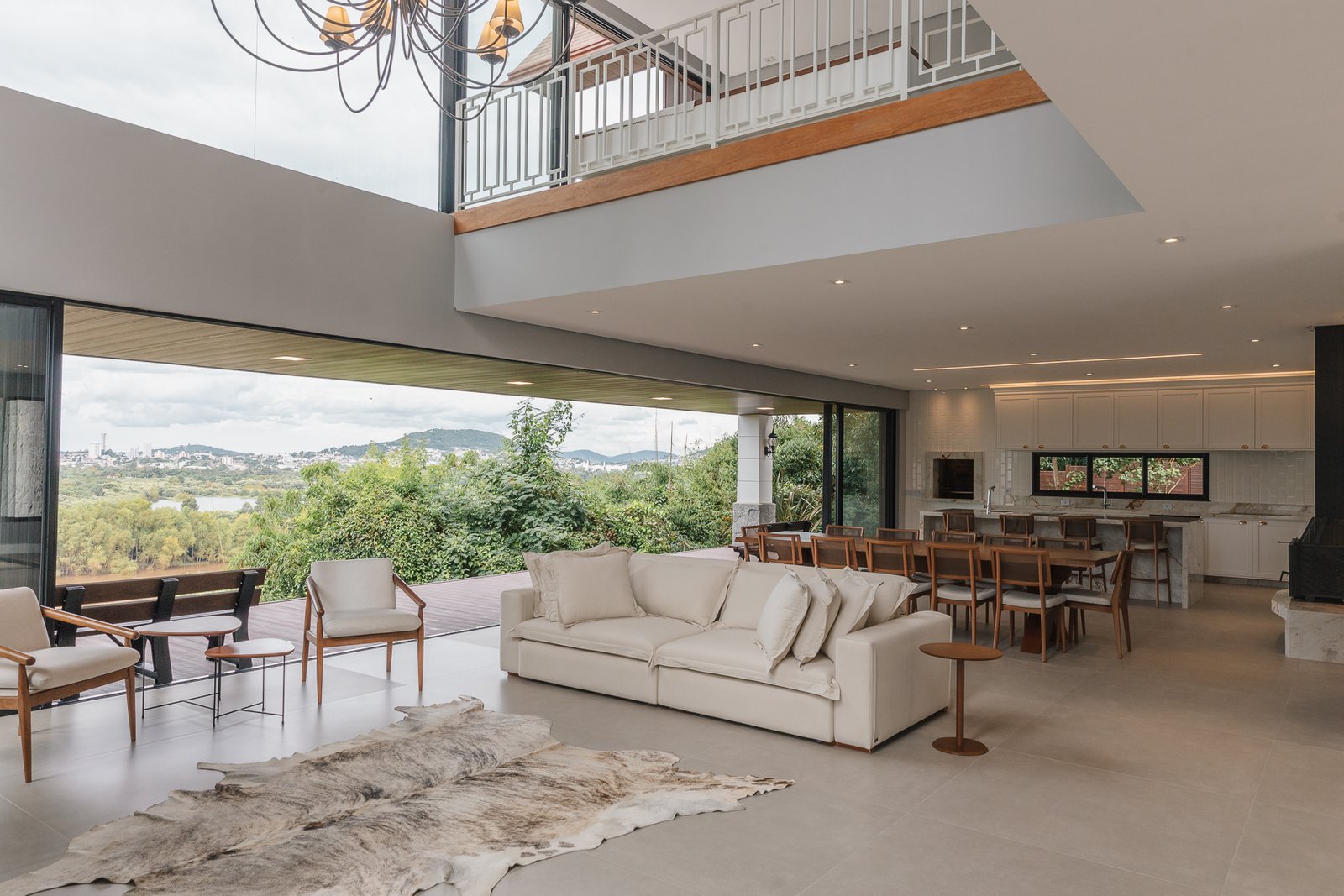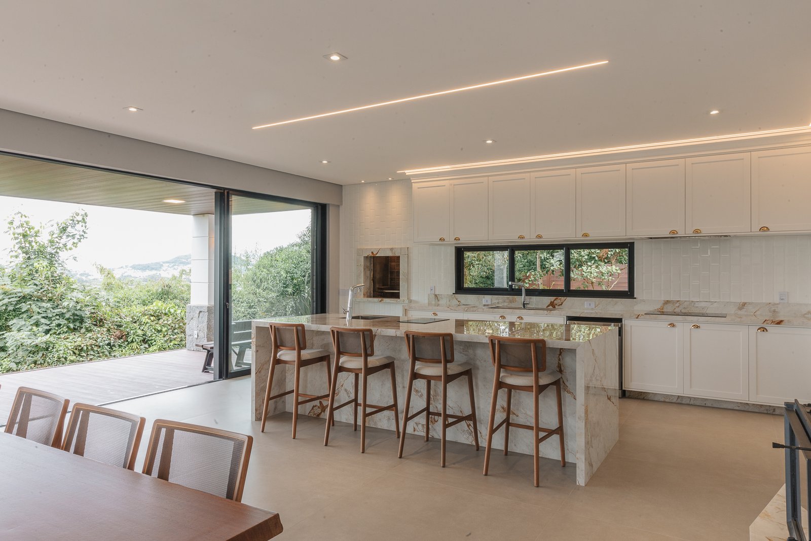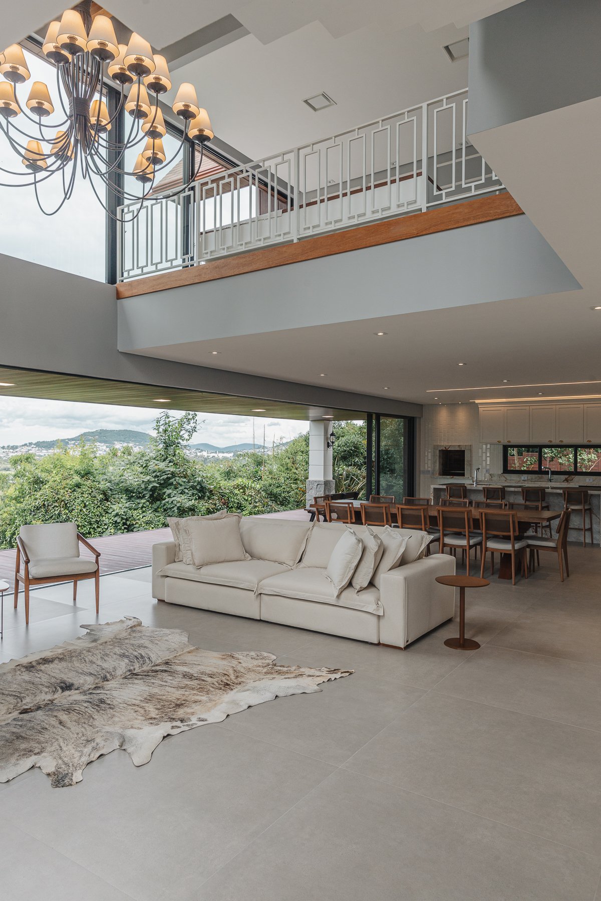 Destaca-se pela luminotécnica noturna, que valoriza cada elemento arquitetônico e potencializa a atmosfera acolhedora da residência.