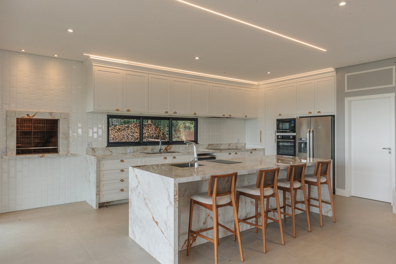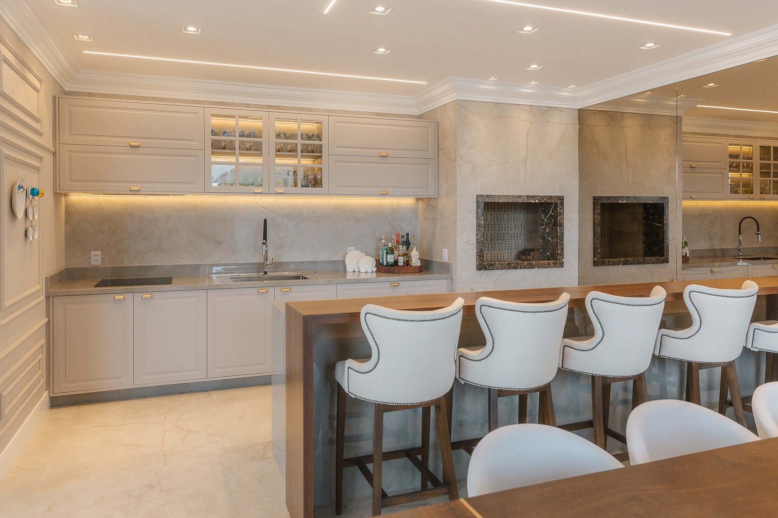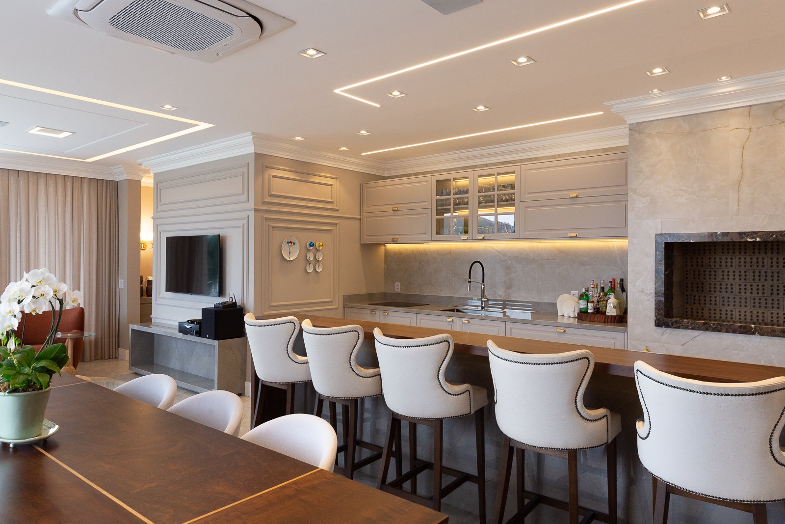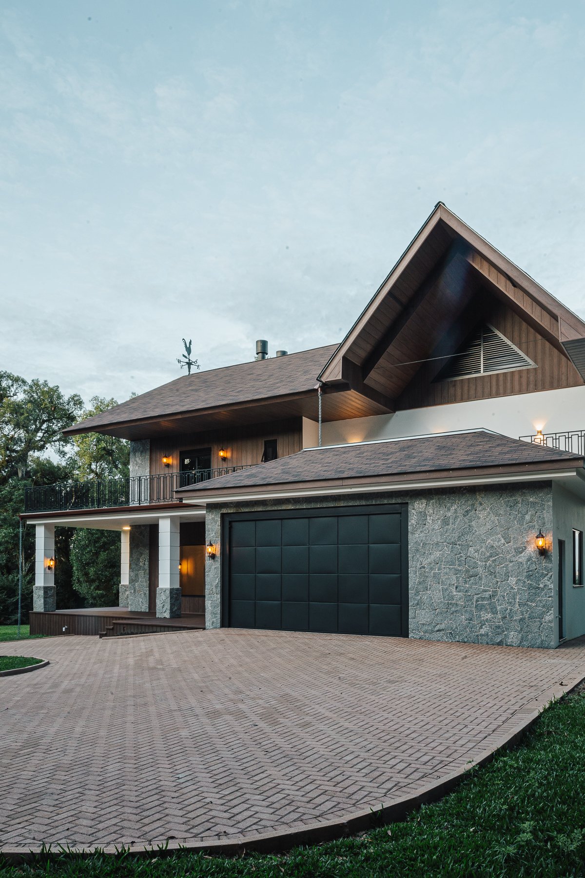 Destaca-se pela luminotécnica noturna, que valoriza cada elemento arquitetônico e potencializa a atmosfera acolhedora da residência.