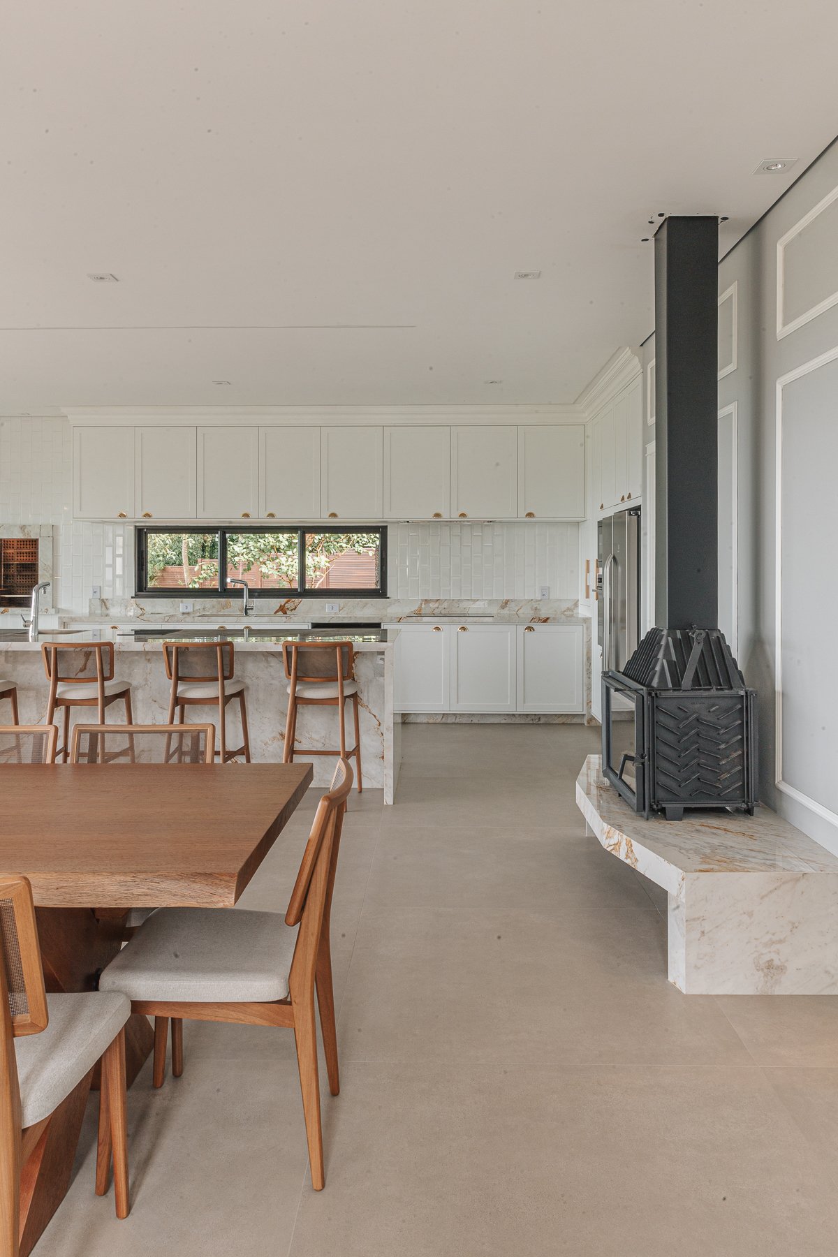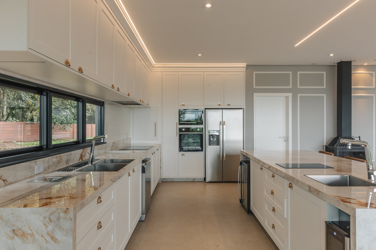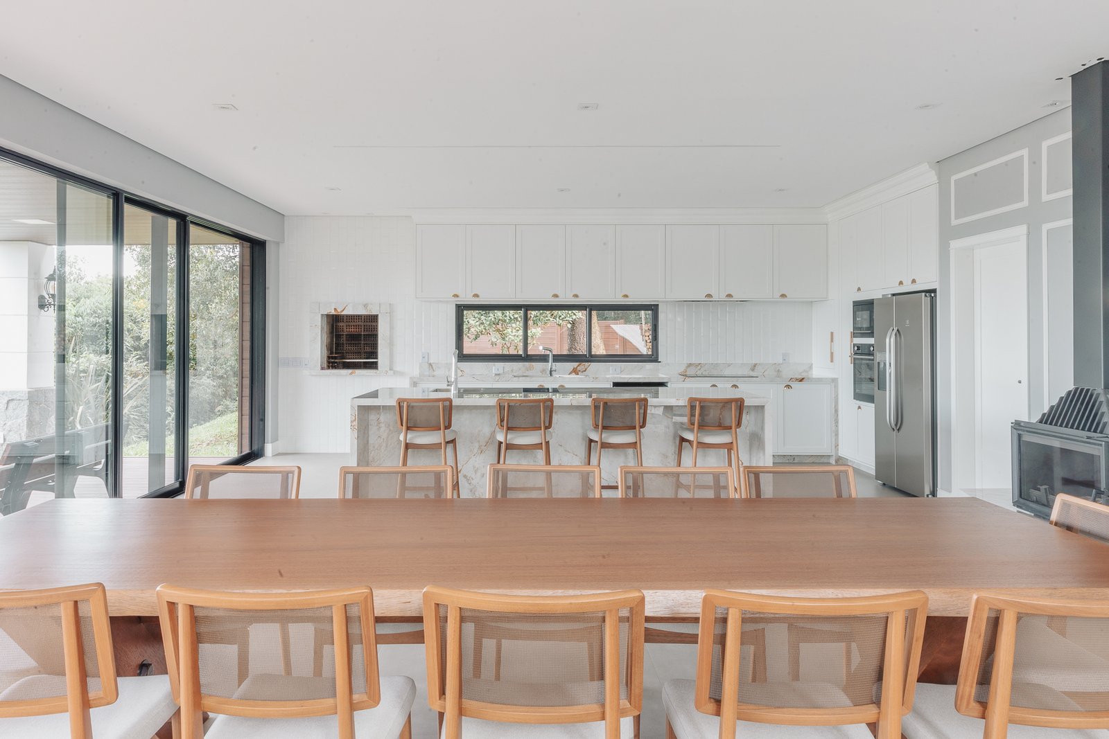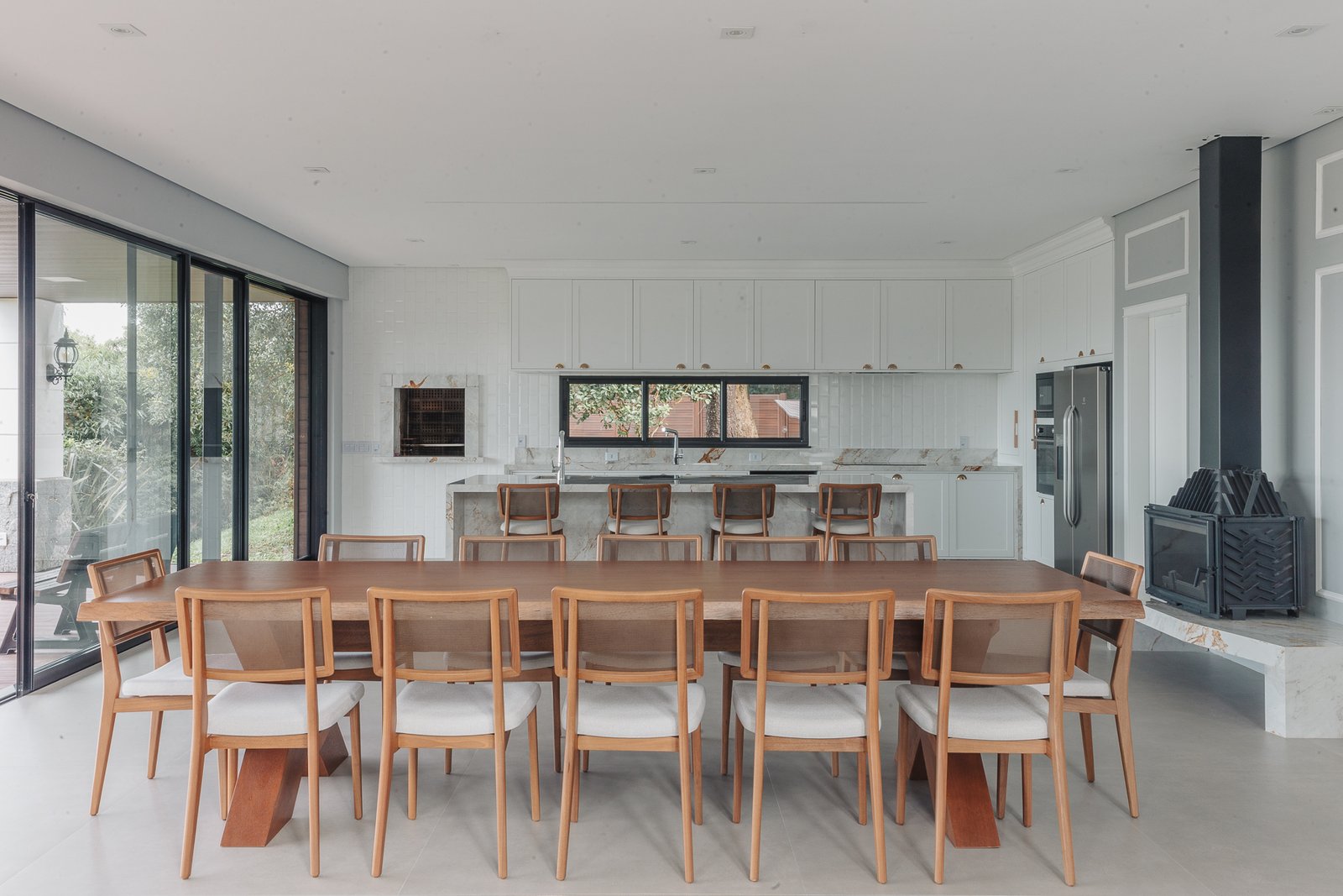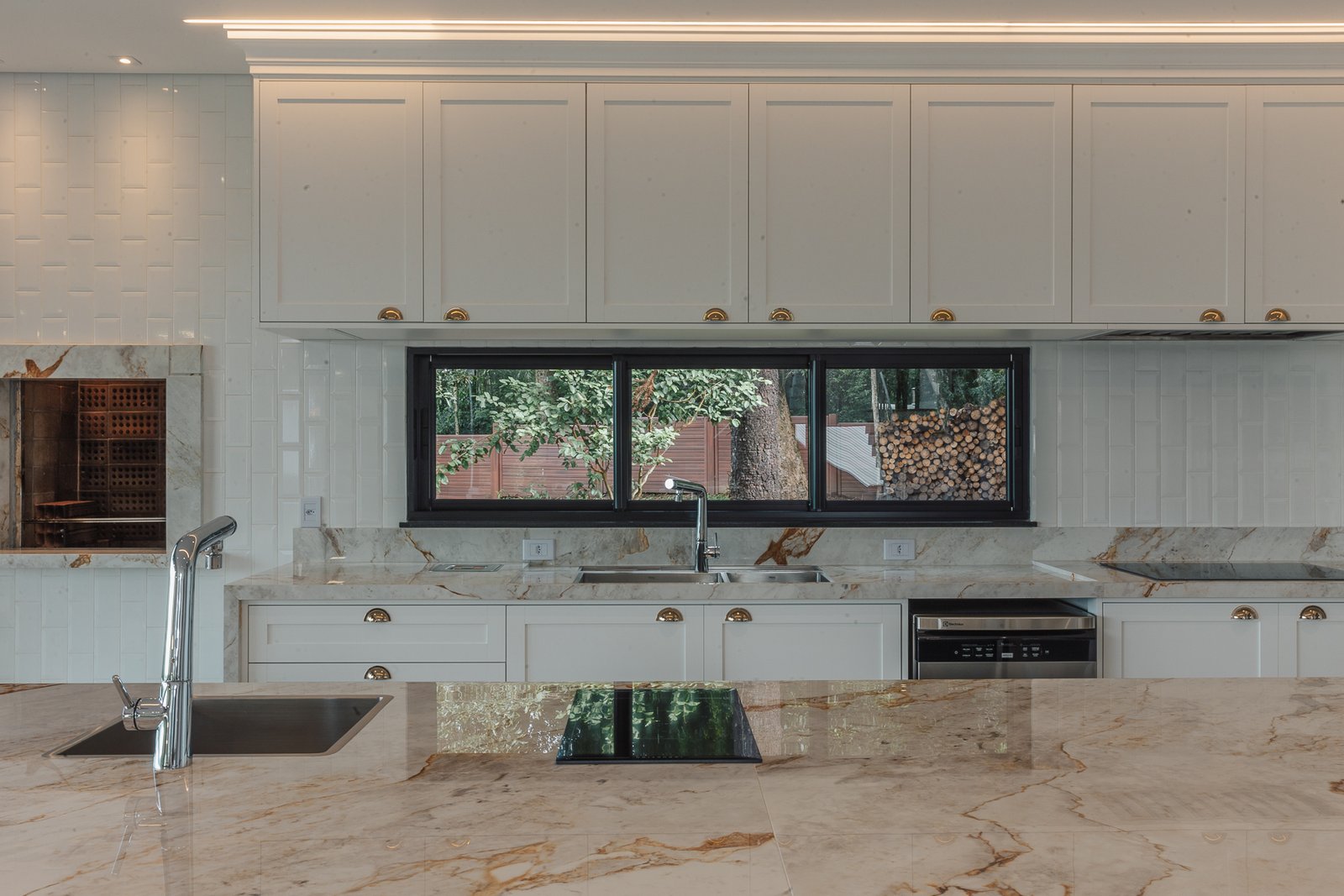 Destaca-se pela luminotécnica noturna, que valoriza cada elemento arquitetônico e potencializa a atmosfera acolhedora da residência.