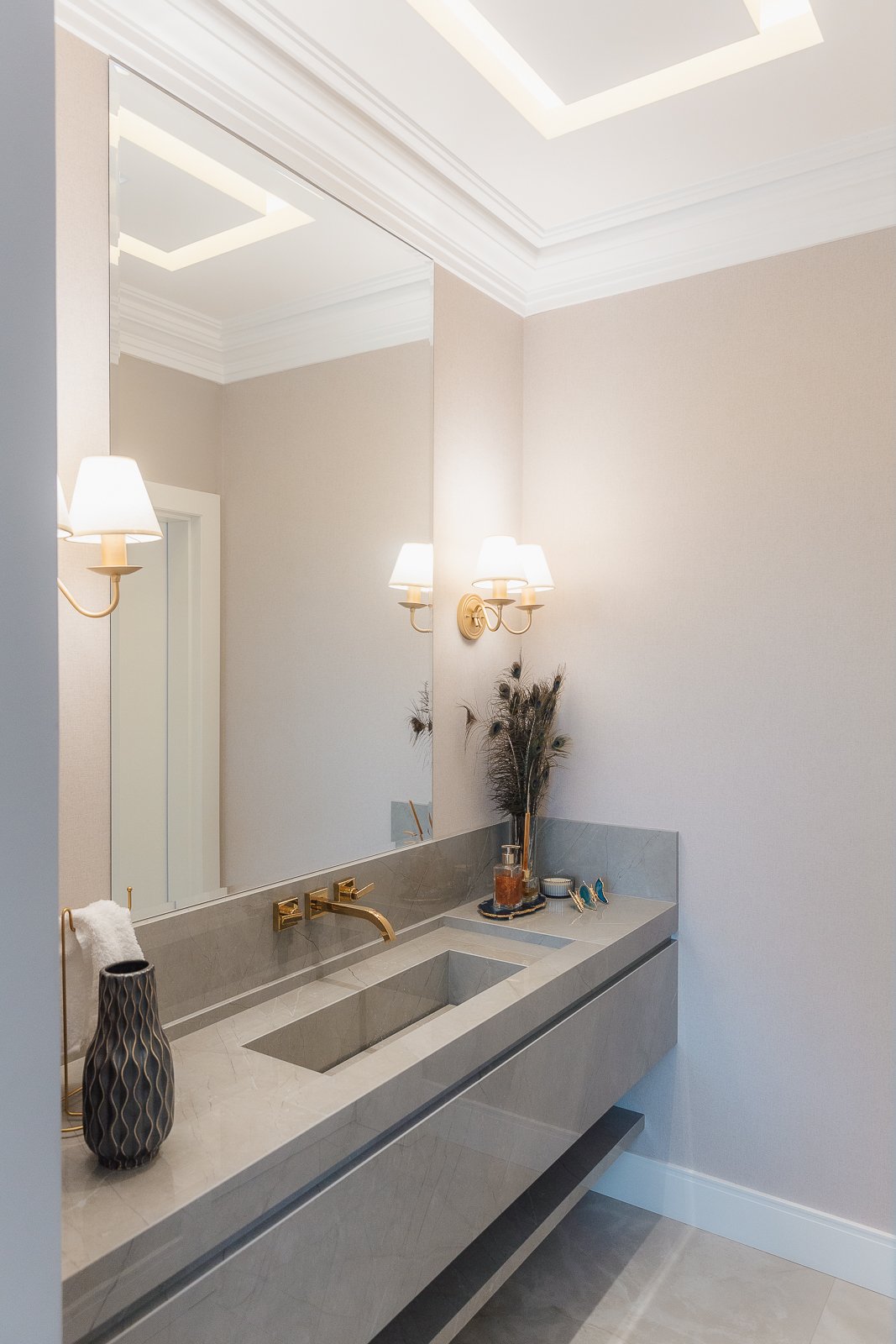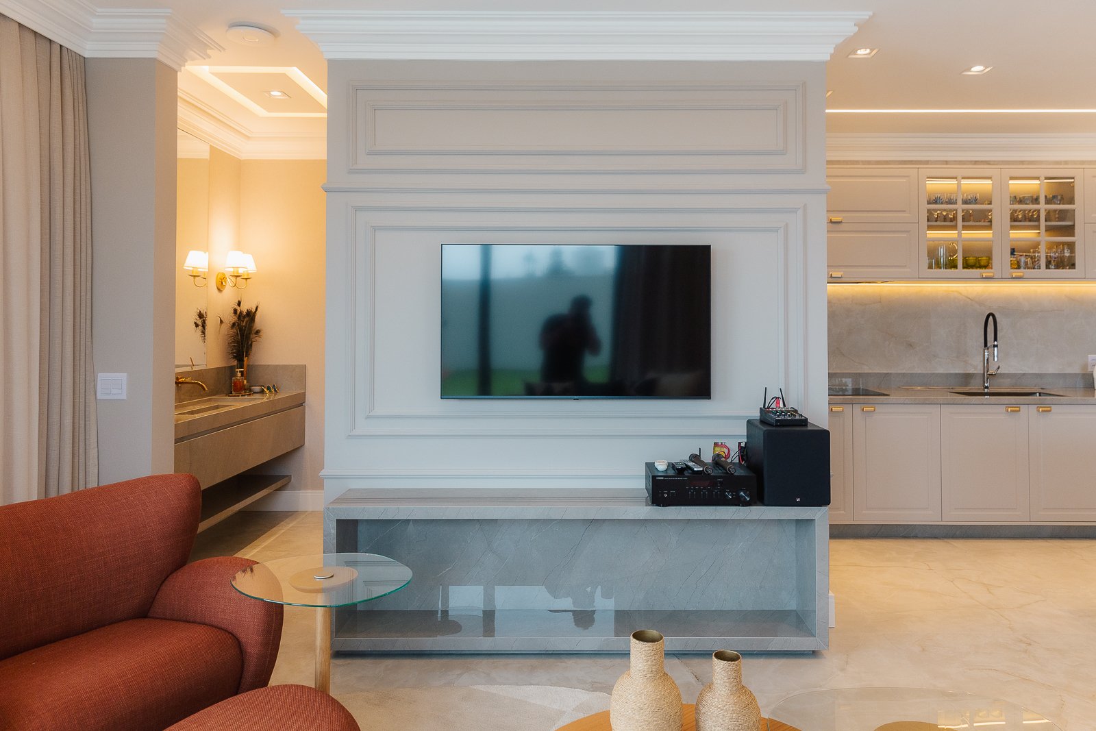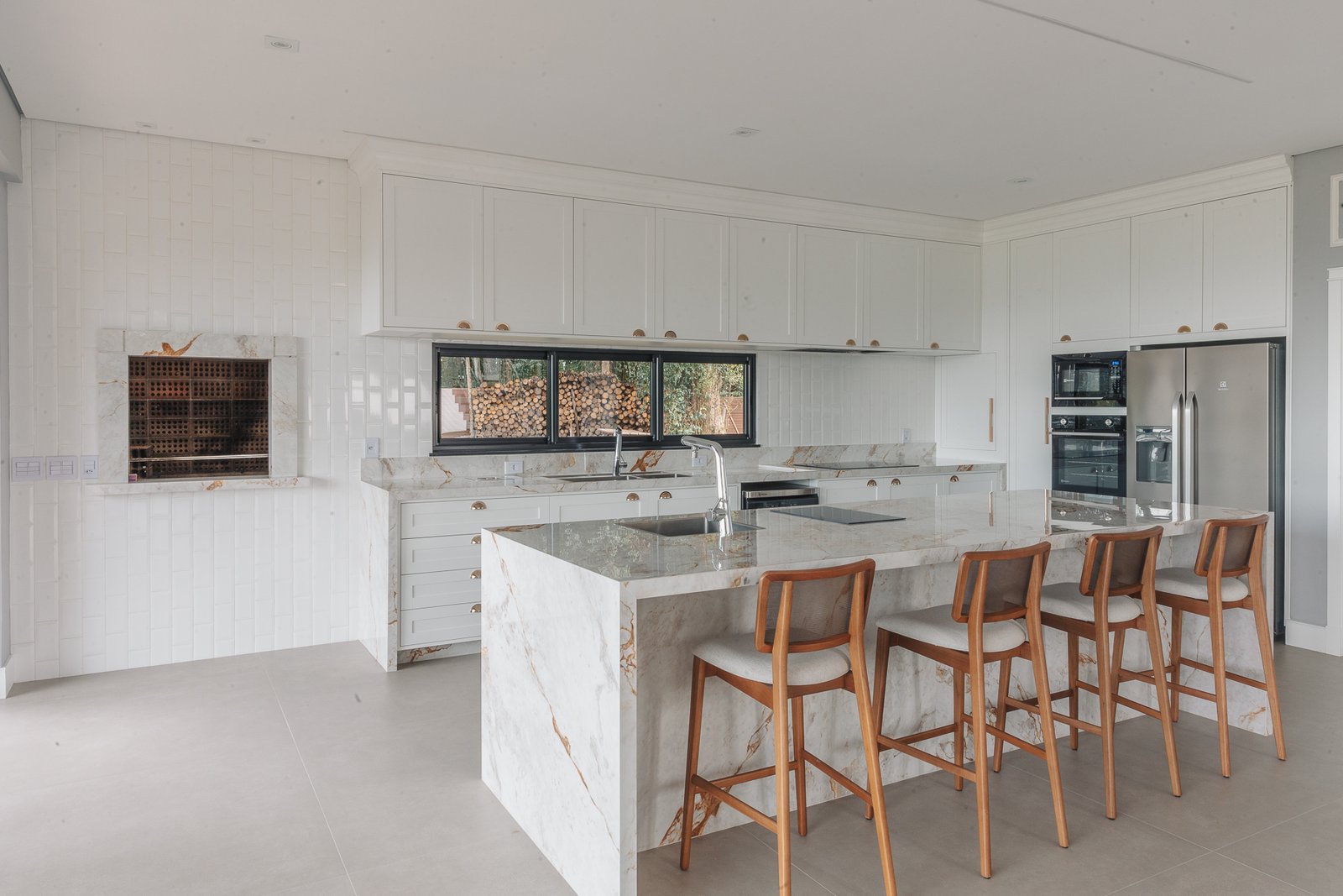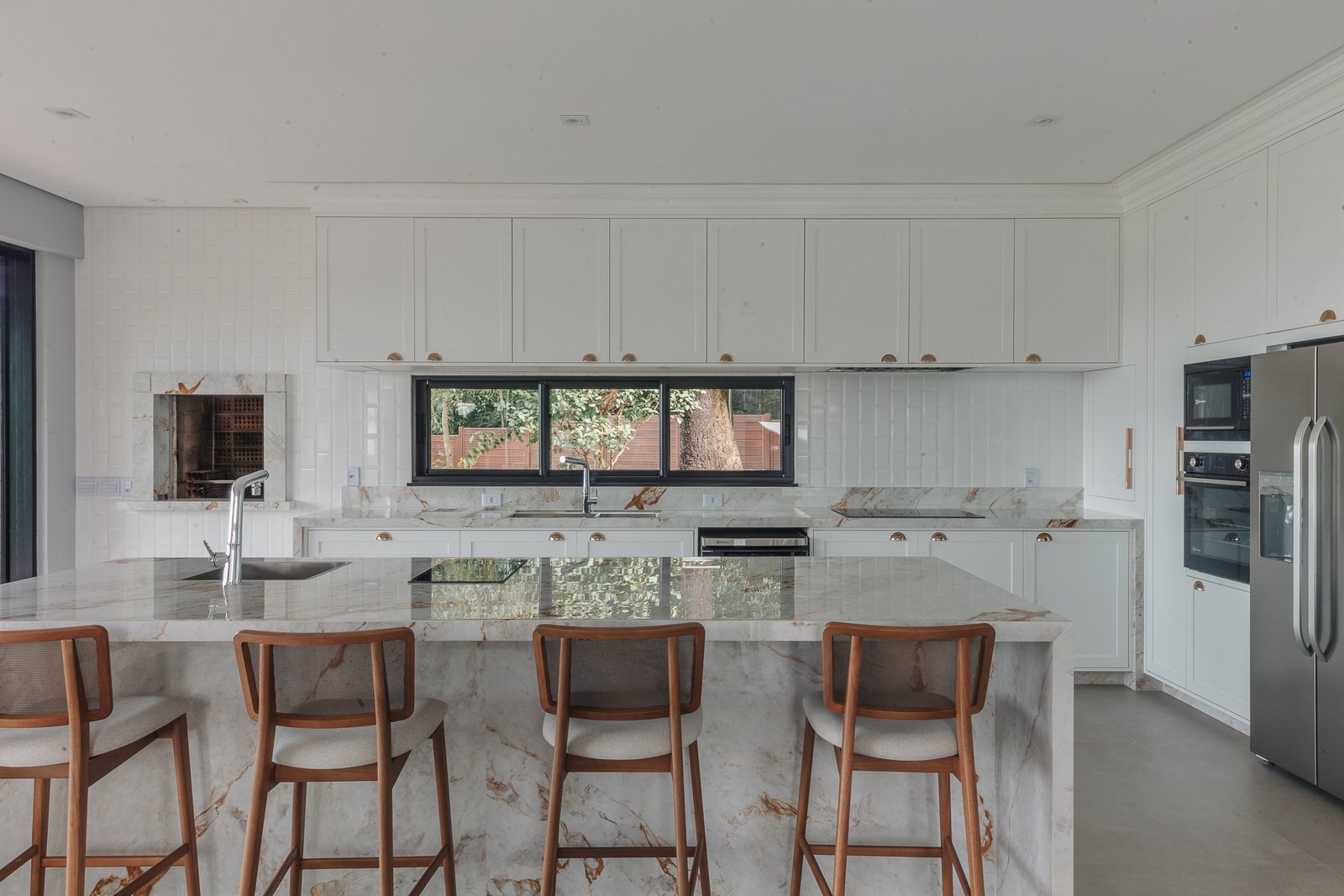 Destaca-se pela luminotécnica noturna, que valoriza cada elemento arquitetônico e potencializa a atmosfera acolhedora da residência.