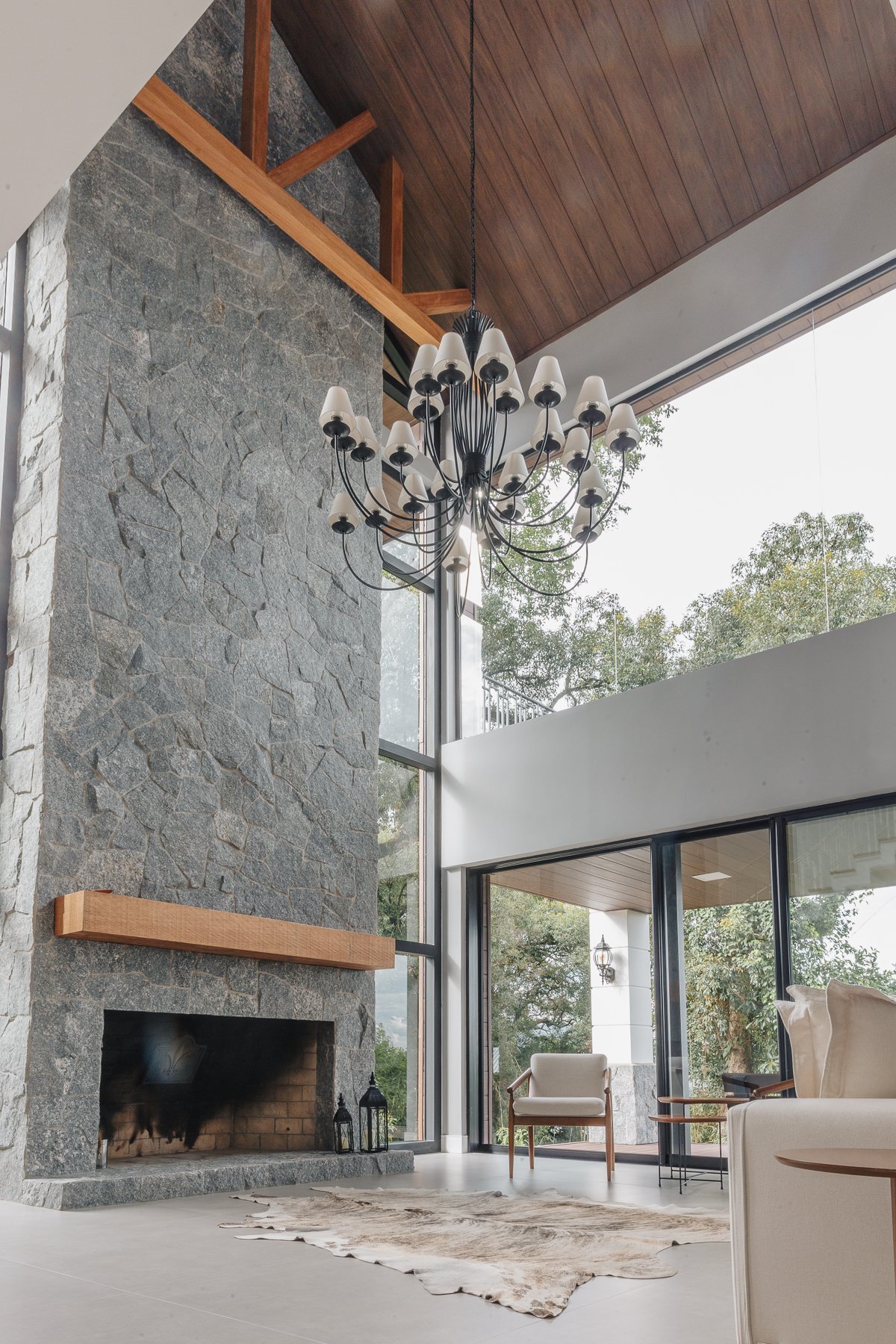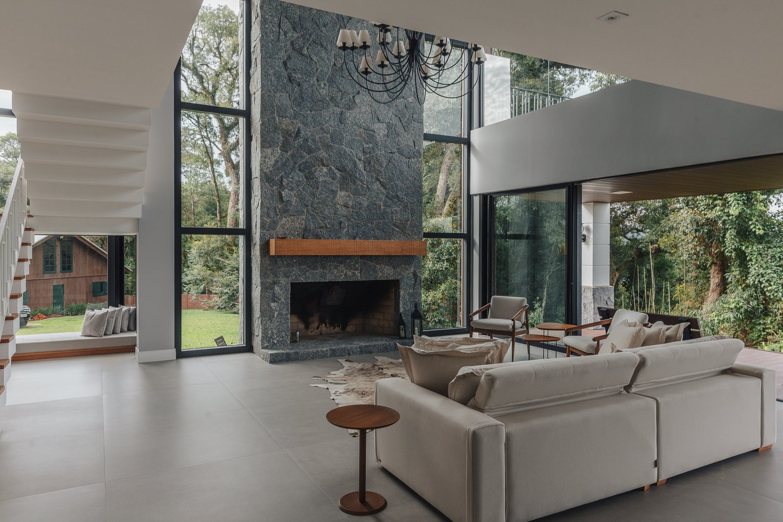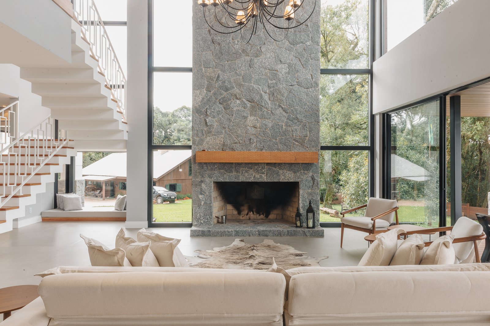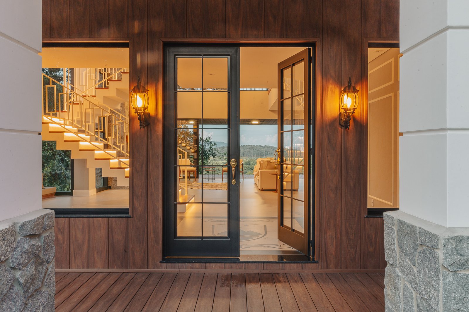 A iluminação quente ressalta a textura da pedra e a riqueza dos materiais naturais, enquanto a transparência dos grandes panos de vidro cria uma conexão visual entre os ambientes internos e a paisagem exterior.