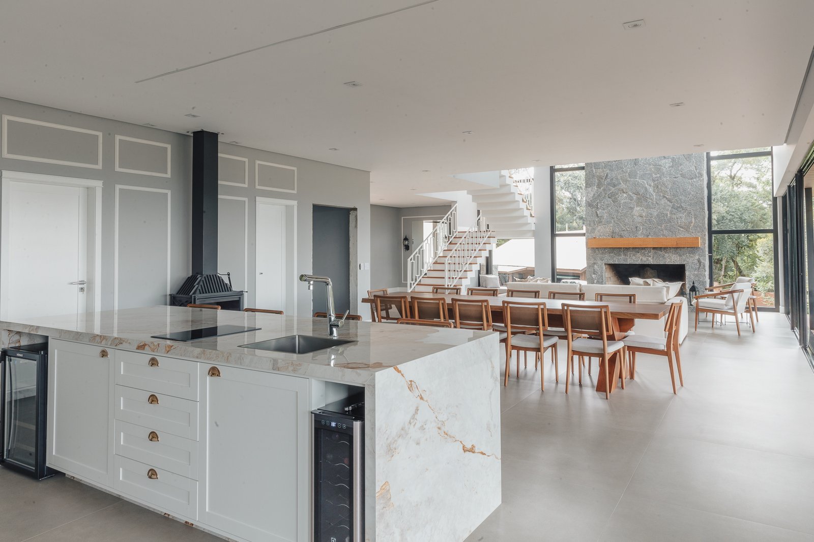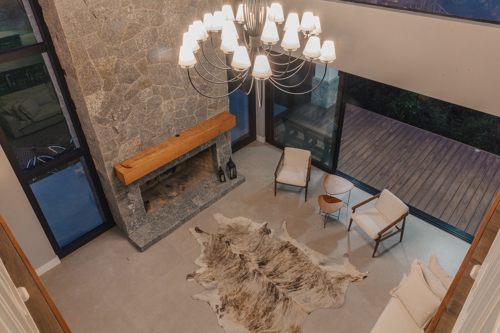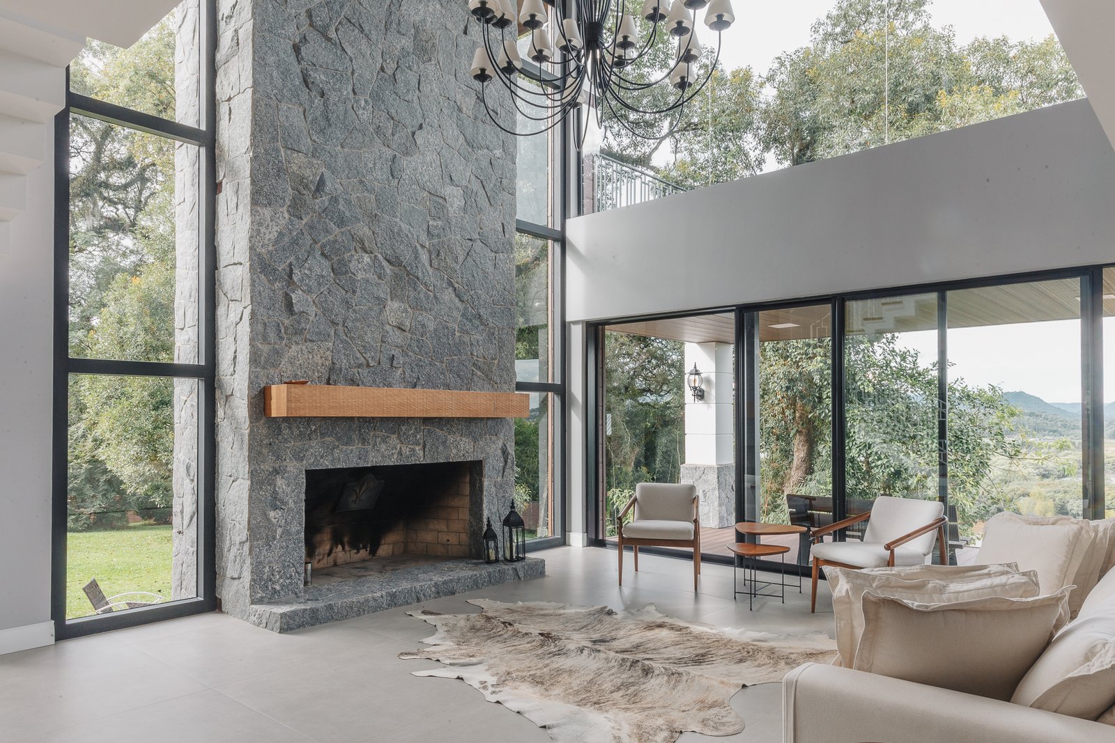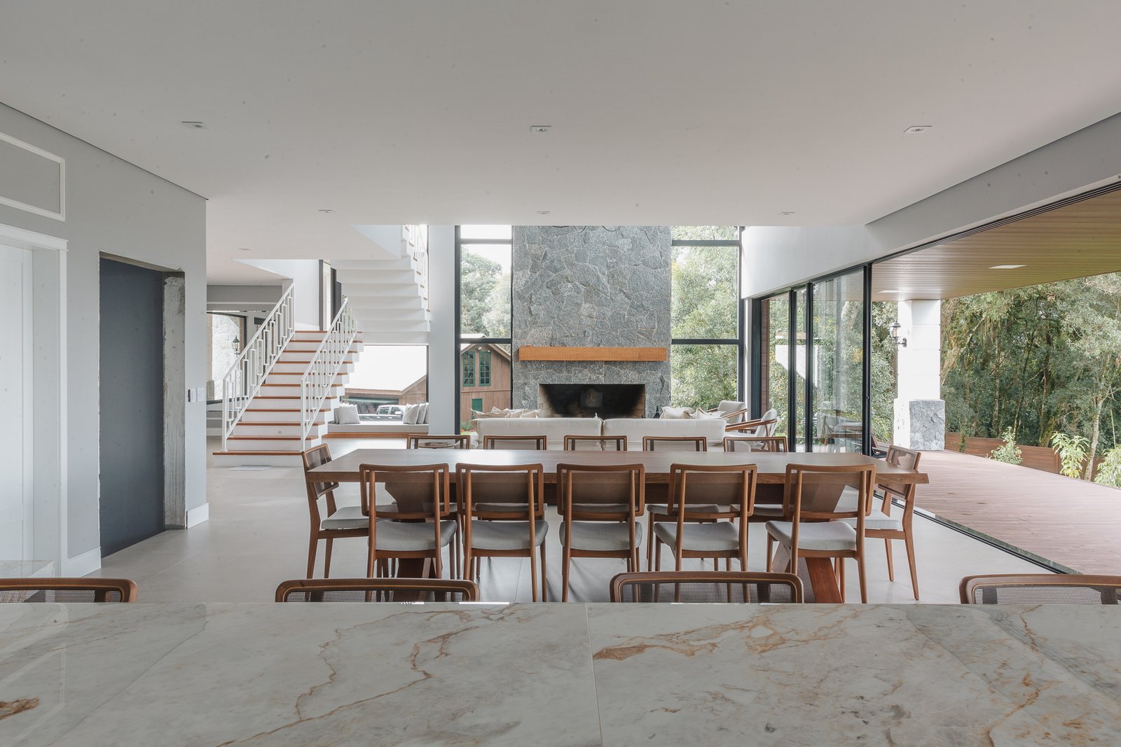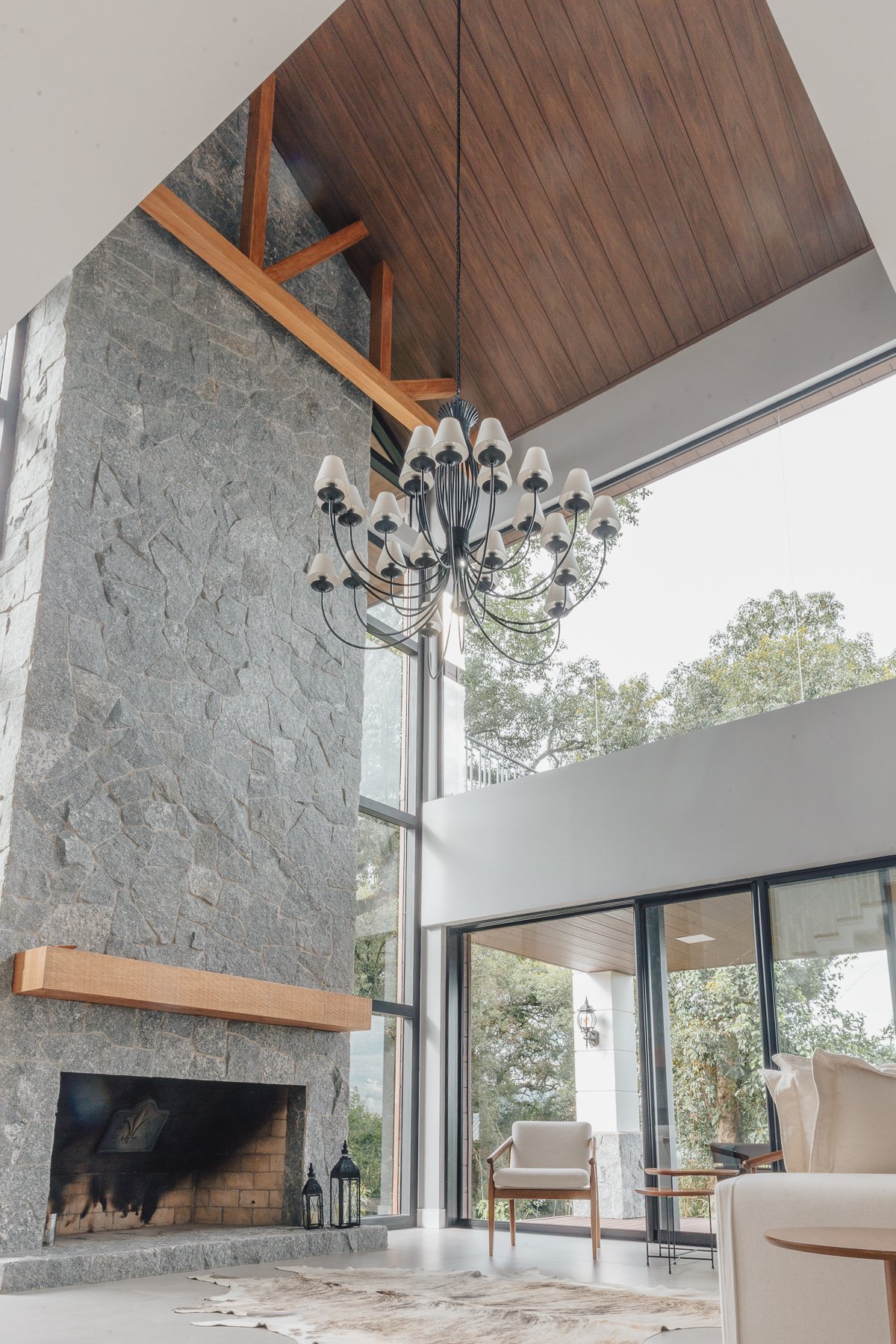 A iluminação quente ressalta a textura da pedra e a riqueza dos materiais naturais, enquanto a transparência dos grandes panos de vidro cria uma conexão visual entre os ambientes internos e a paisagem exterior.