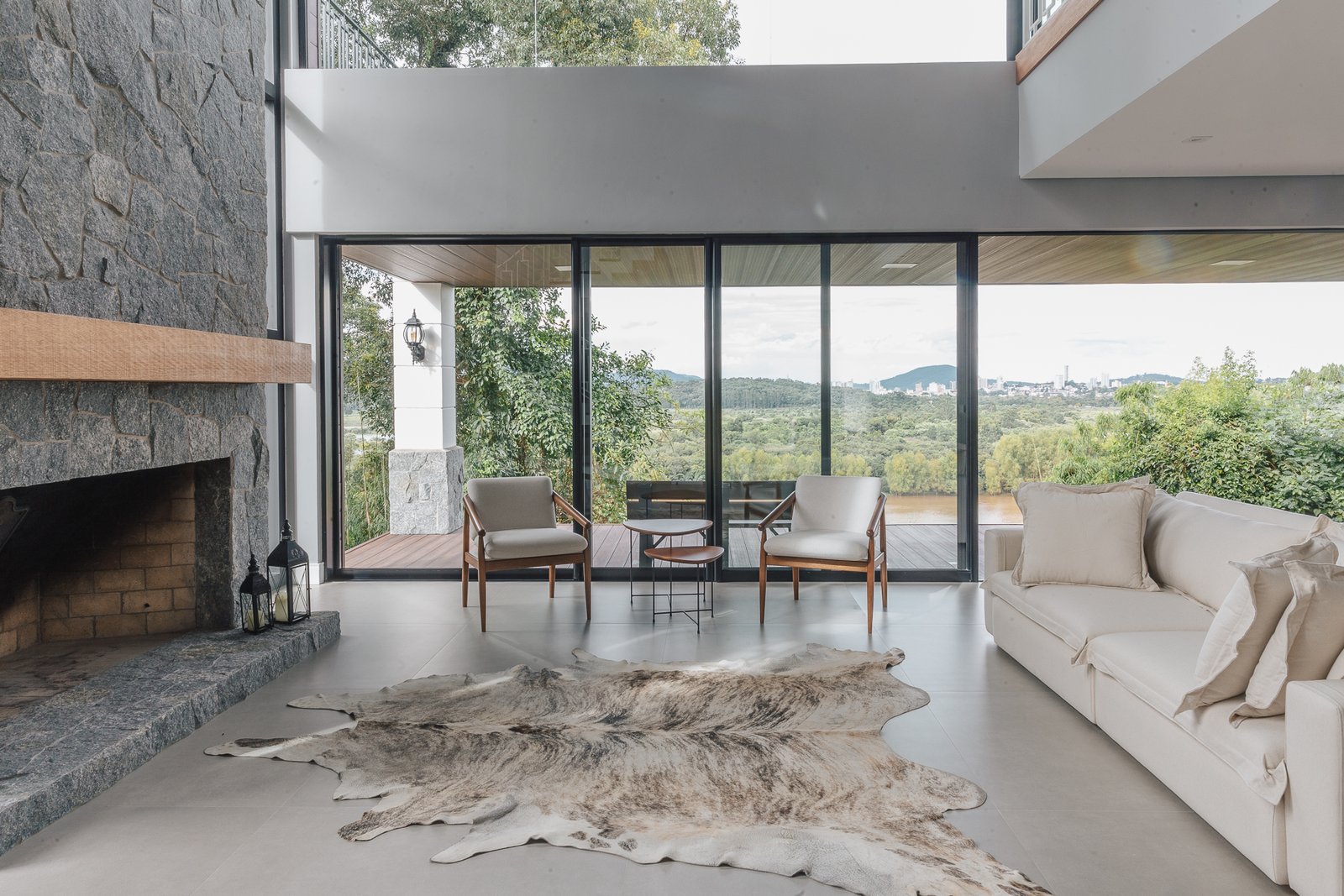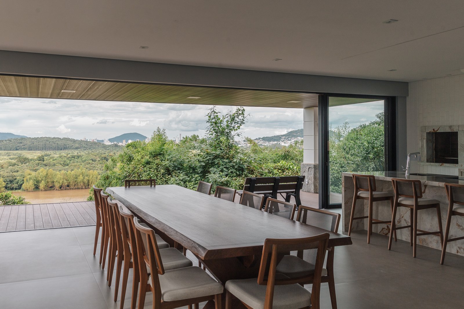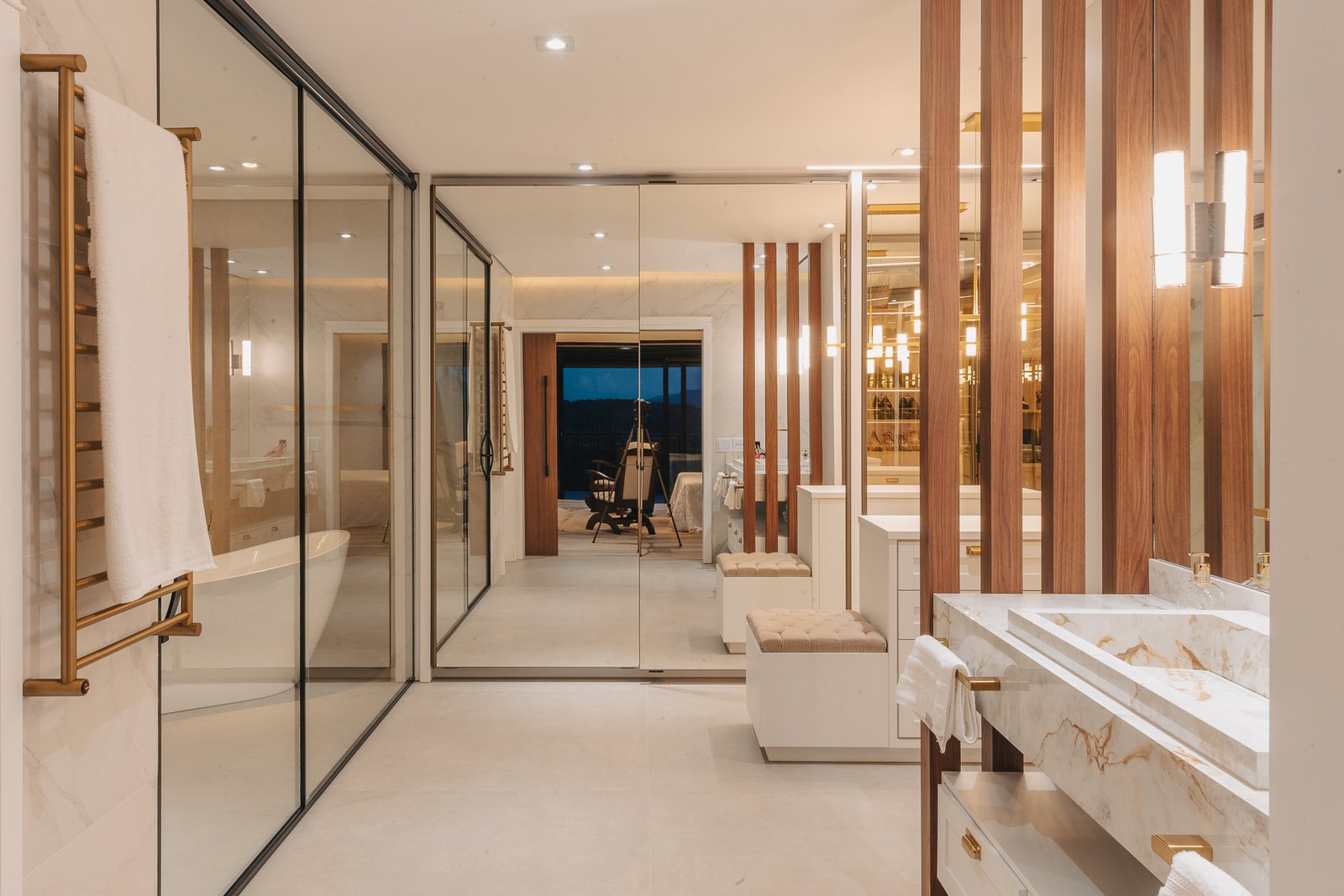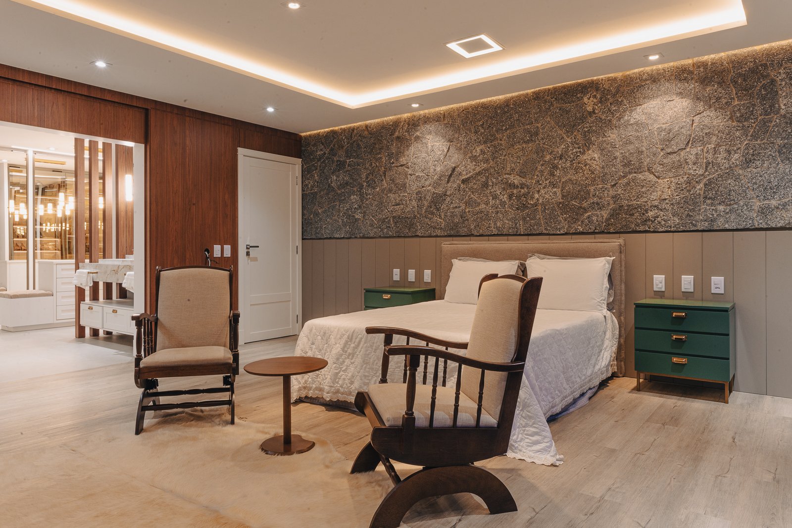 A iluminação quente ressalta a textura da pedra e a riqueza dos materiais naturais, enquanto a transparência dos grandes panos de vidro cria uma conexão visual entre os ambientes internos e a paisagem exterior.