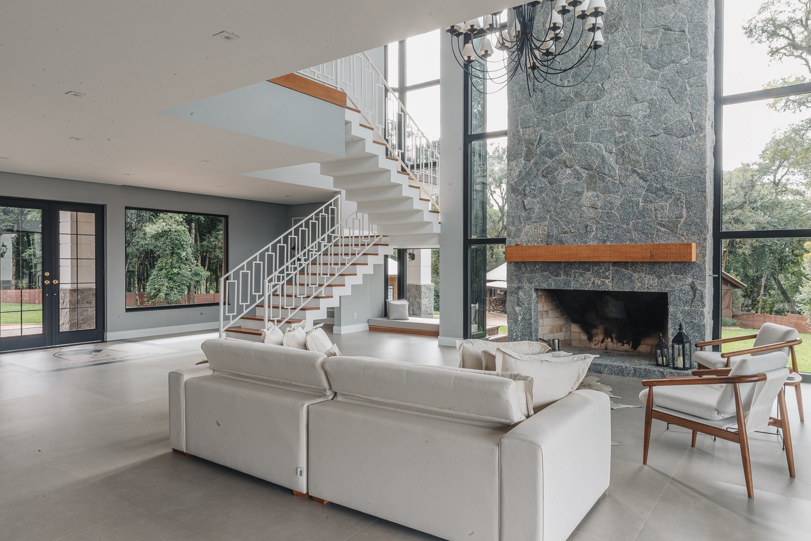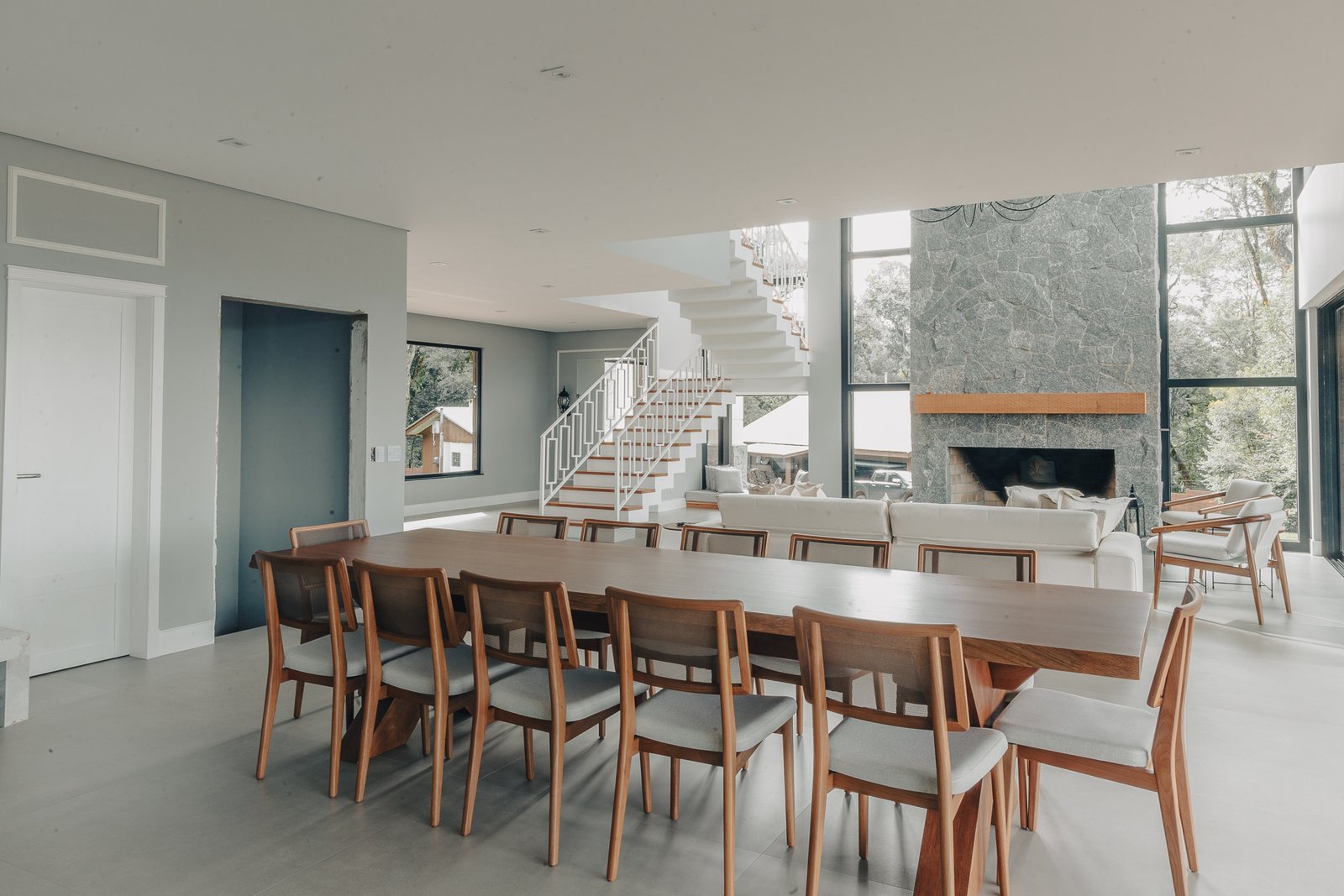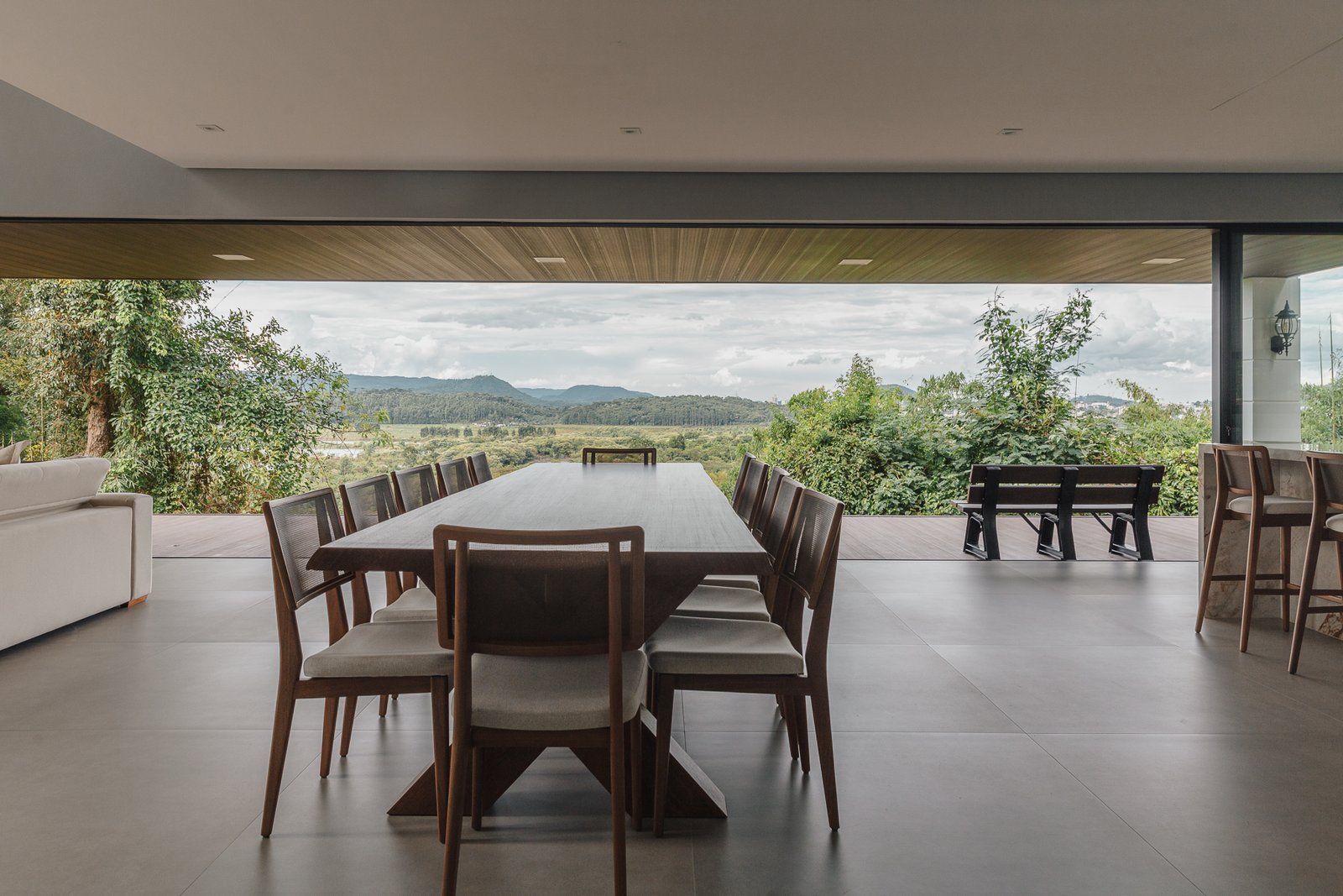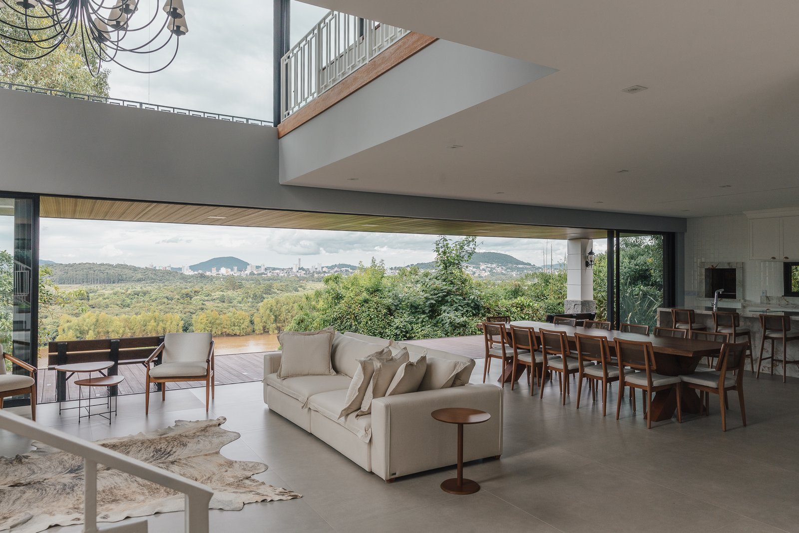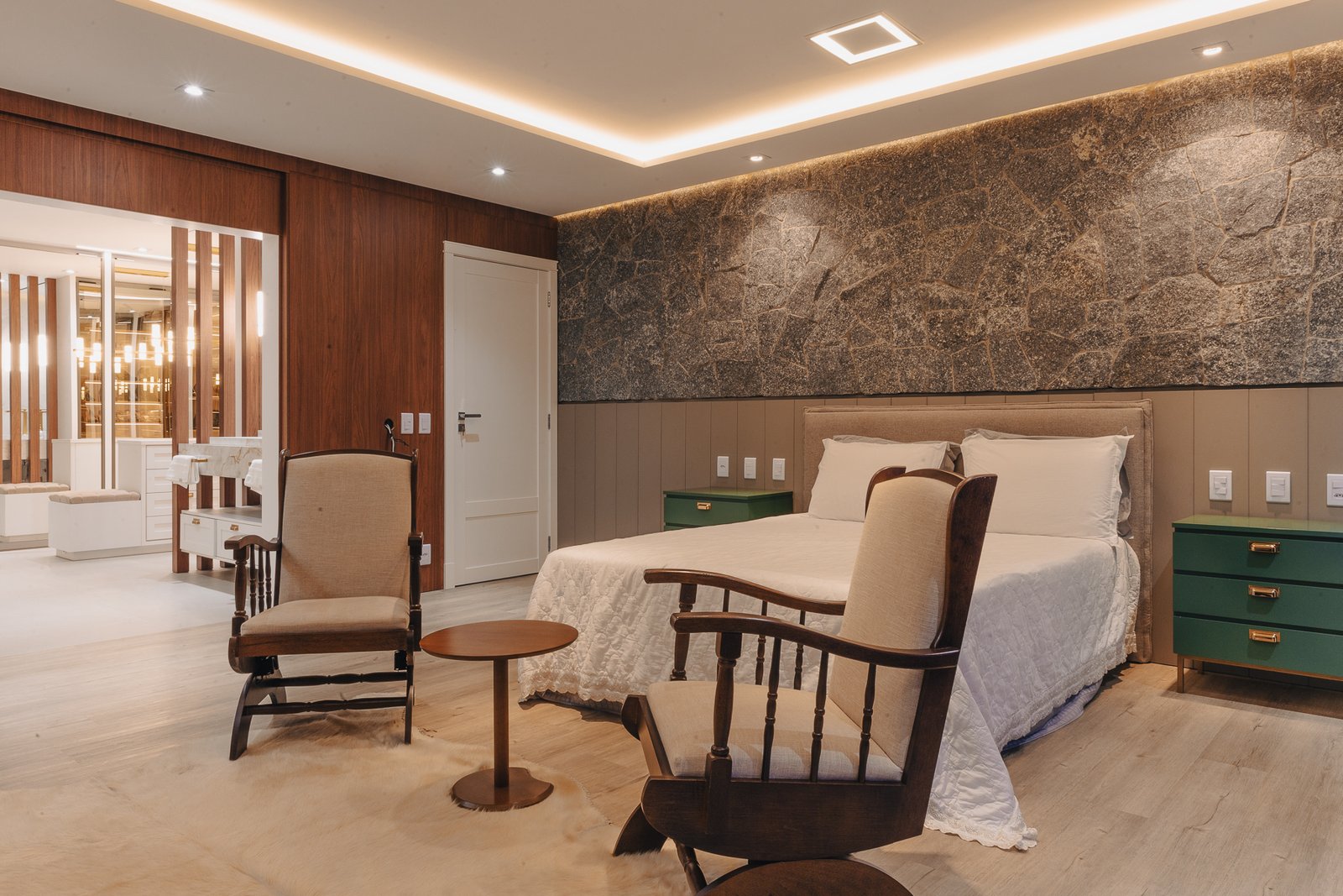 A iluminação quente ressalta a textura da pedra e a riqueza dos materiais naturais, enquanto a transparência dos grandes panos de vidro cria uma conexão visual entre os ambientes internos e a paisagem exterior.