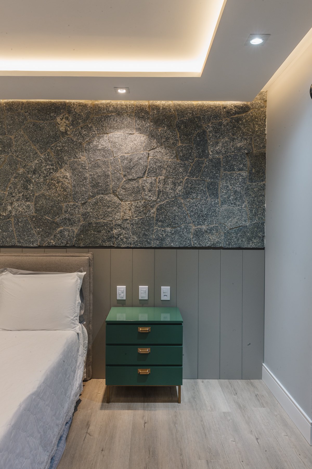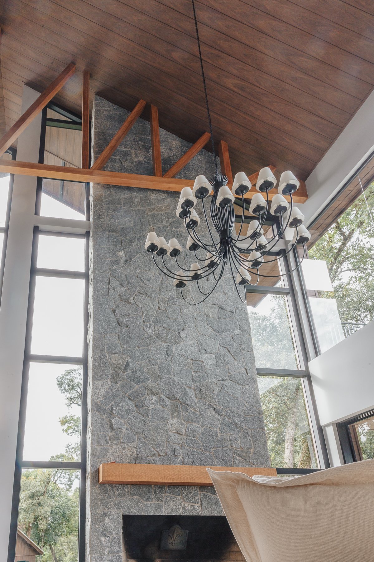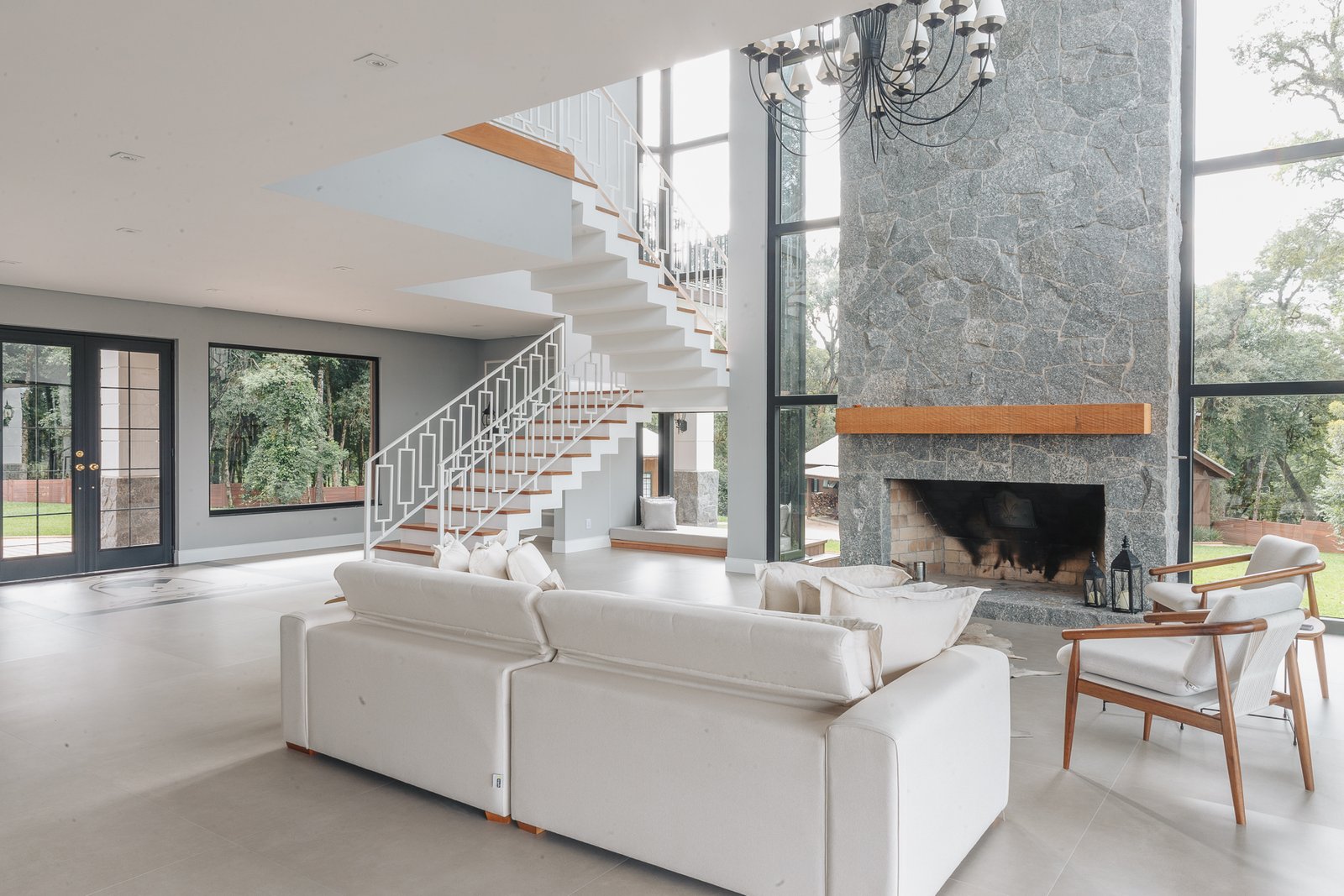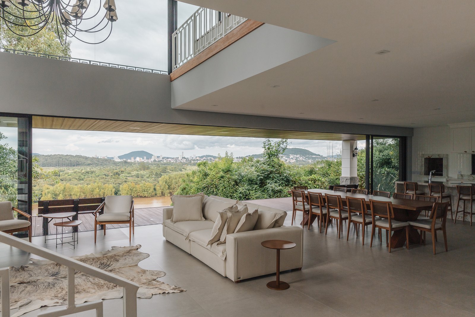 A iluminação quente ressalta a textura da pedra e a riqueza dos materiais naturais, enquanto a transparência dos grandes panos de vidro cria uma conexão visual entre os ambientes internos e a paisagem exterior.