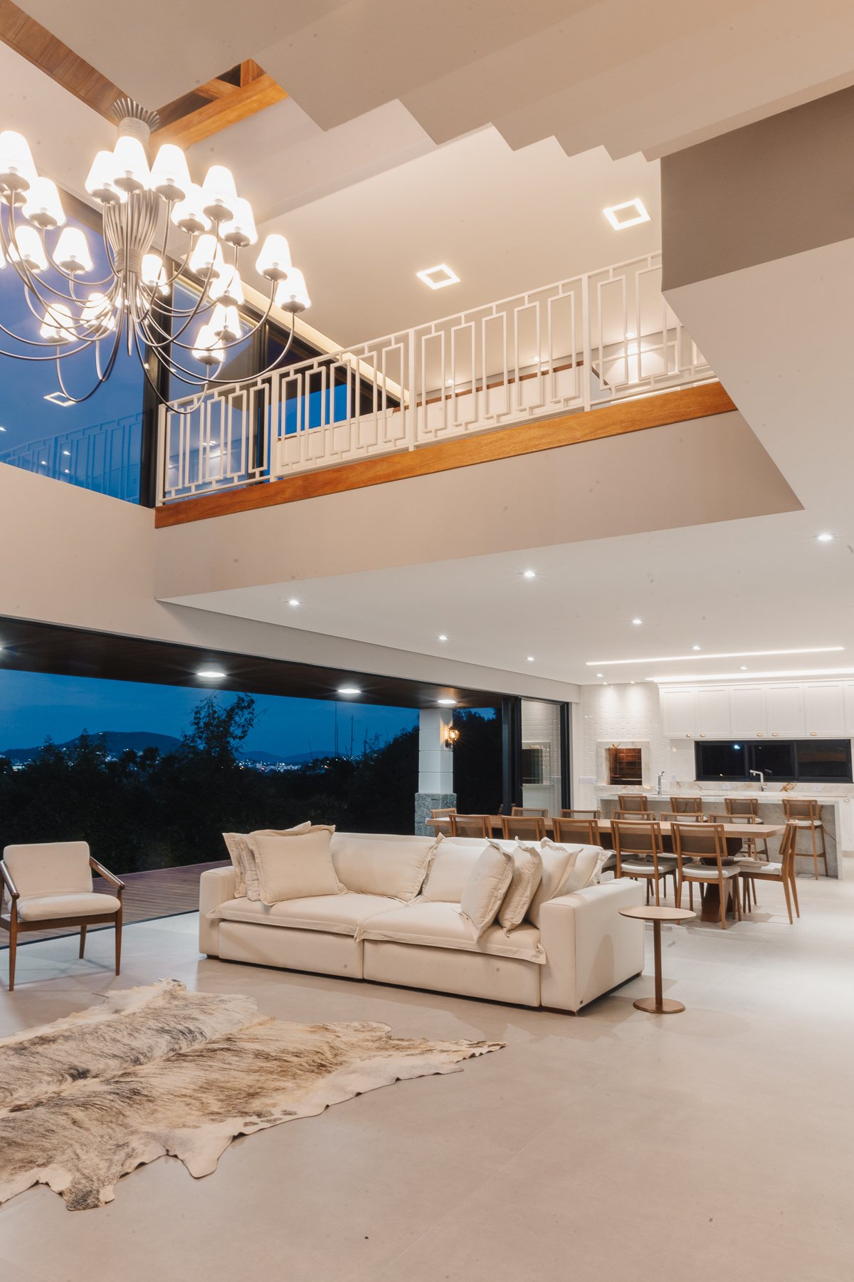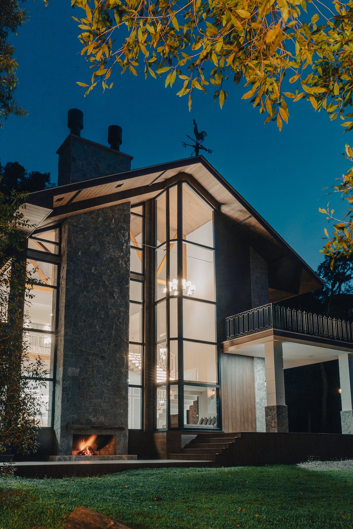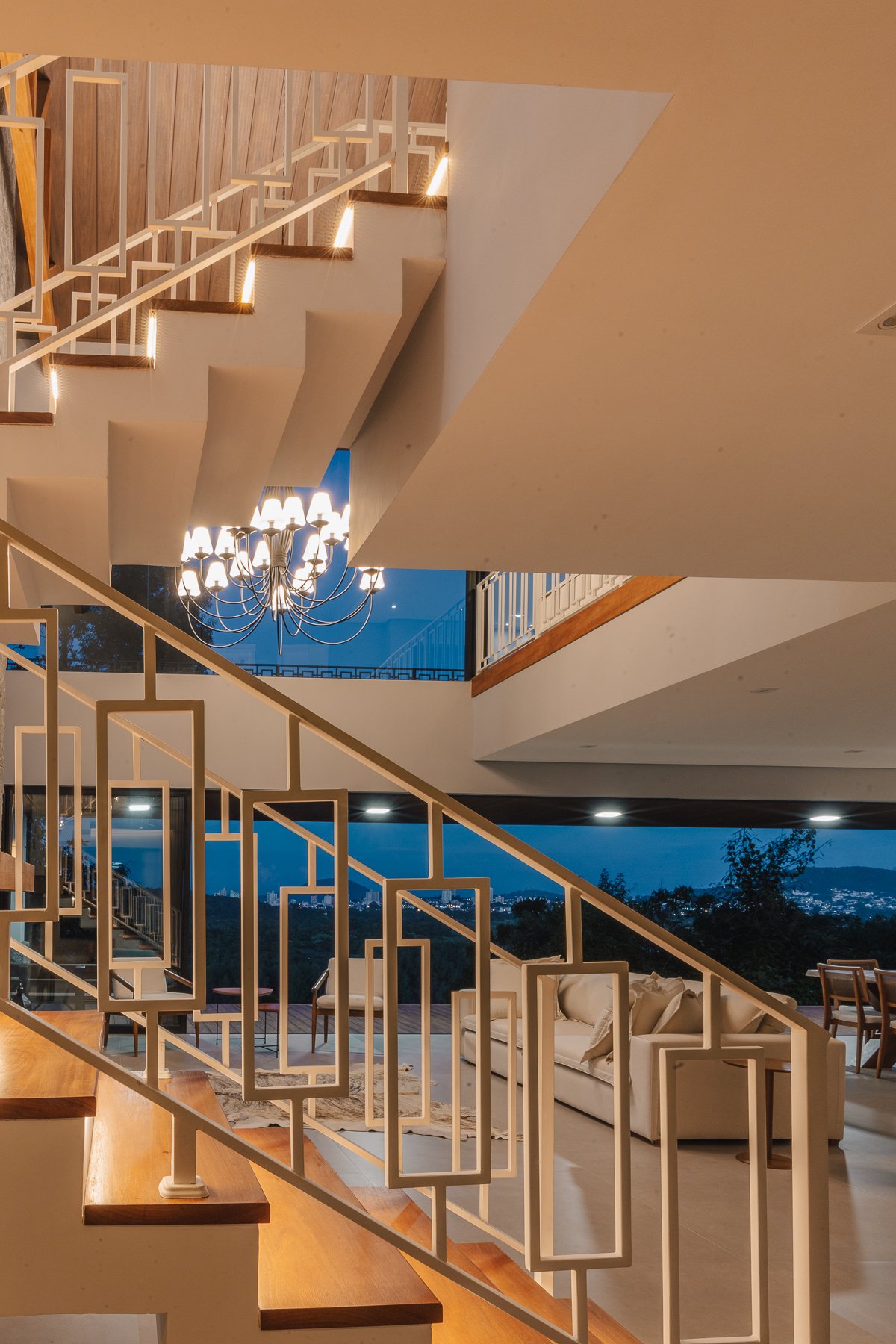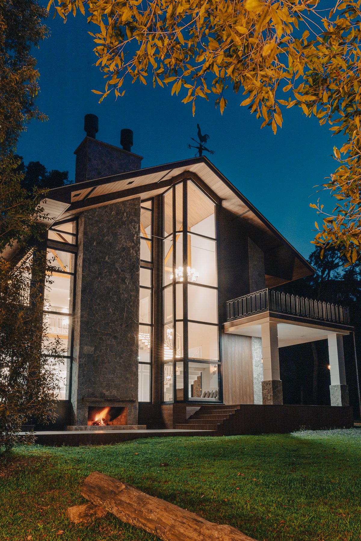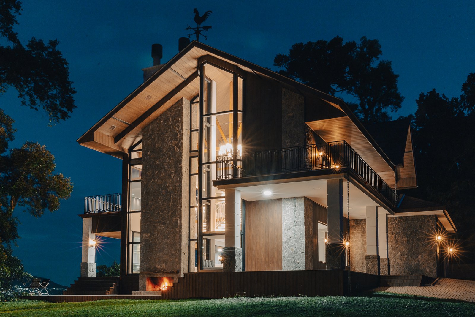 O desenho da luz guia o olhar, evidenciando a imponência da estrutura, a leveza da escada interna e a delicadeza dos detalhes, como o fogo da lareira e as luminárias externas que se fundem à paisagem iluminada ao fundo.