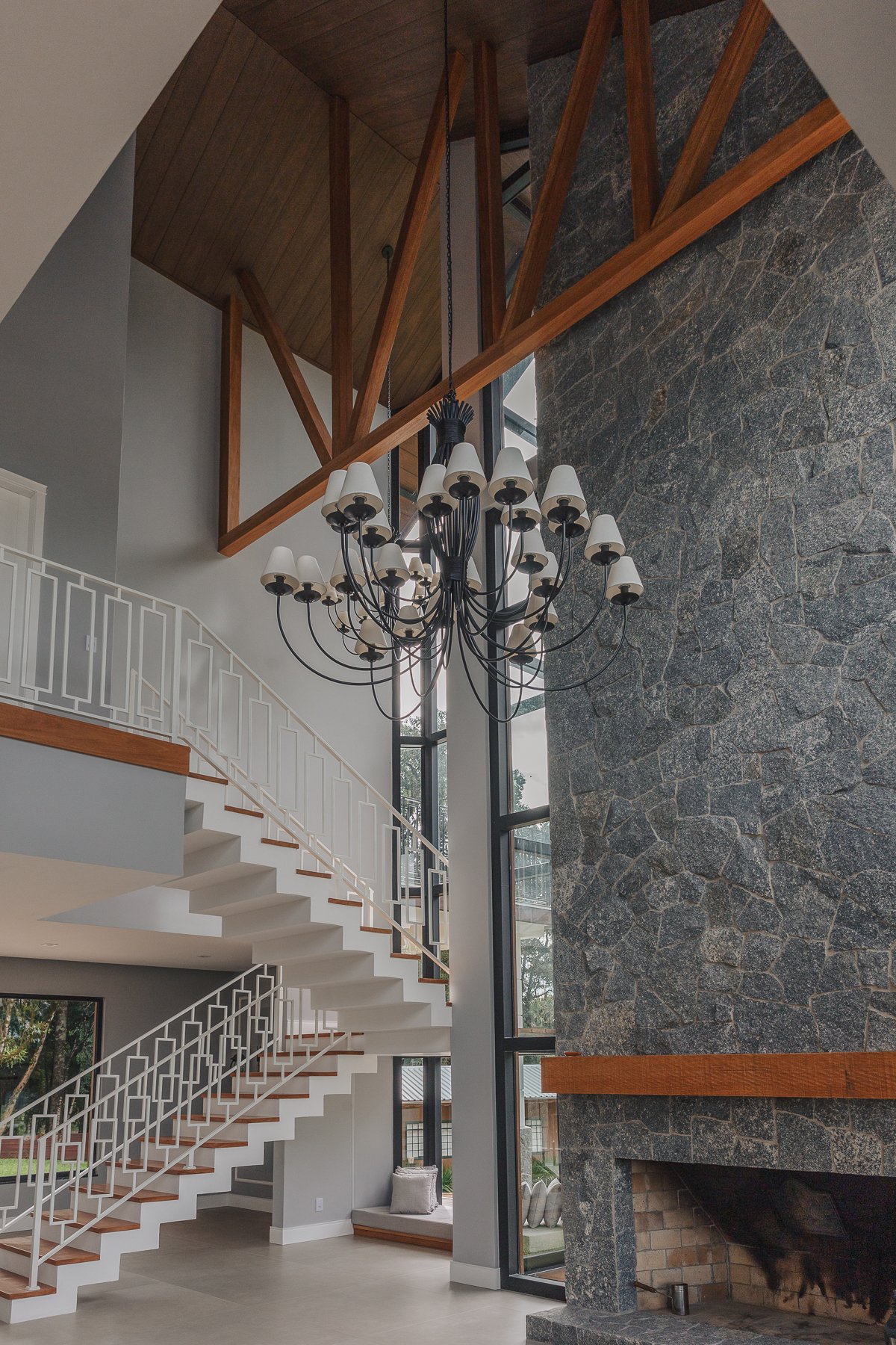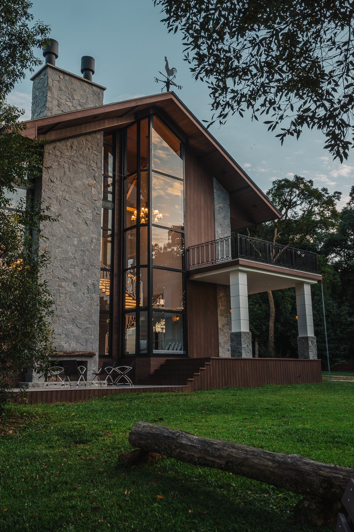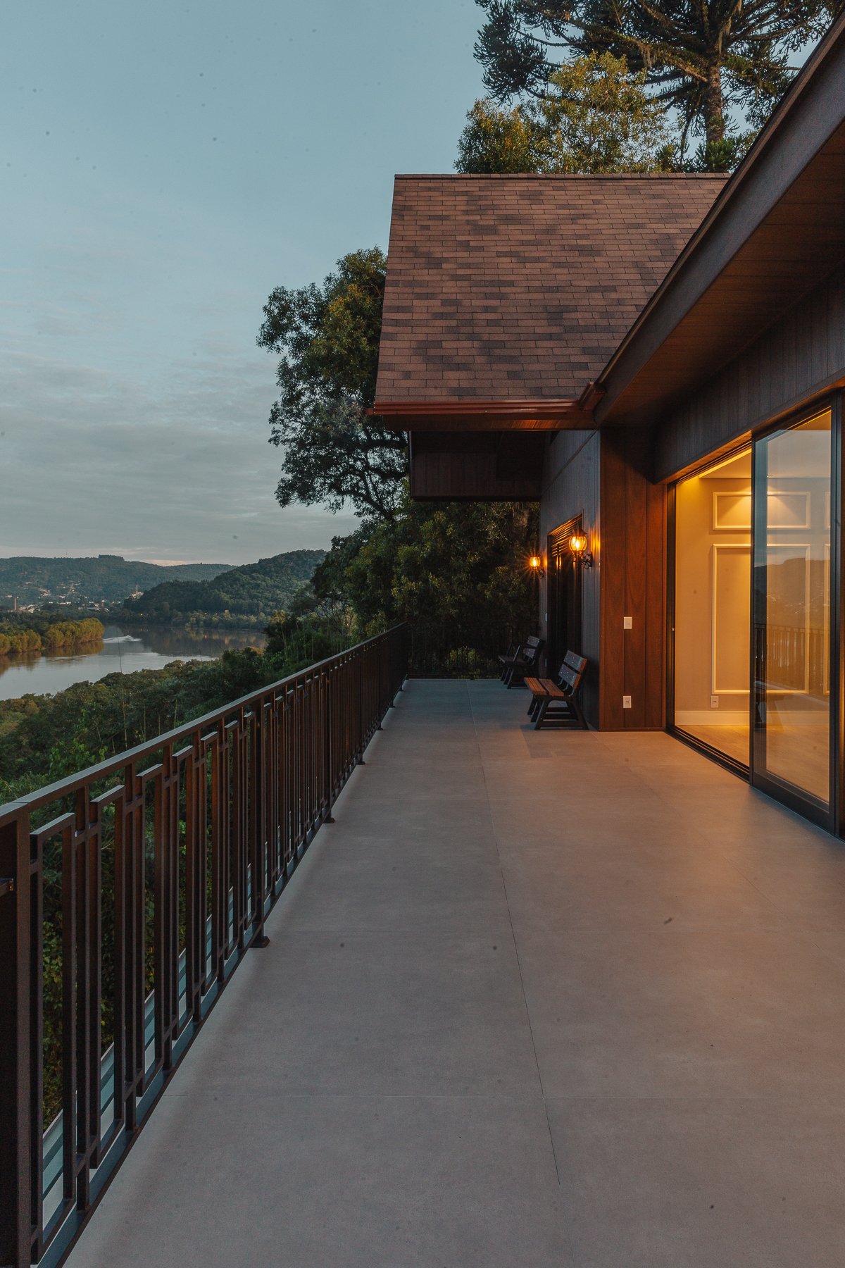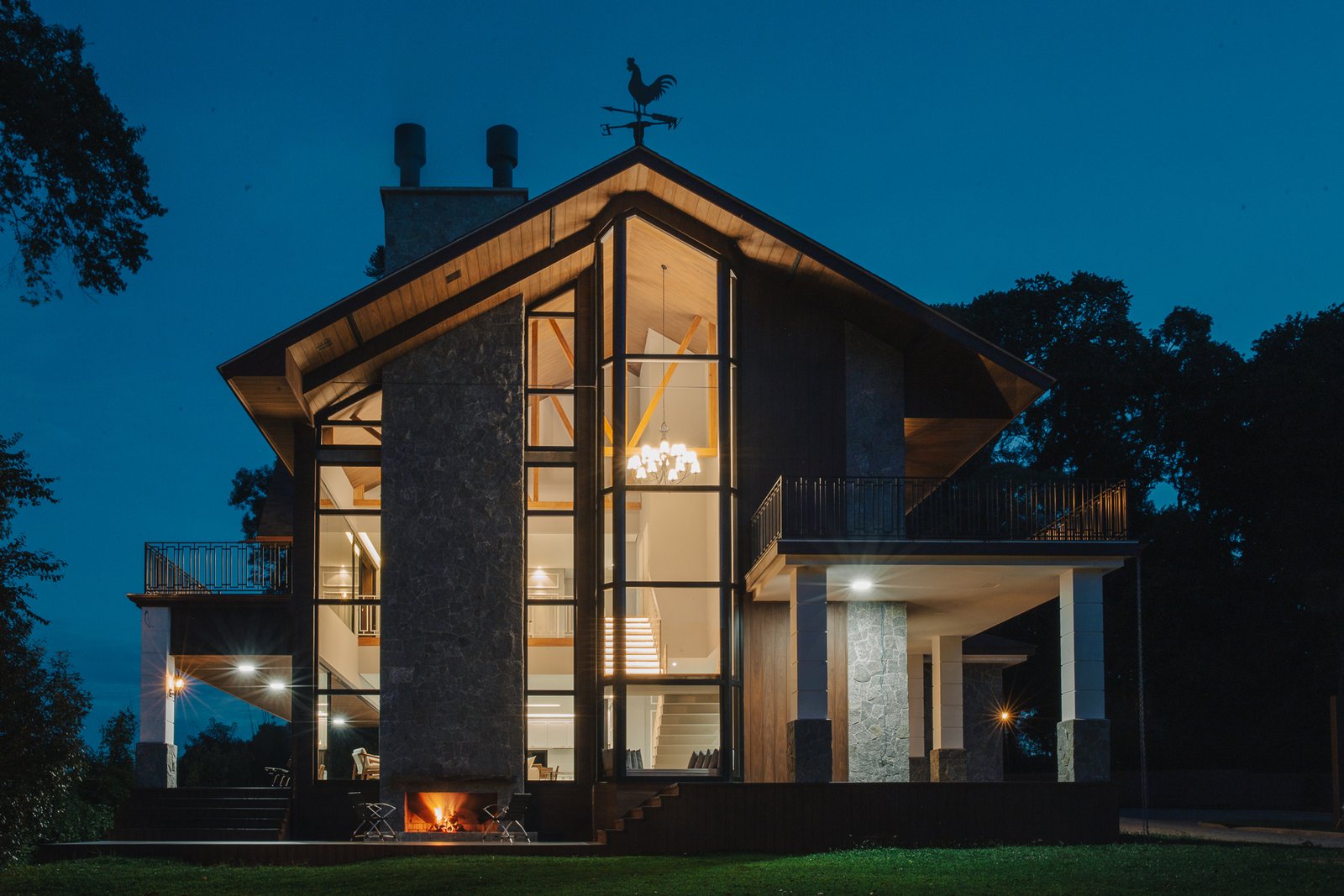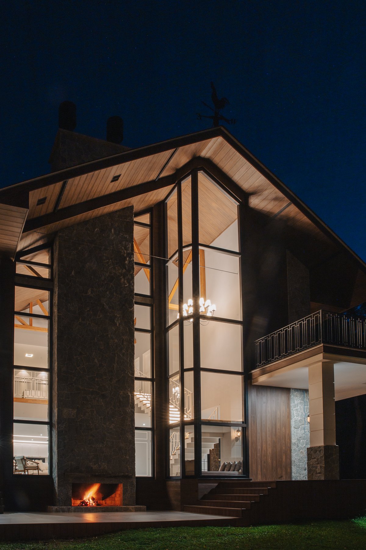 O desenho da luz guia o olhar, evidenciando a imponência da estrutura, a leveza da escada interna e a delicadeza dos detalhes, como o fogo da lareira e as luminárias externas que se fundem à paisagem iluminada ao fundo.