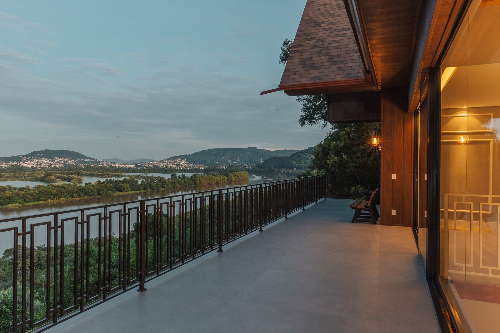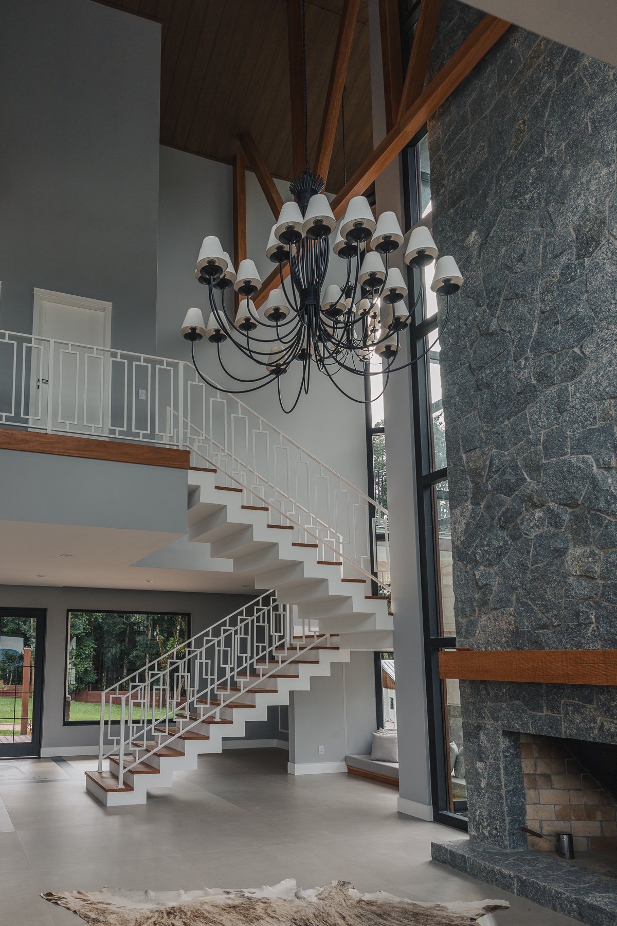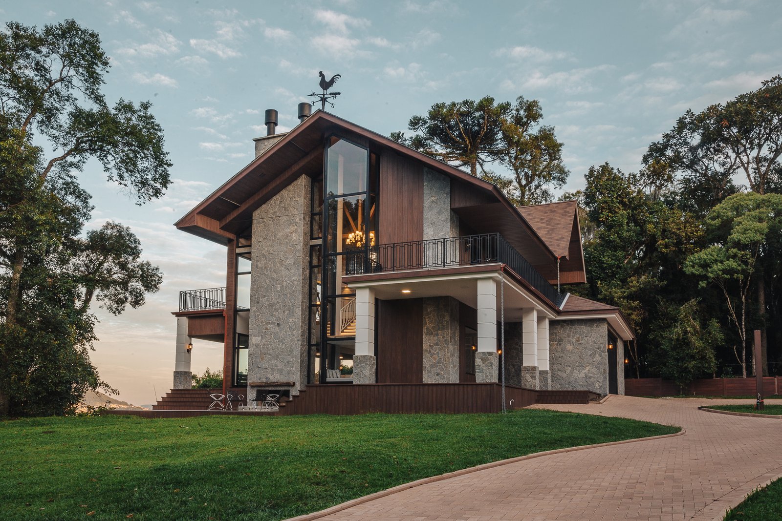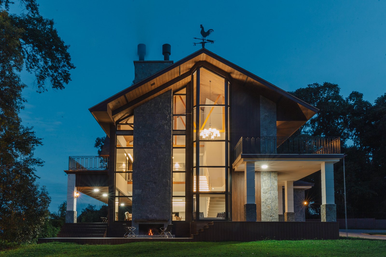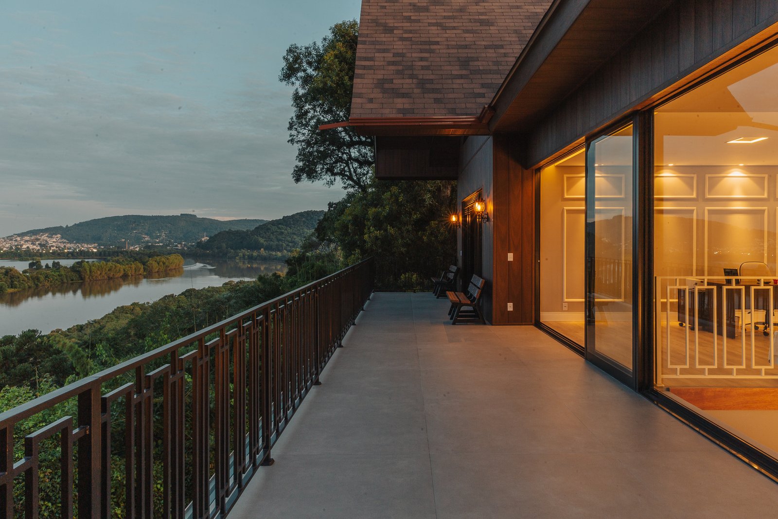 O desenho da luz guia o olhar, evidenciando a imponência da estrutura, a leveza da escada interna e a delicadeza dos detalhes, como o fogo da lareira e as luminárias externas que se fundem à paisagem iluminada ao fundo.
