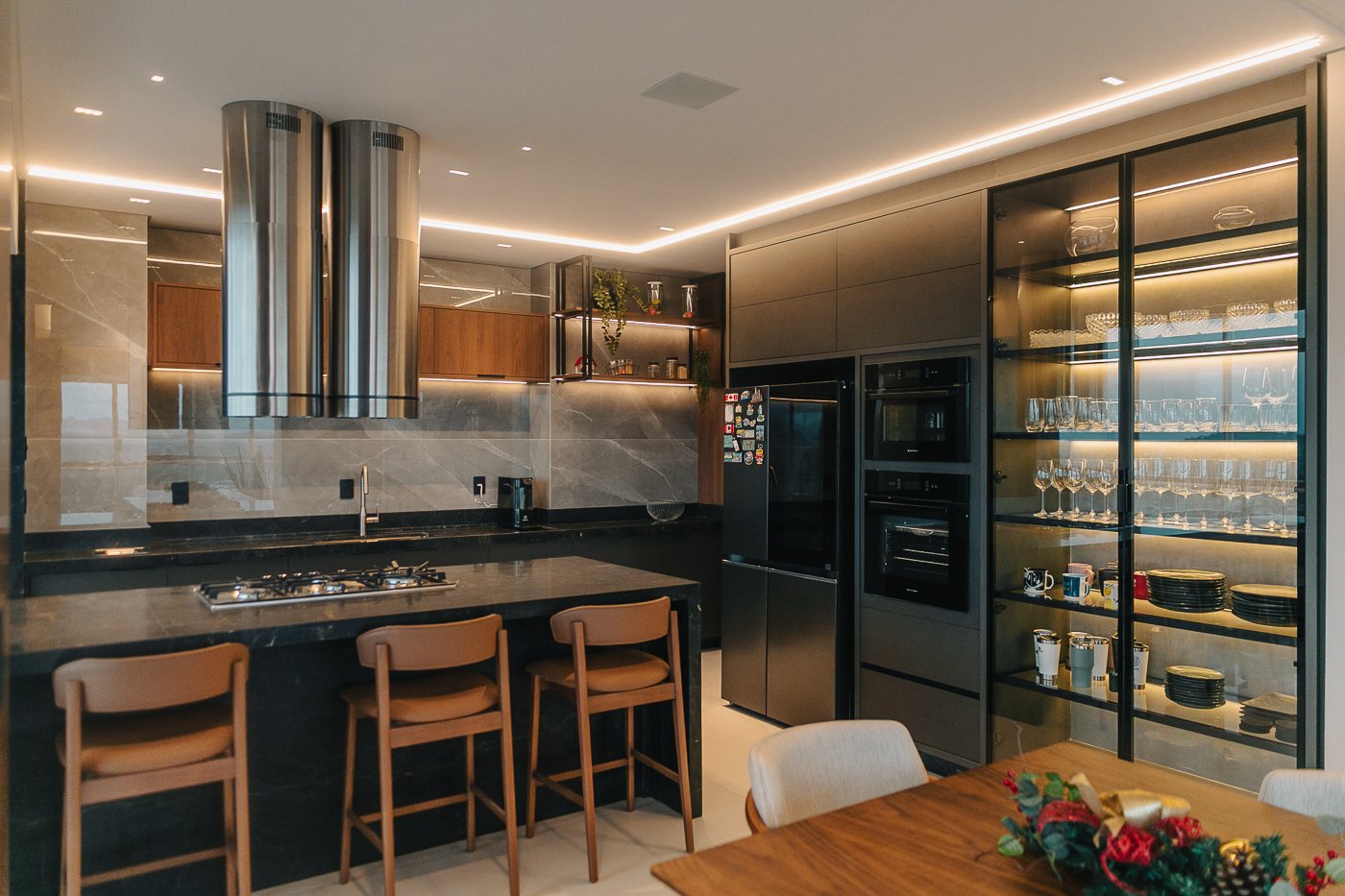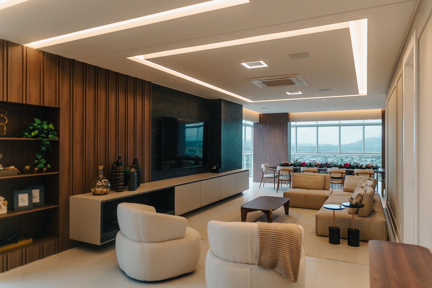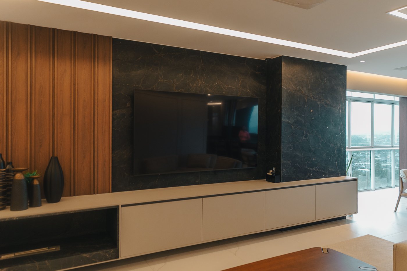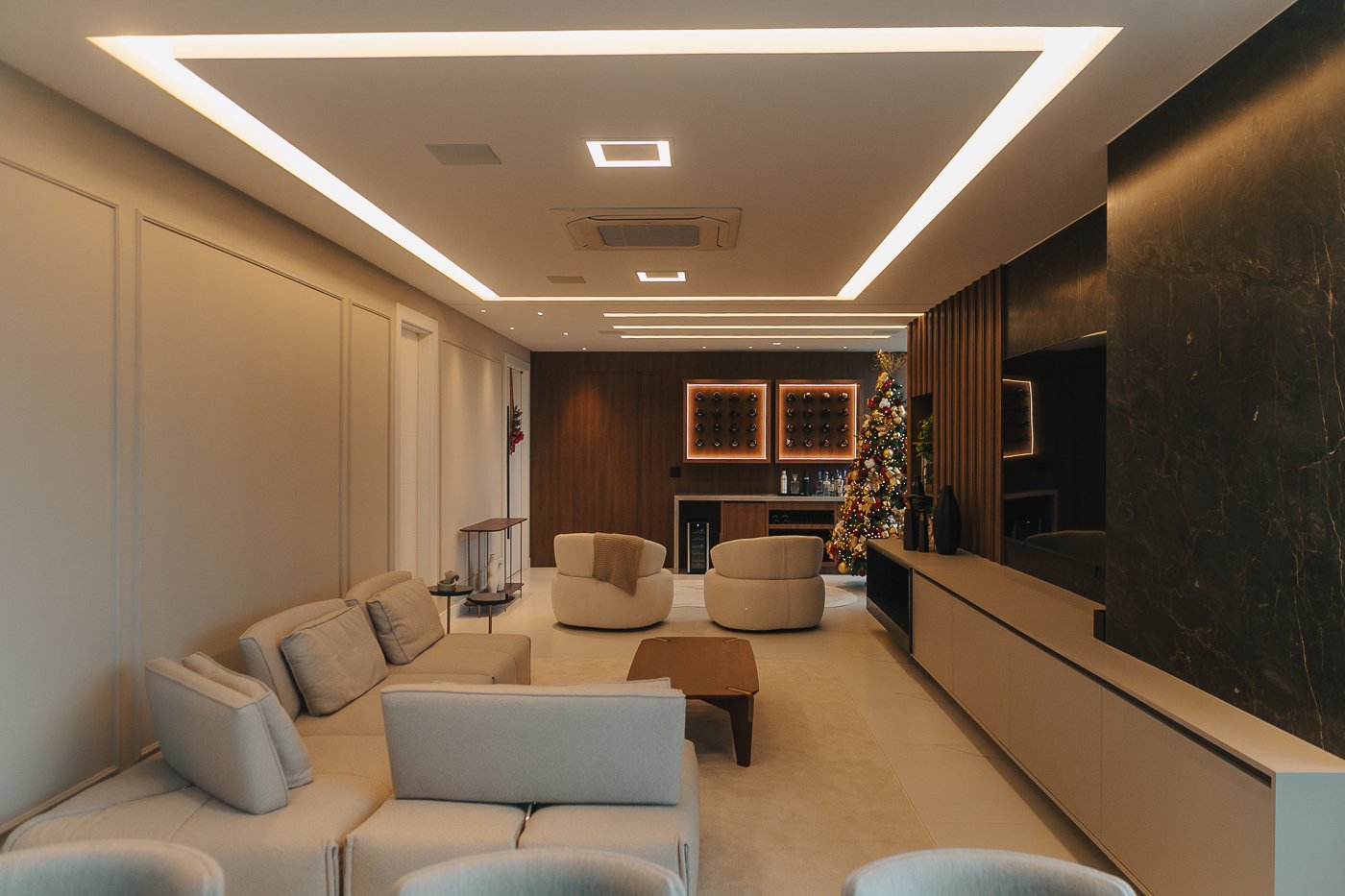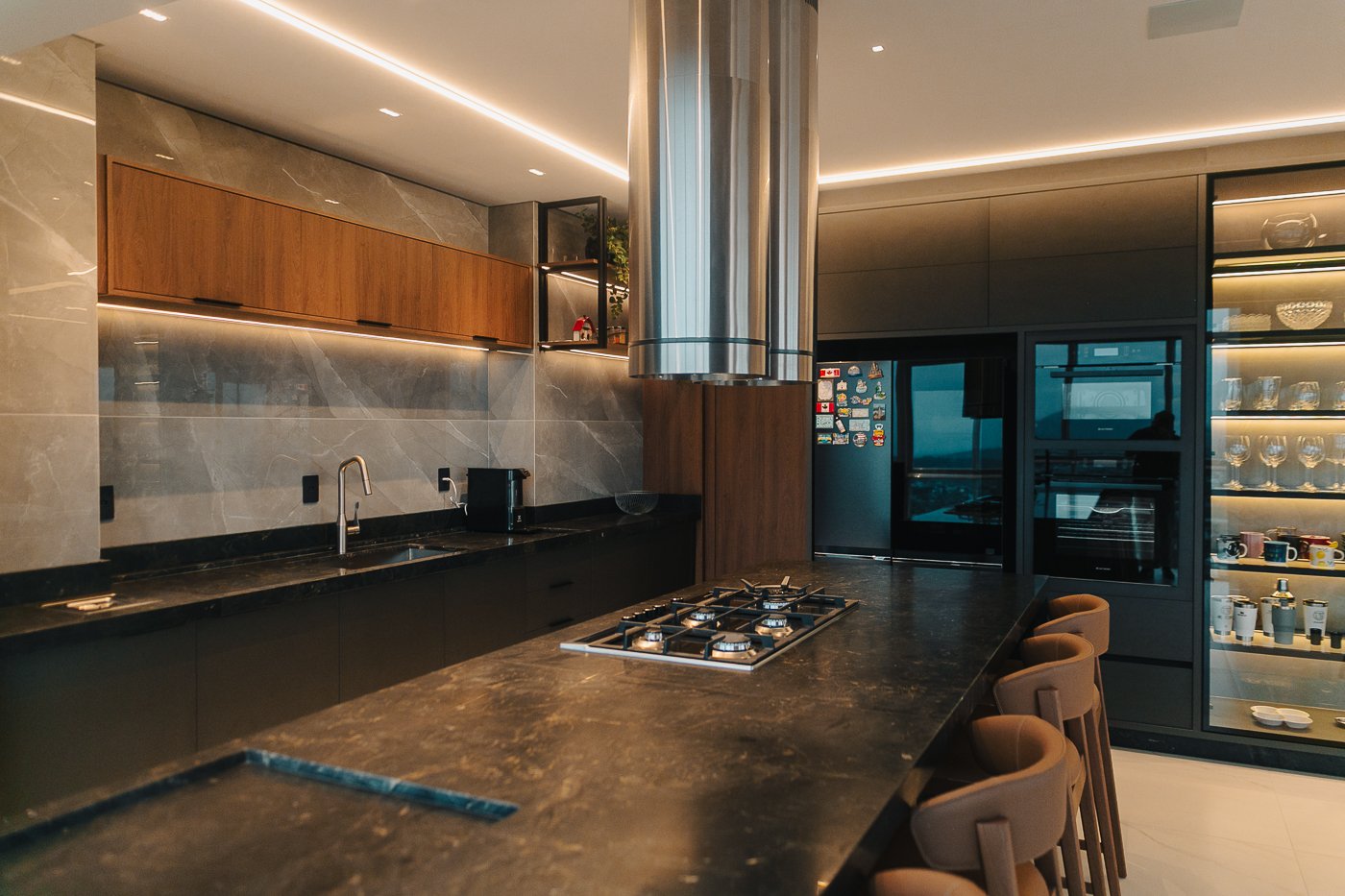 Um apartamento pensado para um cliente com personalidade. Tons naturais, sóbrios contrastado com texturas e materiais sofisticados e modernos como o couro e mármore!