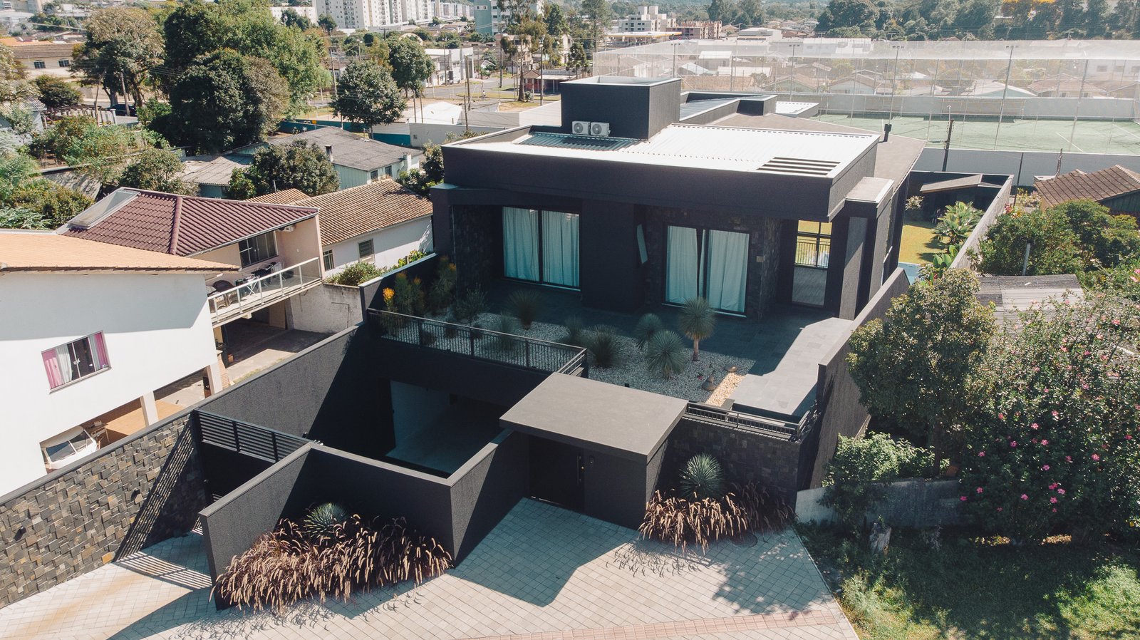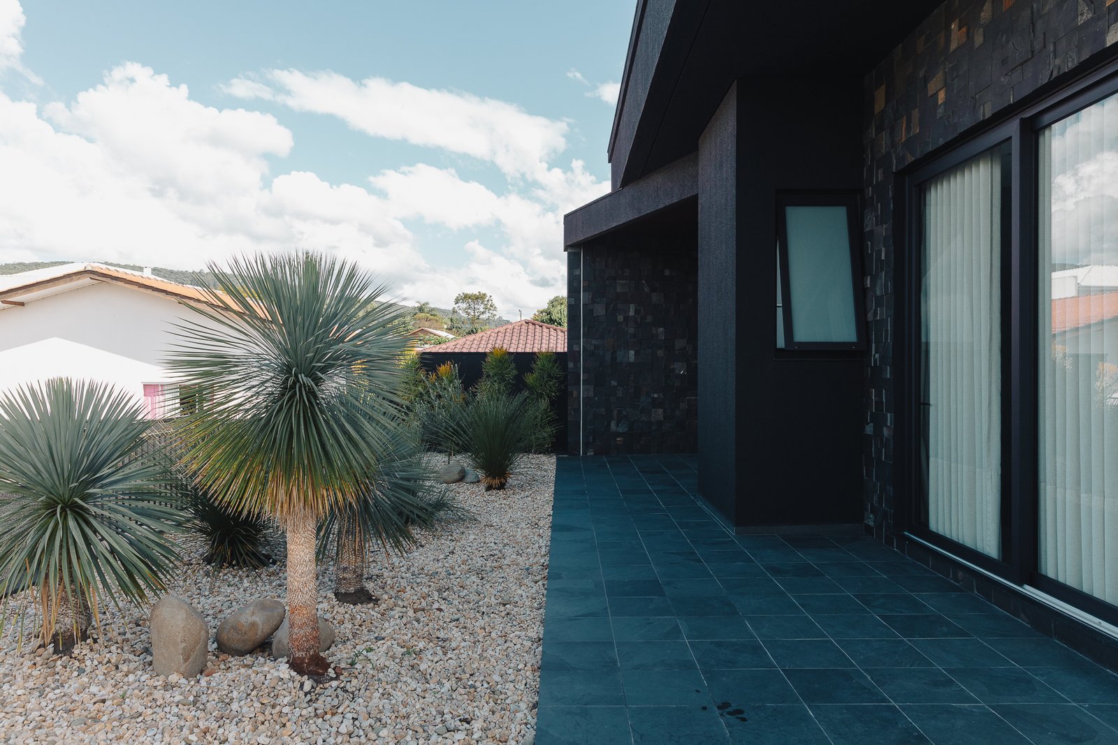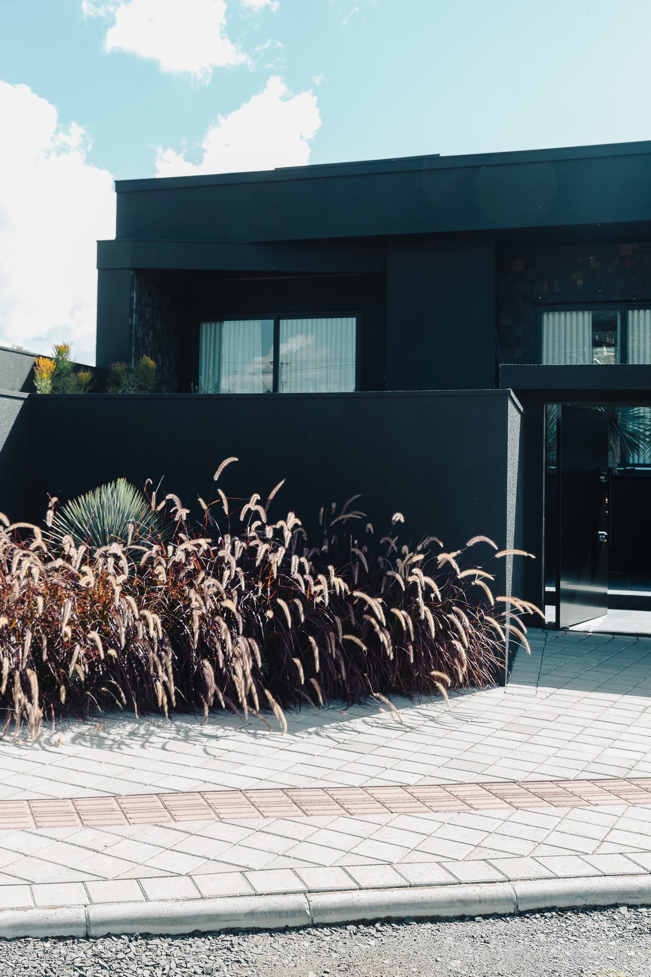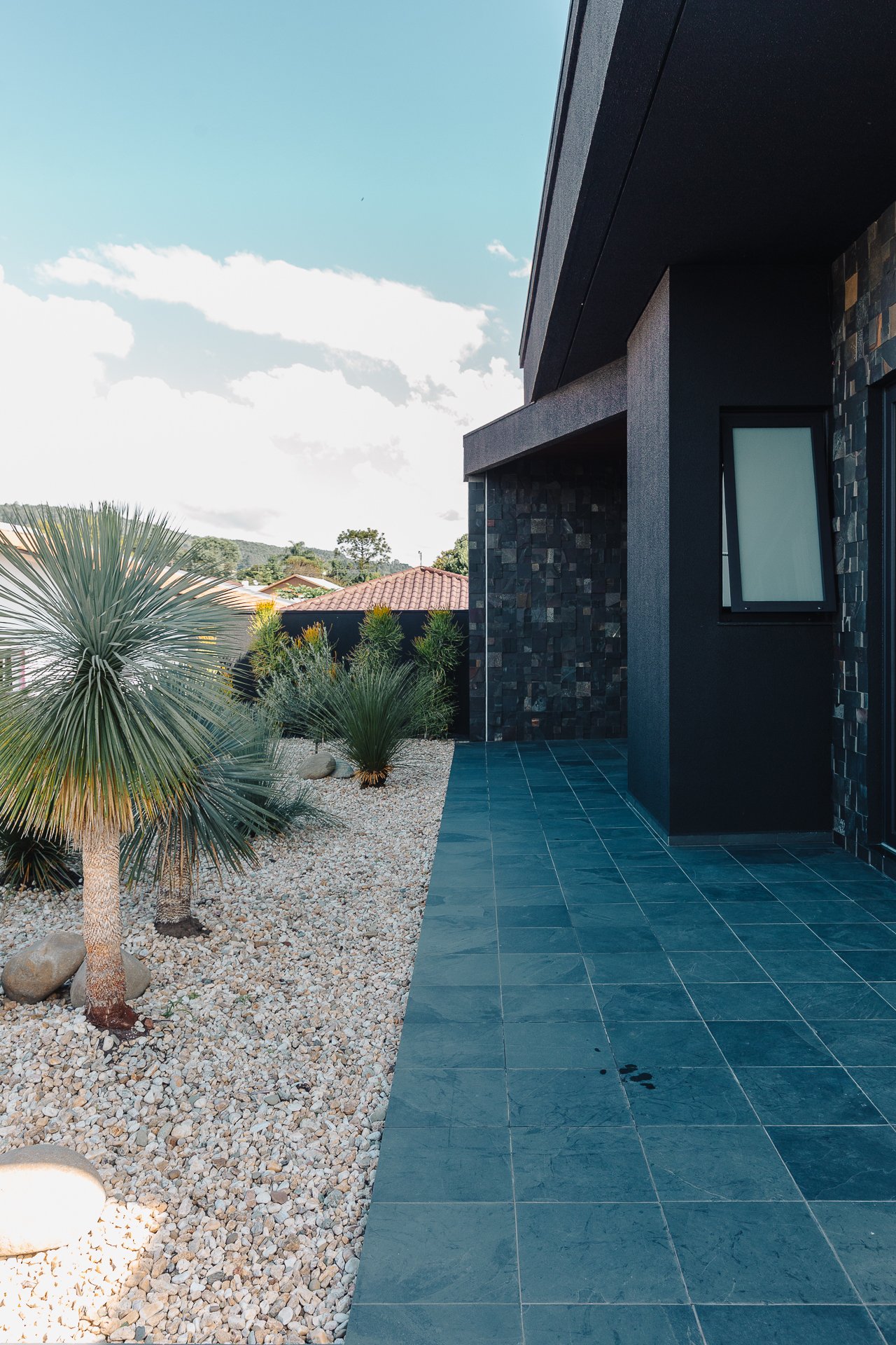 O paisagismo foi concebido como elemento estrutural do projeto, e não apenas como adorno. A seleção de espécies esculturais compõe um jardim seco, de baixa manutenção, que reforça a estética minimalista da arquitetura.