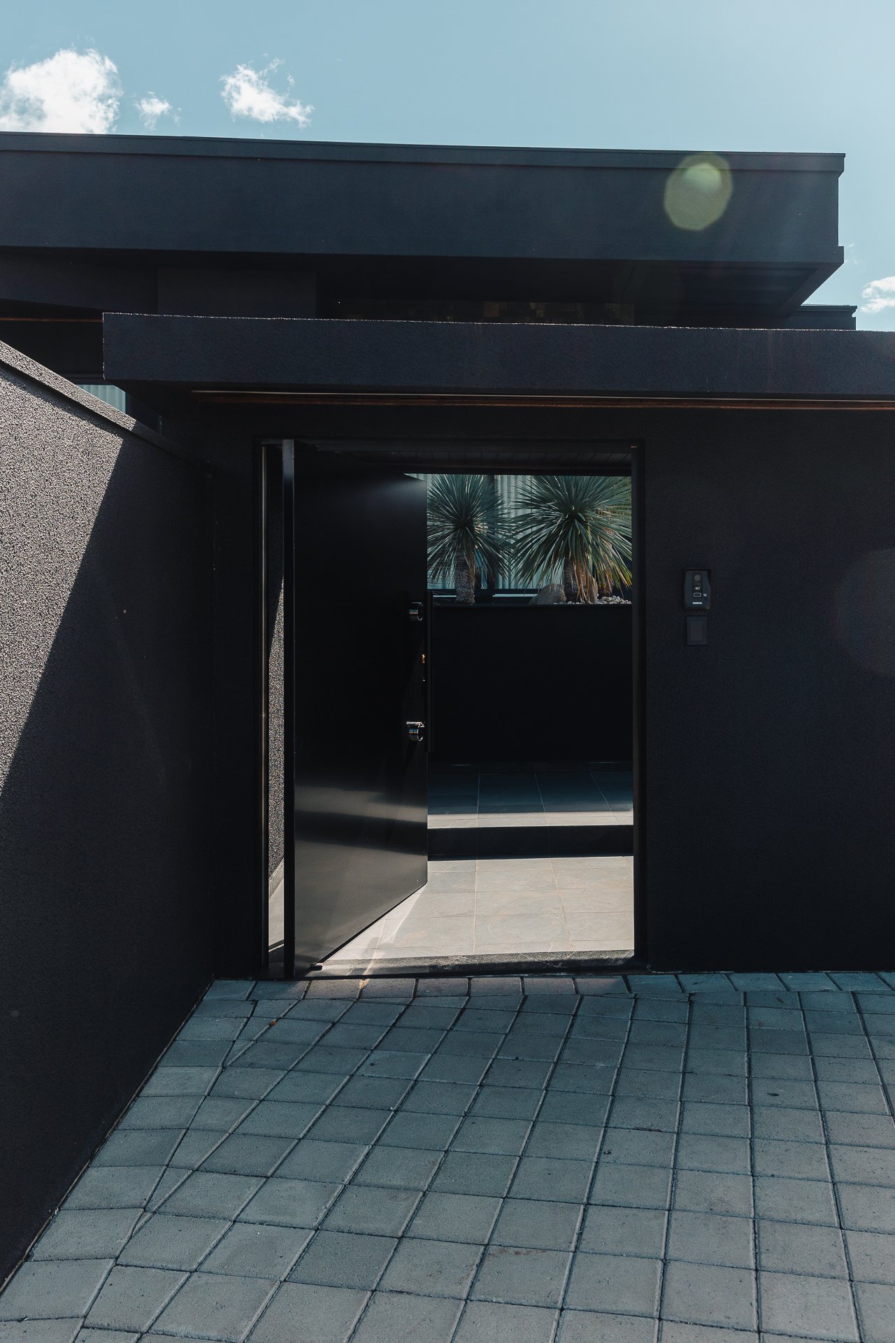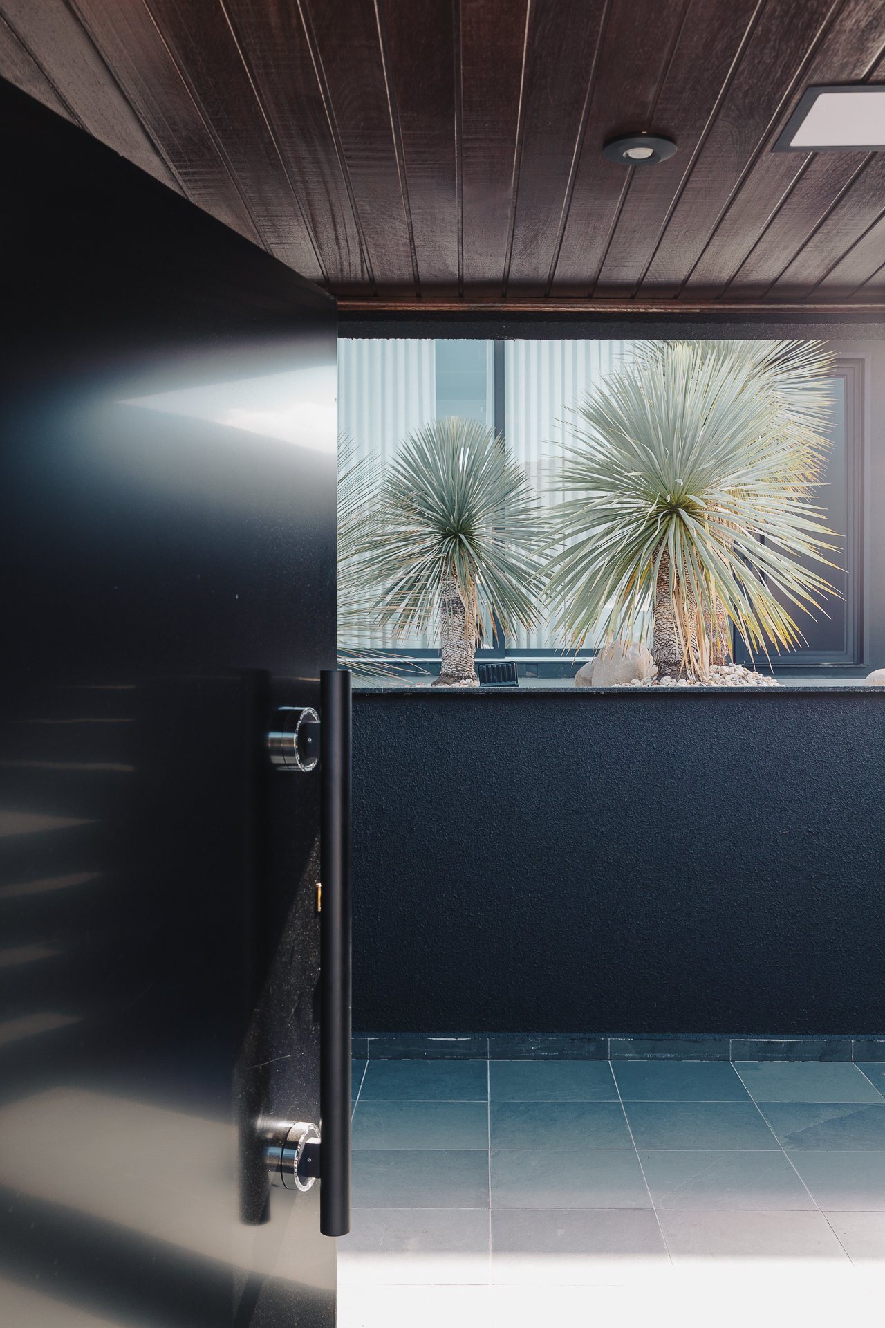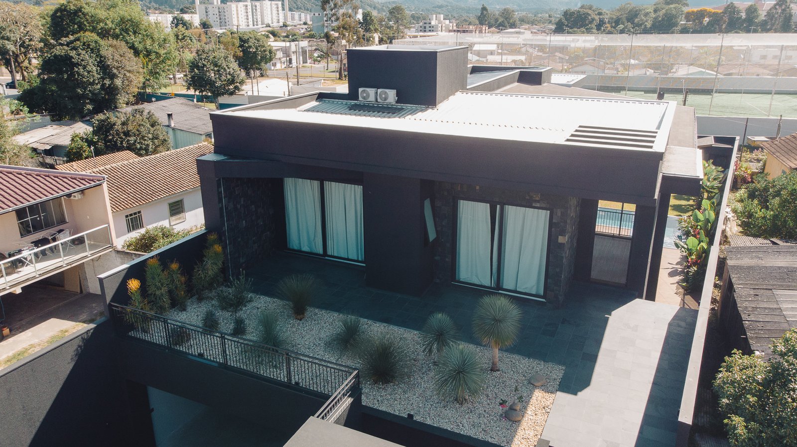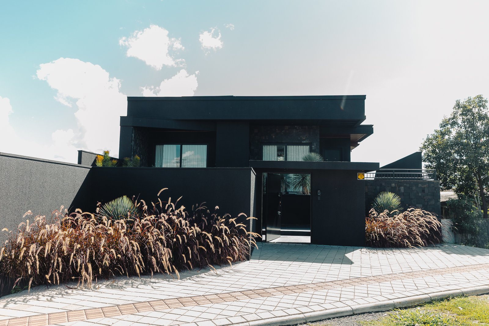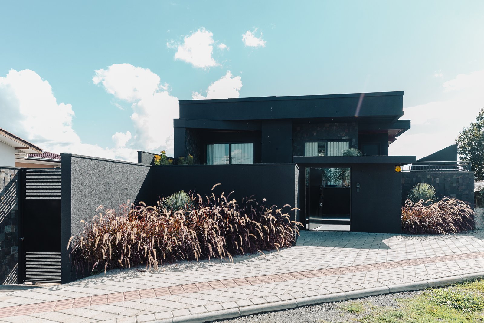 O paisagismo foi concebido como elemento estrutural do projeto, e não apenas como adorno. A seleção de espécies esculturais compõe um jardim seco, de baixa manutenção, que reforça a estética minimalista da arquitetura.