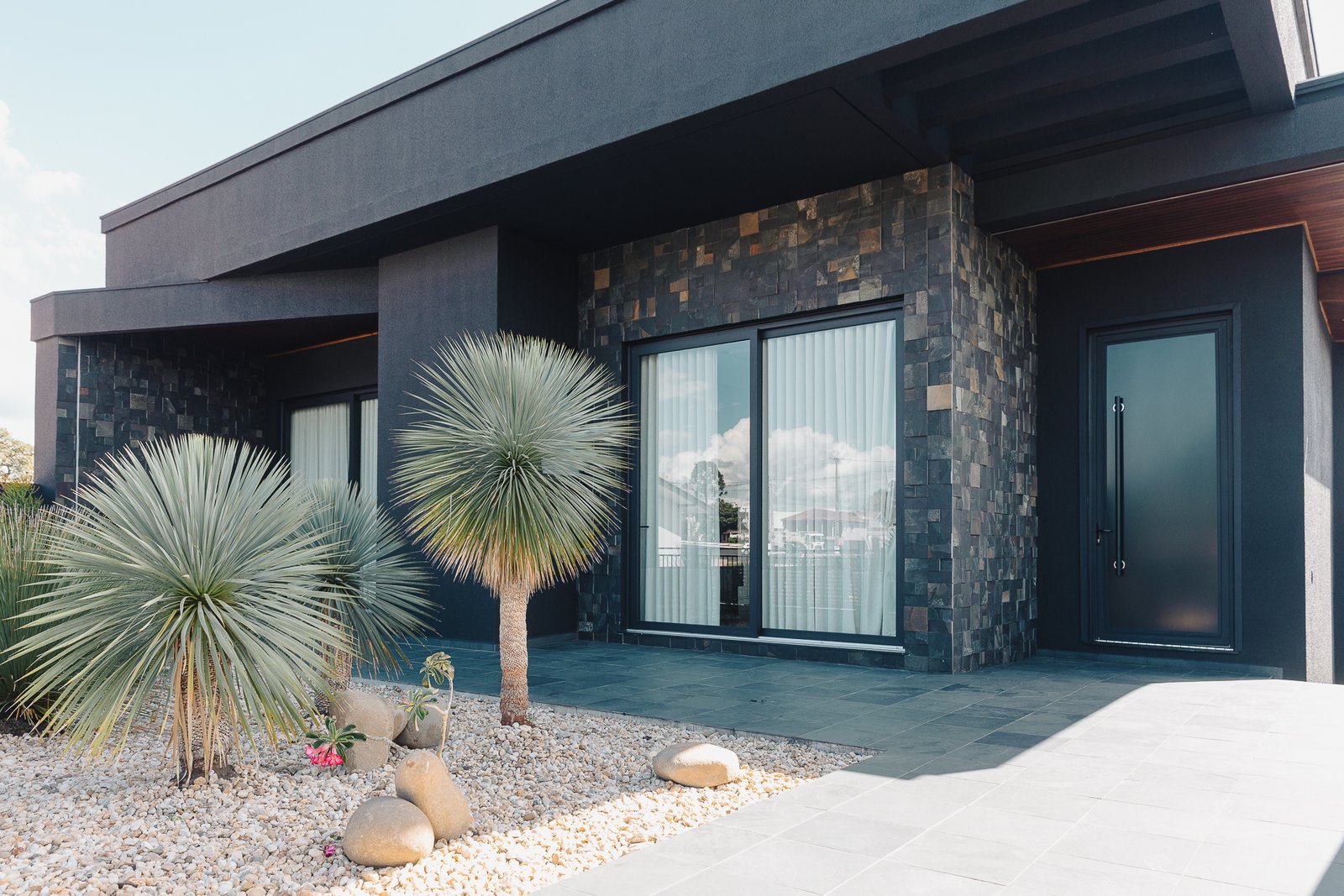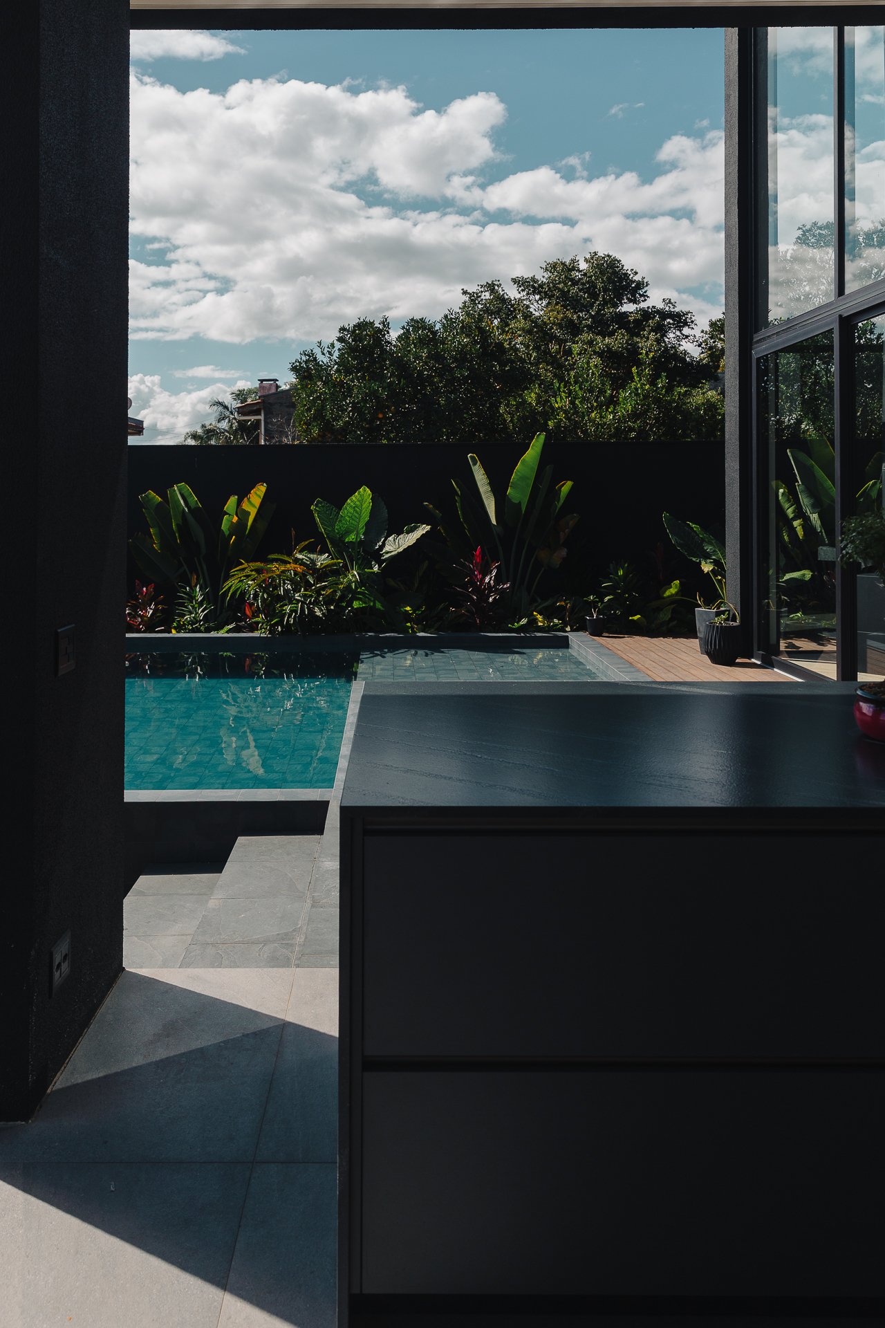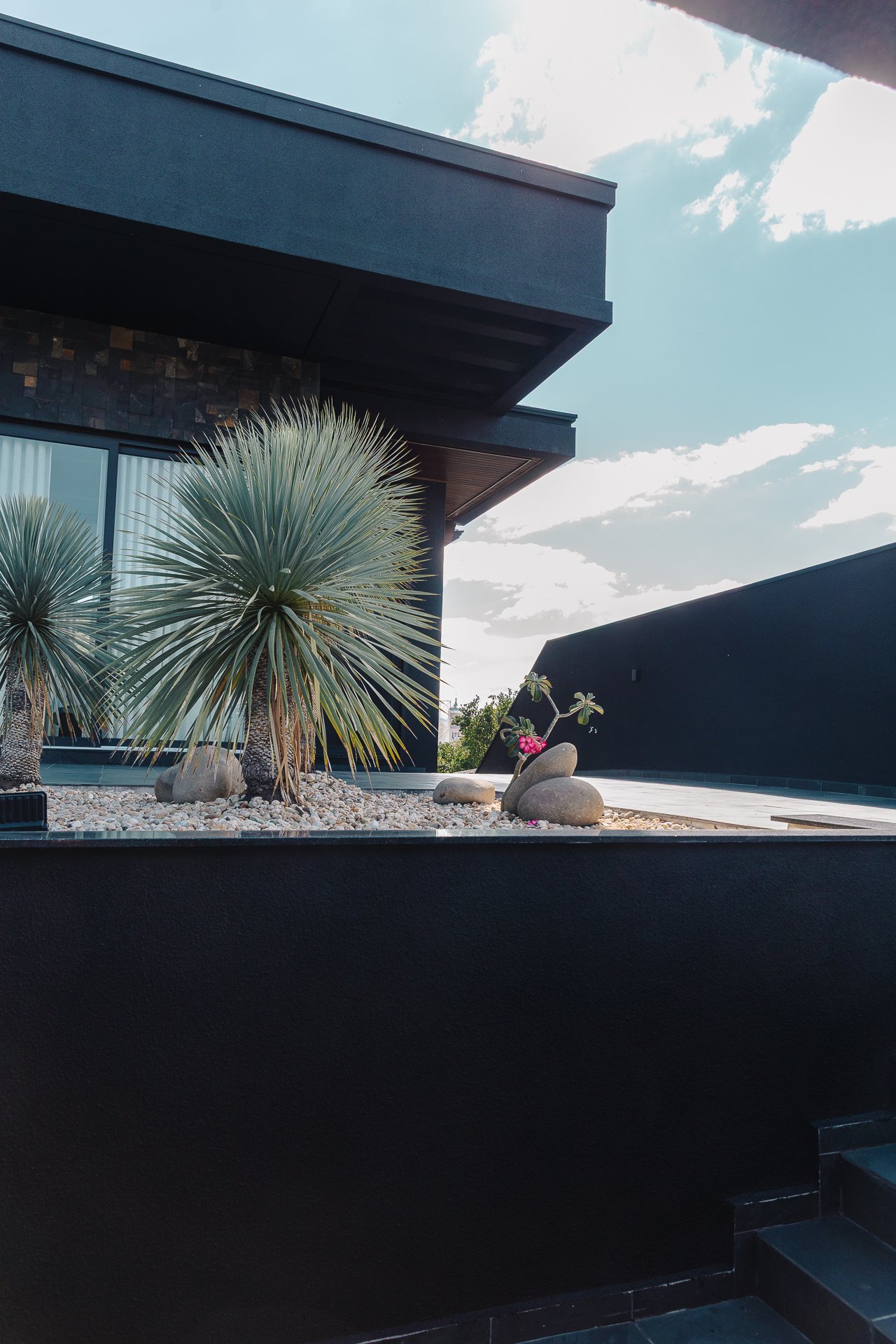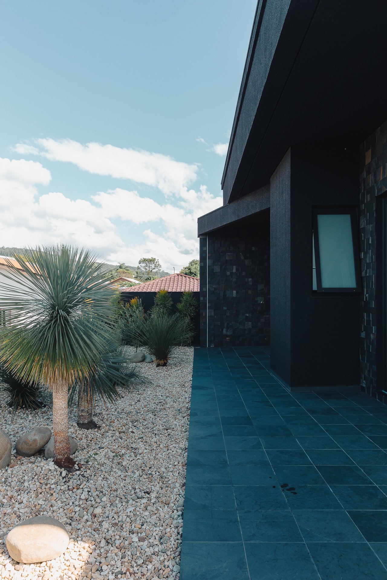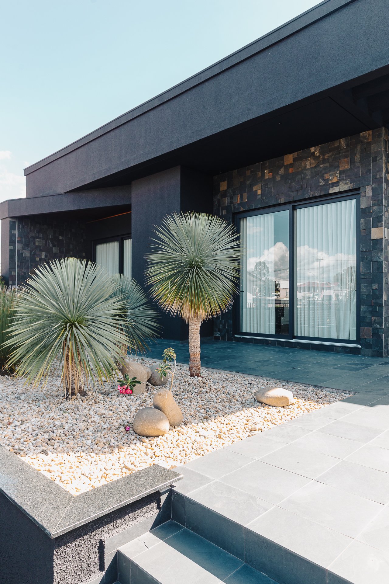 As pedras naturais e os volumes vegetais criam contraste com a rigidez dos planos pretos, trazendo textura, ritmo e respiro visual.