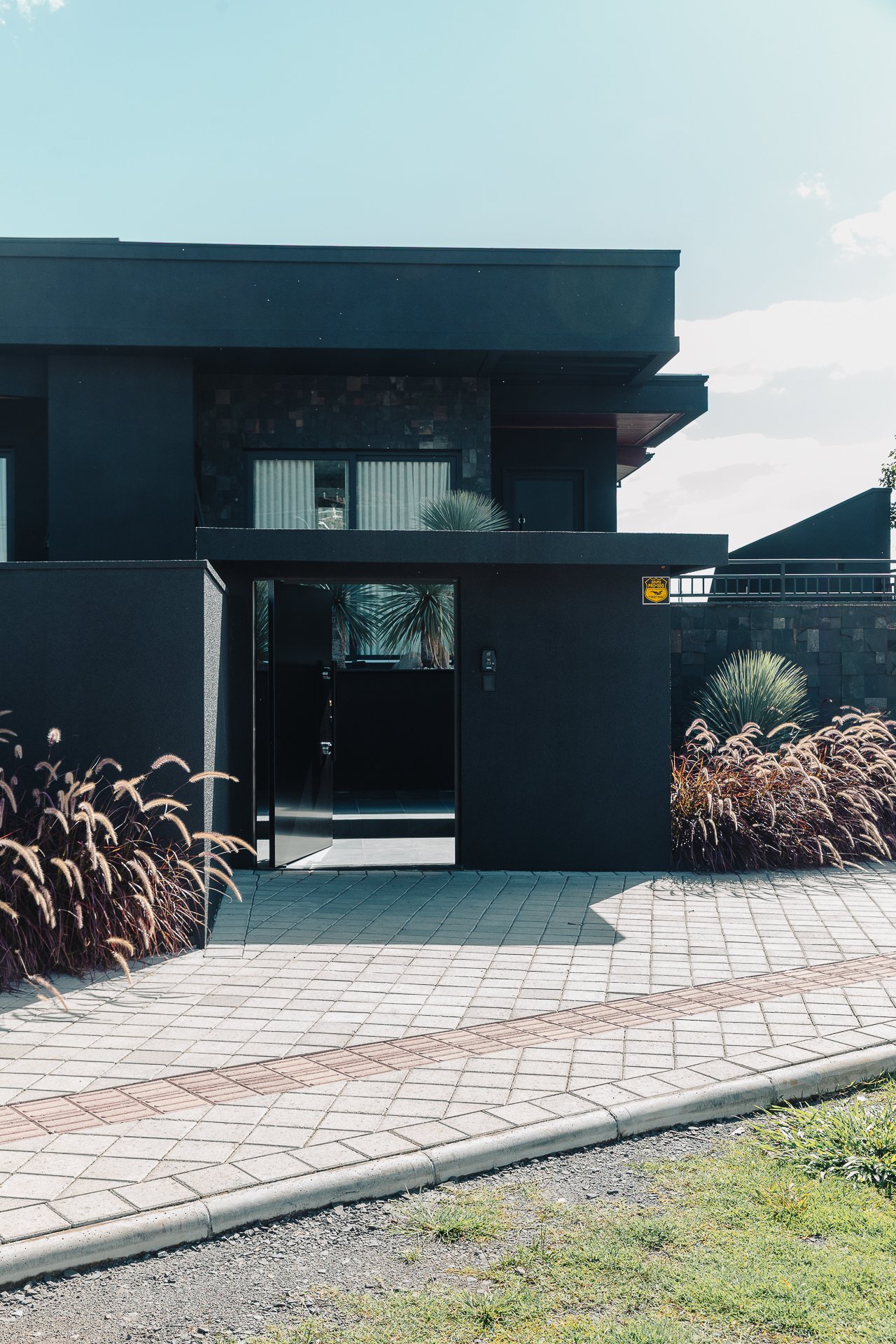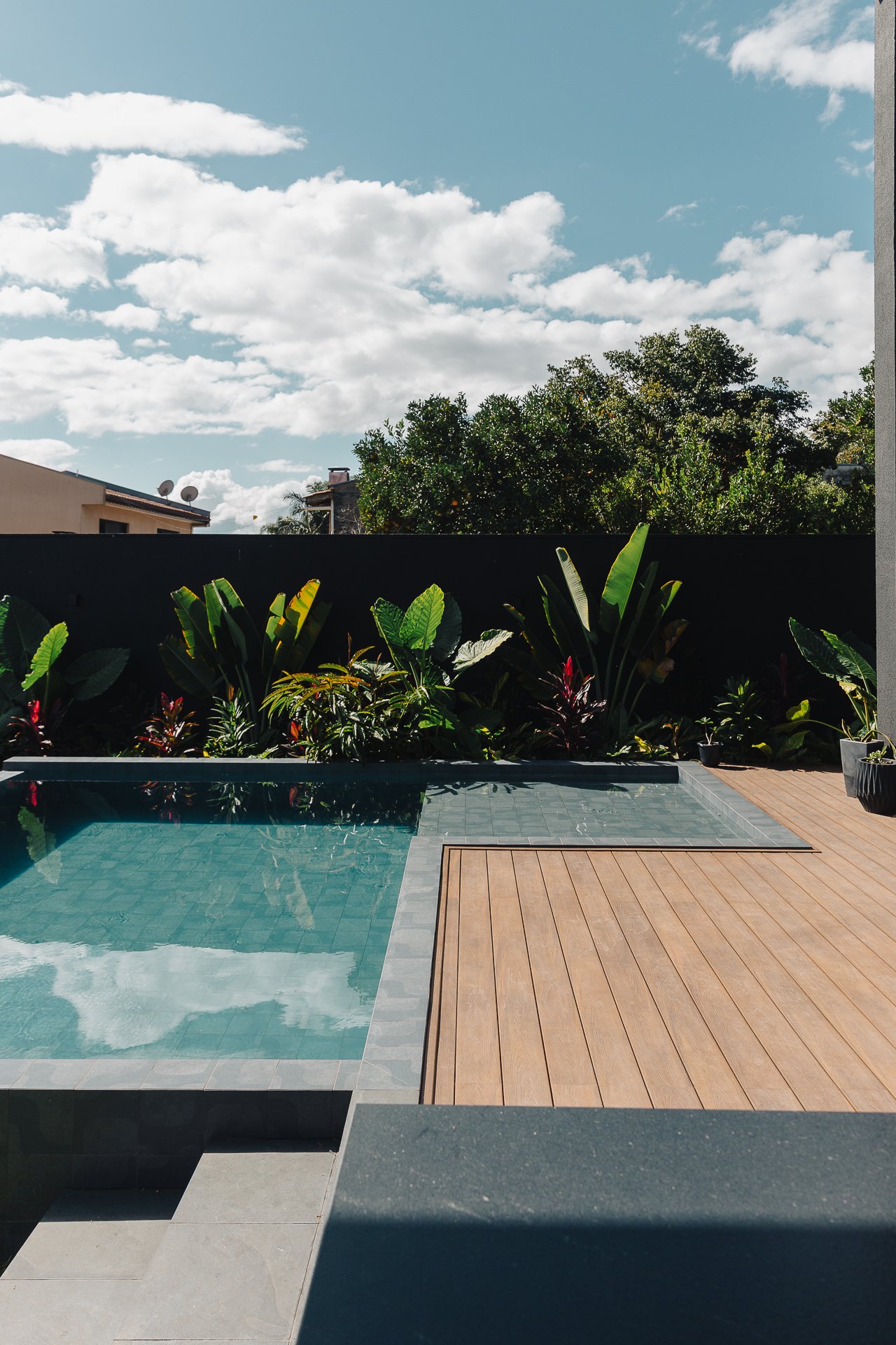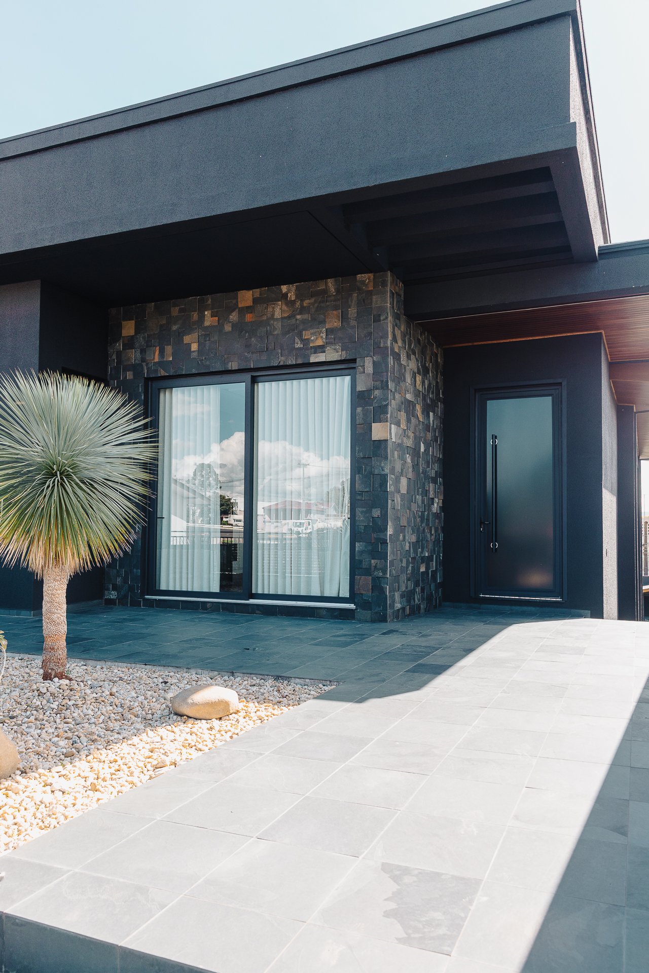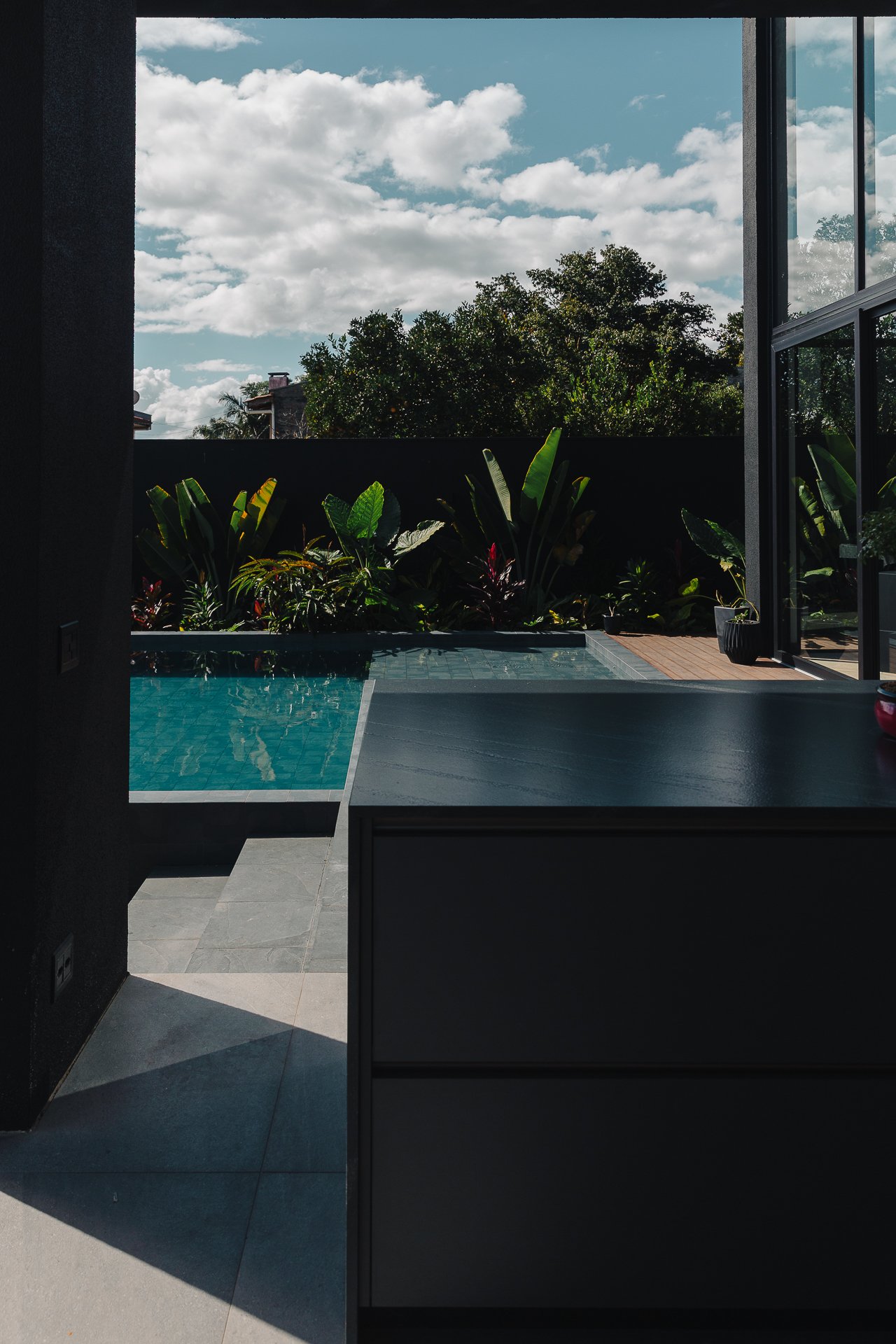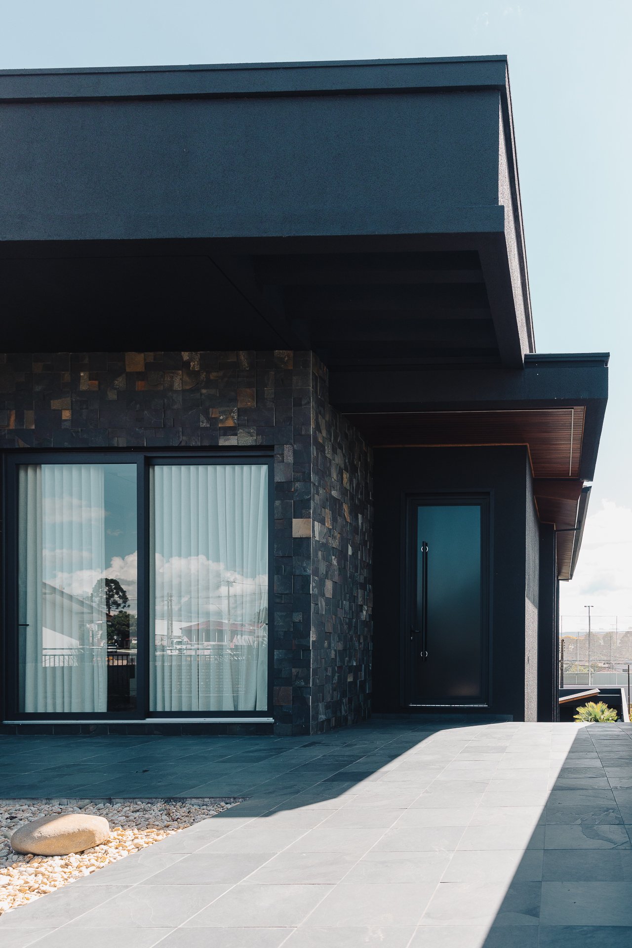 As pedras naturais e os volumes vegetais criam contraste com a rigidez dos planos pretos, trazendo textura, ritmo e respiro visual.