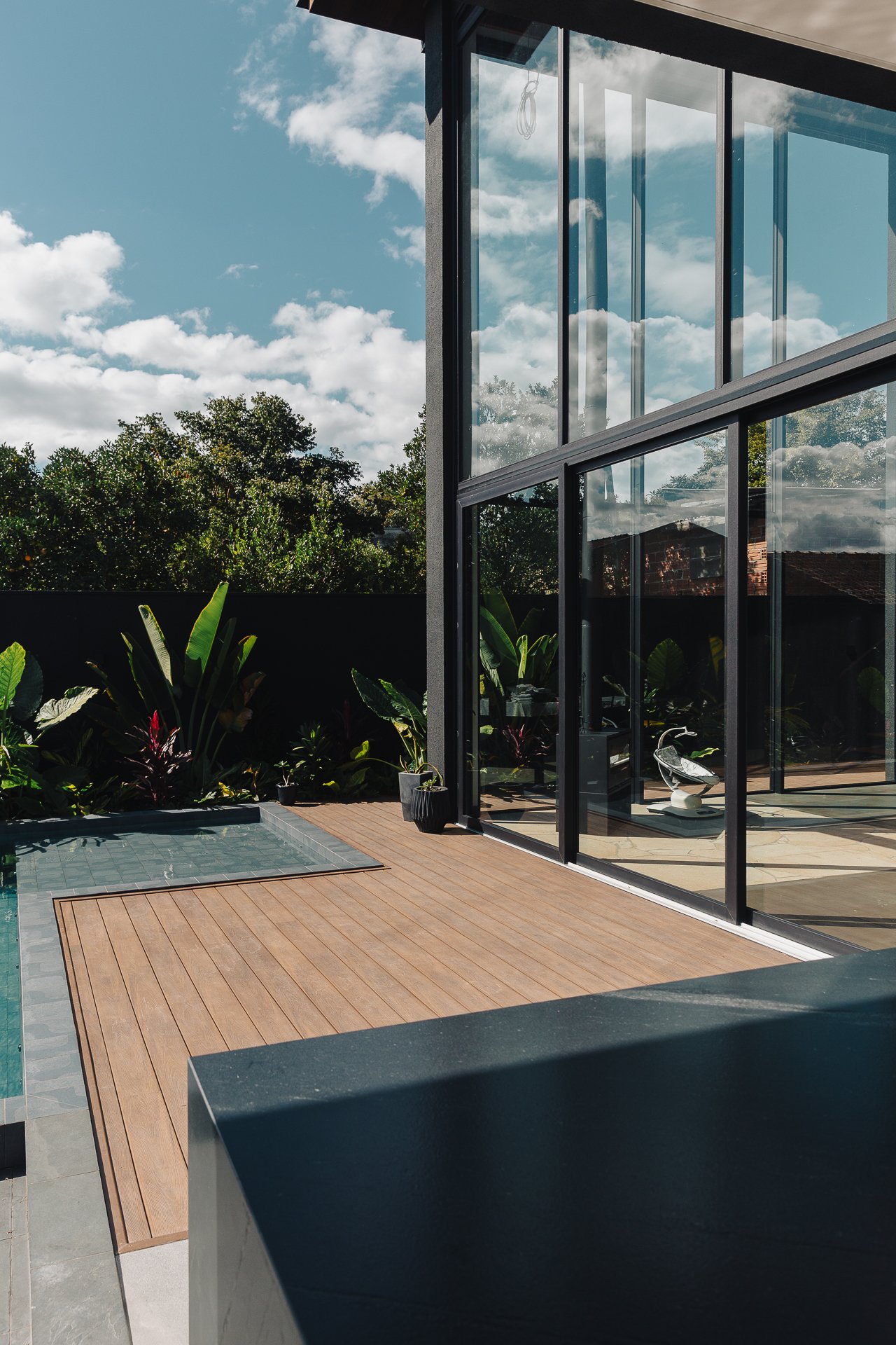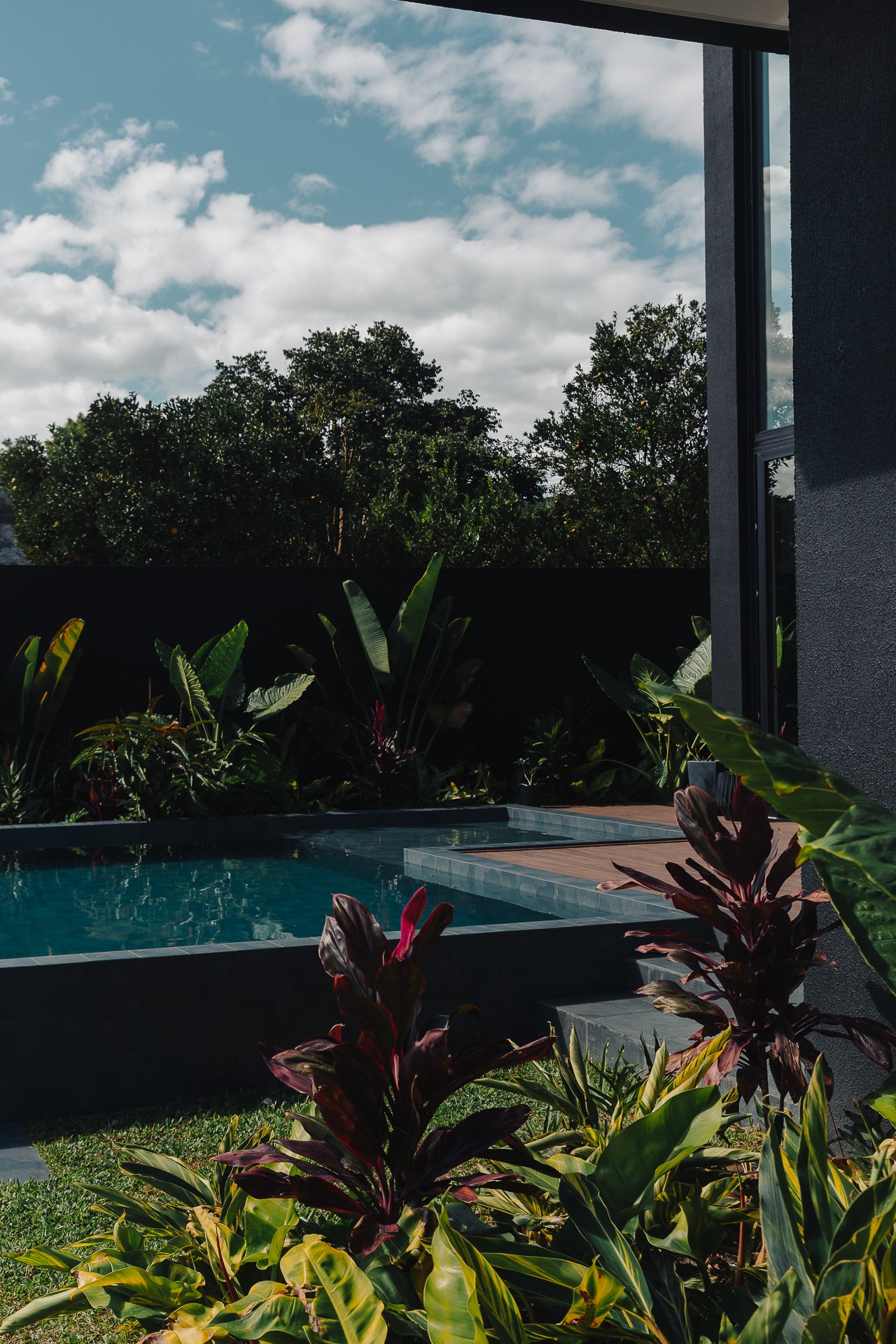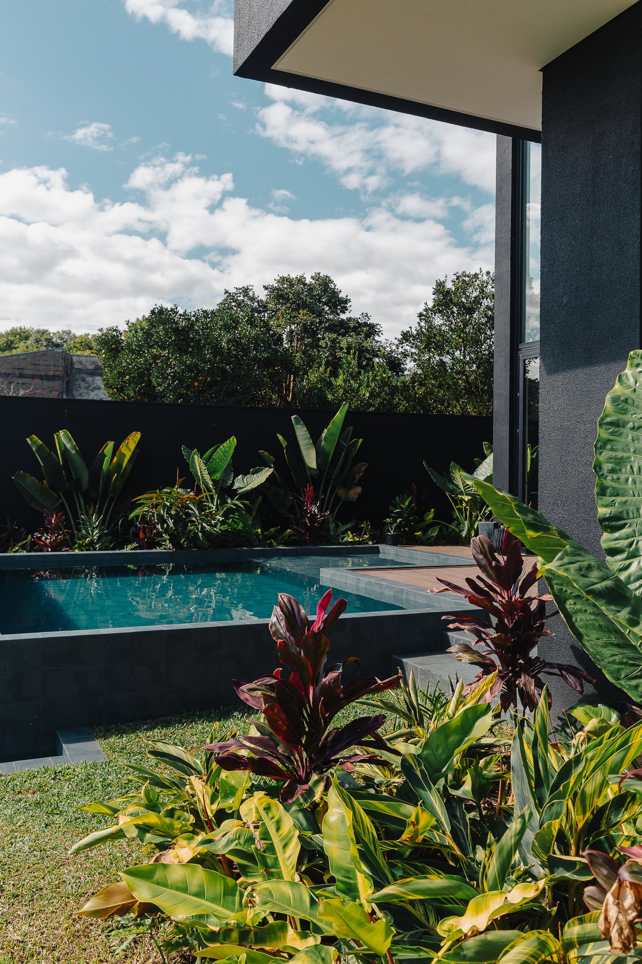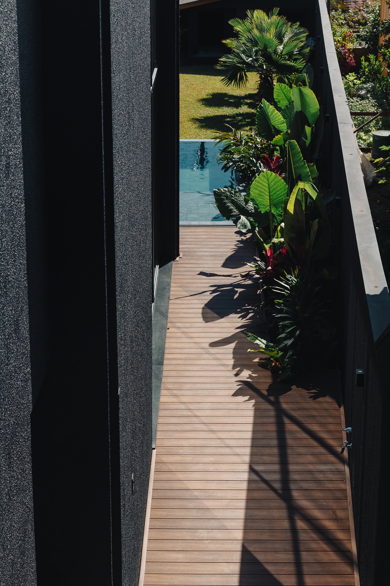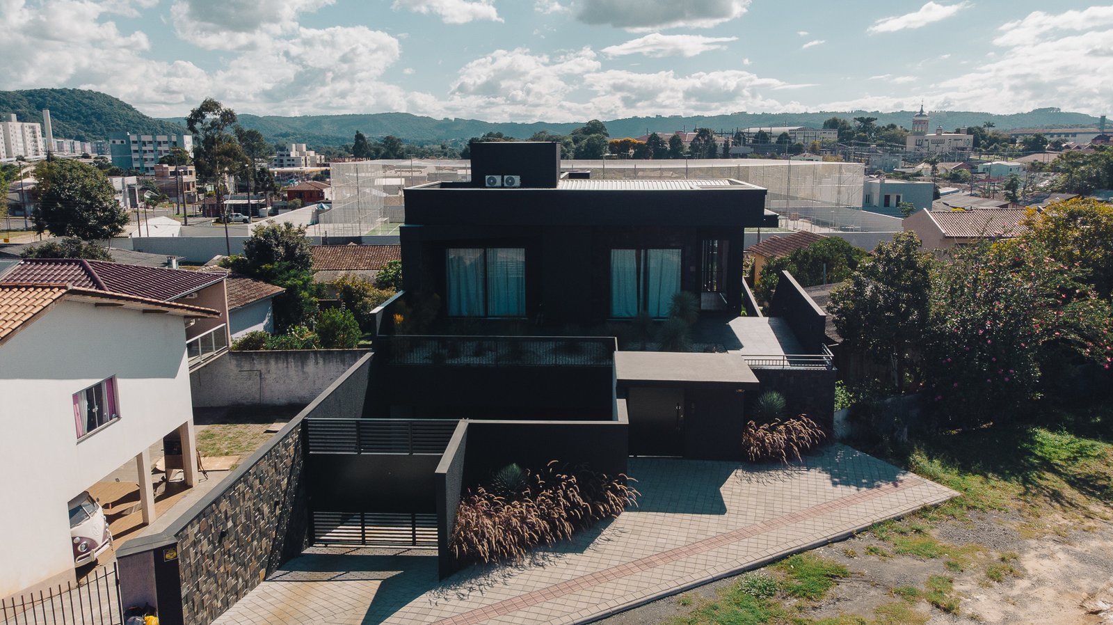 As pedras naturais e os volumes vegetais criam contraste com a rigidez dos planos pretos, trazendo textura, ritmo e respiro visual.