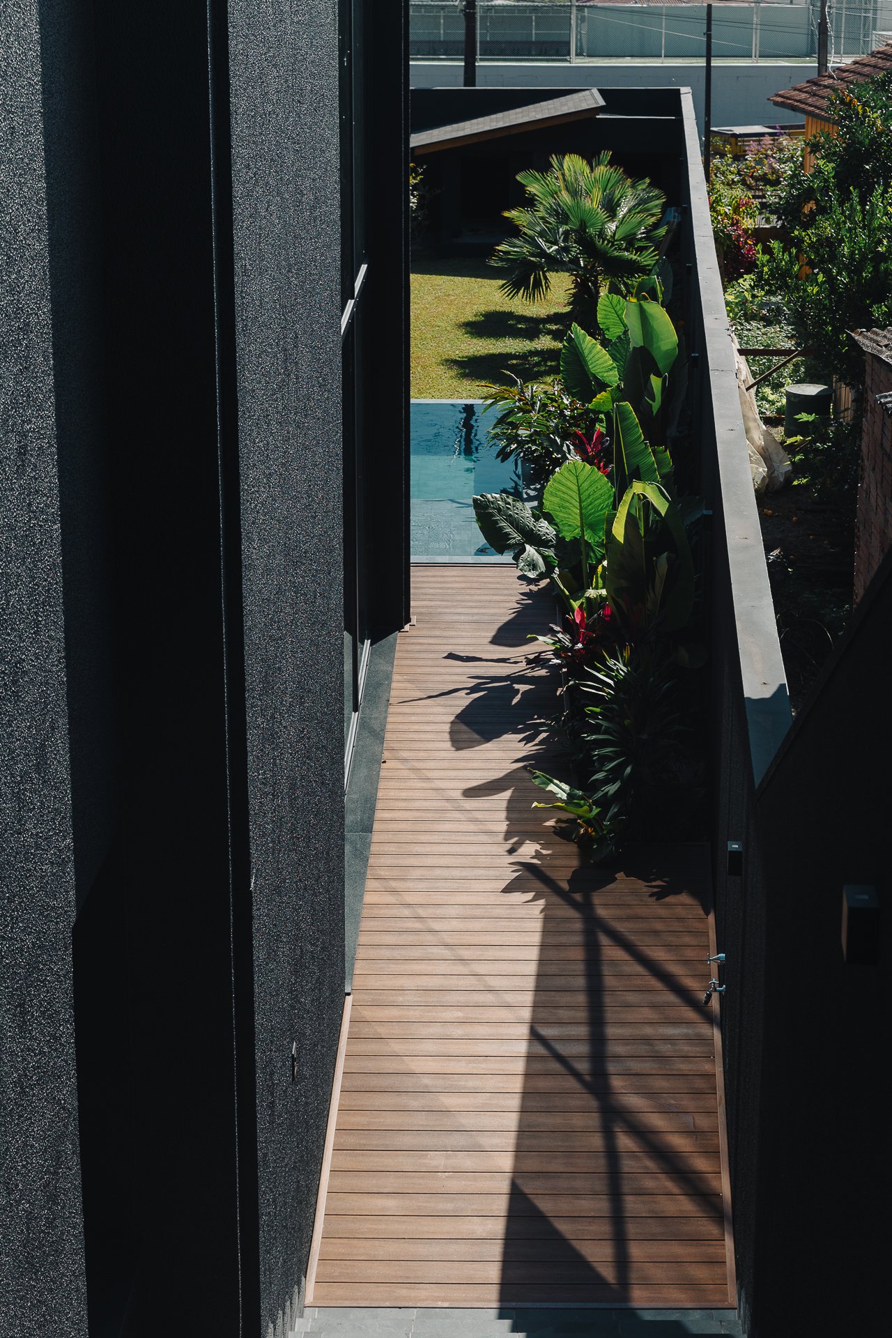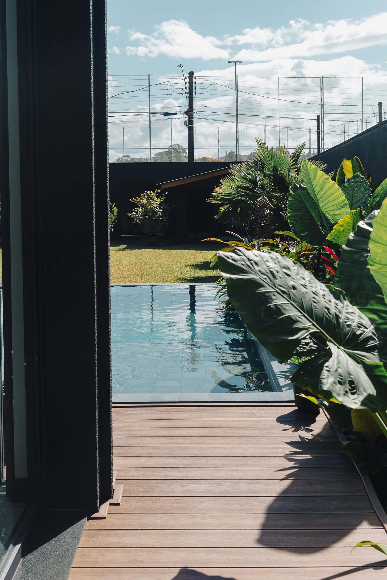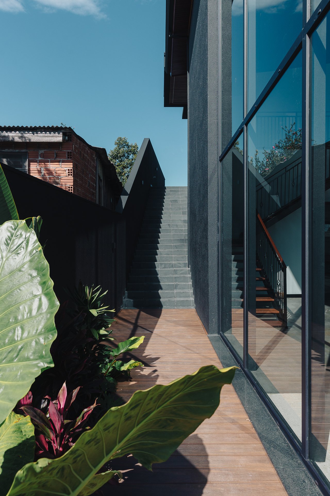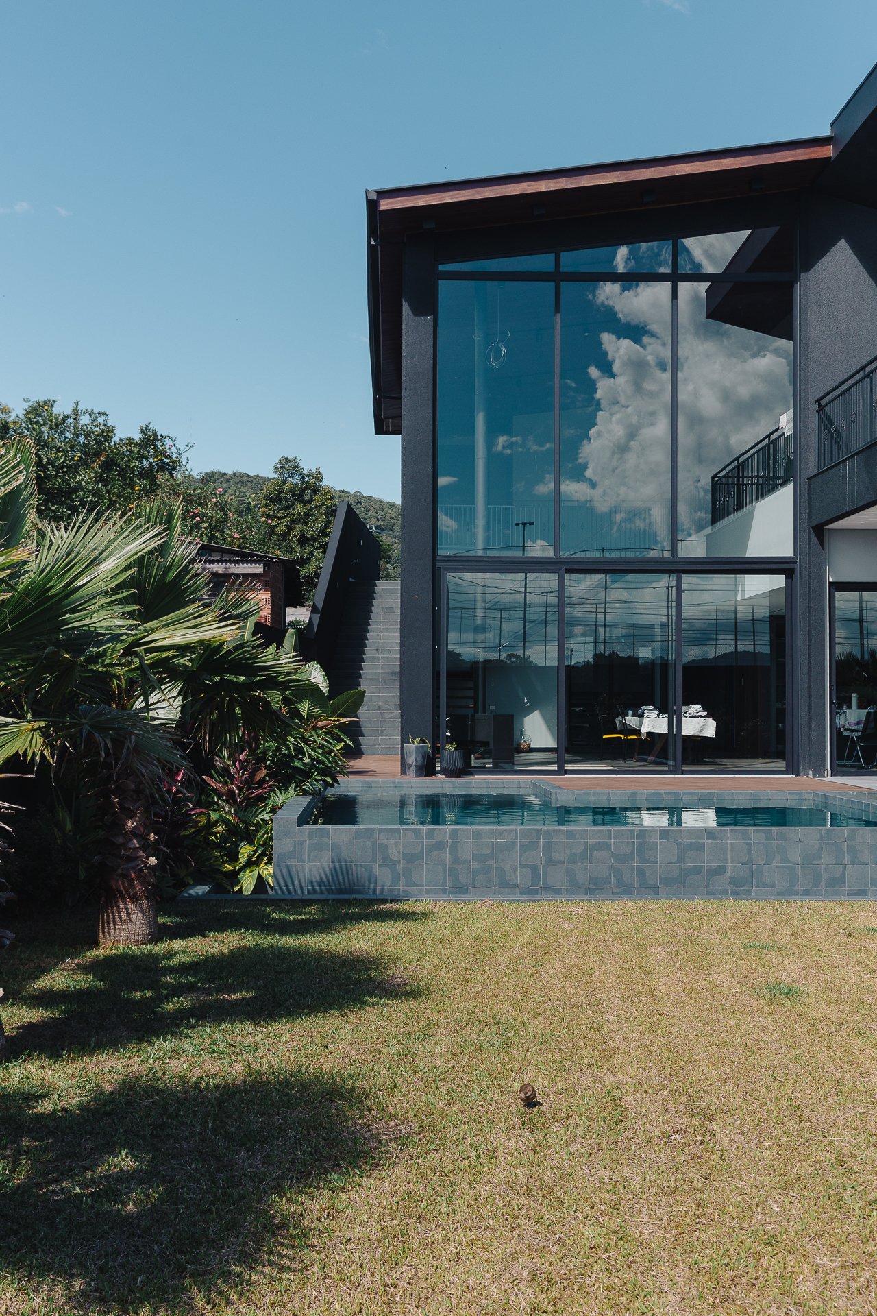 O diálogo entre o construído e o natural estabelece um equilíbrio preciso, onde cada componente assume uma função estética e funcional dentro da composição arquitetônica.