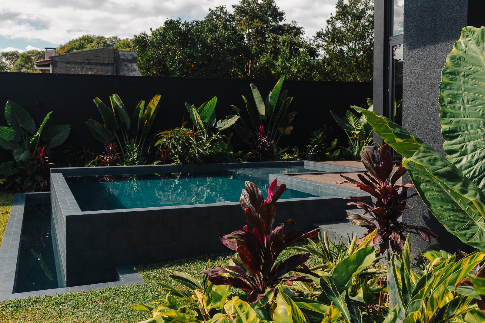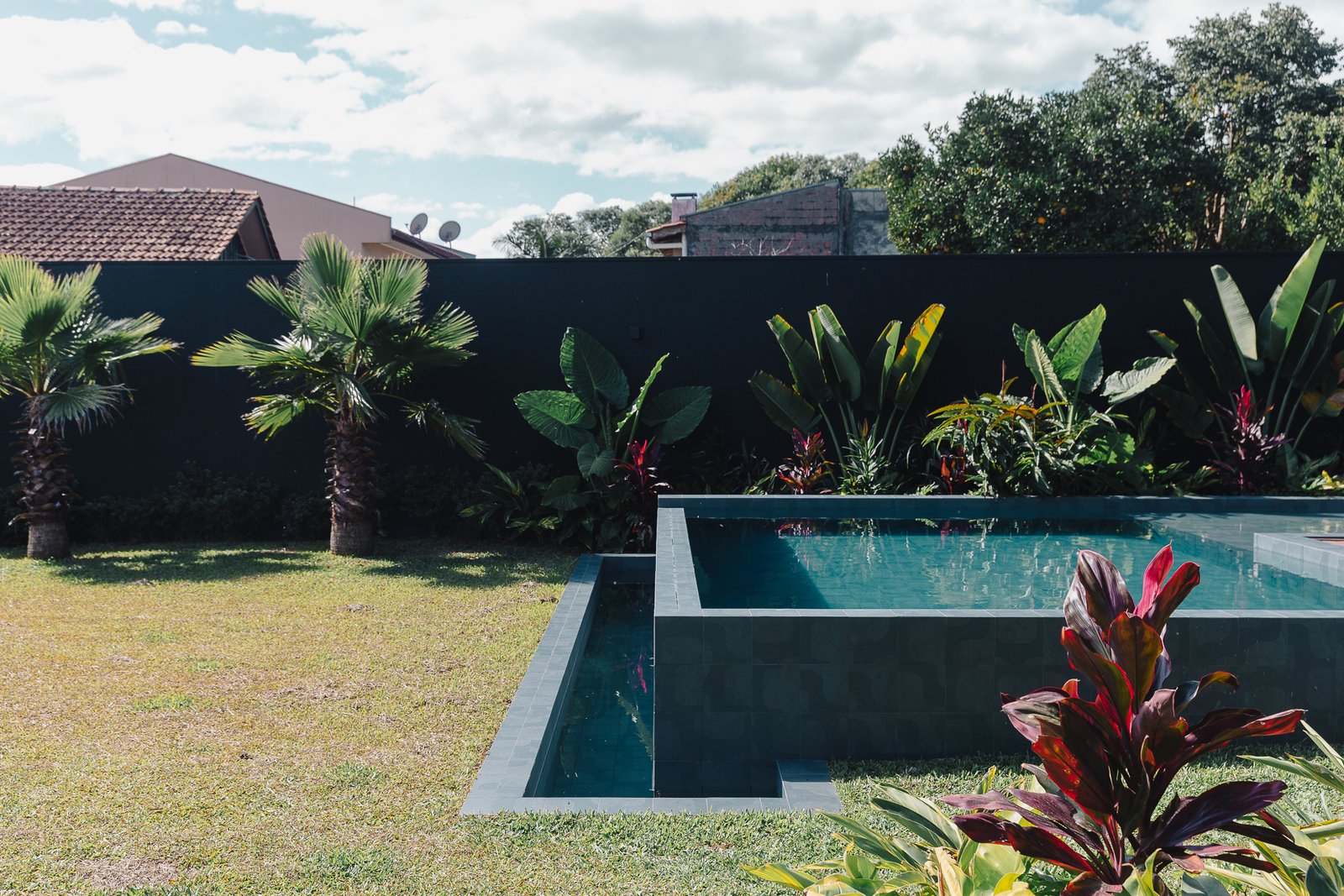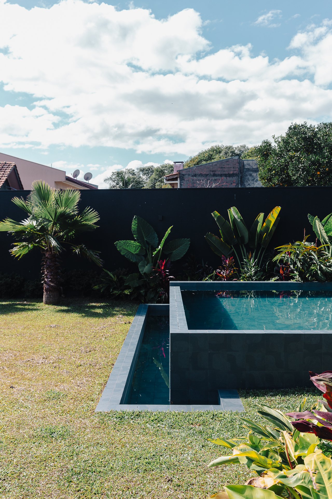O diálogo entre o construído e o natural estabelece um equilíbrio preciso, onde cada componente assume uma função estética e funcional dentro da composição arquitetônica.