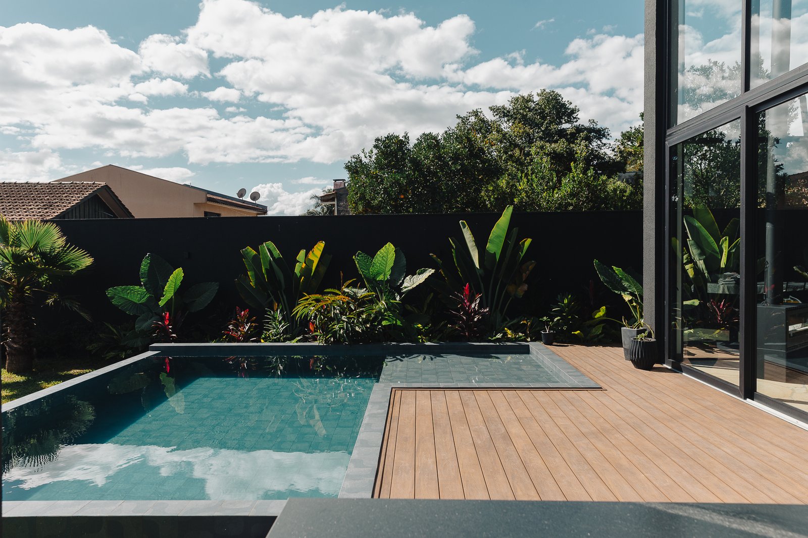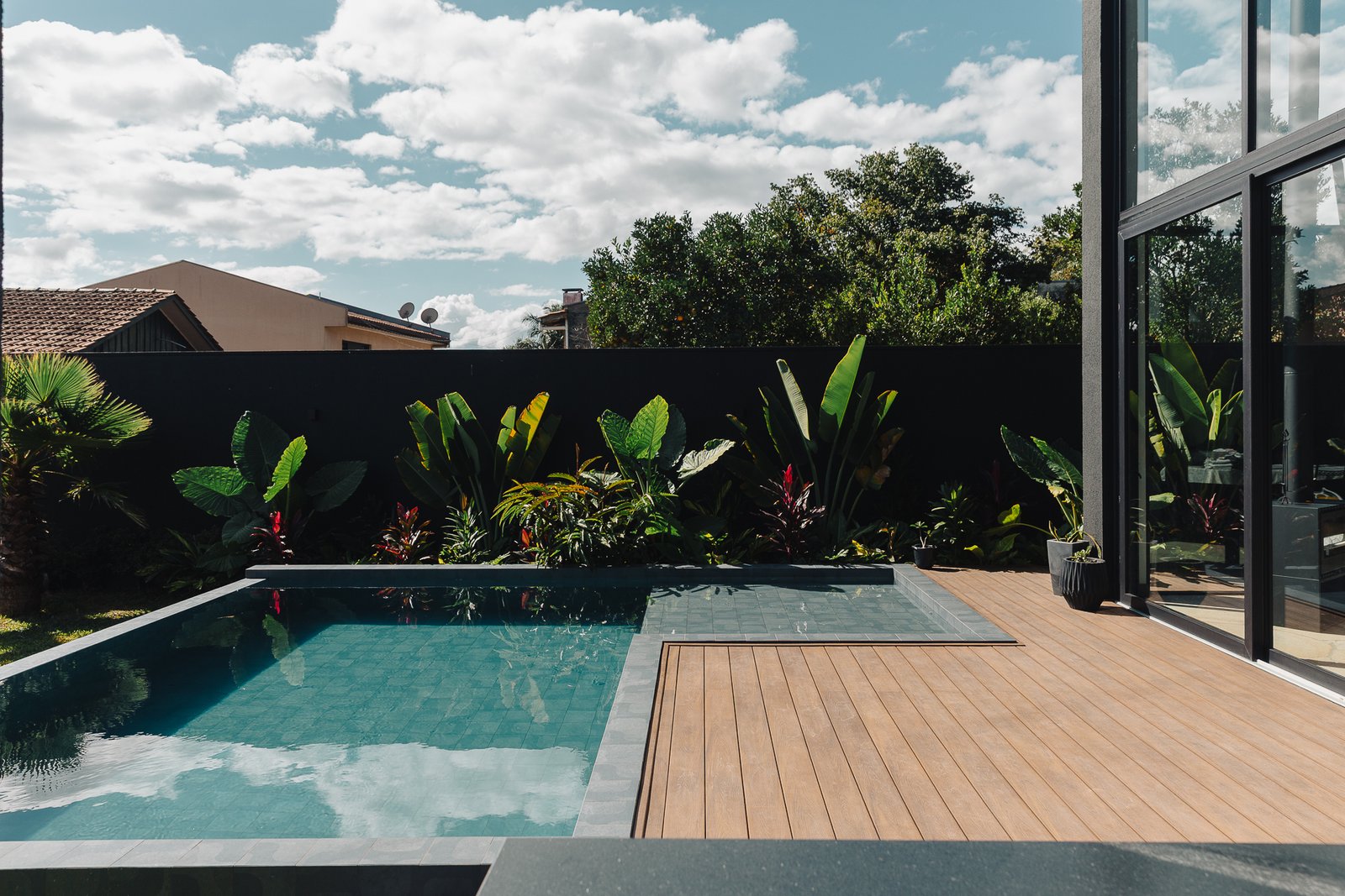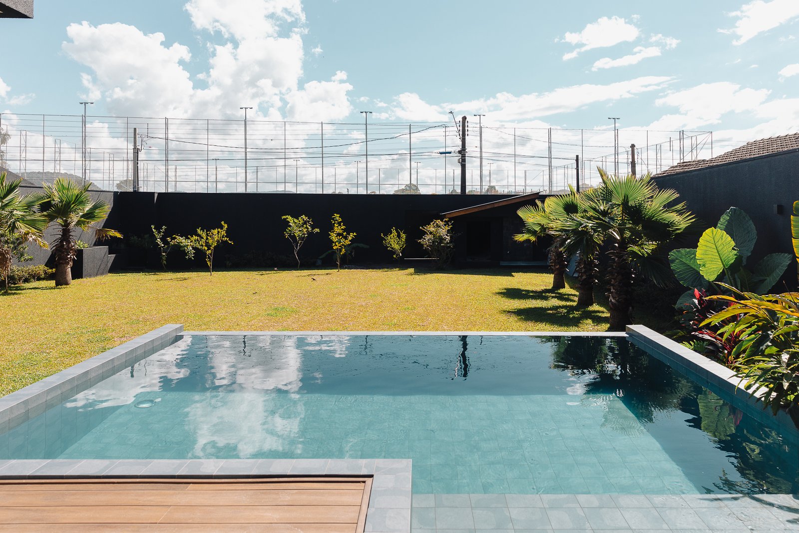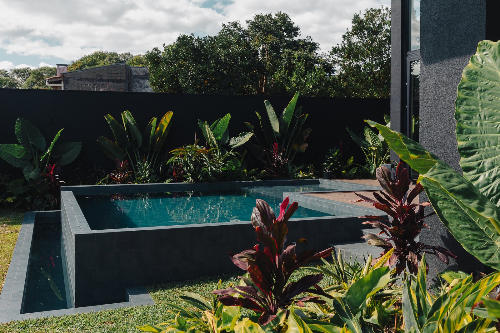 O diálogo entre o construído e o natural estabelece um equilíbrio preciso, onde cada componente assume uma função estética e funcional dentro da composição arquitetônica.