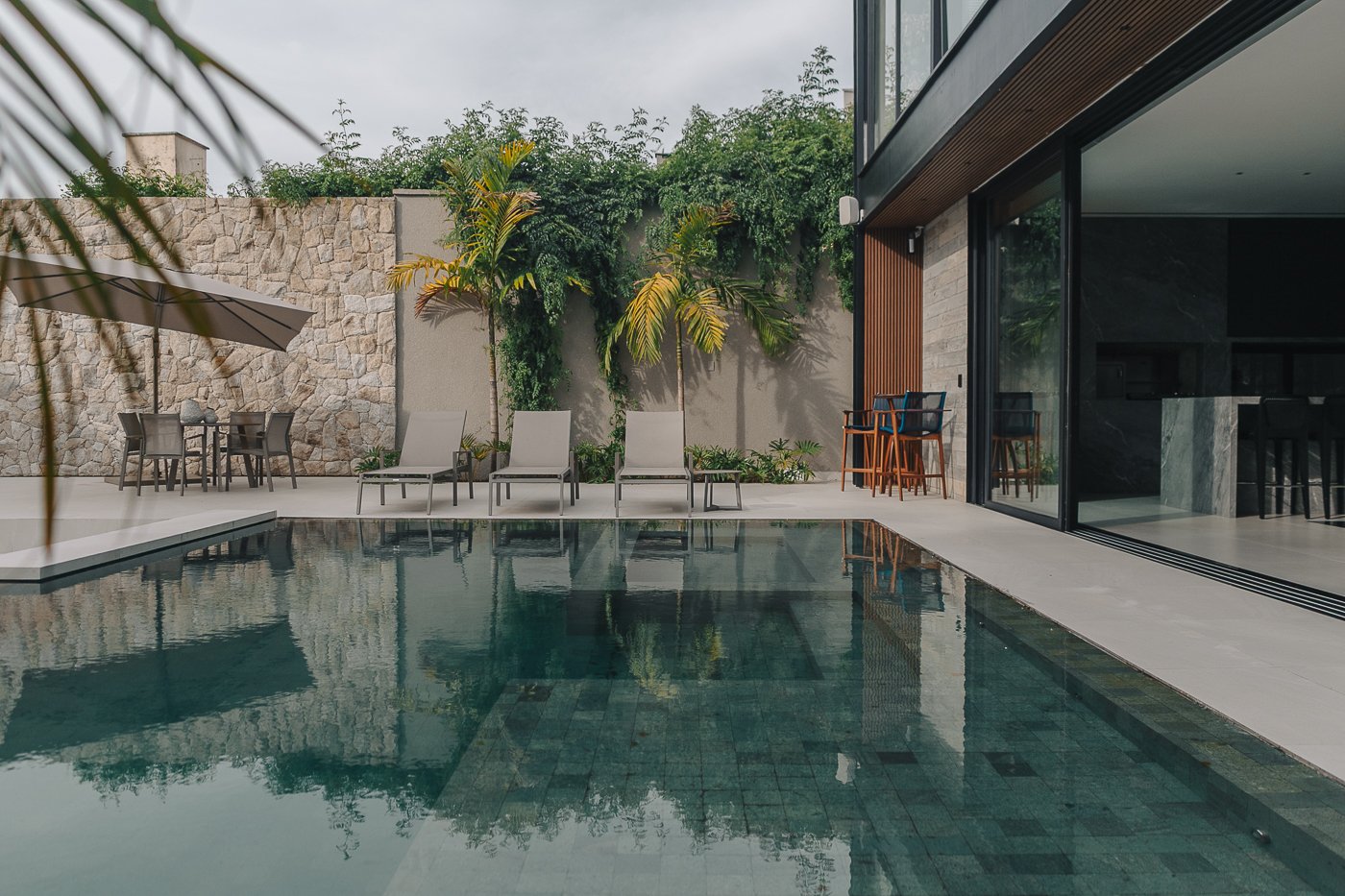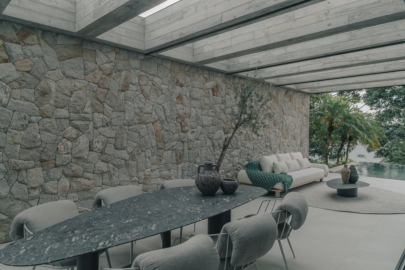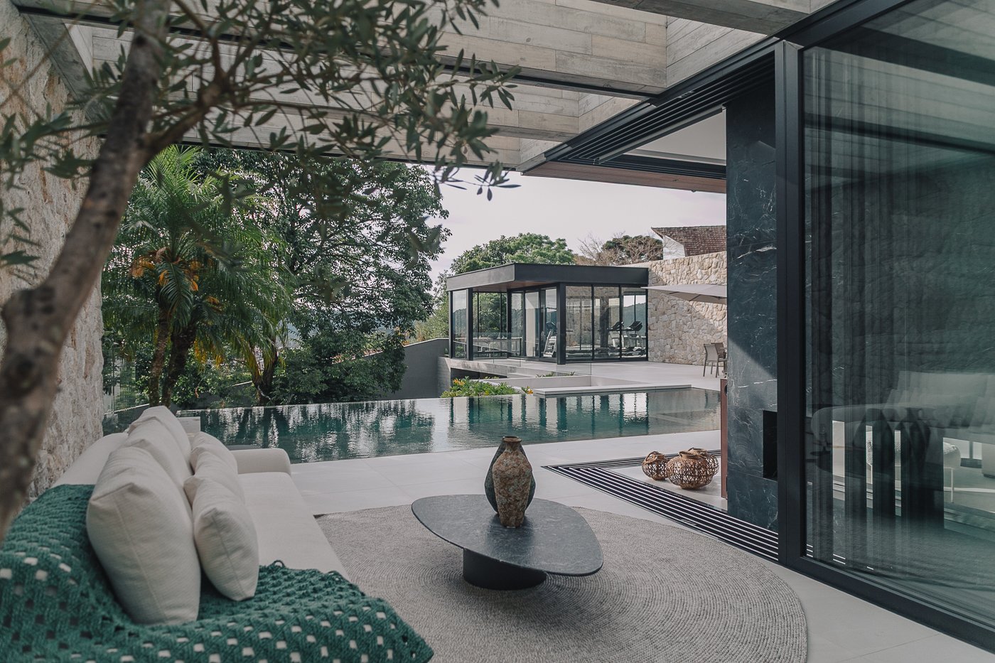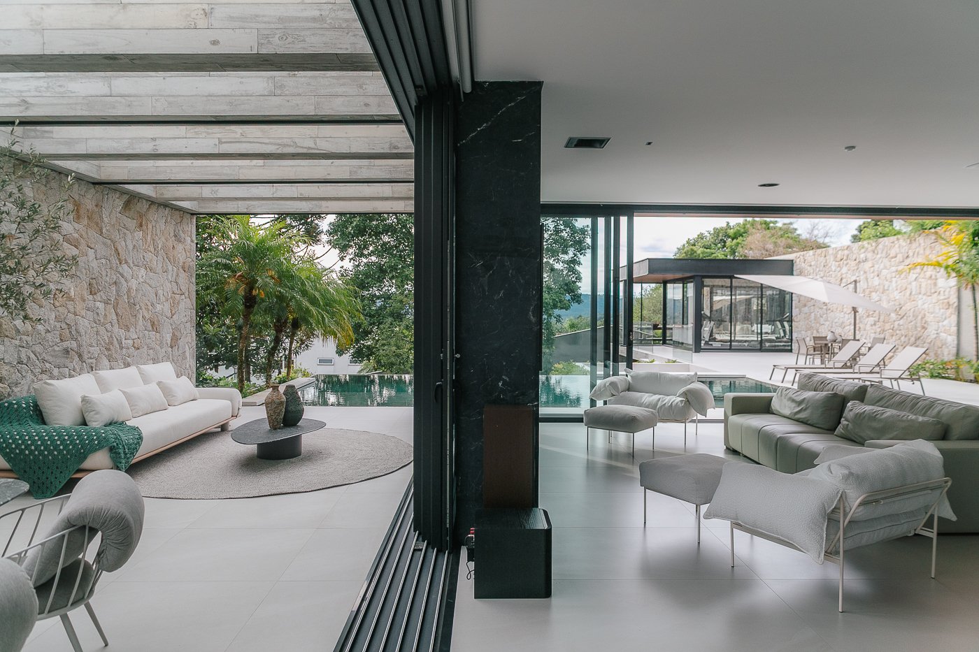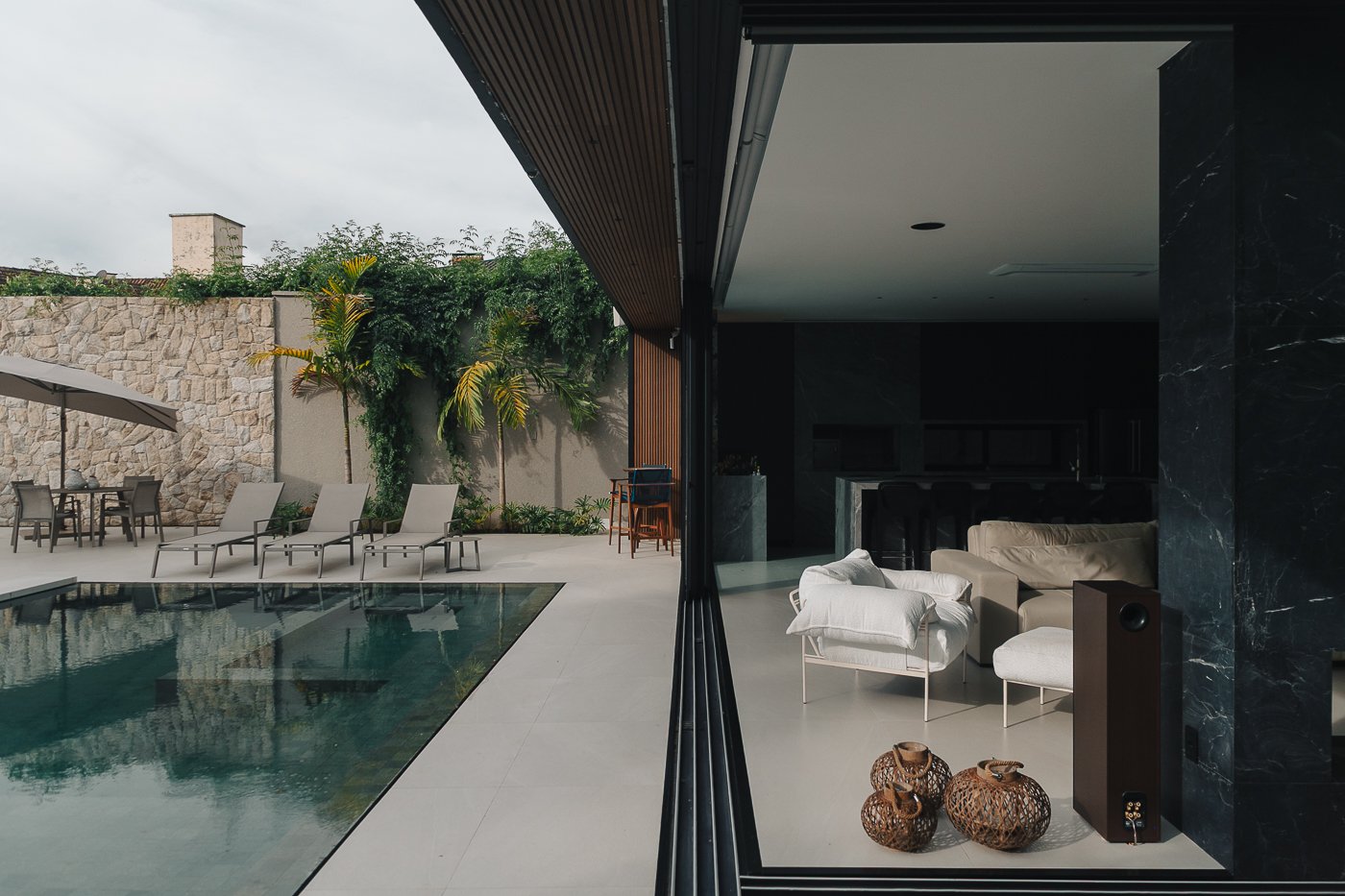 Neste ambiente integrado, a arquitetura atua como elo entre interior e exterior. Grandes planos de vidro, esquadrias deslizantes e materiais contínuos permitem que a área social se estenda naturalmente até a piscina e o jardim, criando uma experiência espacial fluida e sensorial. A pedra natural, o concreto aparente e a paleta neutra reforçam a sensação de permanência e conforto, enquanto a vegetação e a água trazem frescor e movimento ao conjunto. Mais do que abrir a casa para fora, o projeto convida a paisagem a fazer parte do cotidiano, valorizando luz natural, ventilação cruzada e a convivência entre arquitetura e natureza. Integração que se sente, se vive e se contempla.