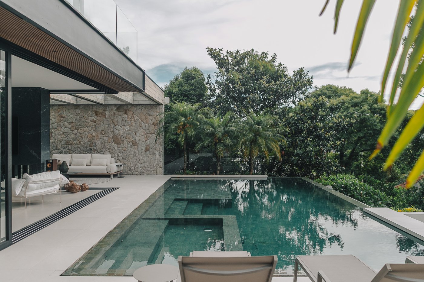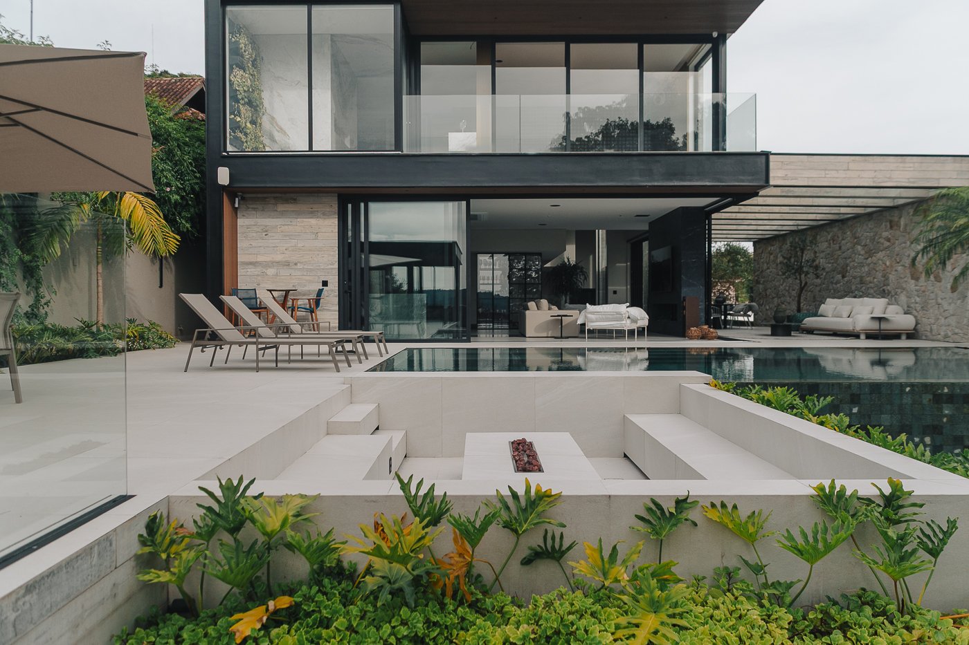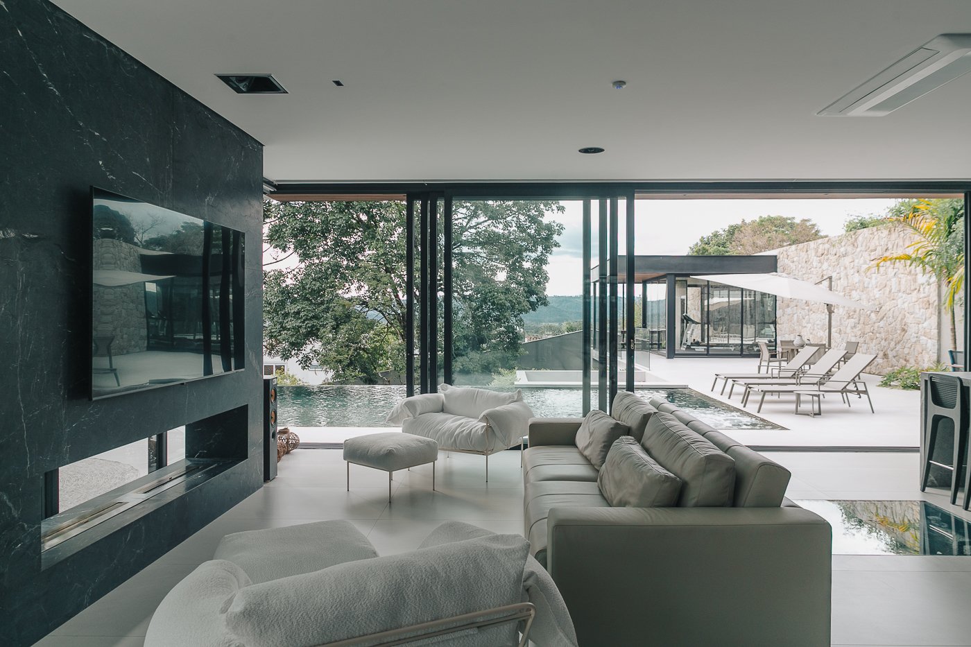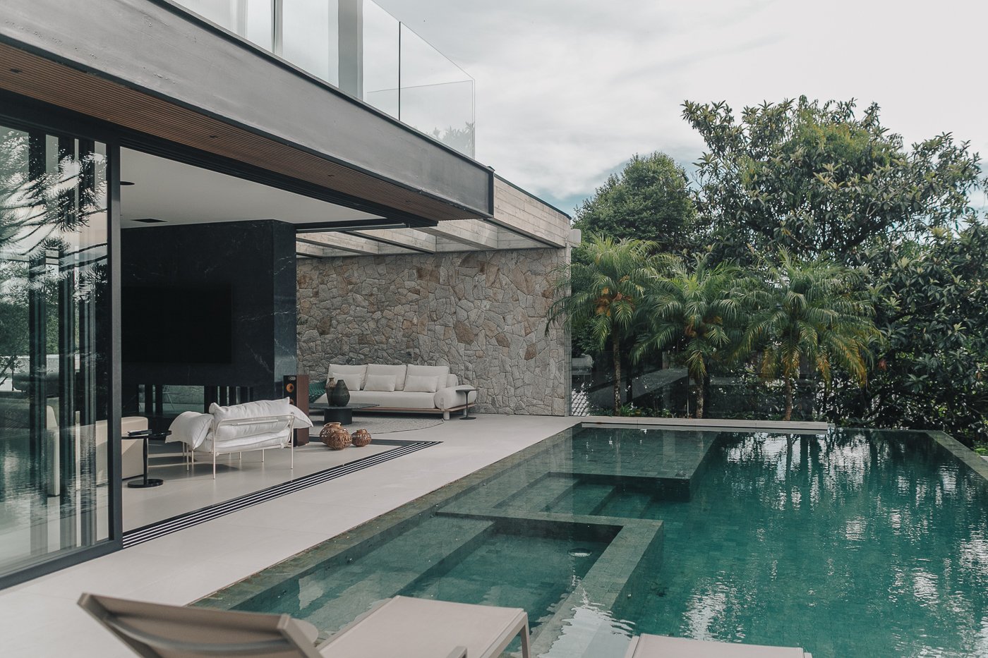 Neste ambiente integrado, a arquitetura atua como elo entre interior e exterior. Grandes planos de vidro, esquadrias deslizantes e materiais contínuos permitem que a área social se estenda naturalmente até a piscina e o jardim, criando uma experiência espacial fluida e sensorial. A pedra natural, o concreto aparente e a paleta neutra reforçam a sensação de permanência e conforto, enquanto a vegetação e a água trazem frescor e movimento ao conjunto. Mais do que abrir a casa para fora, o projeto convida a paisagem a fazer parte do cotidiano, valorizando luz natural, ventilação cruzada e a convivência entre arquitetura e natureza. Integração que se sente, se vive e se contempla.