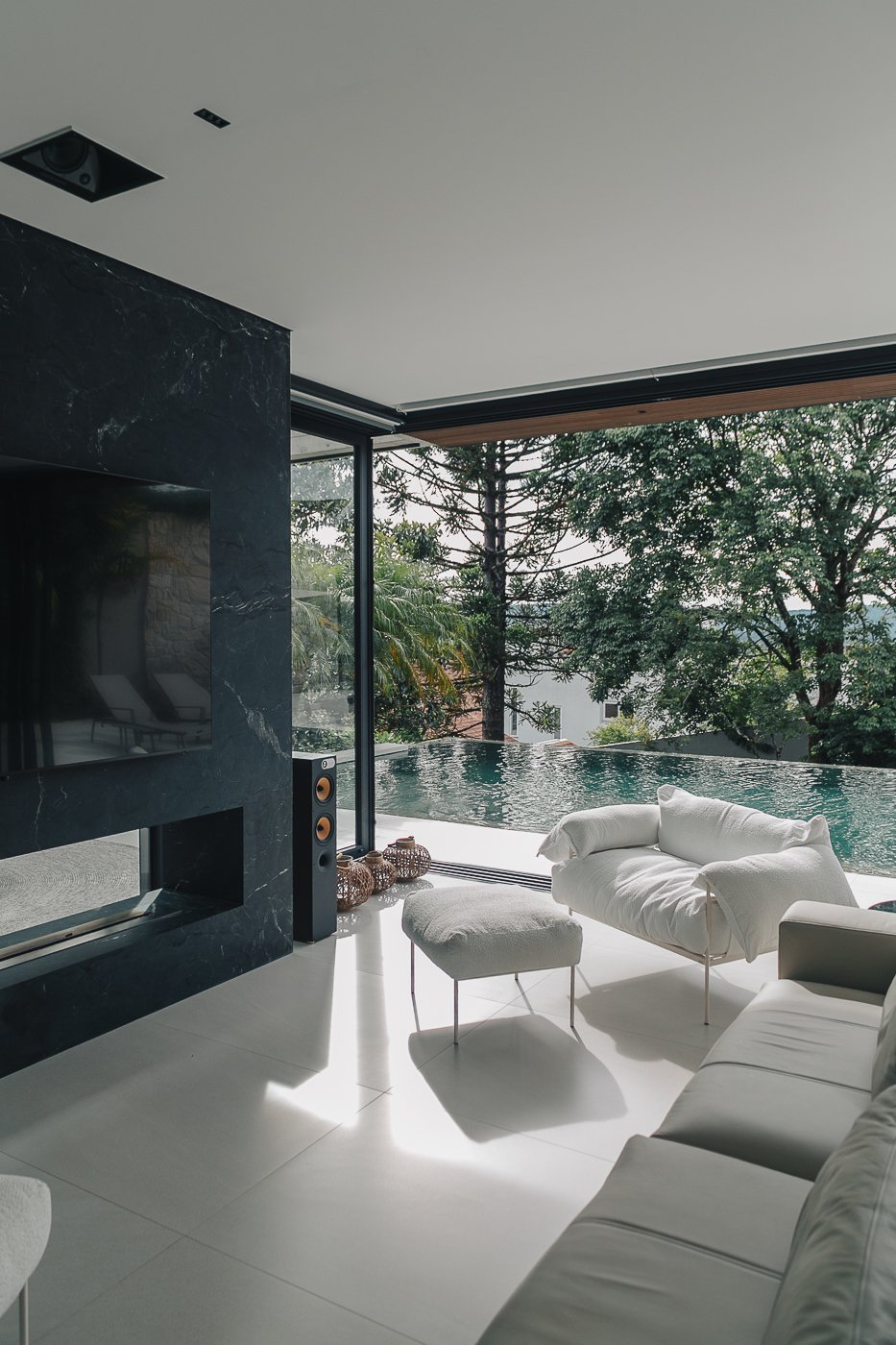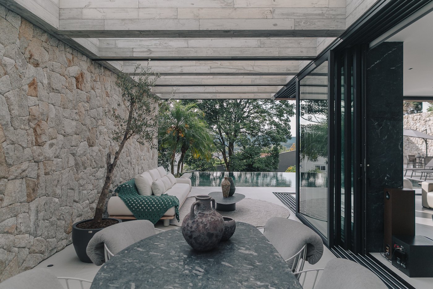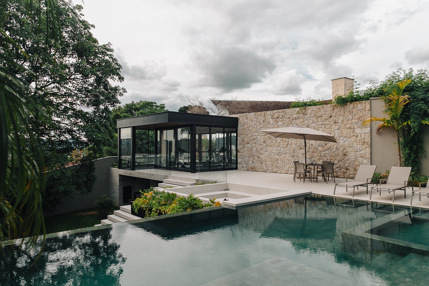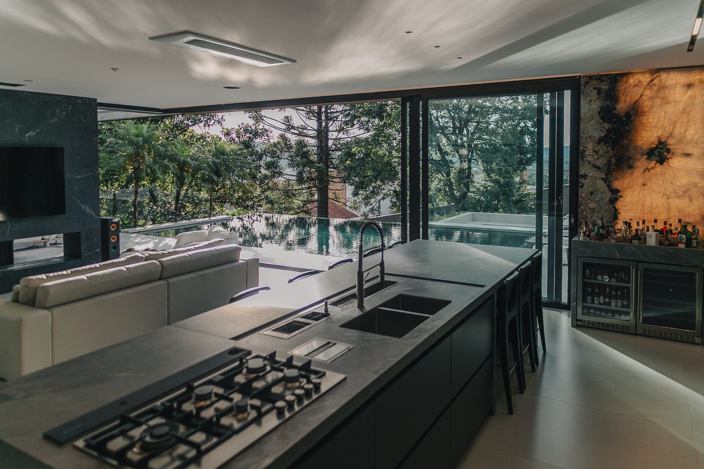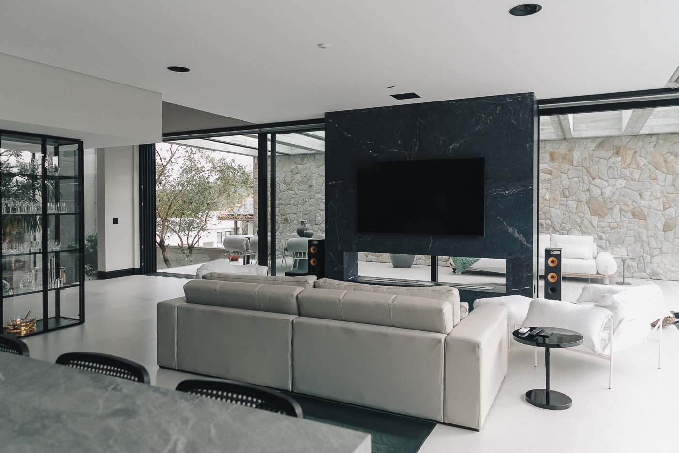 Neste ambiente integrado, a arquitetura atua como elo entre interior e exterior. Grandes planos de vidro, esquadrias deslizantes e materiais contínuos permitem que a área social se estenda naturalmente até a piscina e o jardim, criando uma experiência espacial fluida e sensorial. A pedra natural, o concreto aparente e a paleta neutra reforçam a sensação de permanência e conforto, enquanto a vegetação e a água trazem frescor e movimento ao conjunto. Mais do que abrir a casa para fora, o projeto convida a paisagem a fazer parte do cotidiano, valorizando luz natural, ventilação cruzada e a convivência entre arquitetura e natureza. Integração que se sente, se vive e se contempla.
