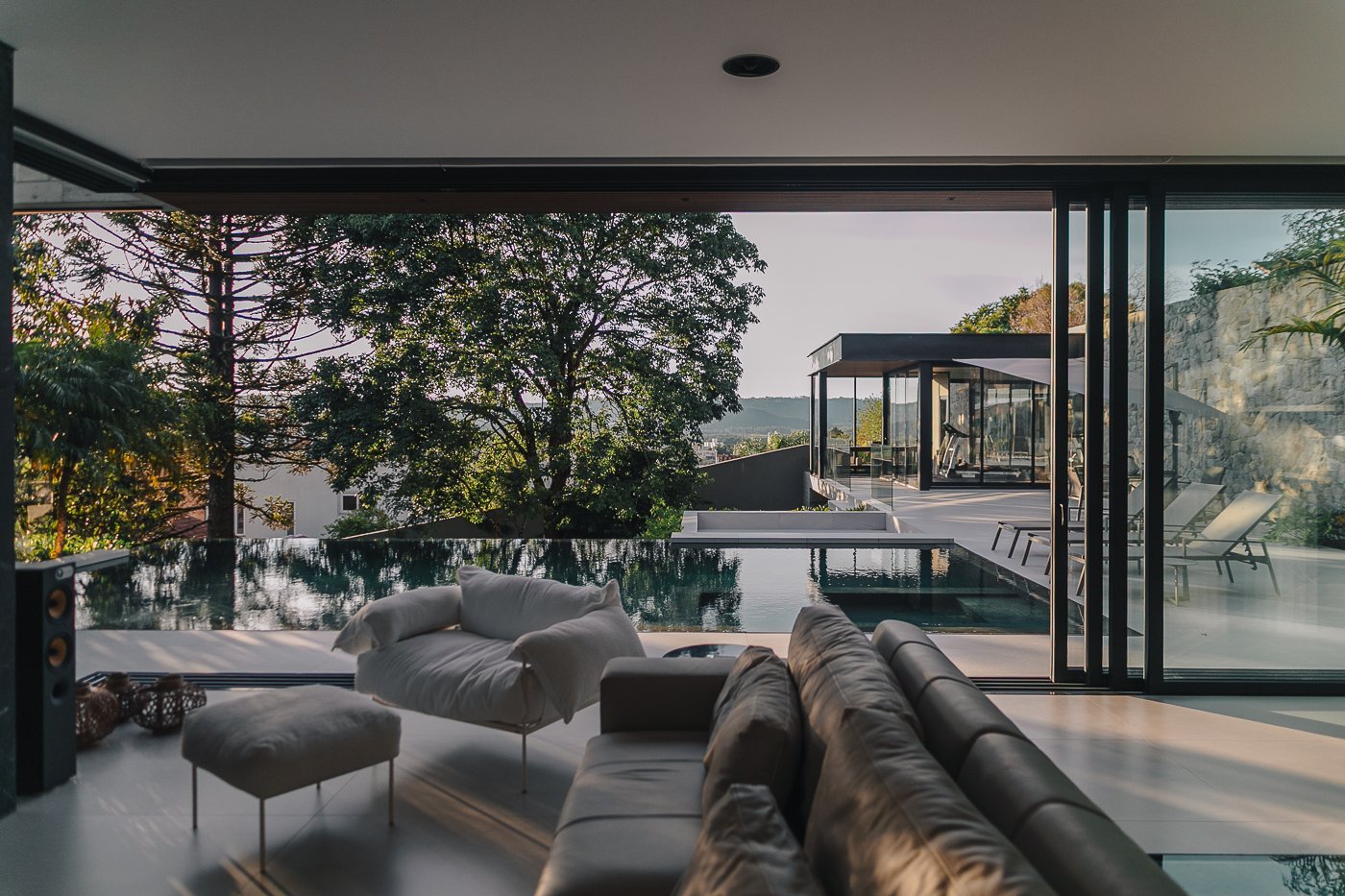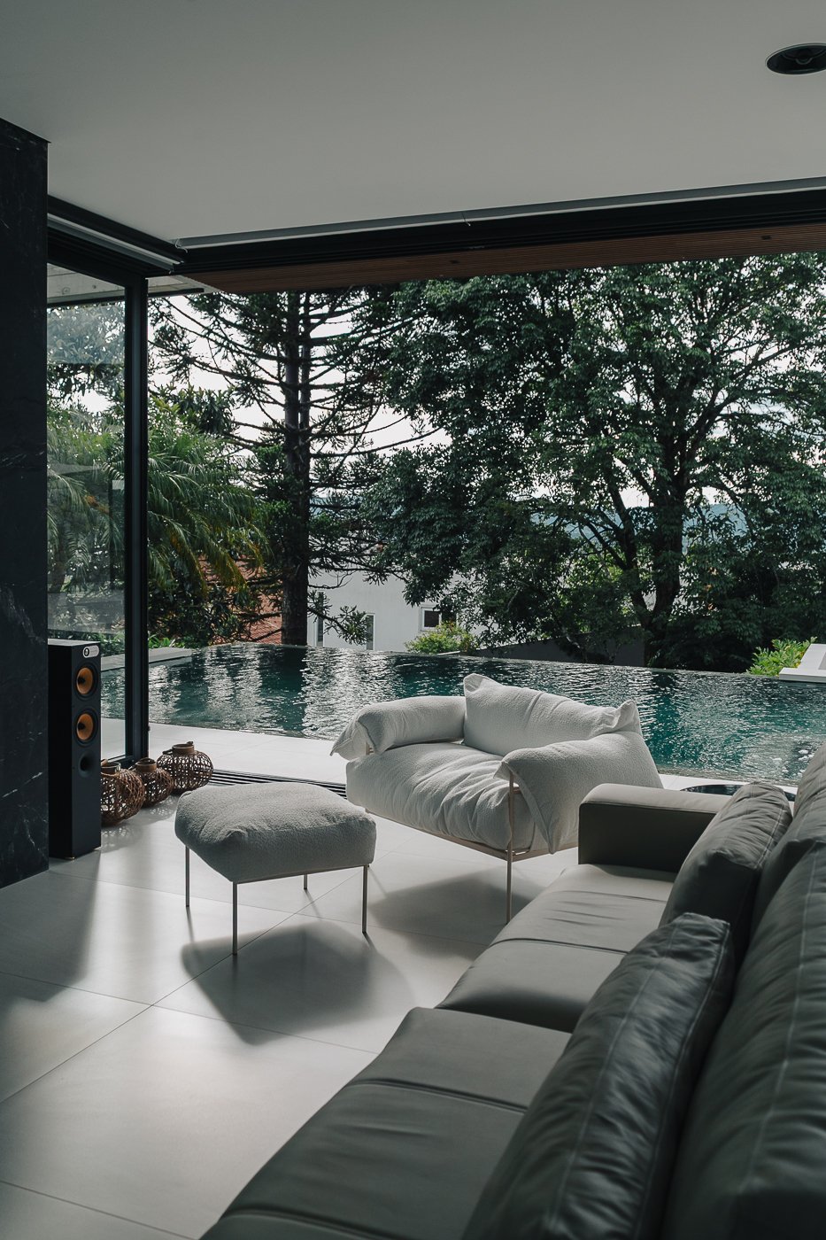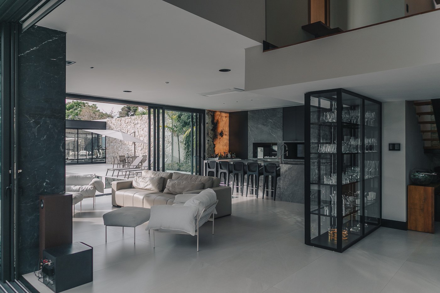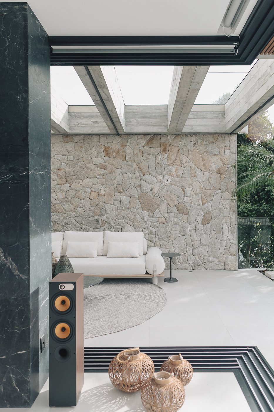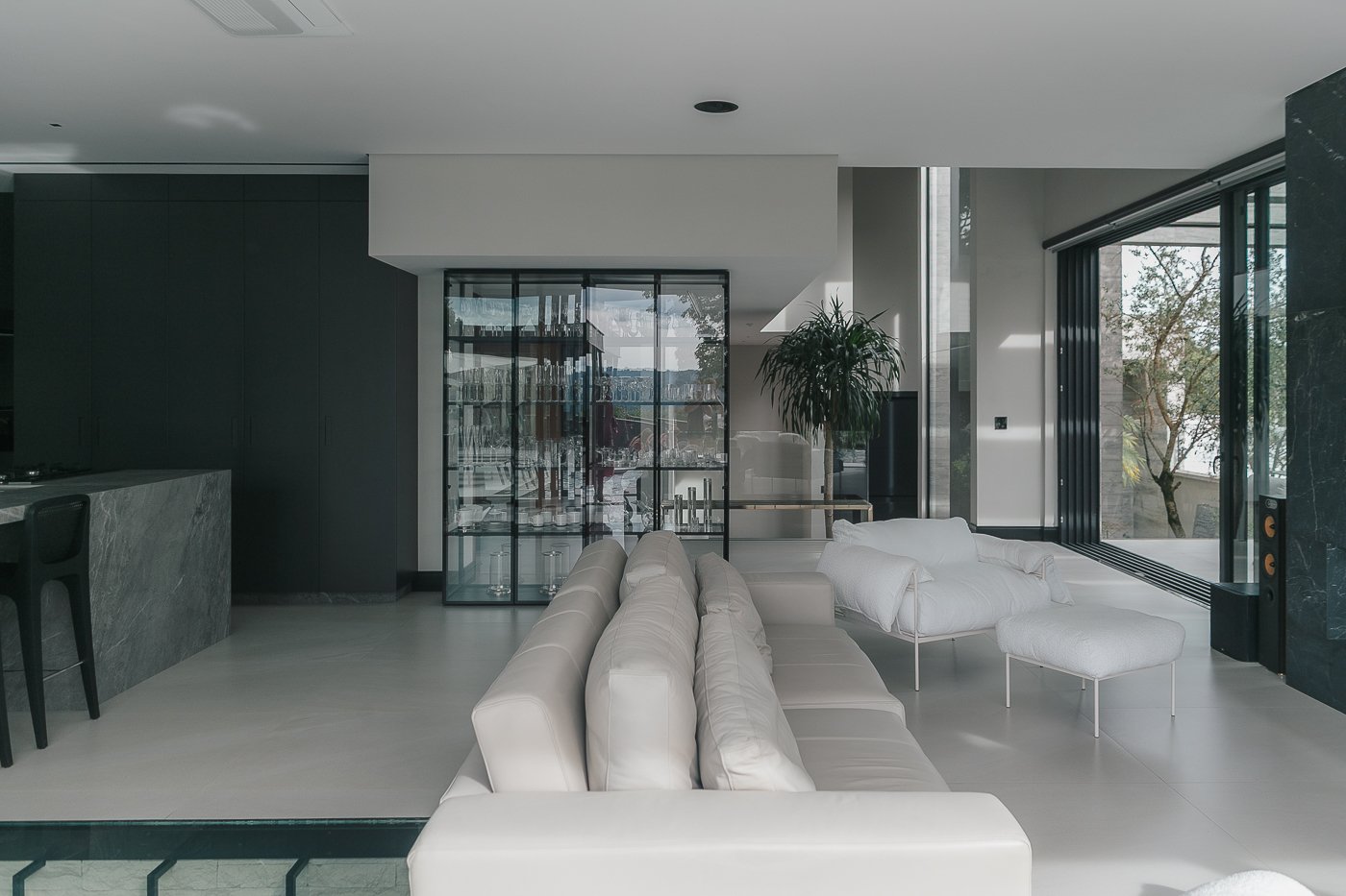 Neste ambiente integrado, a arquitetura atua como elo entre interior e exterior. Grandes planos de vidro, esquadrias deslizantes e materiais contínuos permitem que a área social se estenda naturalmente até a piscina e o jardim, criando uma experiência espacial fluida e sensorial. A pedra natural, o concreto aparente e a paleta neutra reforçam a sensação de permanência e conforto, enquanto a vegetação e a água trazem frescor e movimento ao conjunto. Mais do que abrir a casa para fora, o projeto convida a paisagem a fazer parte do cotidiano, valorizando luz natural, ventilação cruzada e a convivência entre arquitetura e natureza. Integração que se sente, se vive e se contempla.