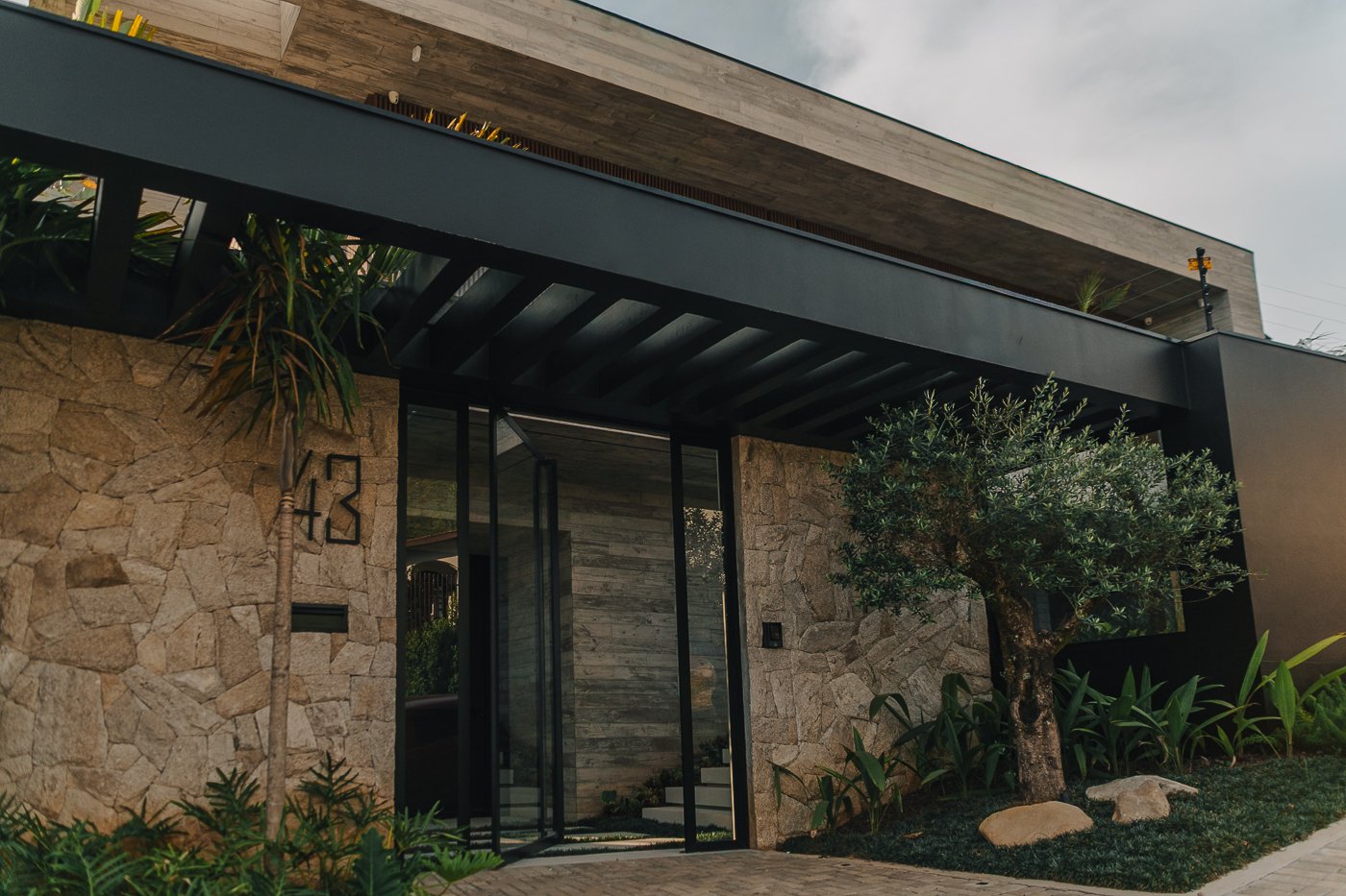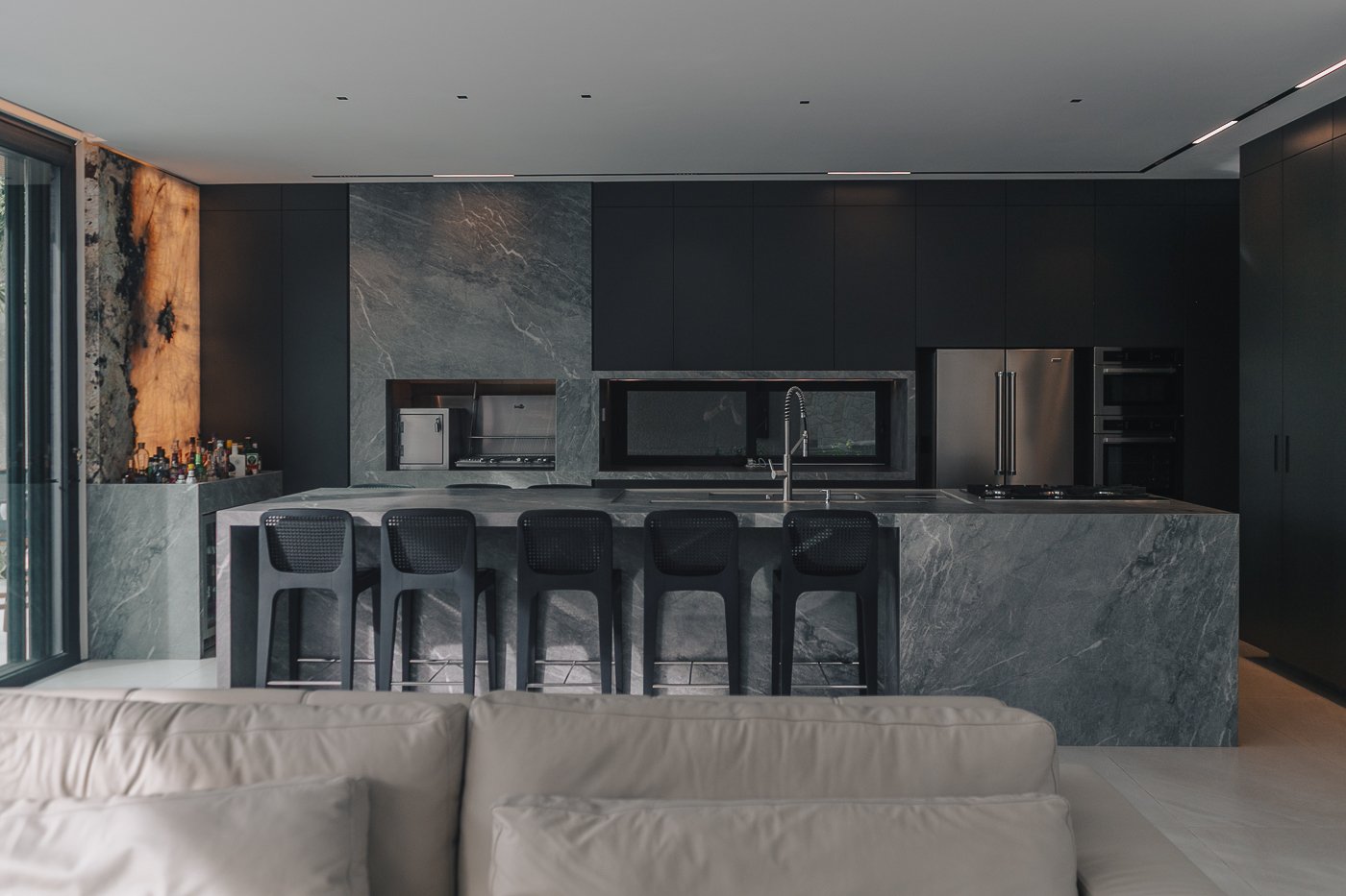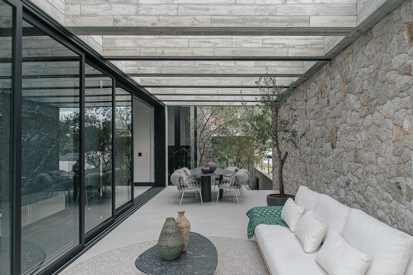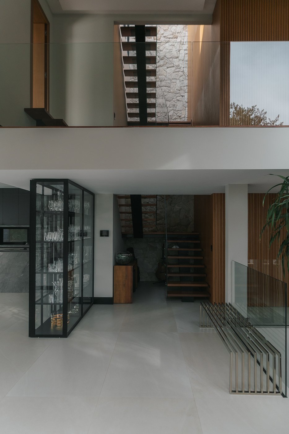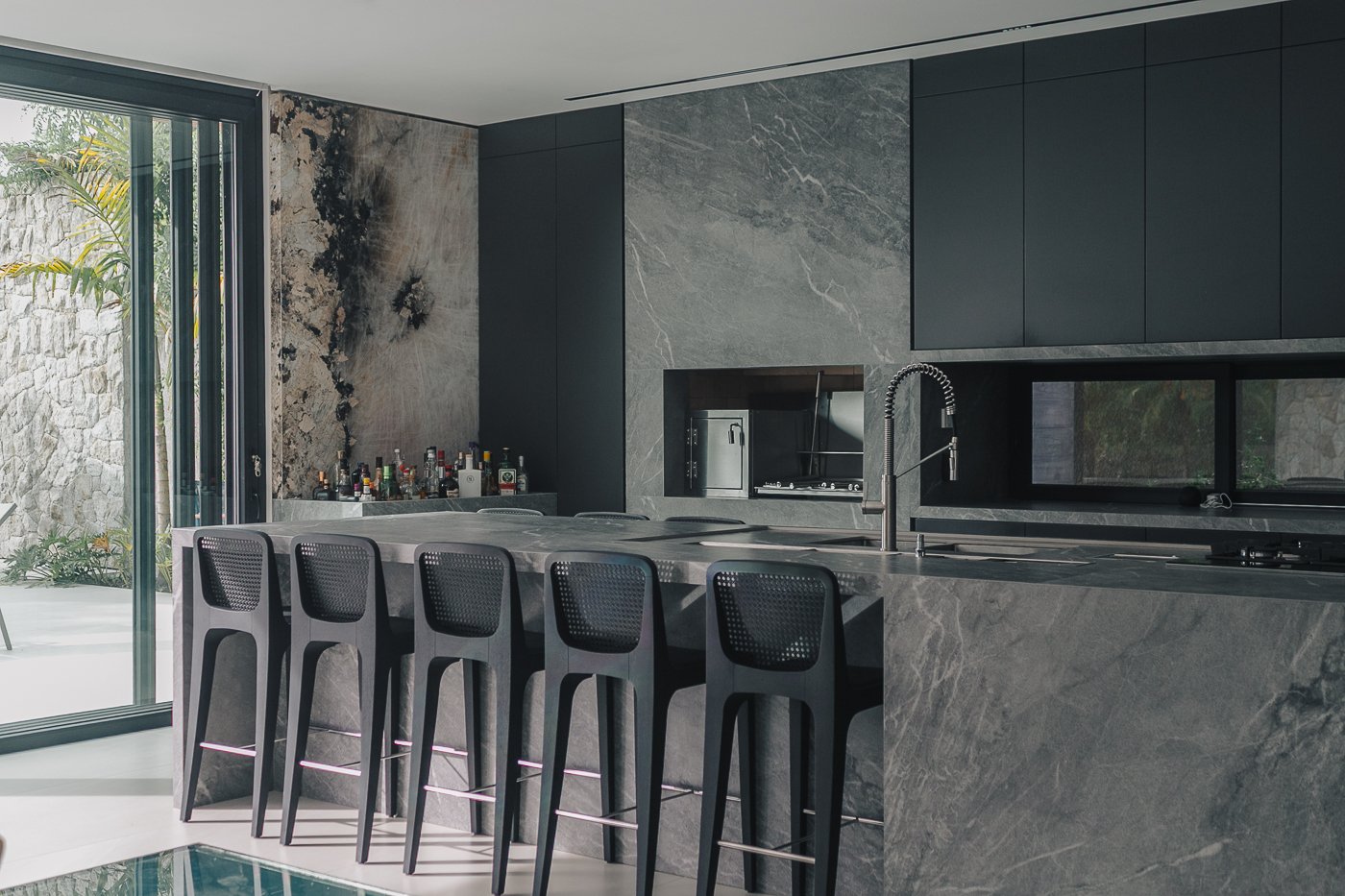 Neste ambiente integrado, a arquitetura atua como elo entre interior e exterior. Grandes planos de vidro, esquadrias deslizantes e materiais contínuos permitem que a área social se estenda naturalmente até a piscina e o jardim, criando uma experiência espacial fluida e sensorial. A pedra natural, o concreto aparente e a paleta neutra reforçam a sensação de permanência e conforto, enquanto a vegetação e a água trazem frescor e movimento ao conjunto. Mais do que abrir a casa para fora, o projeto convida a paisagem a fazer parte do cotidiano, valorizando luz natural, ventilação cruzada e a convivência entre arquitetura e natureza. Integração que se sente, se vive e se contempla.