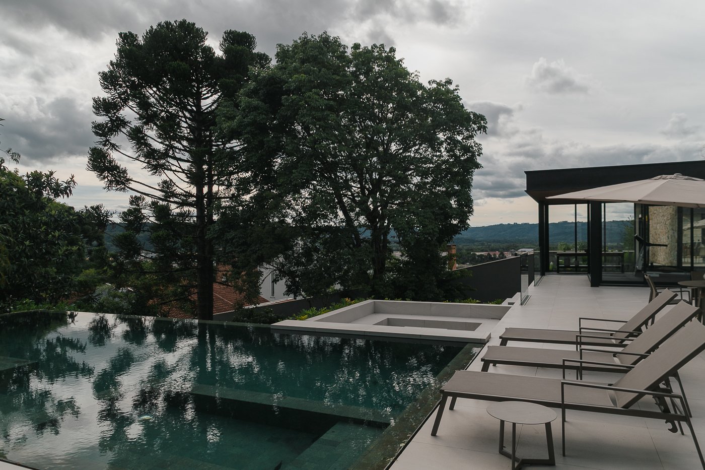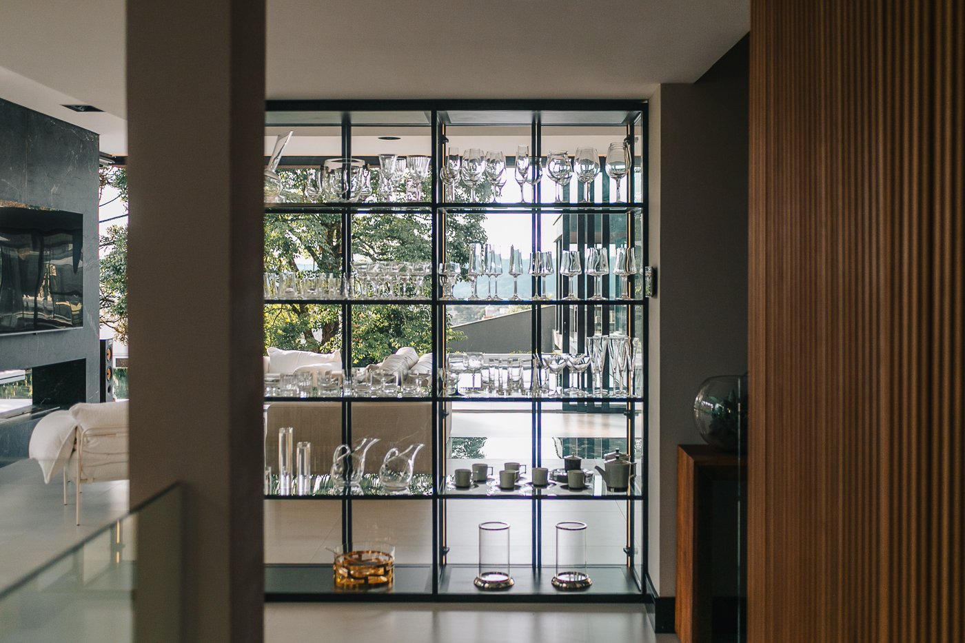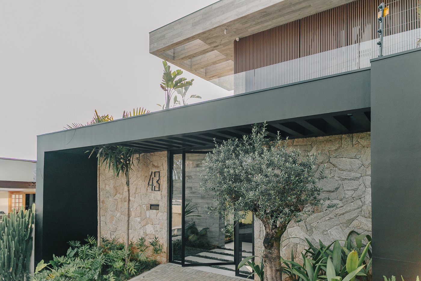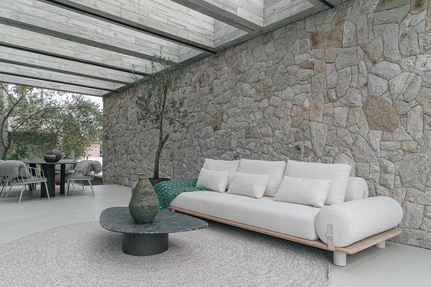 Neste ambiente integrado, a arquitetura atua como elo entre interior e exterior. Grandes planos de vidro, esquadrias deslizantes e materiais contínuos permitem que a área social se estenda naturalmente até a piscina e o jardim, criando uma experiência espacial fluida e sensorial. A pedra natural, o concreto aparente e a paleta neutra reforçam a sensação de permanência e conforto, enquanto a vegetação e a água trazem frescor e movimento ao conjunto. Mais do que abrir a casa para fora, o projeto convida a paisagem a fazer parte do cotidiano, valorizando luz natural, ventilação cruzada e a convivência entre arquitetura e natureza. Integração que se sente, se vive e se contempla.