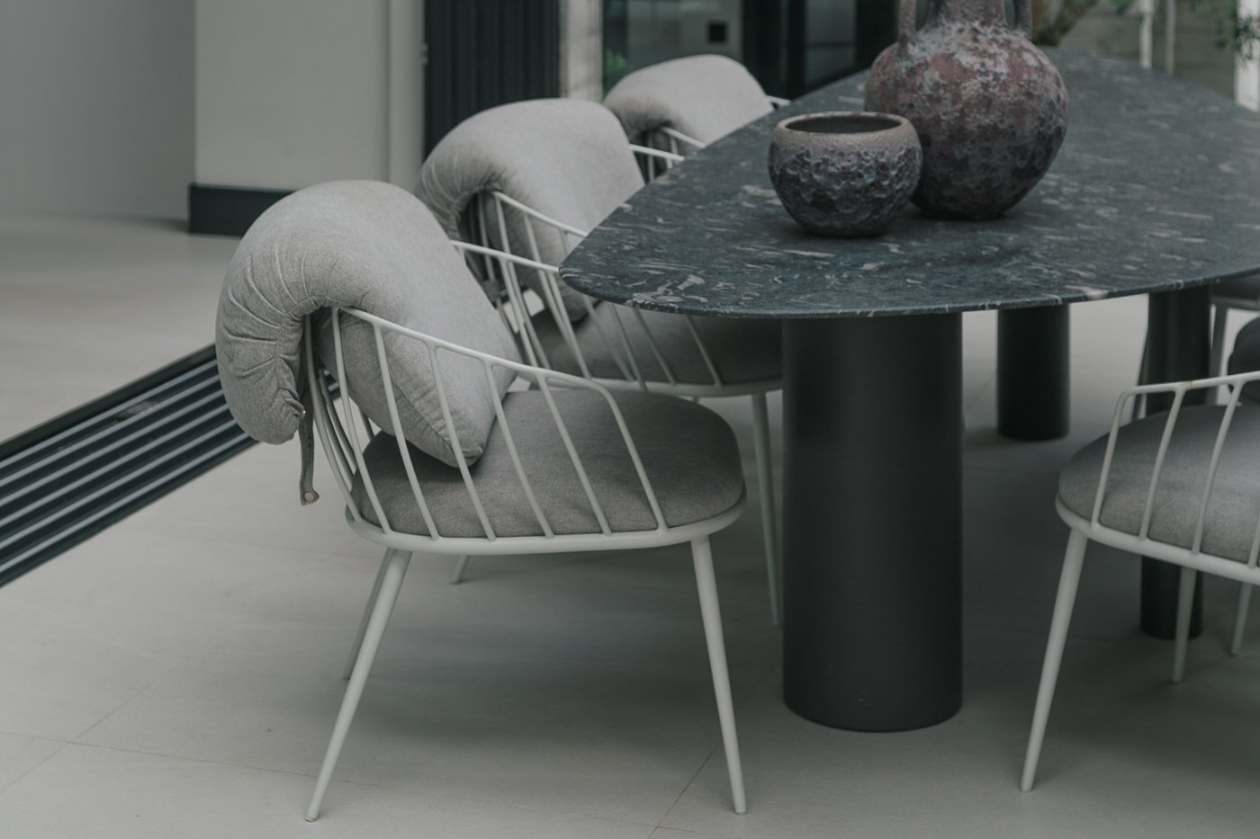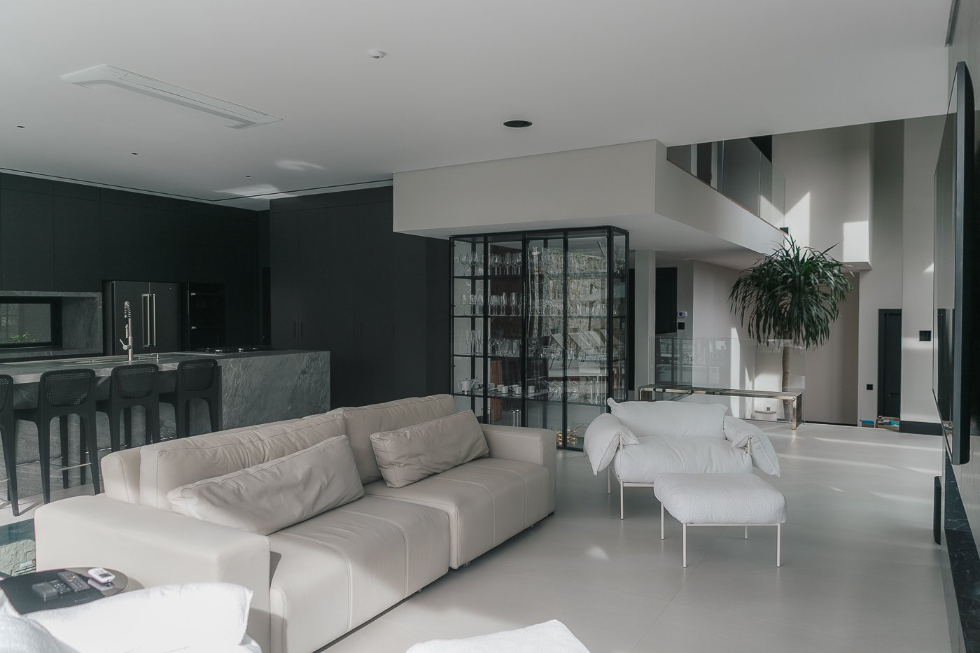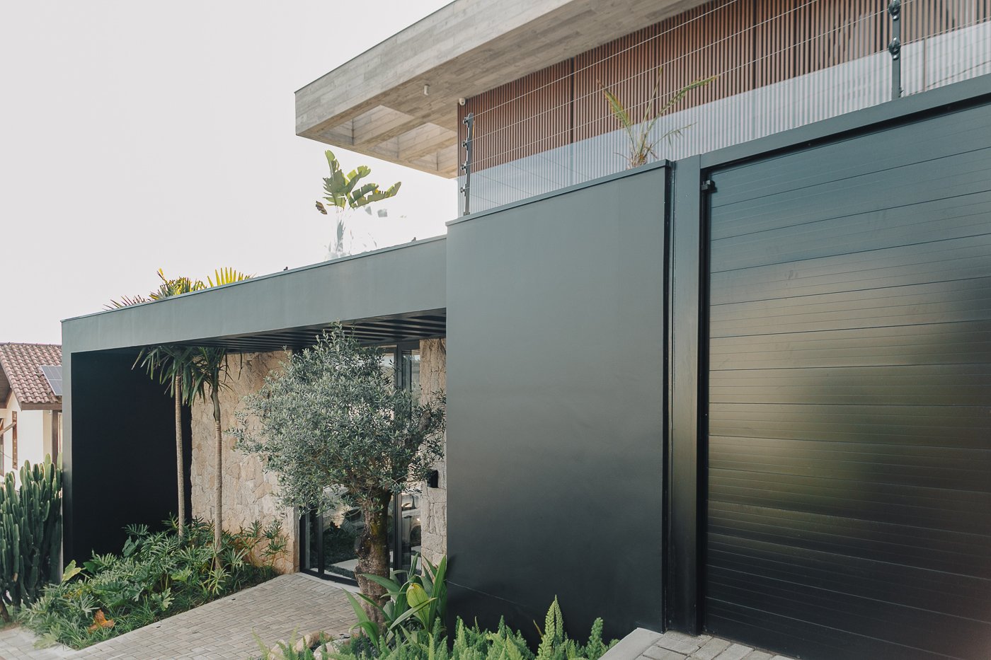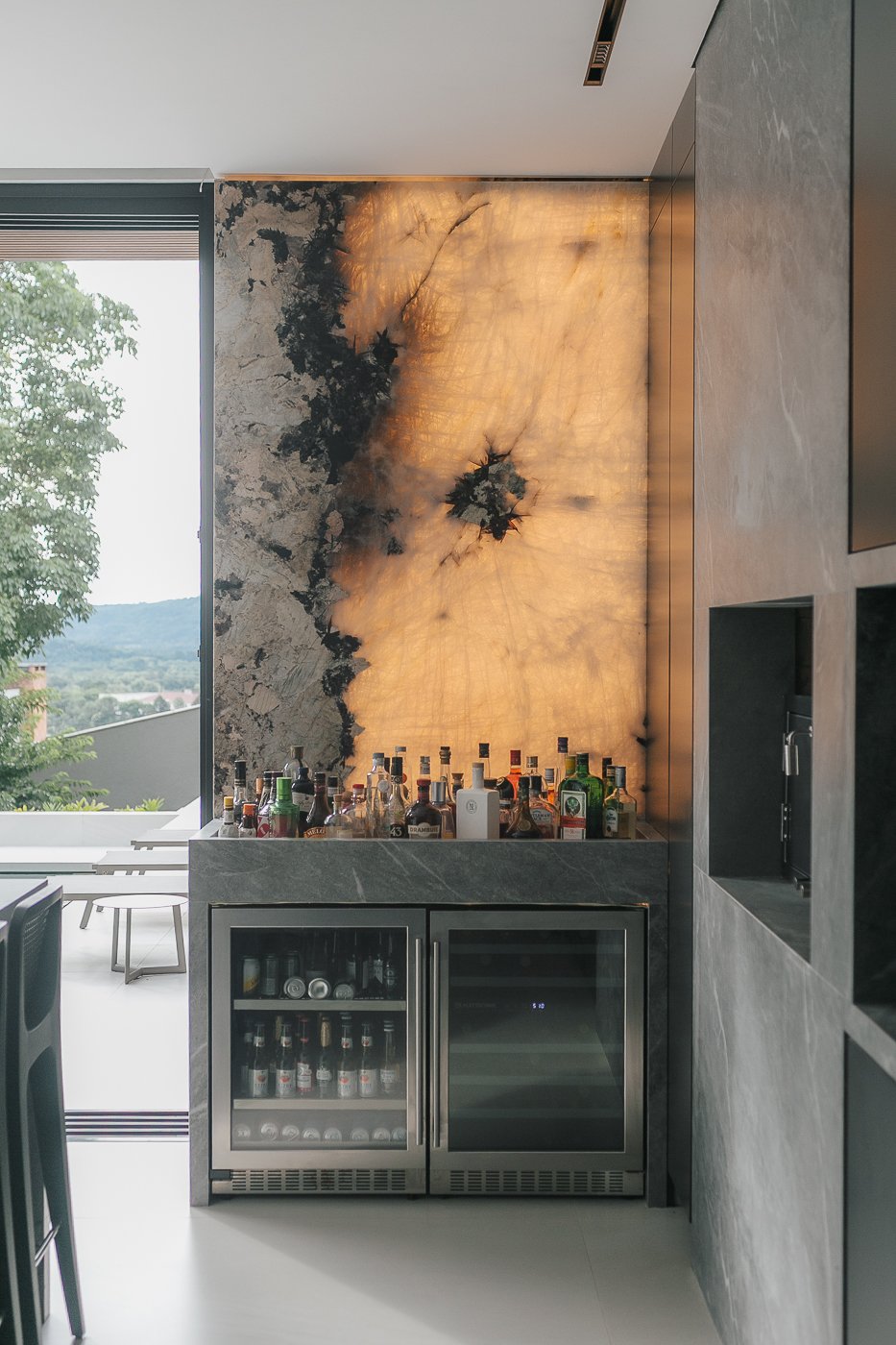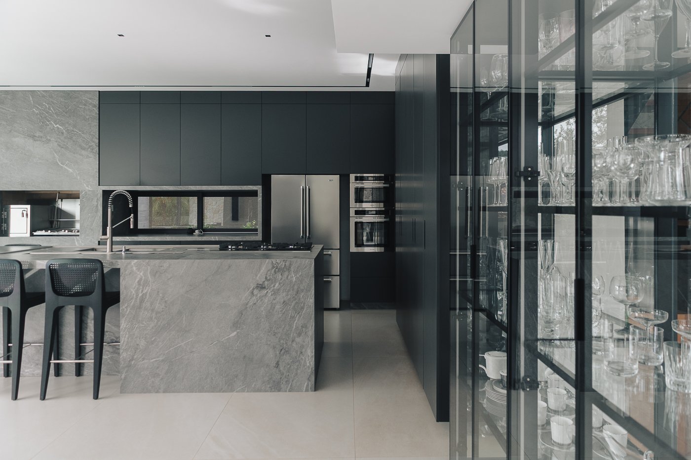 Neste ambiente integrado, a arquitetura atua como elo entre interior e exterior. Grandes planos de vidro, esquadrias deslizantes e materiais contínuos permitem que a área social se estenda naturalmente até a piscina e o jardim, criando uma experiência espacial fluida e sensorial. A pedra natural, o concreto aparente e a paleta neutra reforçam a sensação de permanência e conforto, enquanto a vegetação e a água trazem frescor e movimento ao conjunto. Mais do que abrir a casa para fora, o projeto convida a paisagem a fazer parte do cotidiano, valorizando luz natural, ventilação cruzada e a convivência entre arquitetura e natureza. Integração que se sente, se vive e se contempla.