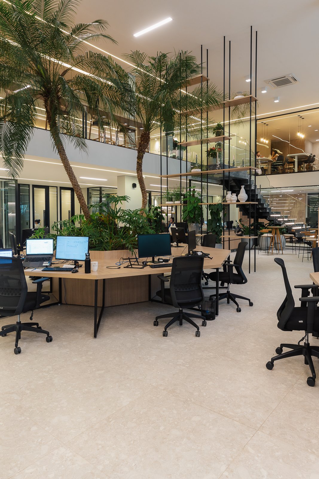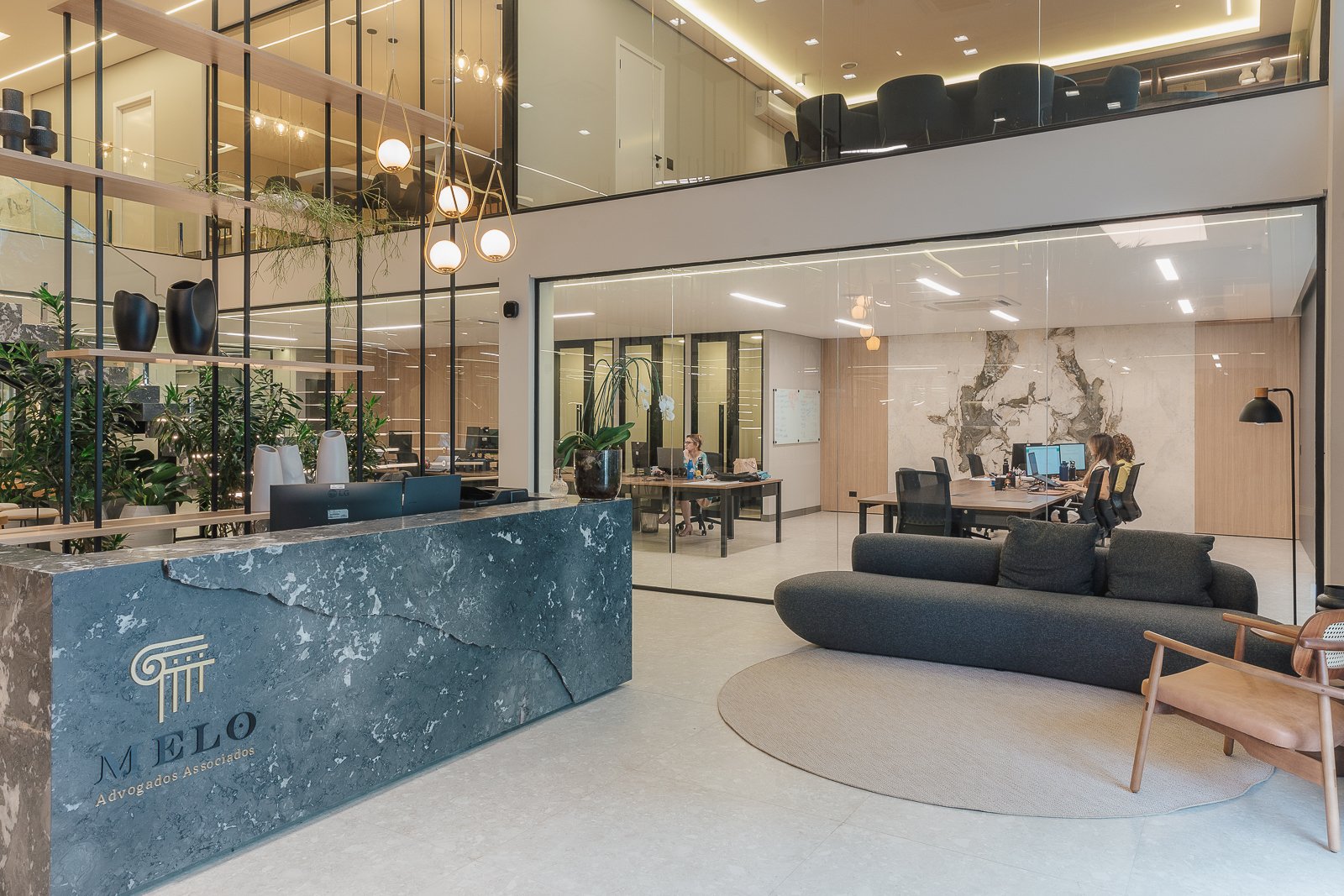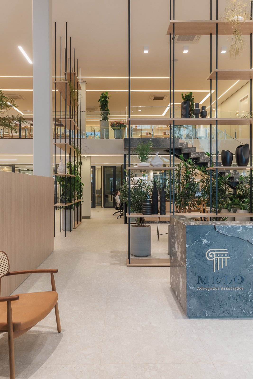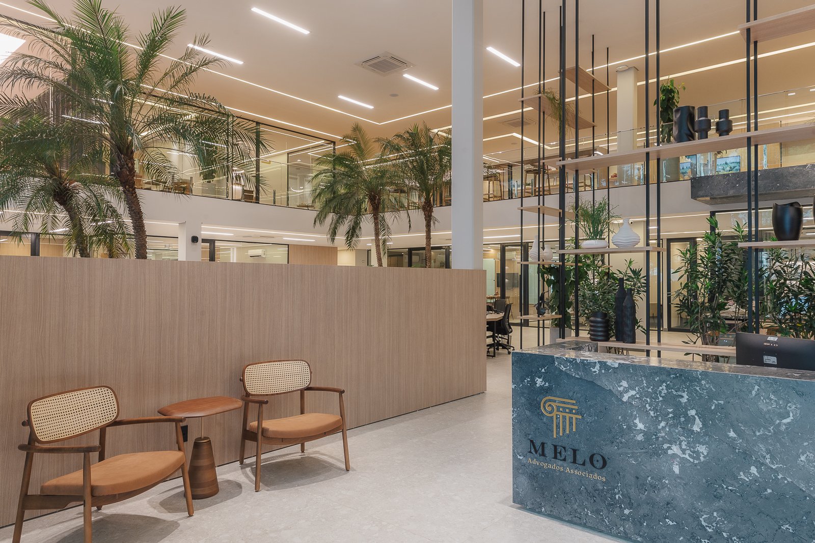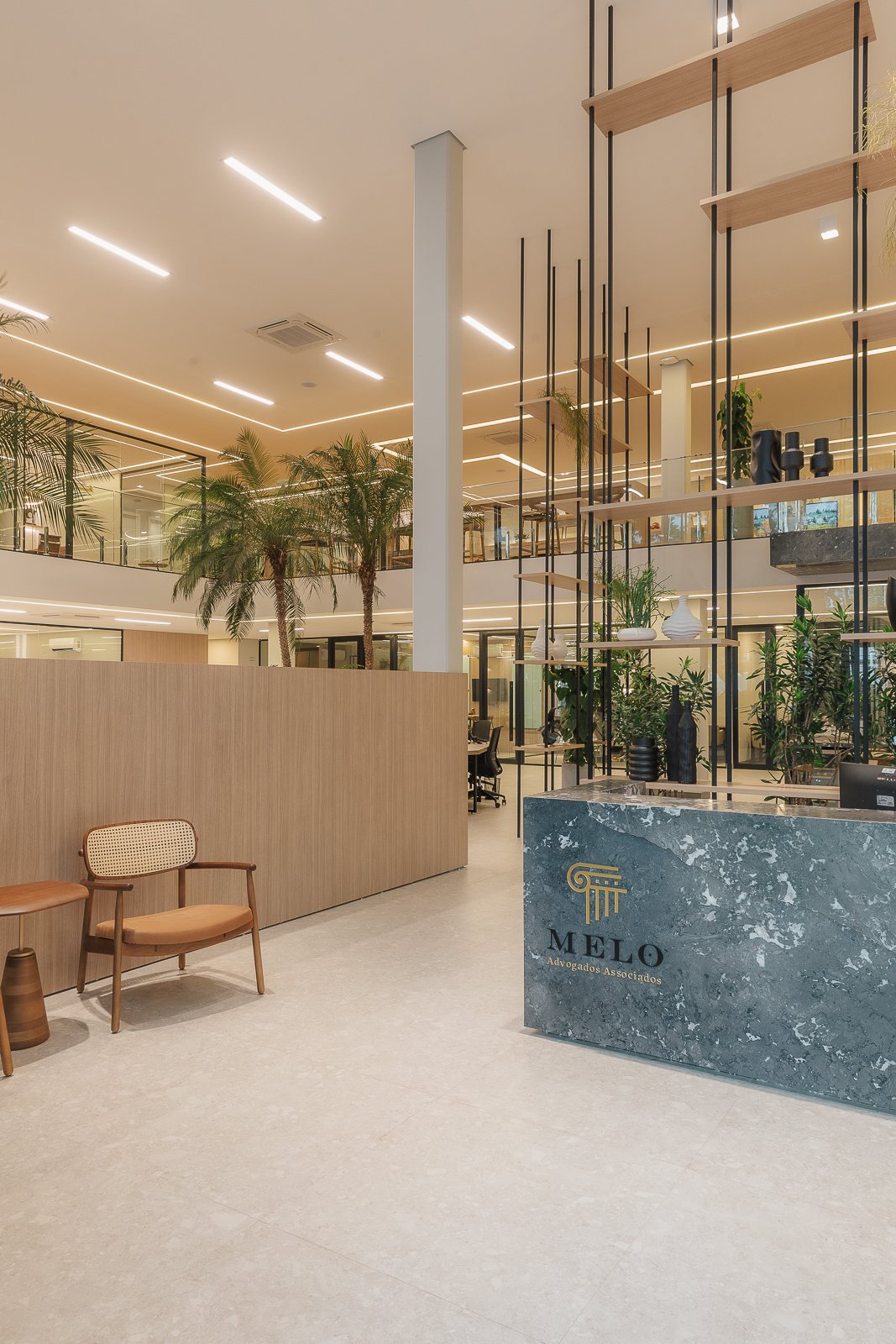 O projeto da nova sede do @meloadvogados.associados combina design biofílico e funcionalidade corporativa, refletindo inovação, confiança e bem-estar. A integração com a natureza, através de plantas como palmeiras e áreas envidraçadas que maximizam a luz natural, cria um ambiente agradável e reduz o estresse. O layout colaborativo, com mesas de formato orgânico e mobiliário que equilibra funcionalidade e estética, promove interação e harmonia entre os colaboradores em torno dos elementos verdes.
