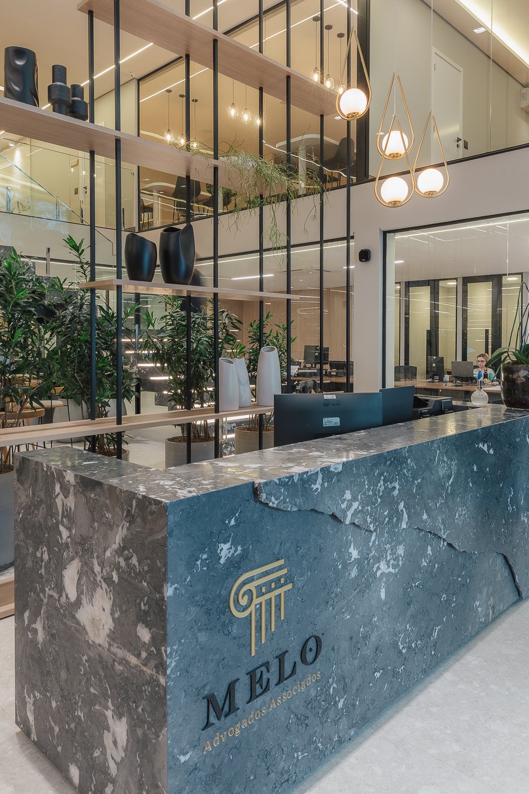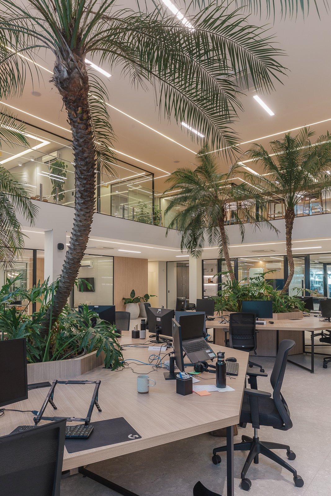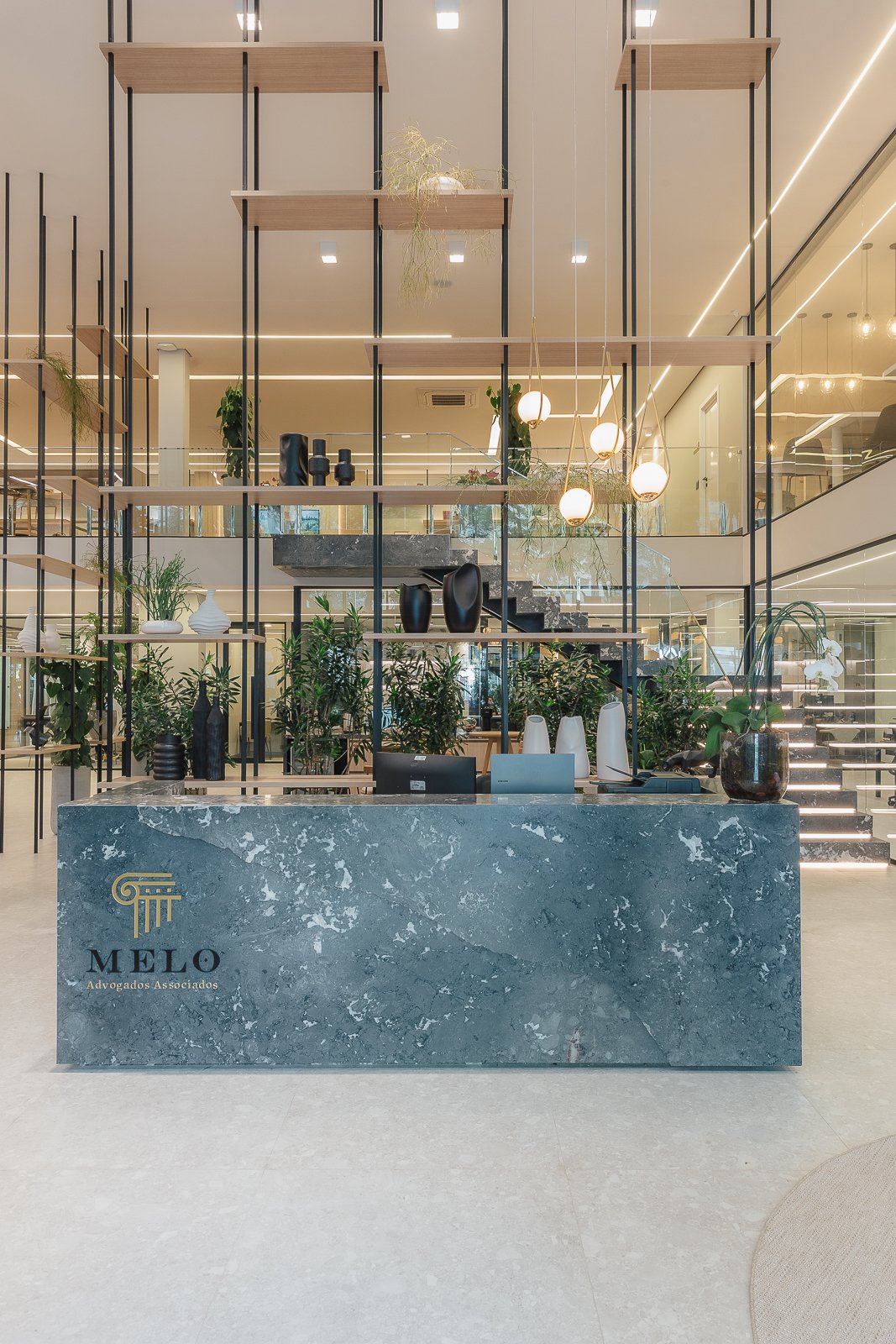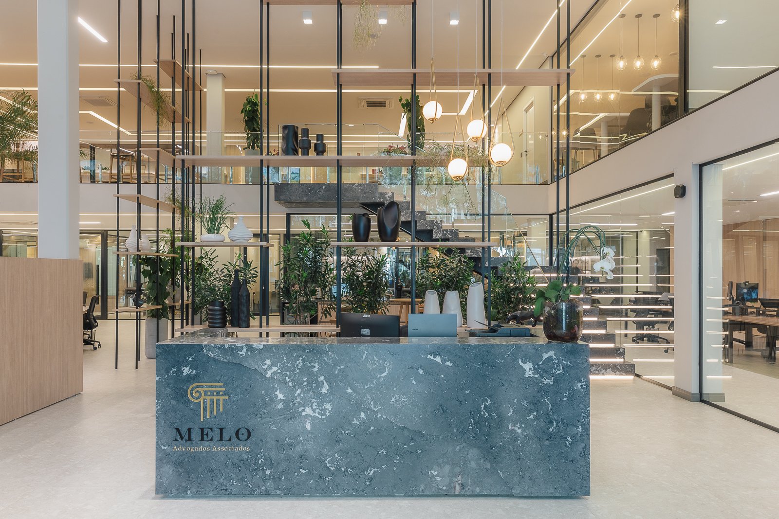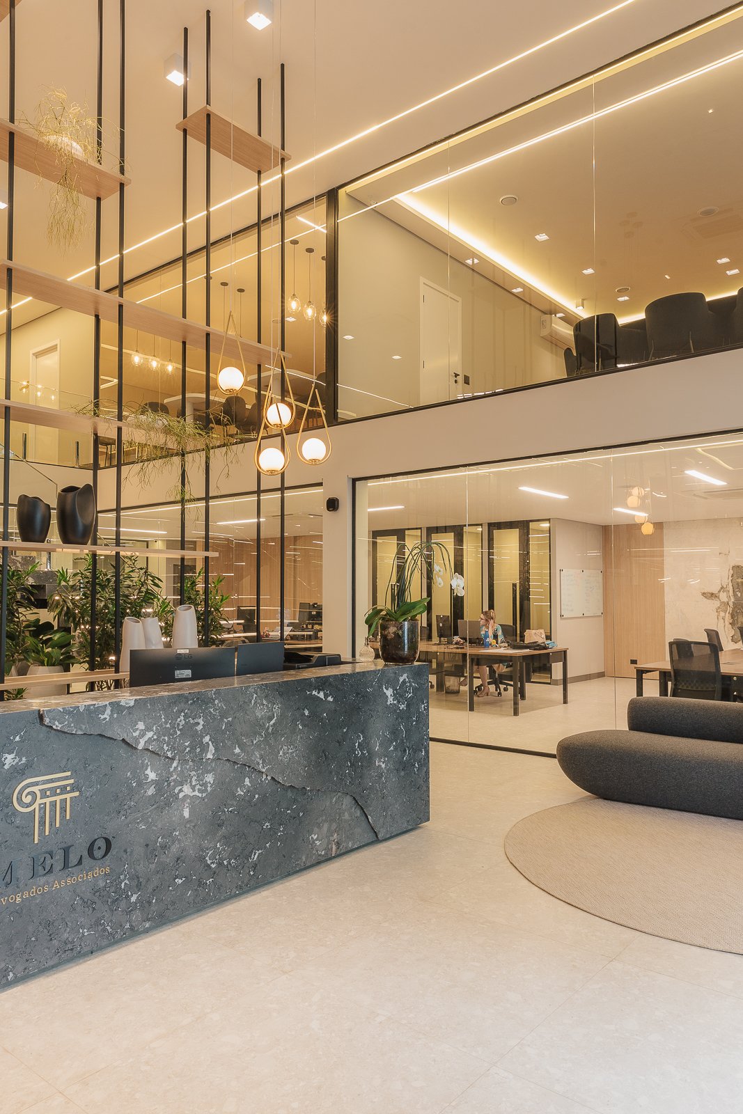 O projeto da nova sede do @meloadvogados.associados combina design biofílico e funcionalidade corporativa, refletindo inovação, confiança e bem-estar. A integração com a natureza, através de plantas como palmeiras e áreas envidraçadas que maximizam a luz natural, cria um ambiente agradável e reduz o estresse. O layout colaborativo, com mesas de formato orgânico e mobiliário que equilibra funcionalidade e estética, promove interação e harmonia entre os colaboradores em torno dos elementos verdes.