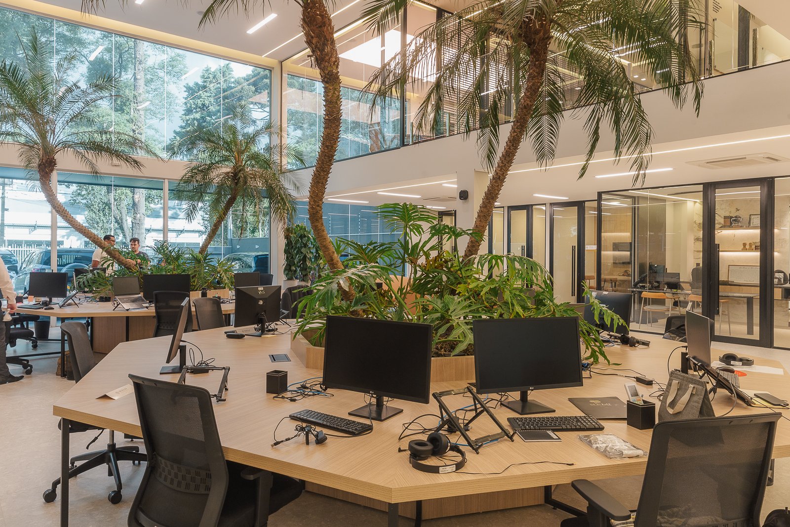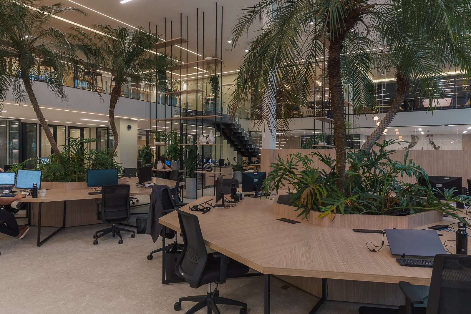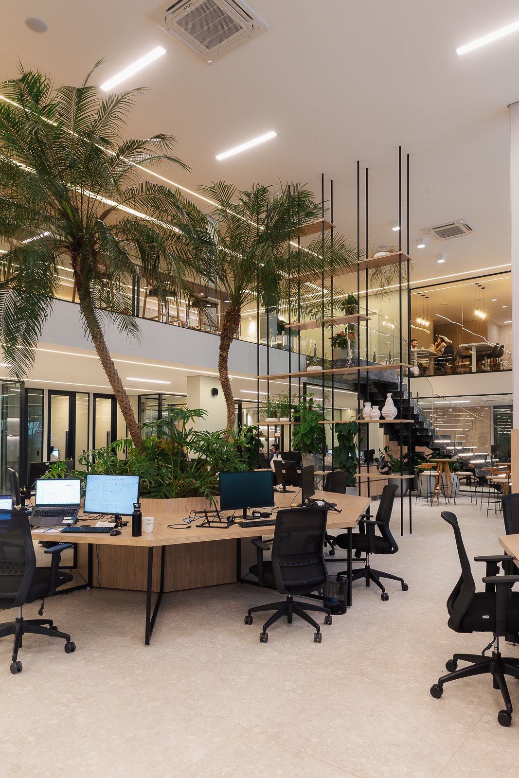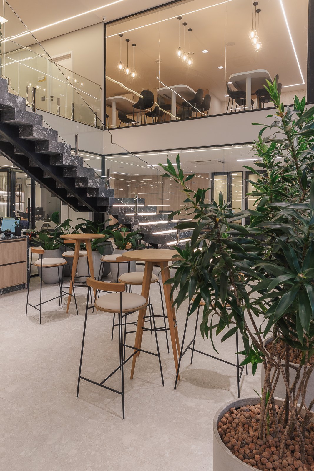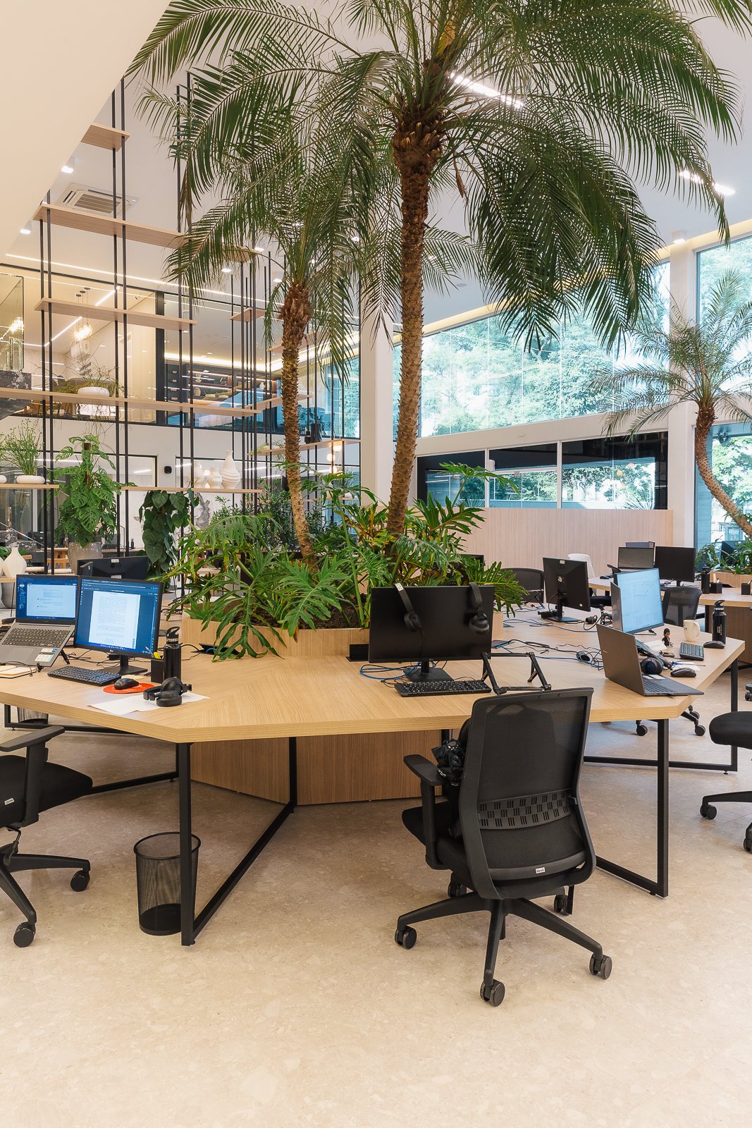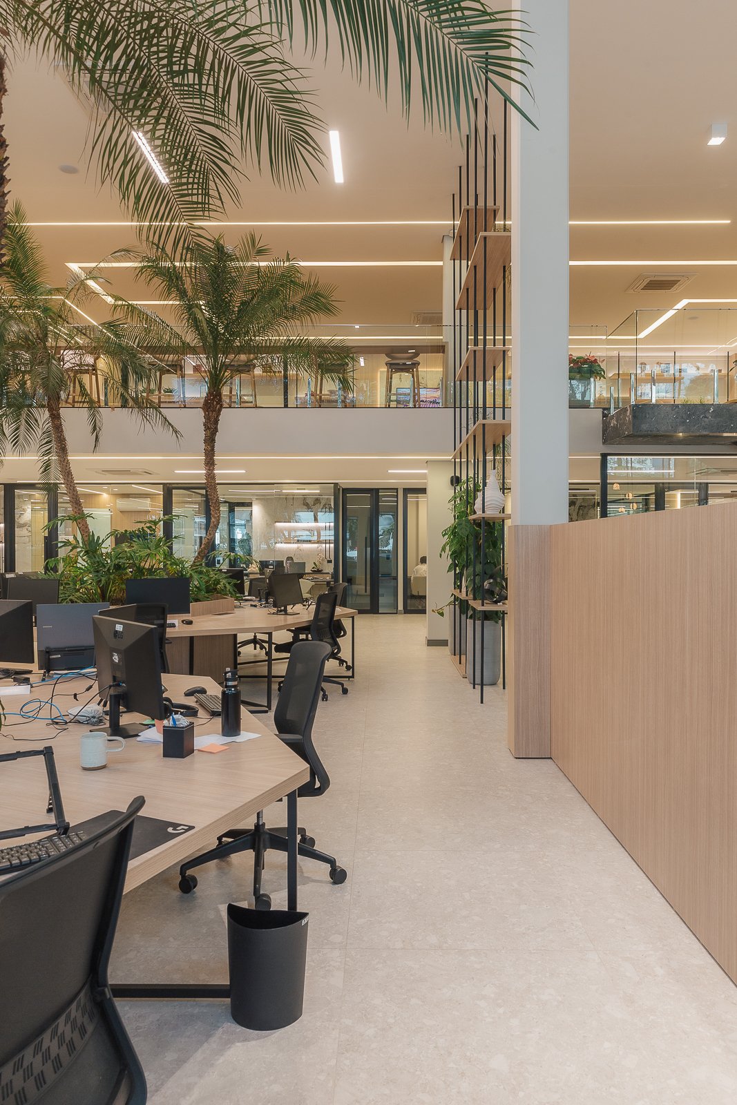 O projeto da nova sede do @meloadvogados.associados combina design biofílico e funcionalidade corporativa, refletindo inovação, confiança e bem-estar. A integração com a natureza, através de plantas como palmeiras e áreas envidraçadas que maximizam a luz natural, cria um ambiente agradável e reduz o estresse. O layout colaborativo, com mesas de formato orgânico e mobiliário que equilibra funcionalidade e estética, promove interação e harmonia entre os colaboradores em torno dos elementos verdes.