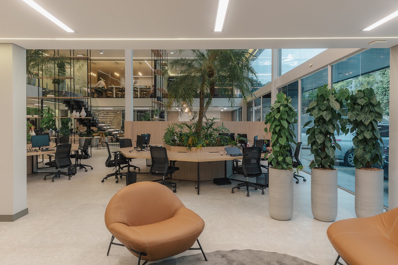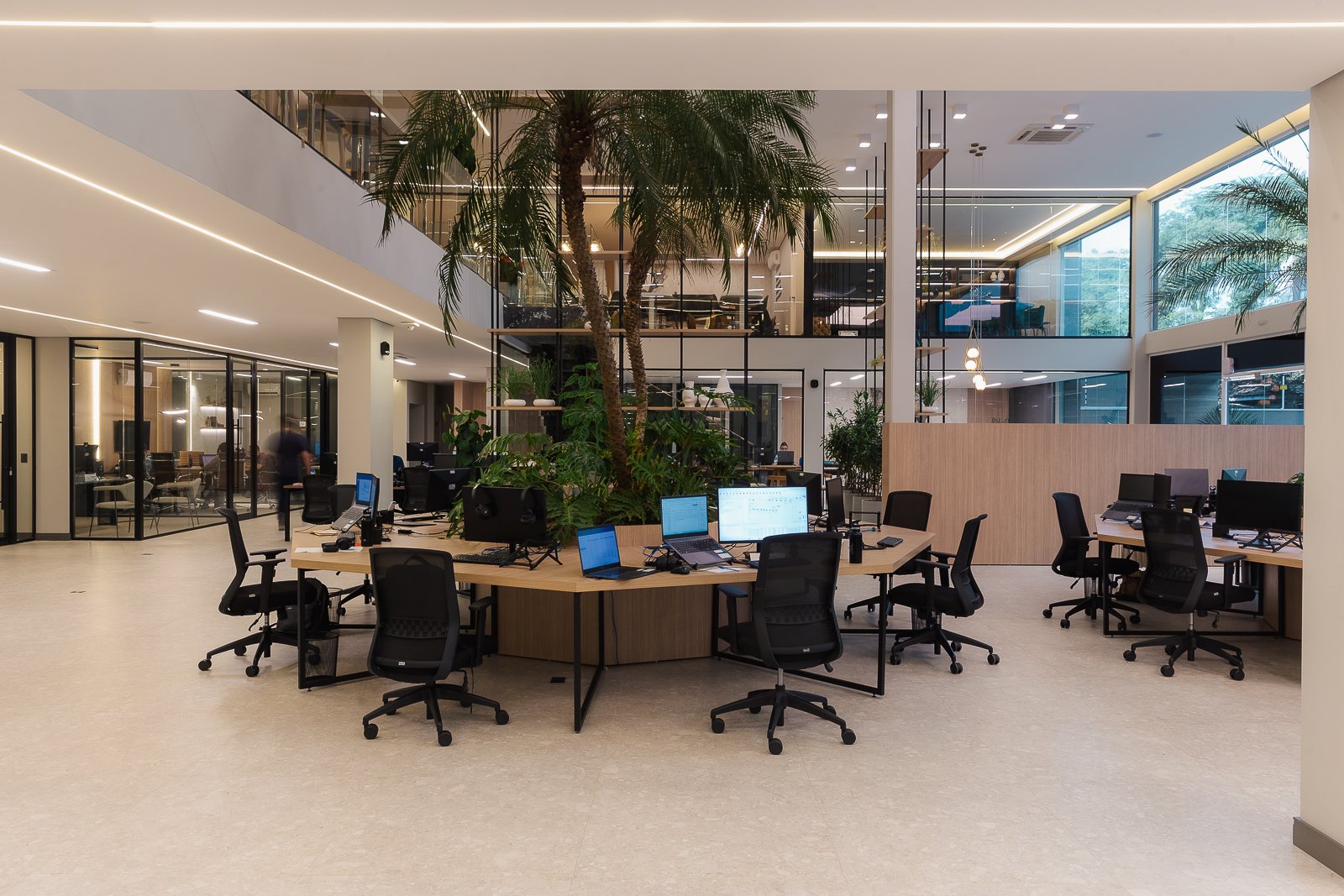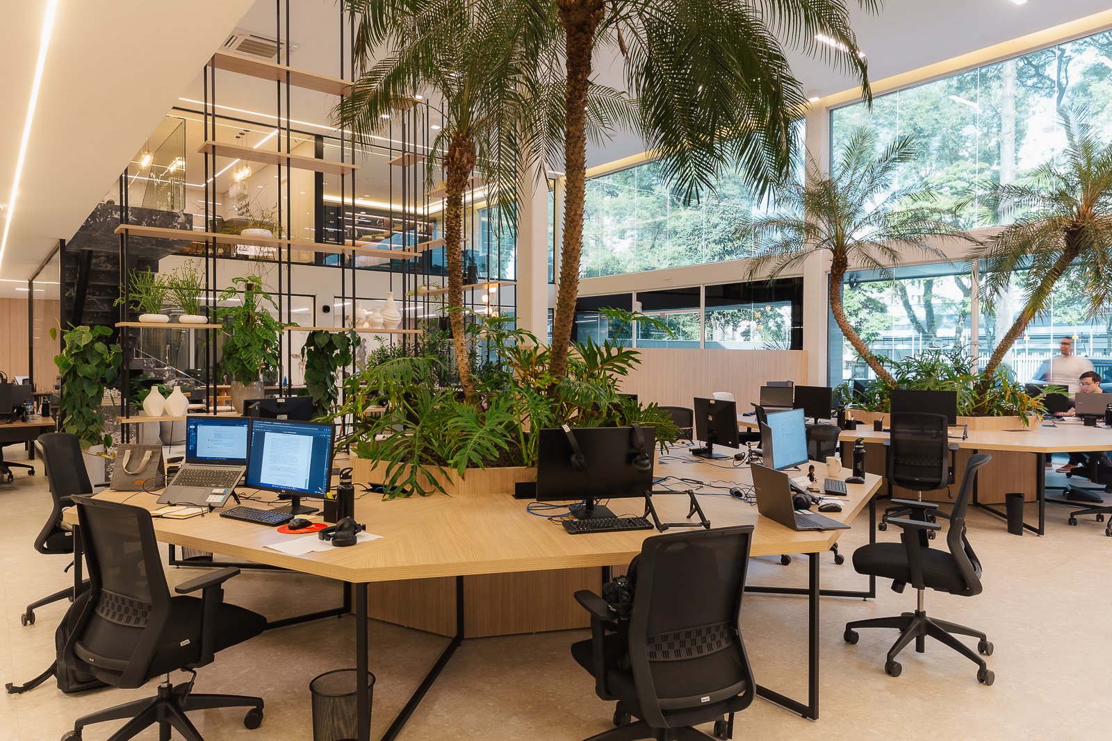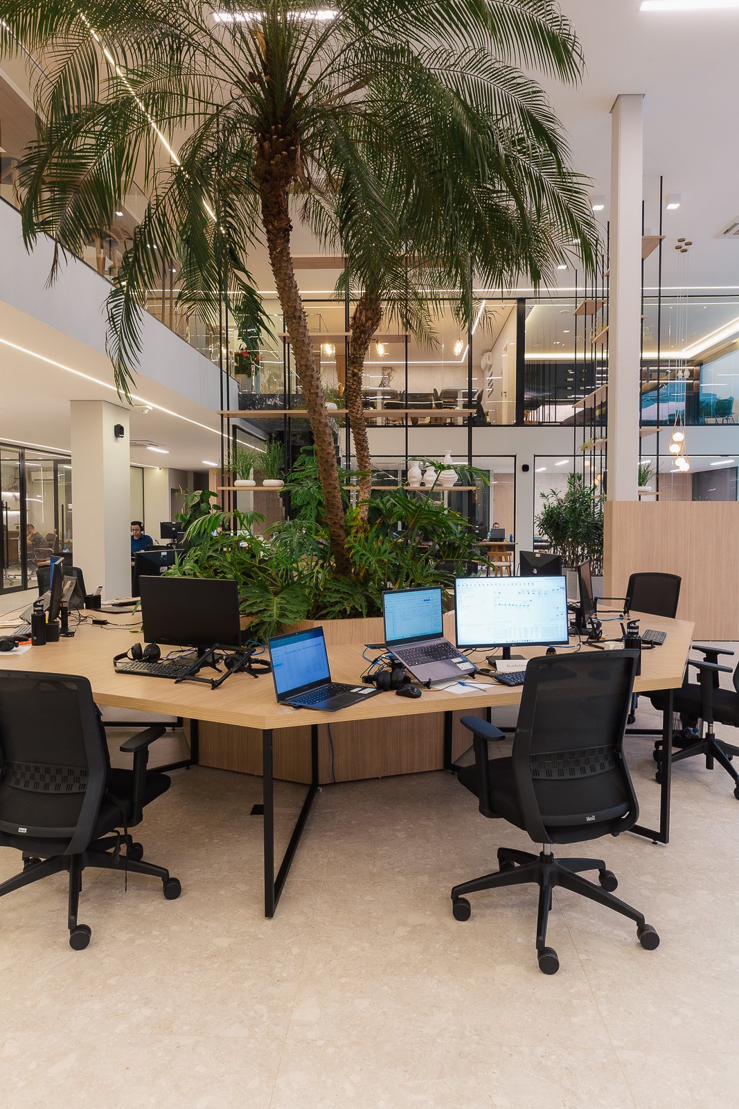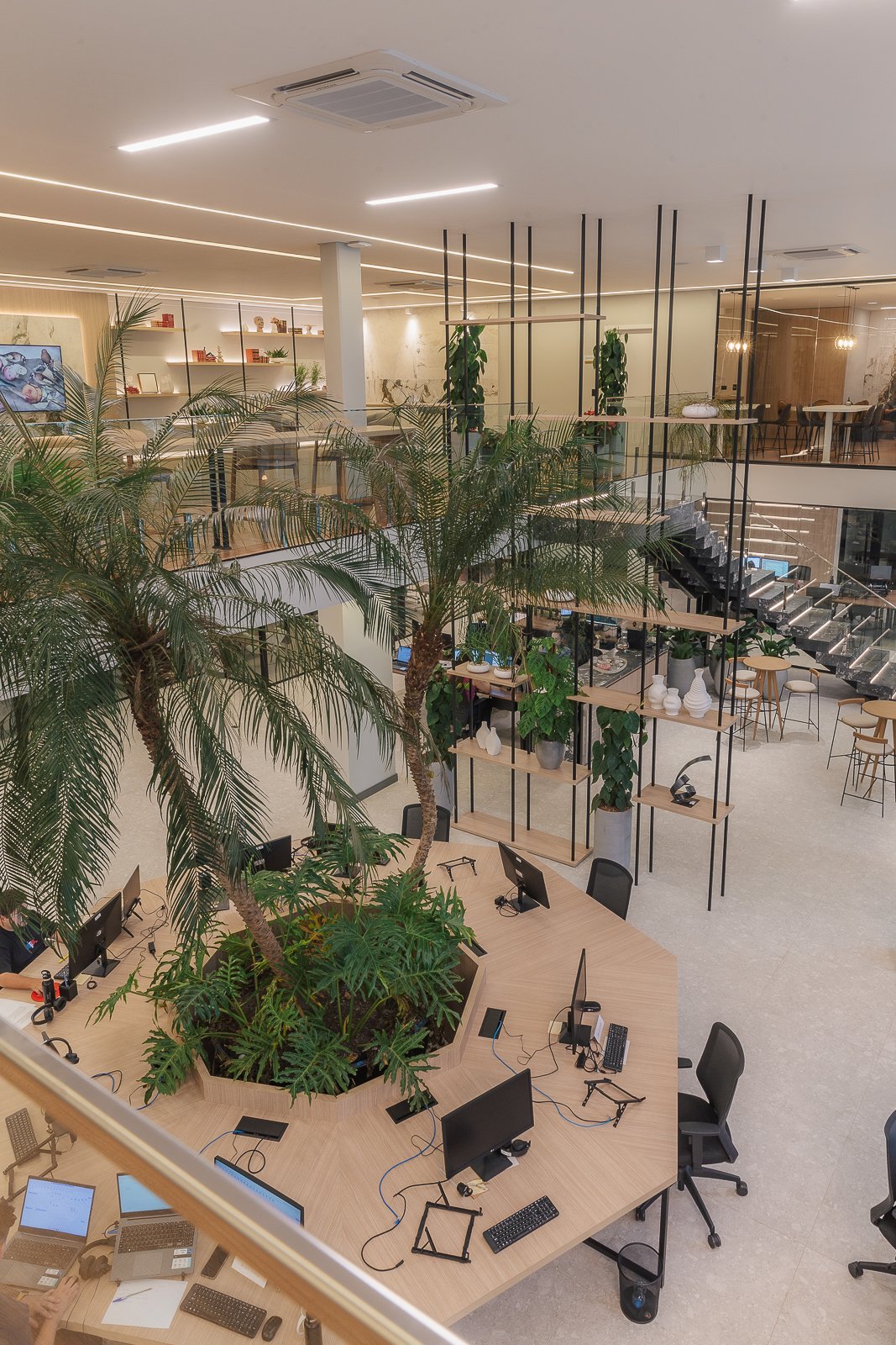 O projeto da nova sede do @meloadvogados.associados combina design biofílico e funcionalidade corporativa, refletindo inovação, confiança e bem-estar. A integração com a natureza, através de plantas como palmeiras e áreas envidraçadas que maximizam a luz natural, cria um ambiente agradável e reduz o estresse. O layout colaborativo, com mesas de formato orgânico e mobiliário que equilibra funcionalidade e estética, promove interação e harmonia entre os colaboradores em torno dos elementos verdes.