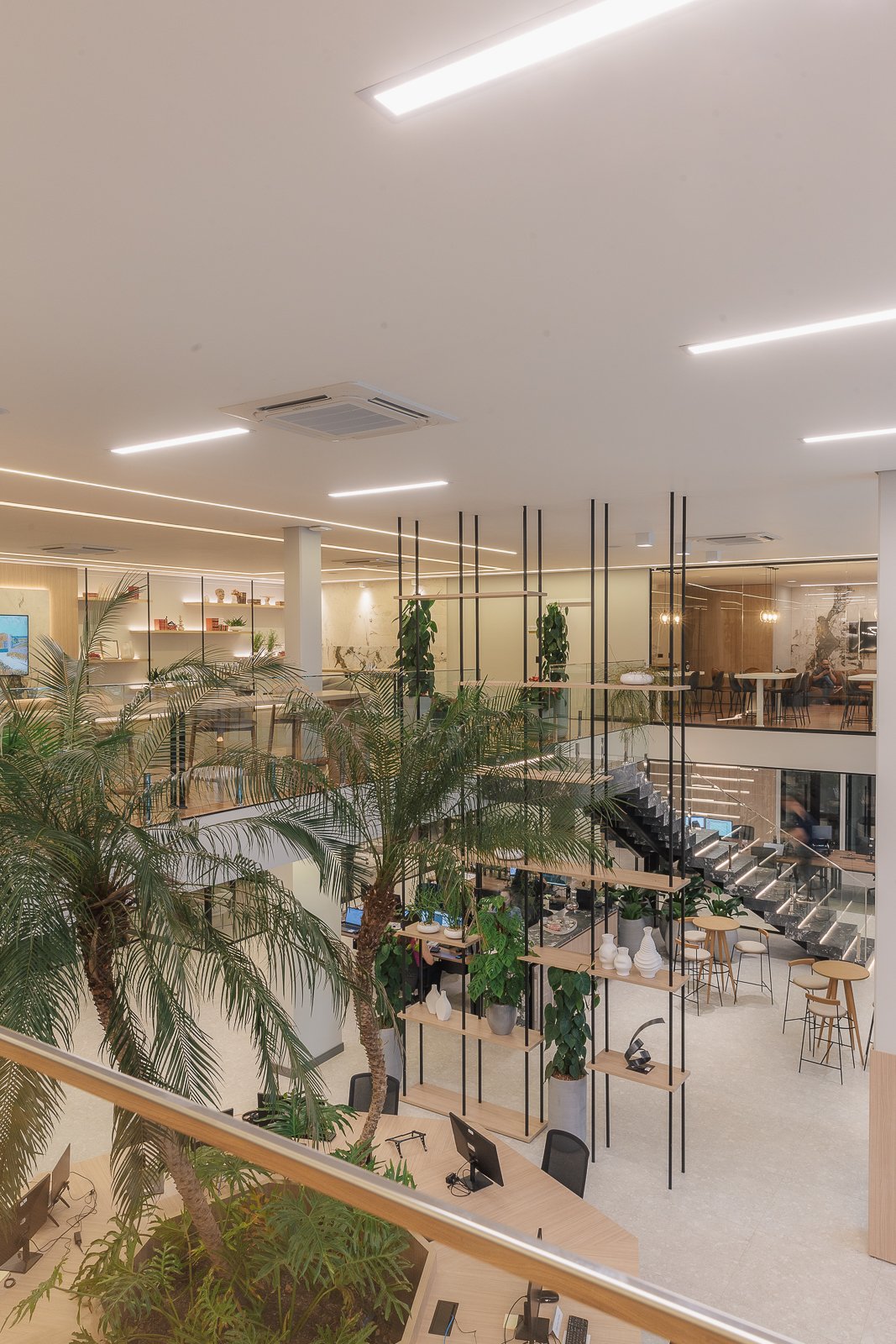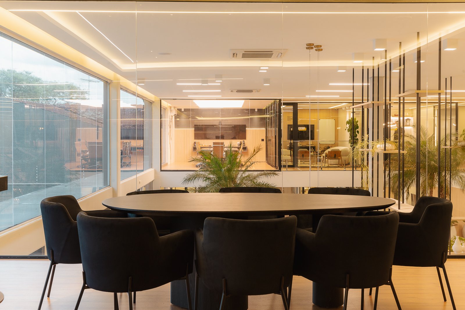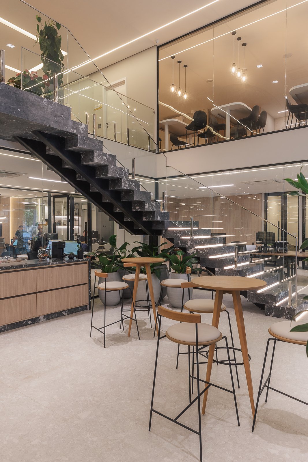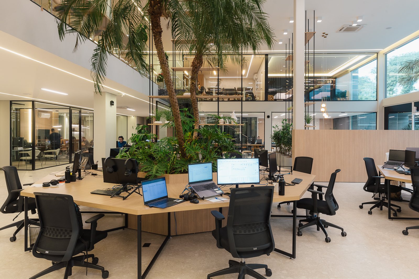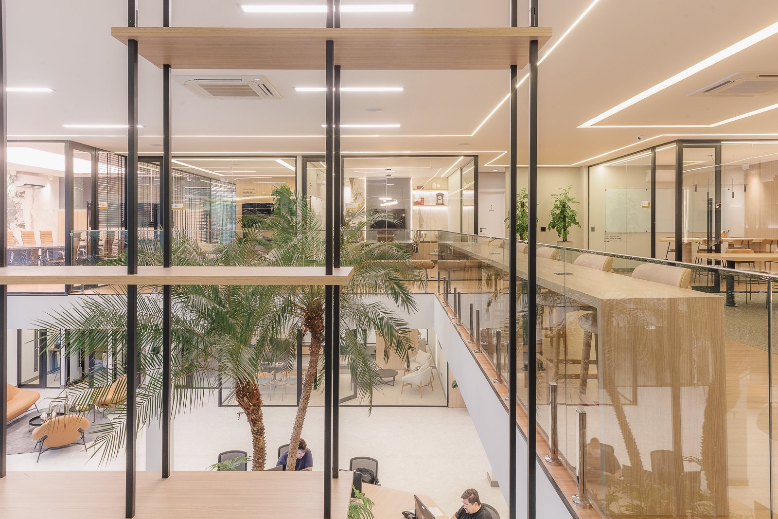 O projeto da nova sede do @meloadvogados.associados combina design biofílico e funcionalidade corporativa, refletindo inovação, confiança e bem-estar. A integração com a natureza, através de plantas como palmeiras e áreas envidraçadas que maximizam a luz natural, cria um ambiente agradável e reduz o estresse. O layout colaborativo, com mesas de formato orgânico e mobiliário que equilibra funcionalidade e estética, promove interação e harmonia entre os colaboradores em torno dos elementos verdes.