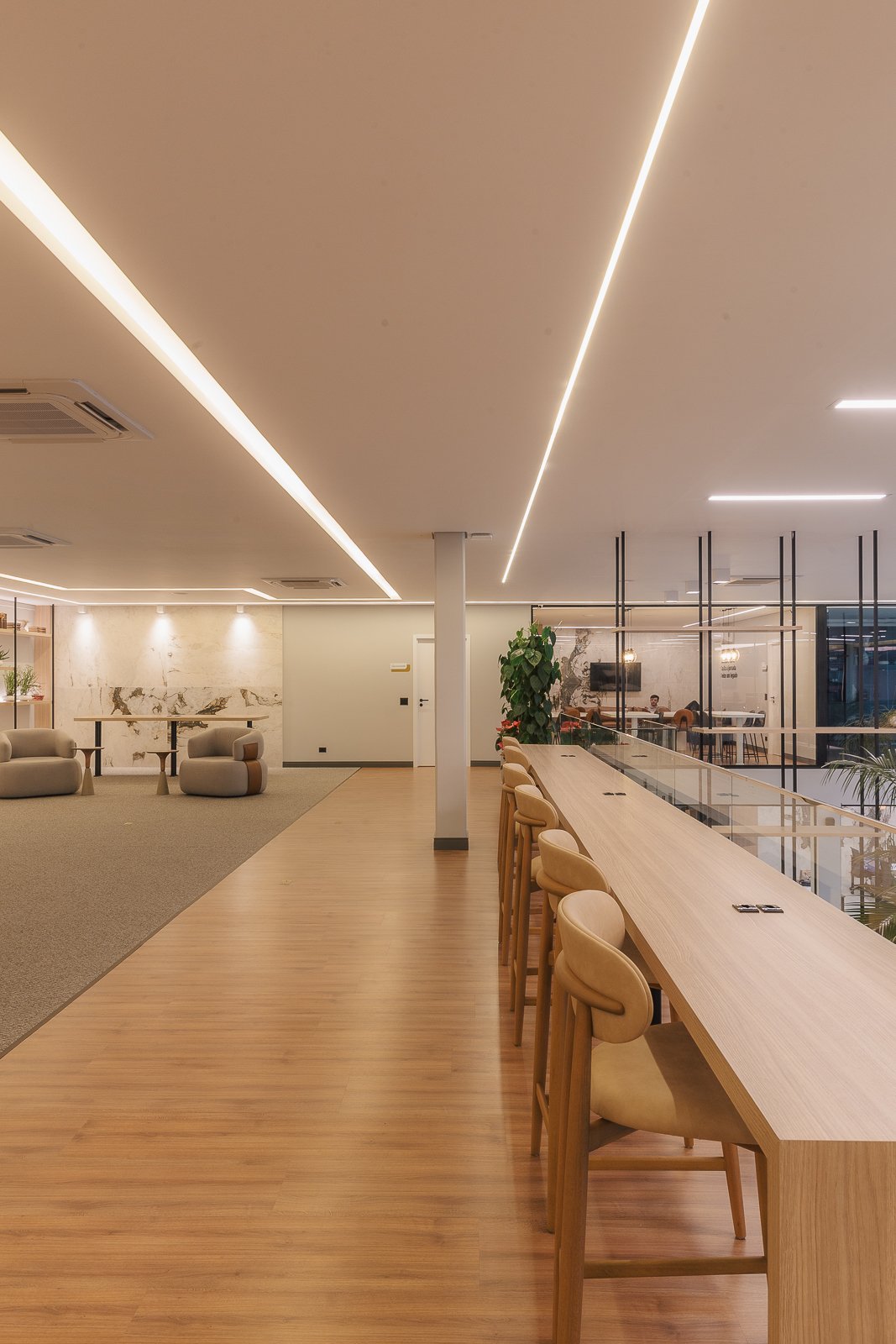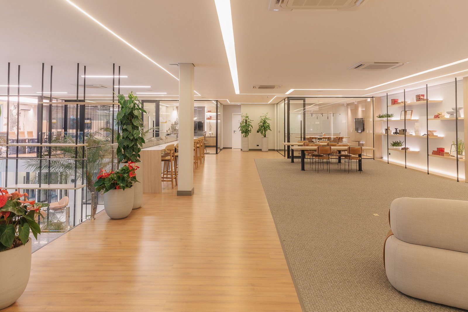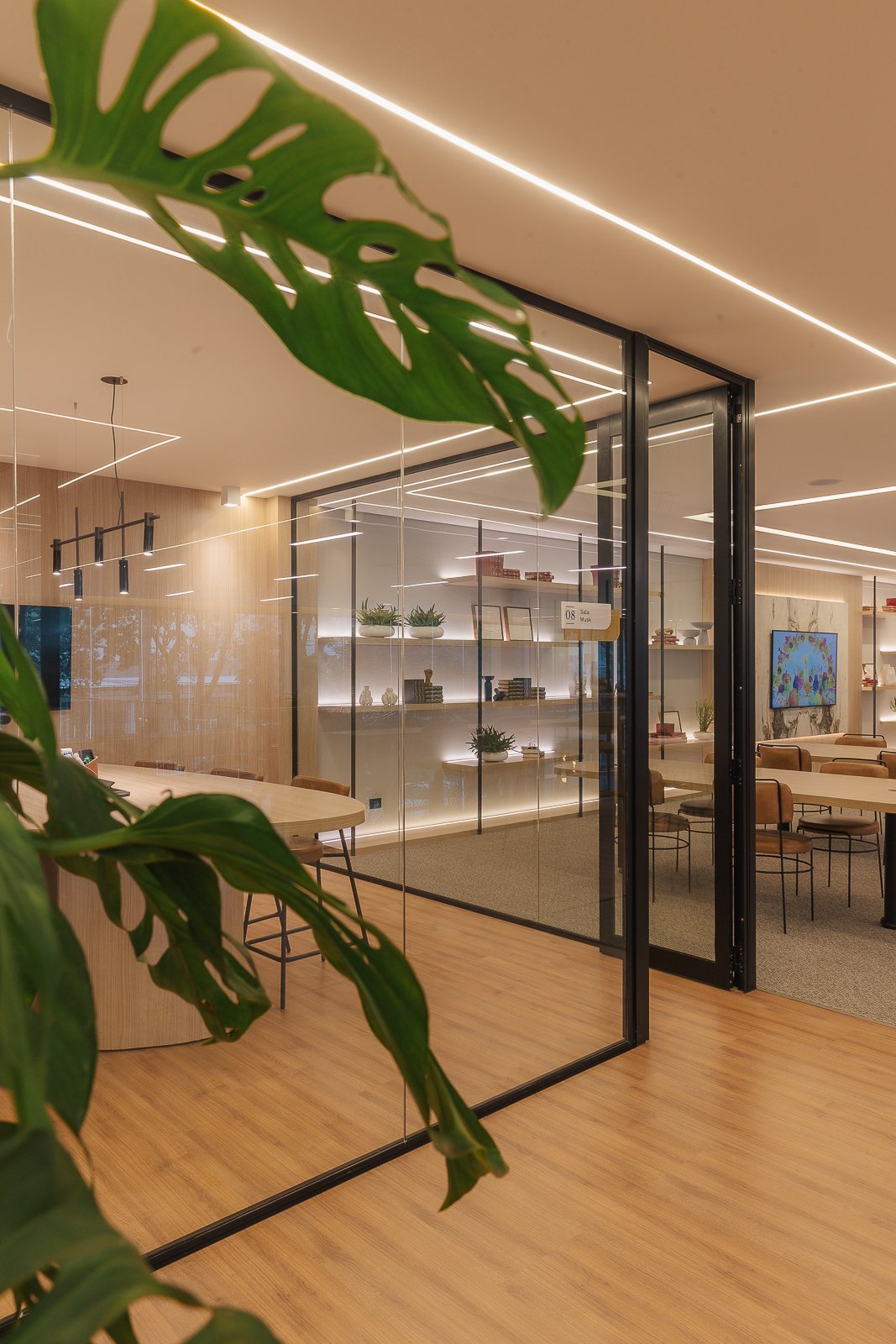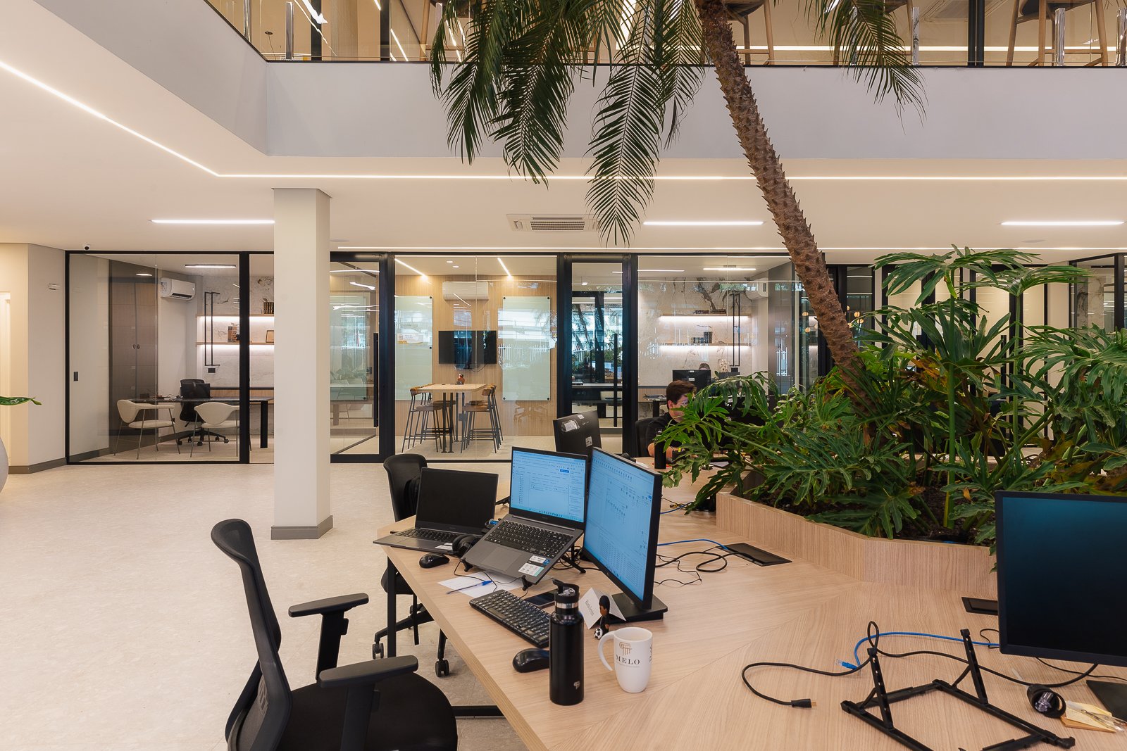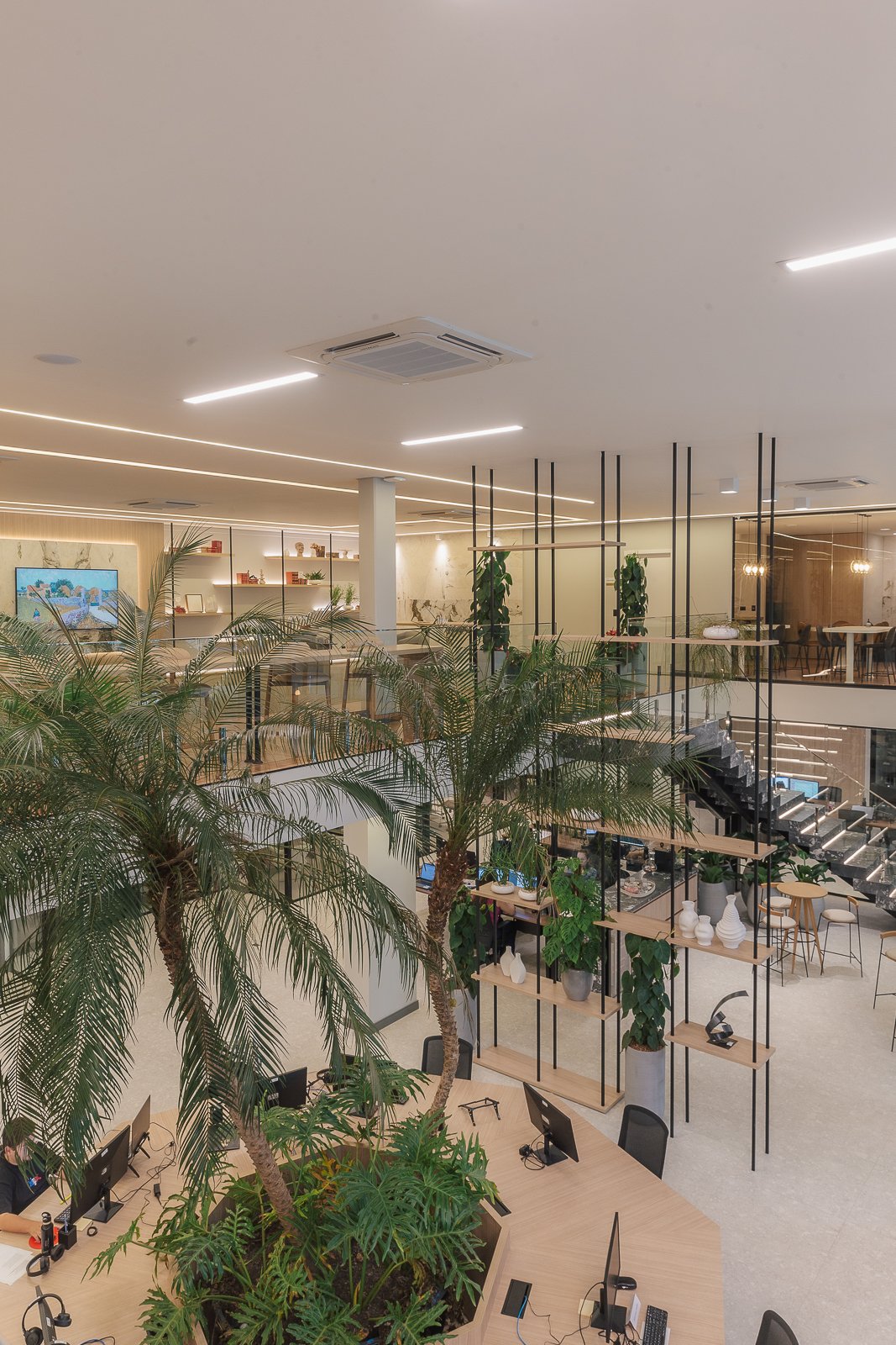 O projeto da nova sede do @meloadvogados.associados combina design biofílico e funcionalidade corporativa, refletindo inovação, confiança e bem-estar. A integração com a natureza, através de plantas como palmeiras e áreas envidraçadas que maximizam a luz natural, cria um ambiente agradável e reduz o estresse. O layout colaborativo, com mesas de formato orgânico e mobiliário que equilibra funcionalidade e estética, promove interação e harmonia entre os colaboradores em torno dos elementos verdes.