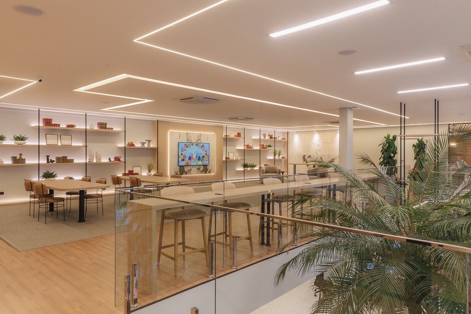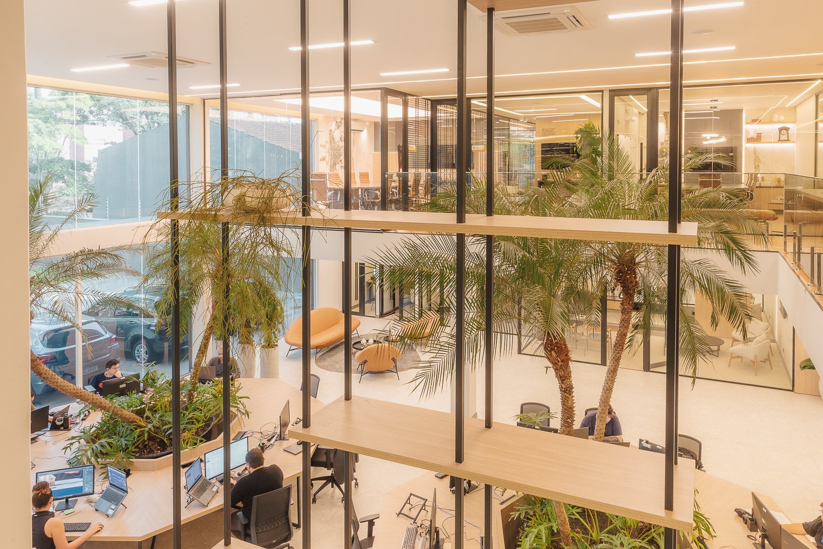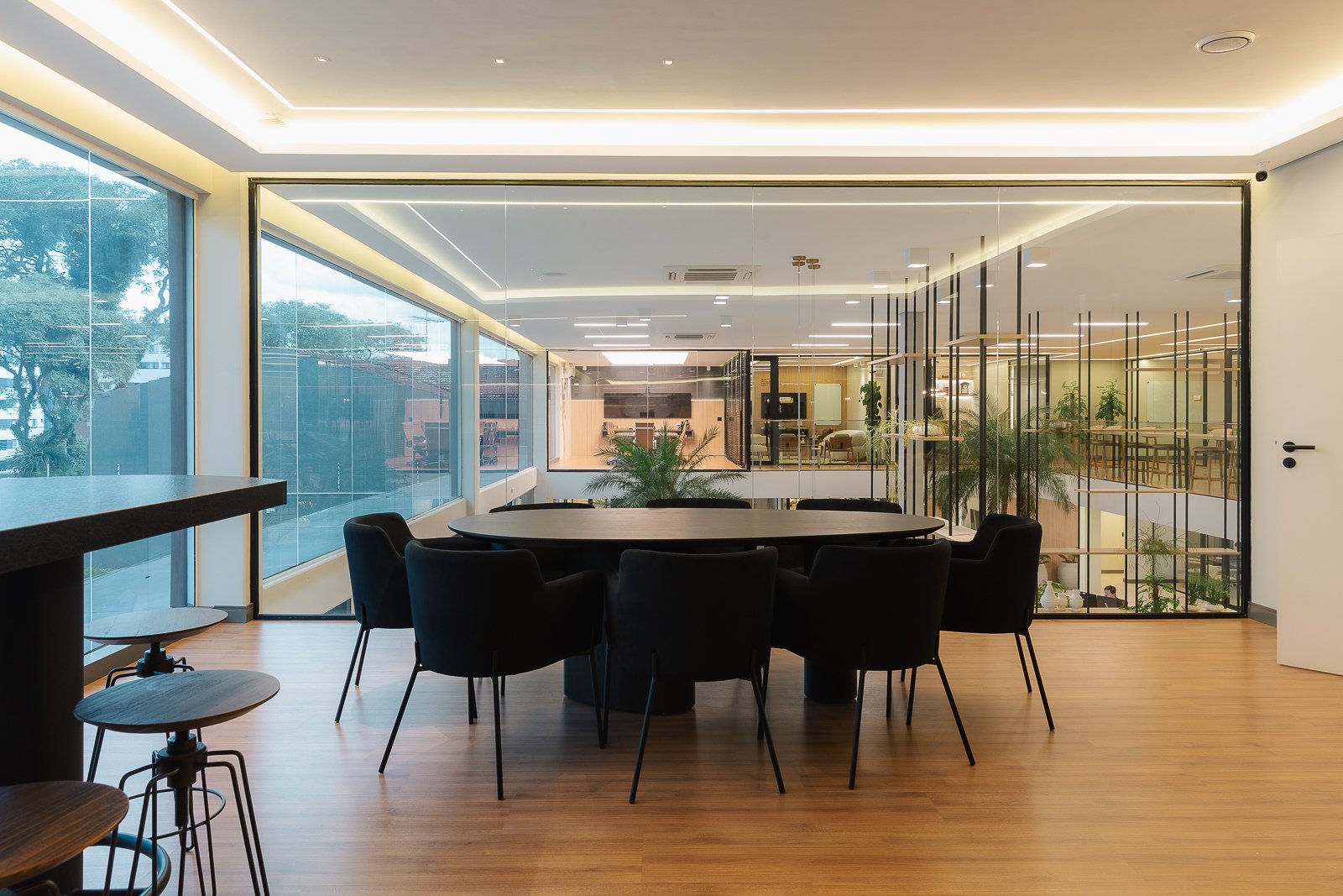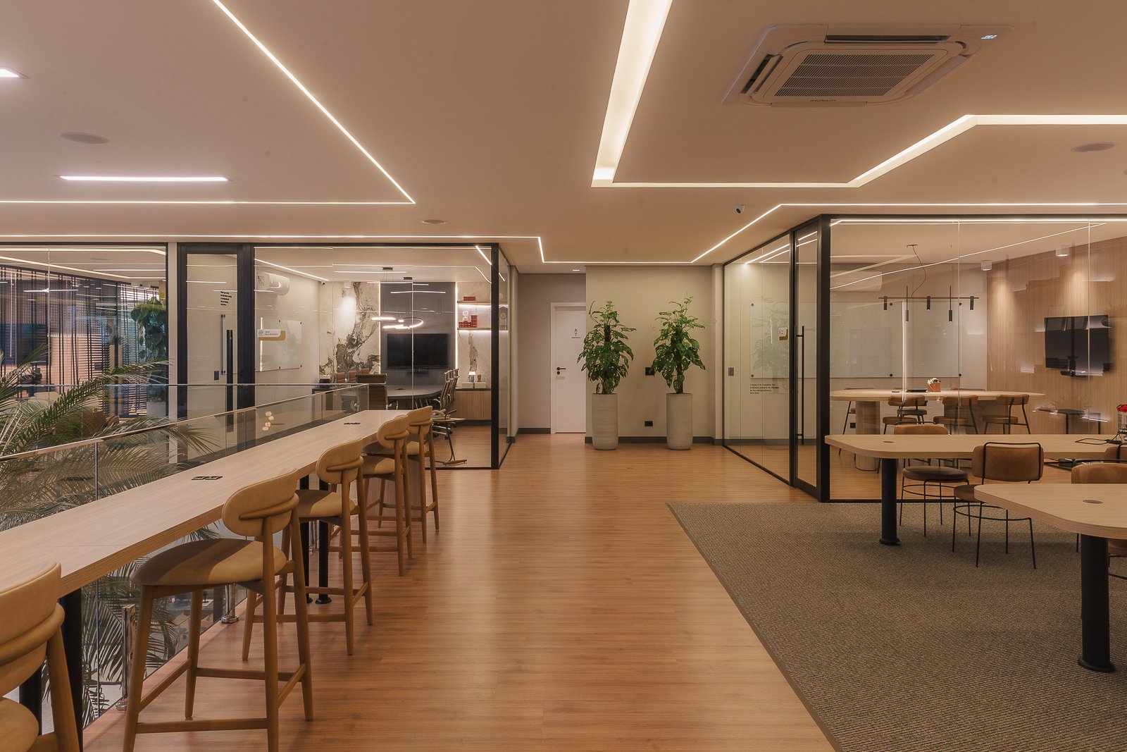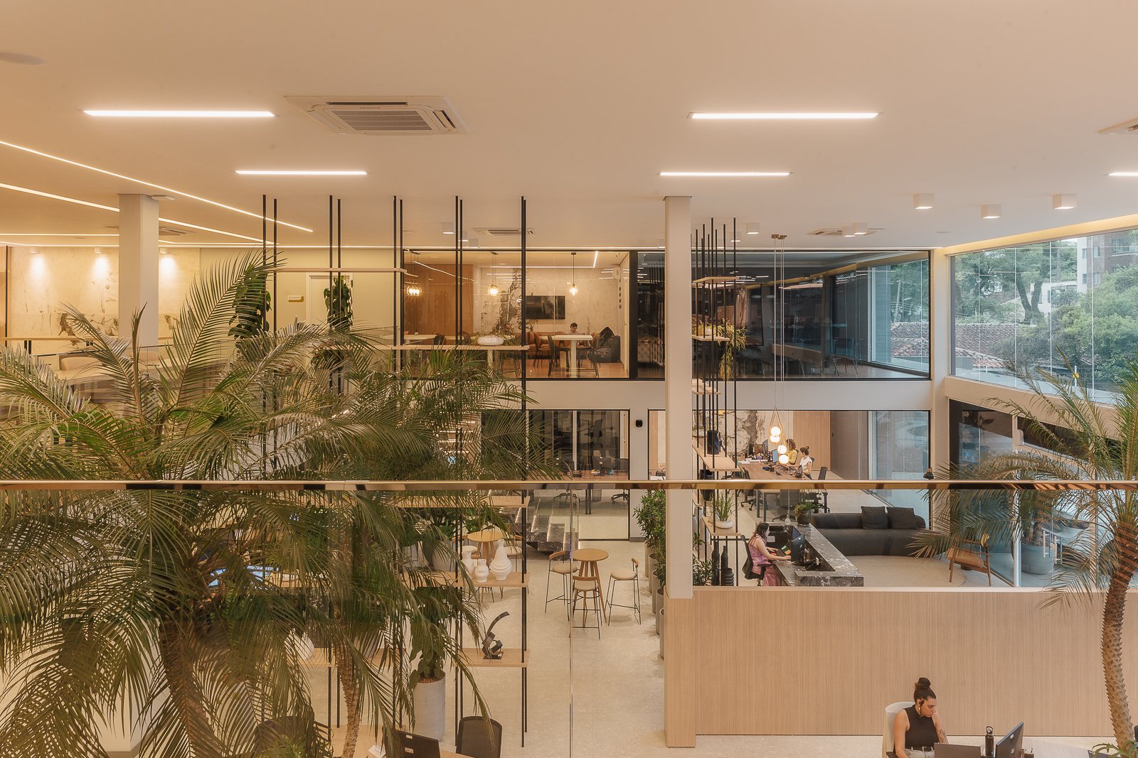 O projeto da nova sede do @meloadvogados.associados combina design biofílico e funcionalidade corporativa, refletindo inovação, confiança e bem-estar. A integração com a natureza, através de plantas como palmeiras e áreas envidraçadas que maximizam a luz natural, cria um ambiente agradável e reduz o estresse. O layout colaborativo, com mesas de formato orgânico e mobiliário que equilibra funcionalidade e estética, promove interação e harmonia entre os colaboradores em torno dos elementos verdes.