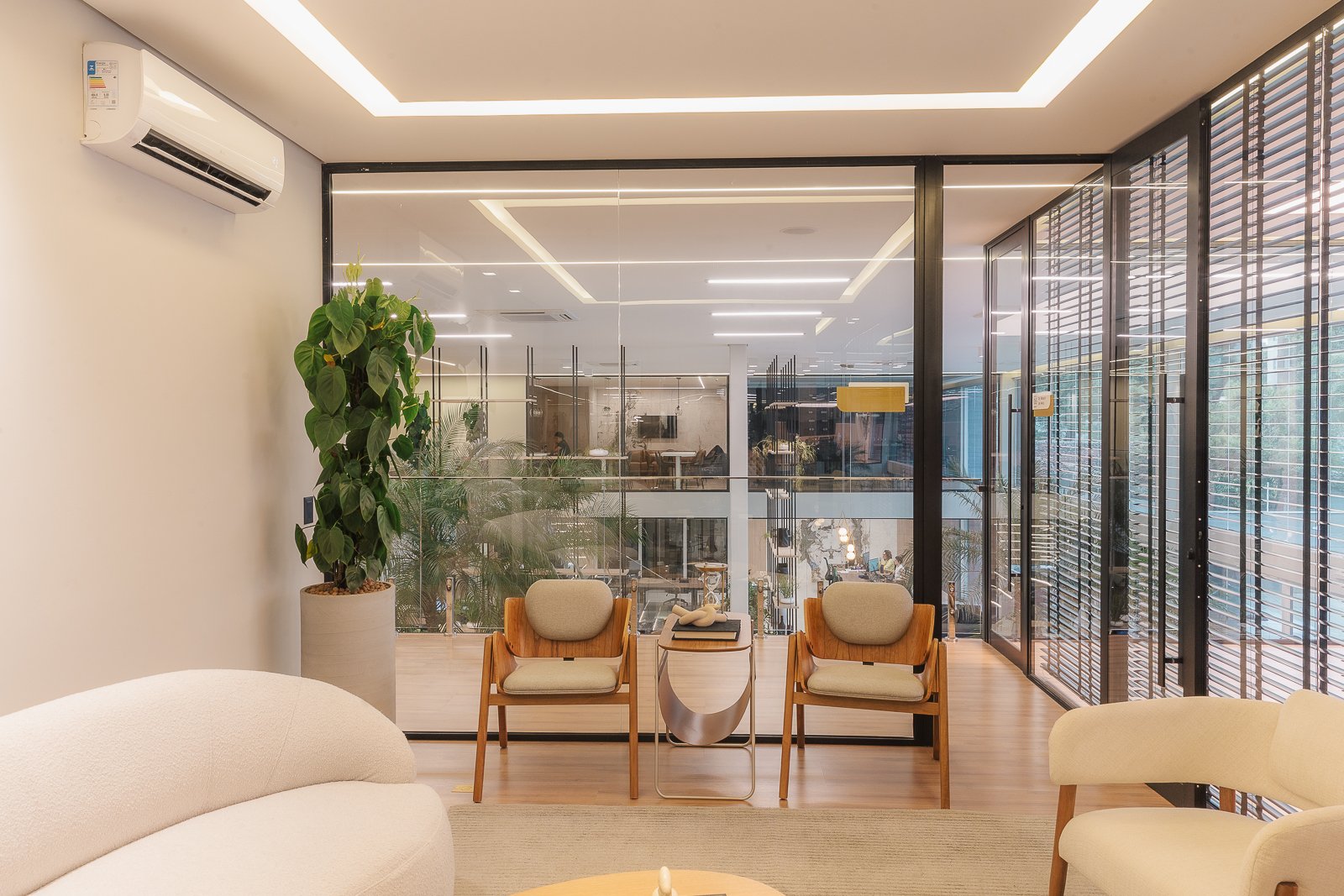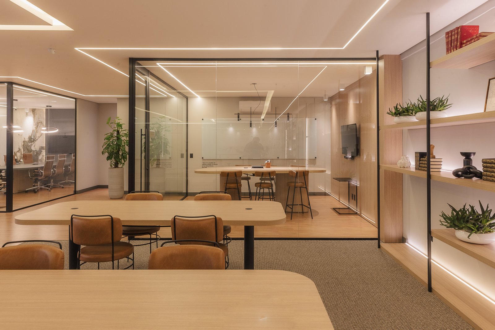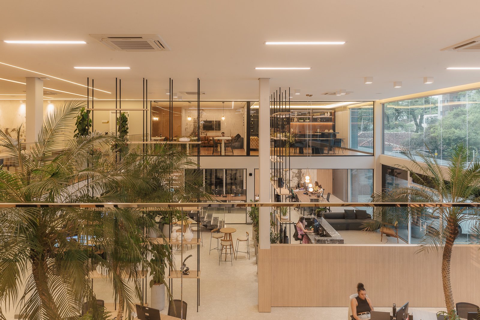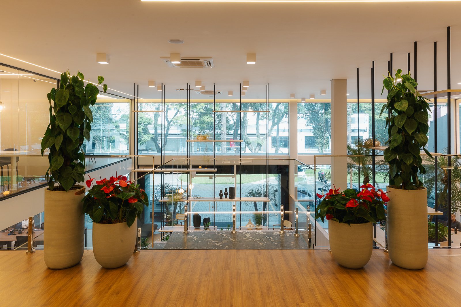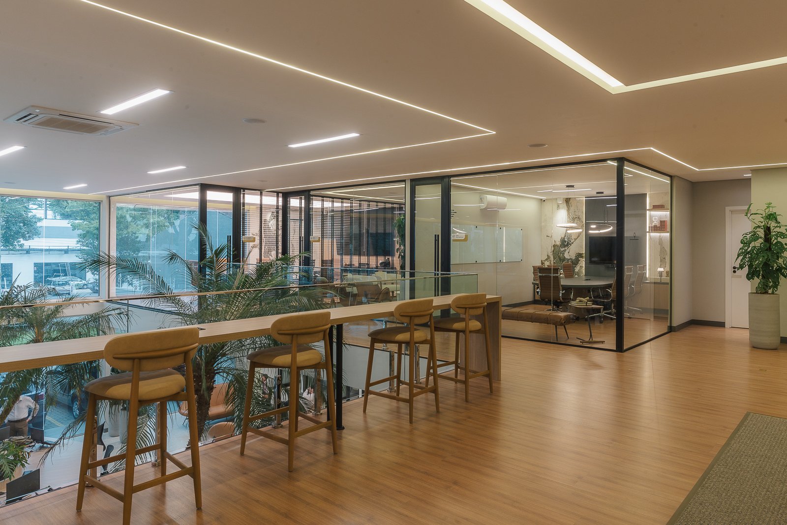 O projeto da nova sede do @meloadvogados.associados combina design biofílico e funcionalidade corporativa, refletindo inovação, confiança e bem-estar. A integração com a natureza, através de plantas como palmeiras e áreas envidraçadas que maximizam a luz natural, cria um ambiente agradável e reduz o estresse. O layout colaborativo, com mesas de formato orgânico e mobiliário que equilibra funcionalidade e estética, promove interação e harmonia entre os colaboradores em torno dos elementos verdes.
