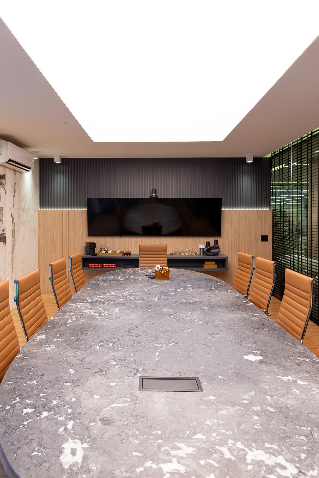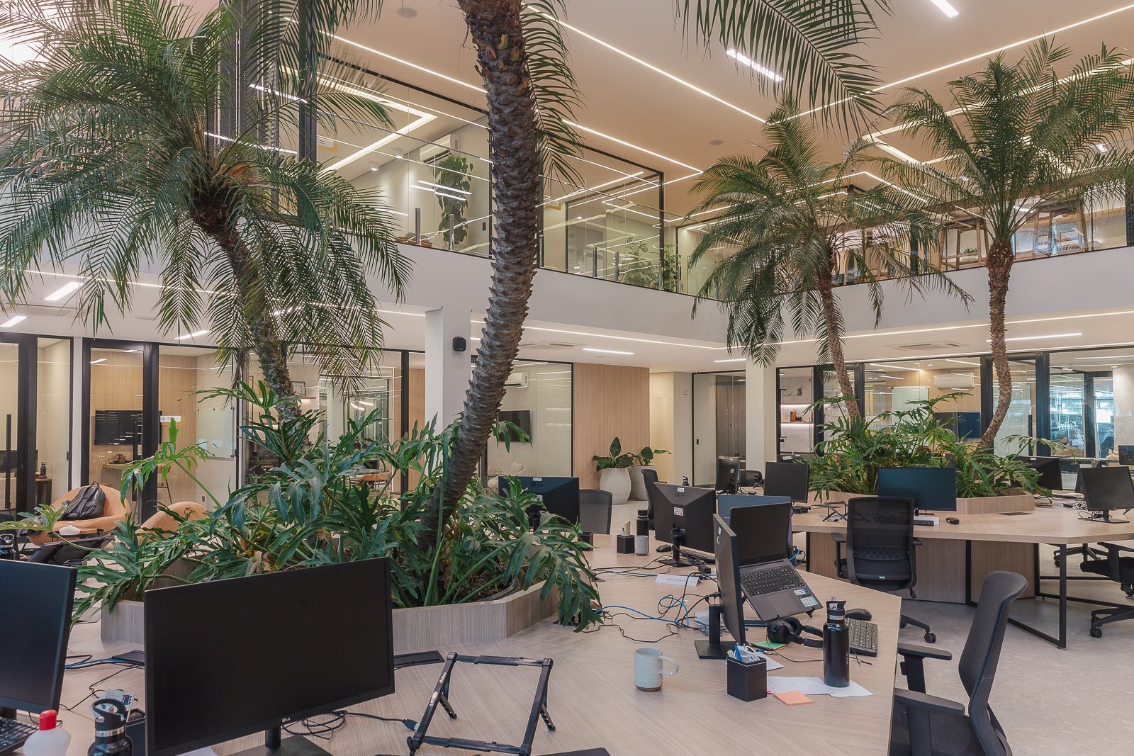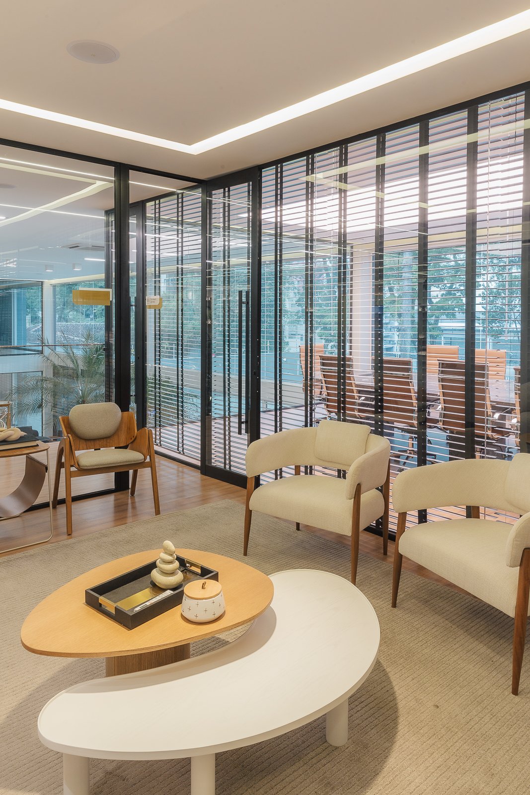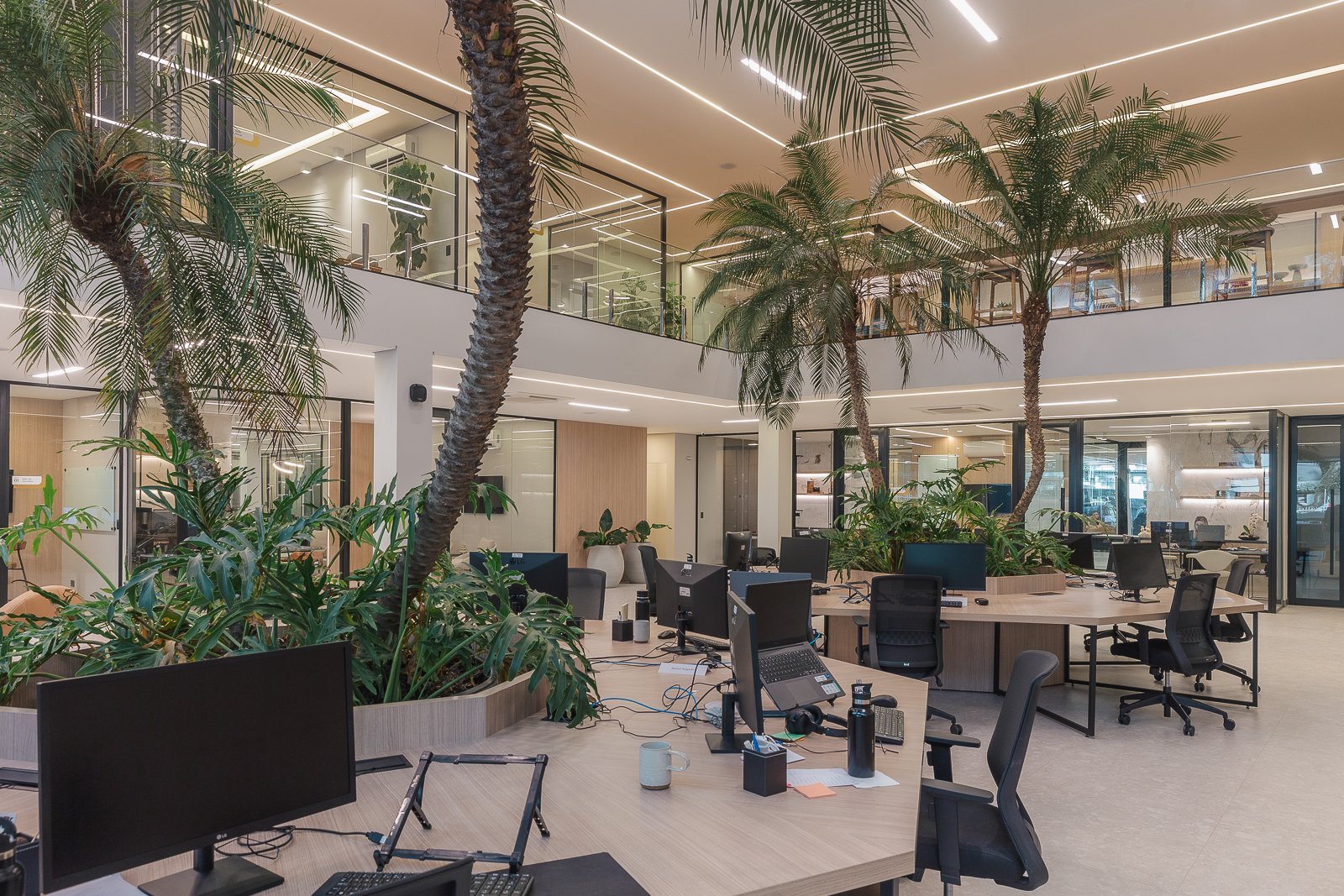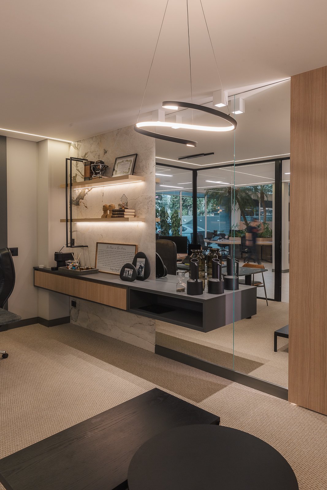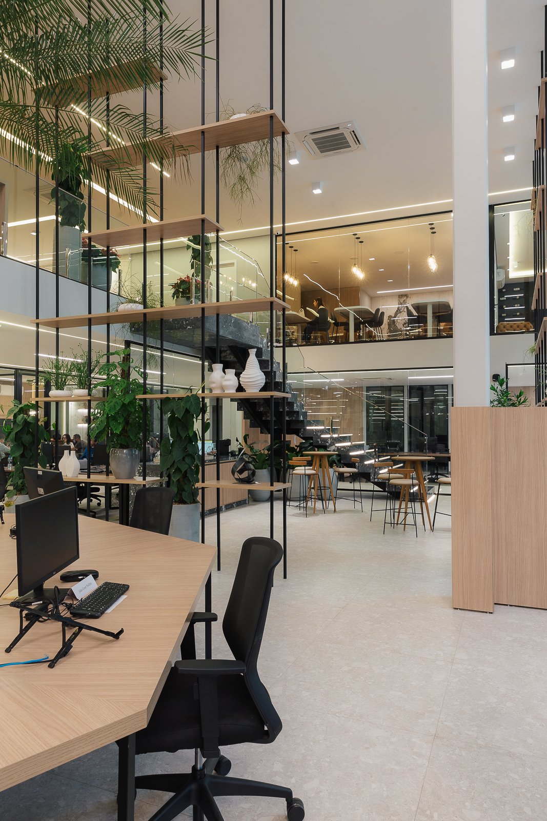 O projeto da nova sede do @meloadvogados.associados combina design biofílico e funcionalidade corporativa, refletindo inovação, confiança e bem-estar. A integração com a natureza, através de plantas como palmeiras e áreas envidraçadas que maximizam a luz natural, cria um ambiente agradável e reduz o estresse. O layout colaborativo, com mesas de formato orgânico e mobiliário que equilibra funcionalidade e estética, promove interação e harmonia entre os colaboradores em torno dos elementos verdes.