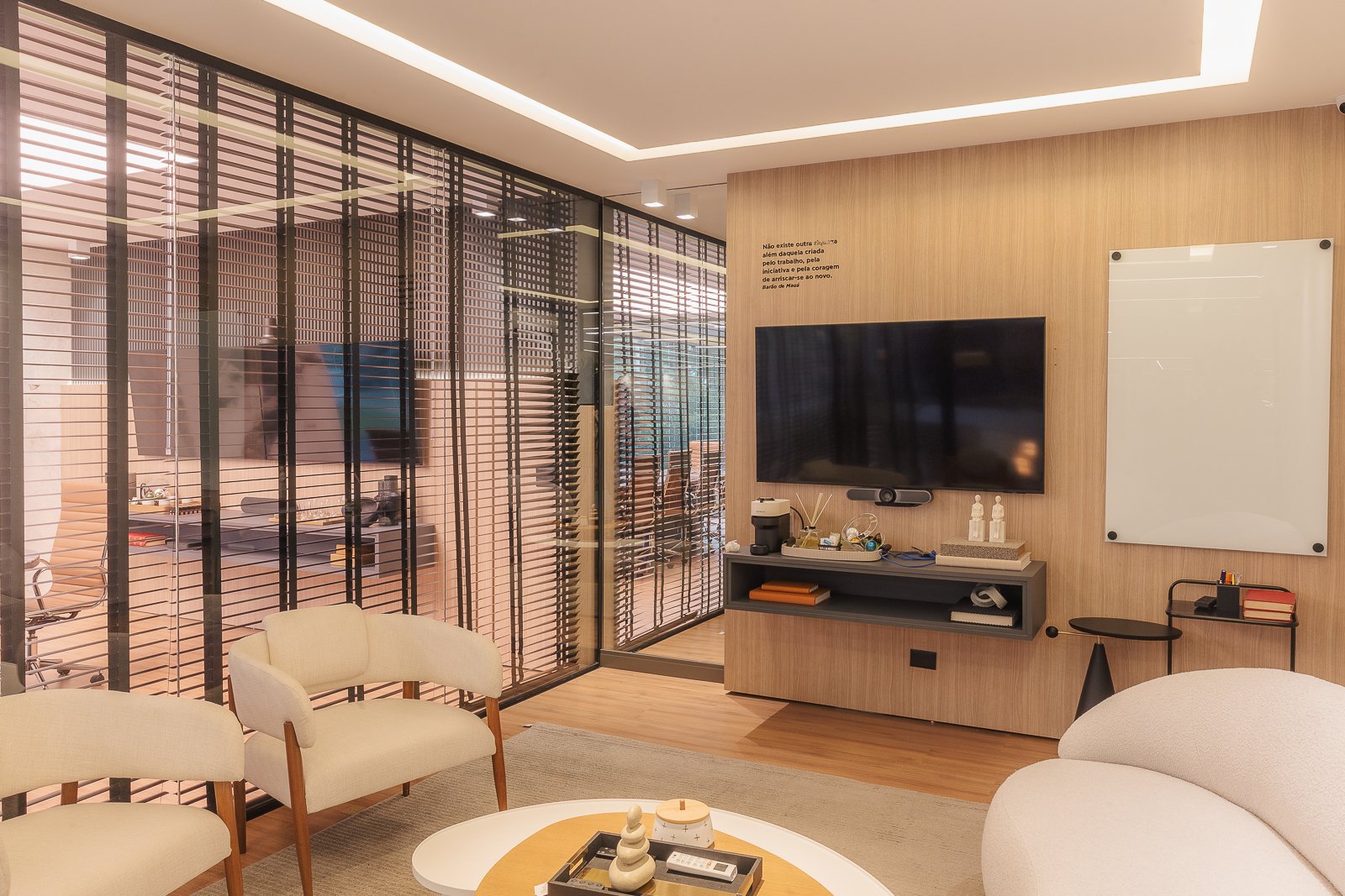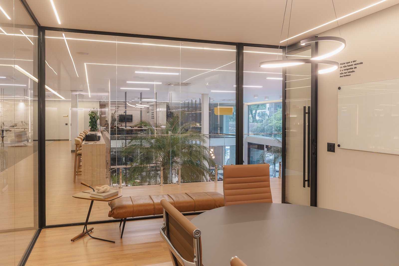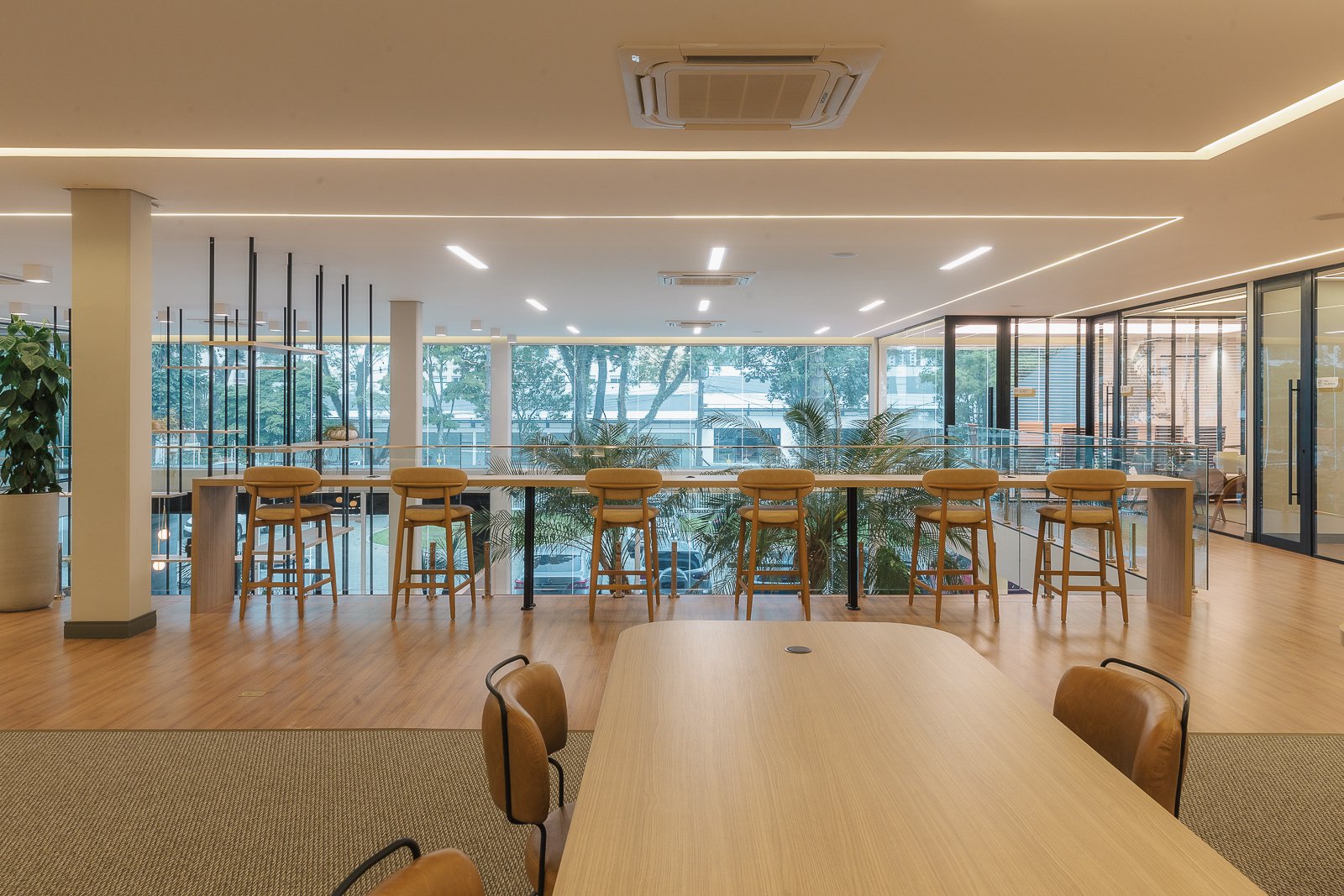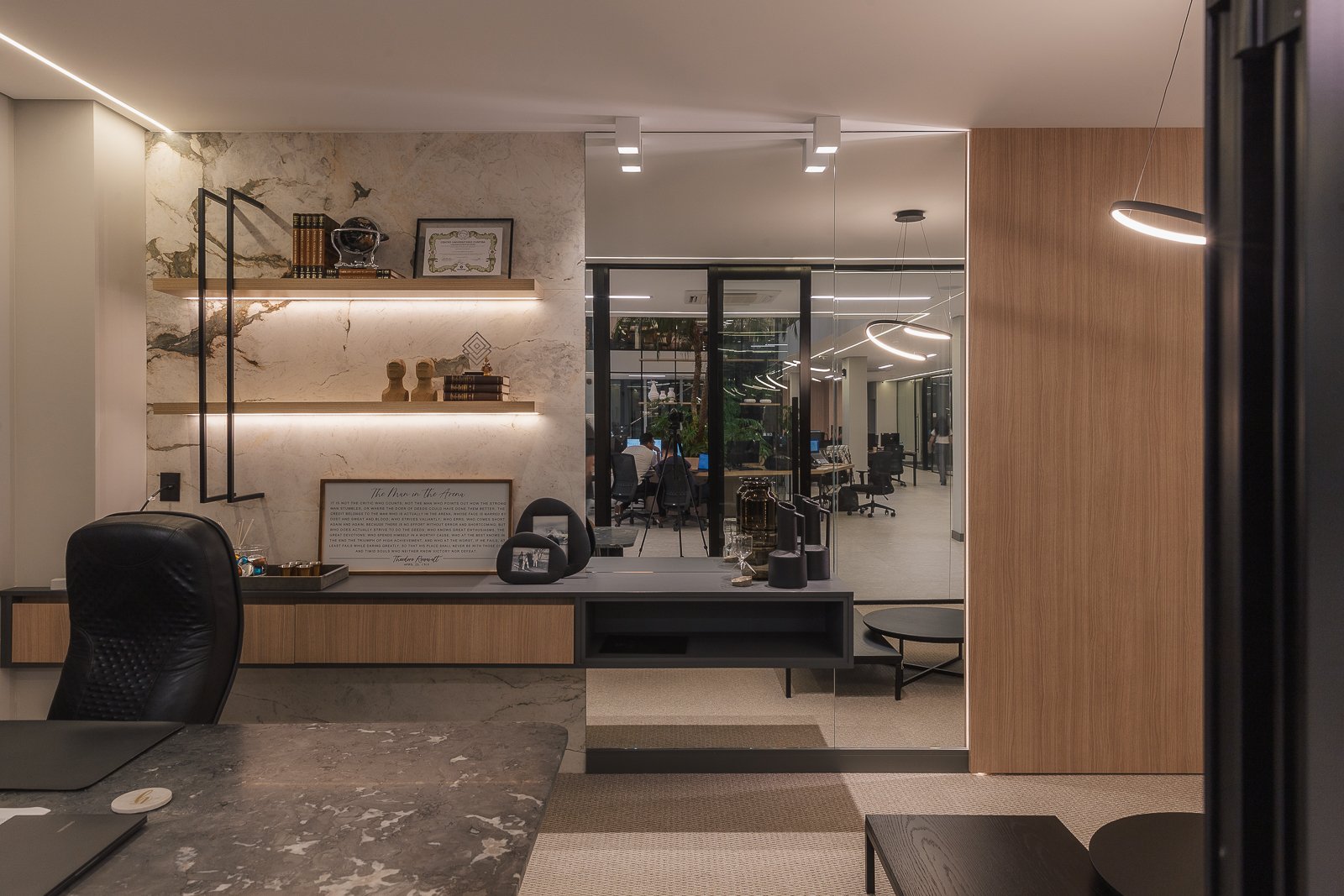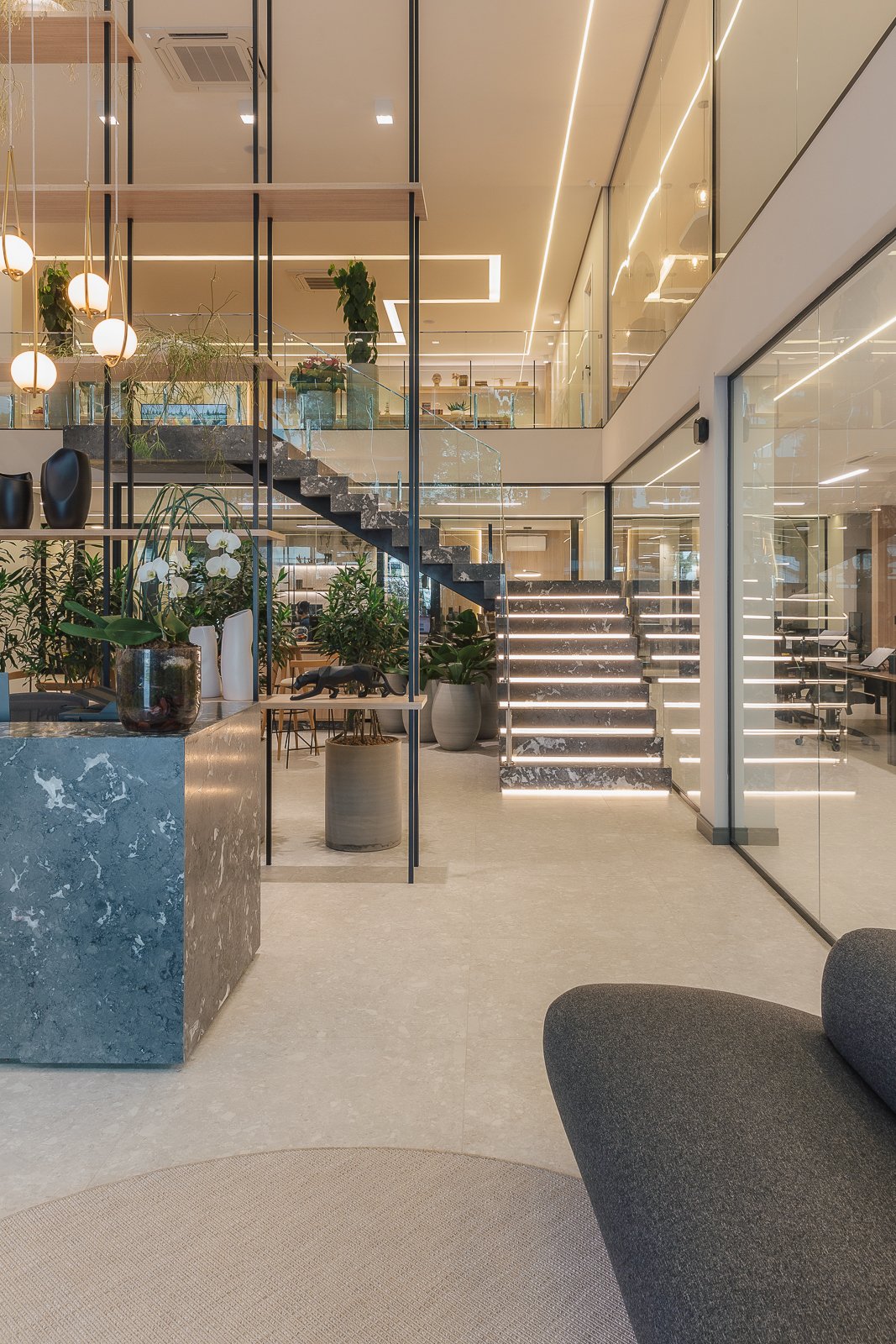 O projeto da nova sede do @meloadvogados.associados combina design biofílico e funcionalidade corporativa, refletindo inovação, confiança e bem-estar. A integração com a natureza, através de plantas como palmeiras e áreas envidraçadas que maximizam a luz natural, cria um ambiente agradável e reduz o estresse. O layout colaborativo, com mesas de formato orgânico e mobiliário que equilibra funcionalidade e estética, promove interação e harmonia entre os colaboradores em torno dos elementos verdes.