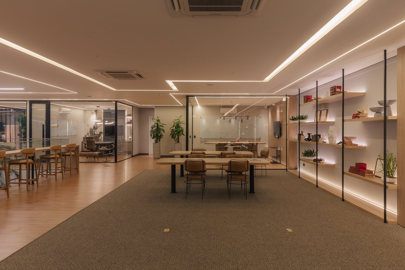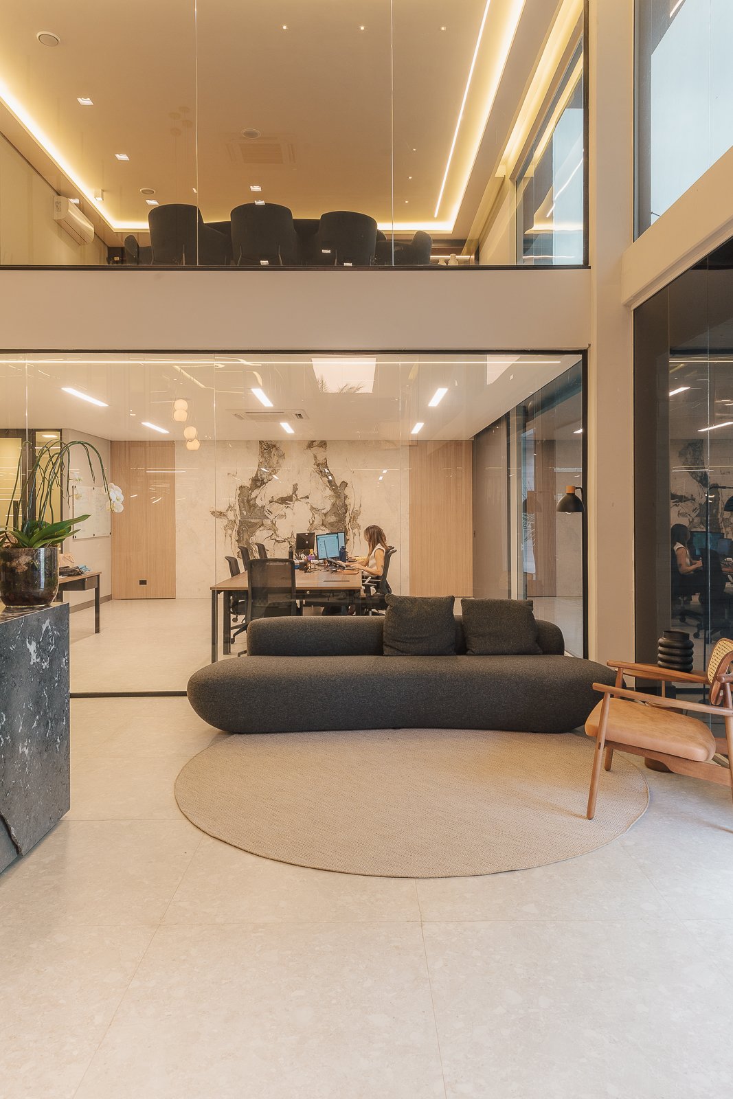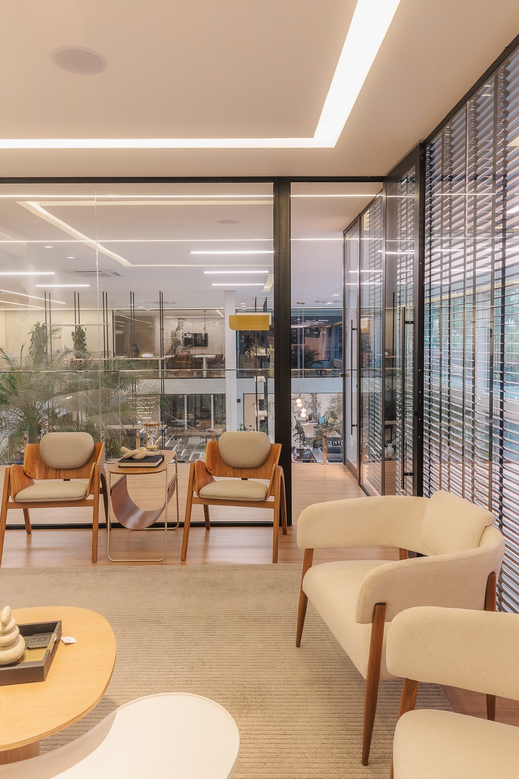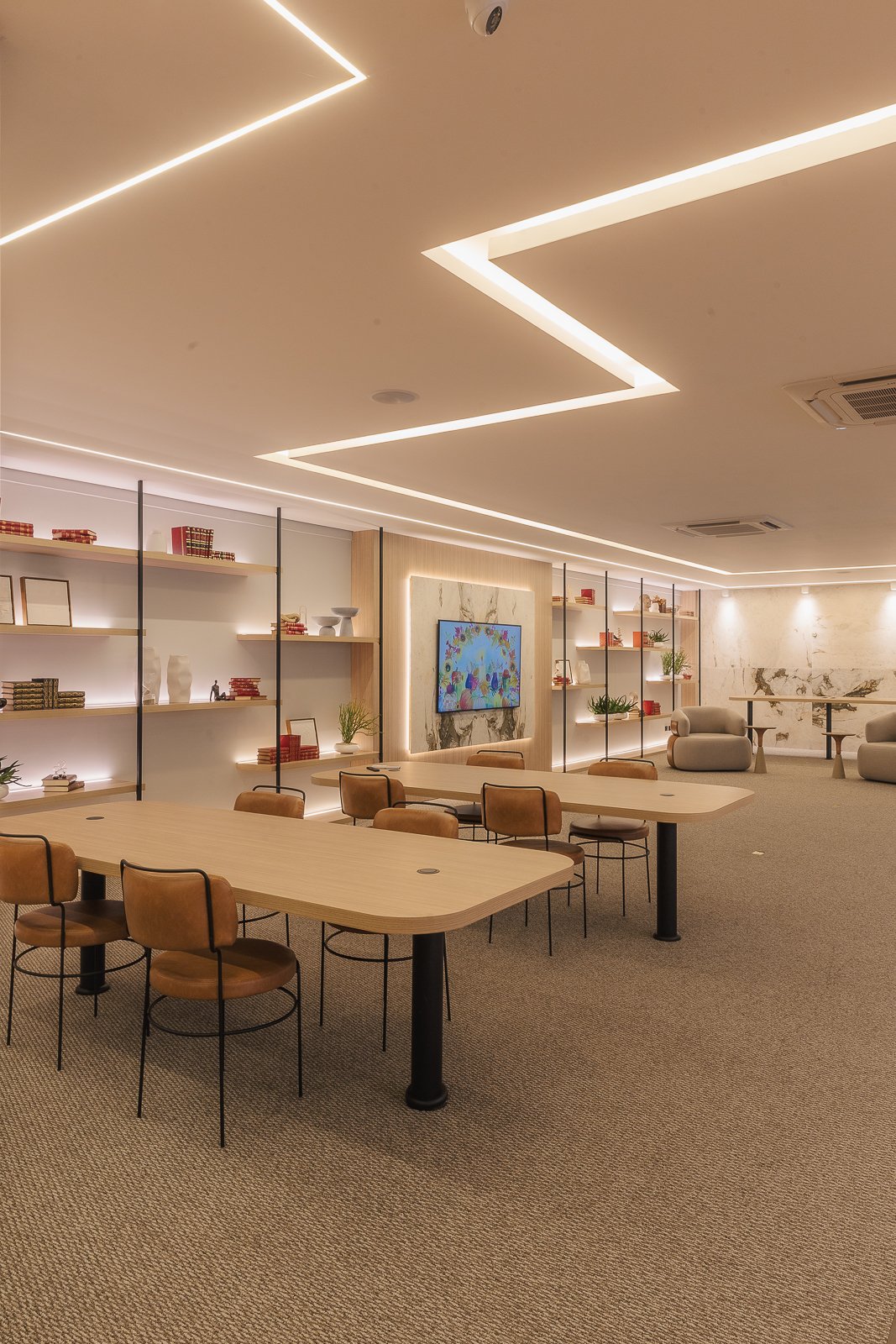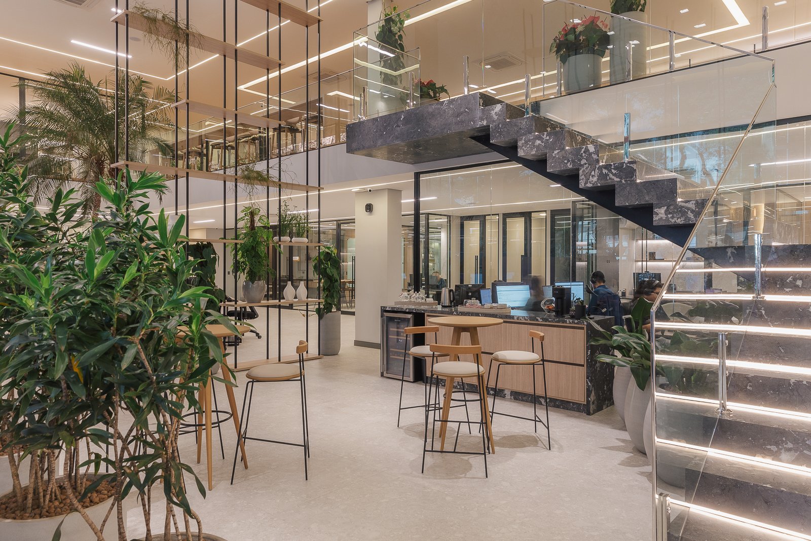 O projeto da nova sede do @meloadvogados.associados combina design biofílico e funcionalidade corporativa, refletindo inovação, confiança e bem-estar. A integração com a natureza, através de plantas como palmeiras e áreas envidraçadas que maximizam a luz natural, cria um ambiente agradável e reduz o estresse. O layout colaborativo, com mesas de formato orgânico e mobiliário que equilibra funcionalidade e estética, promove interação e harmonia entre os colaboradores em torno dos elementos verdes.
