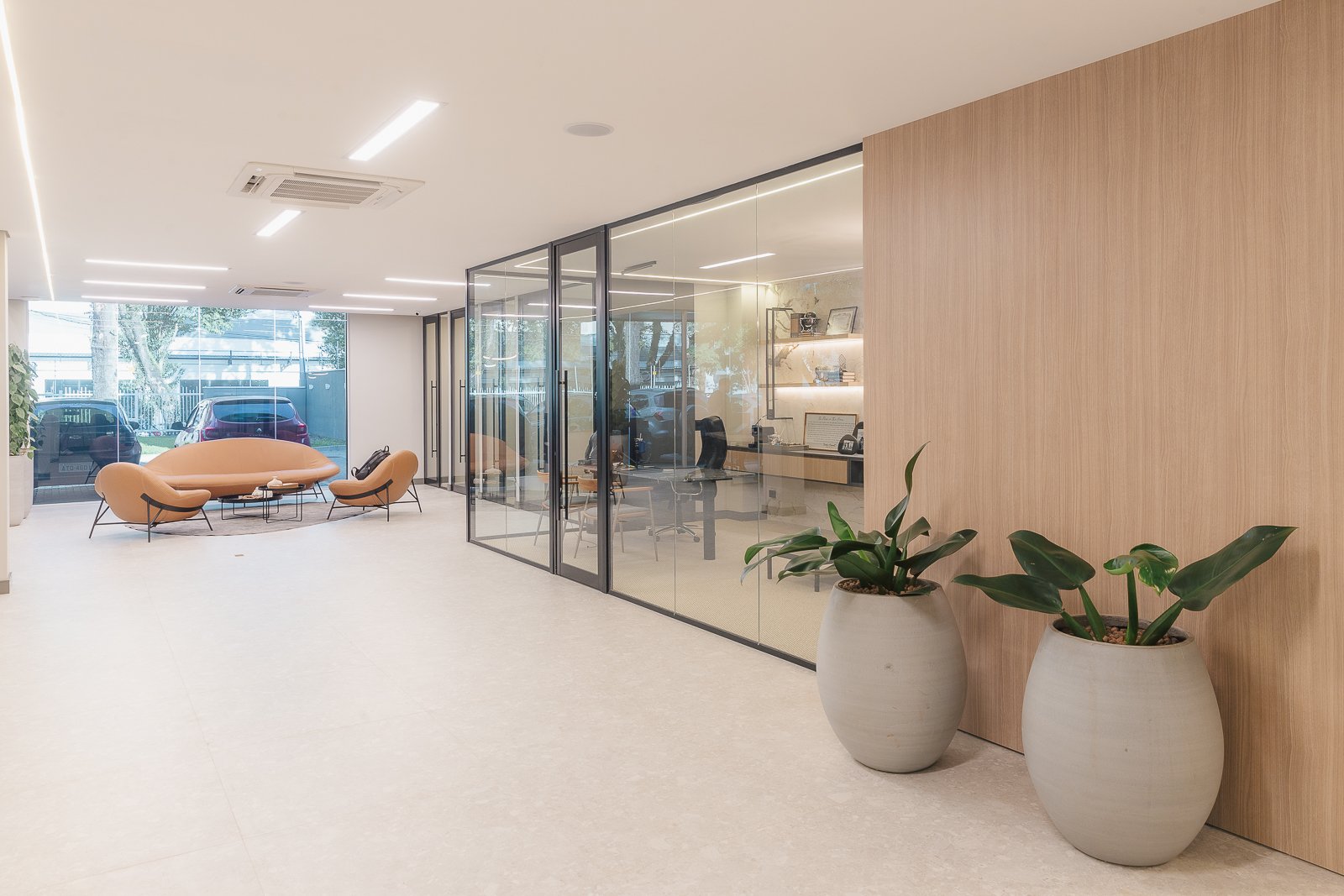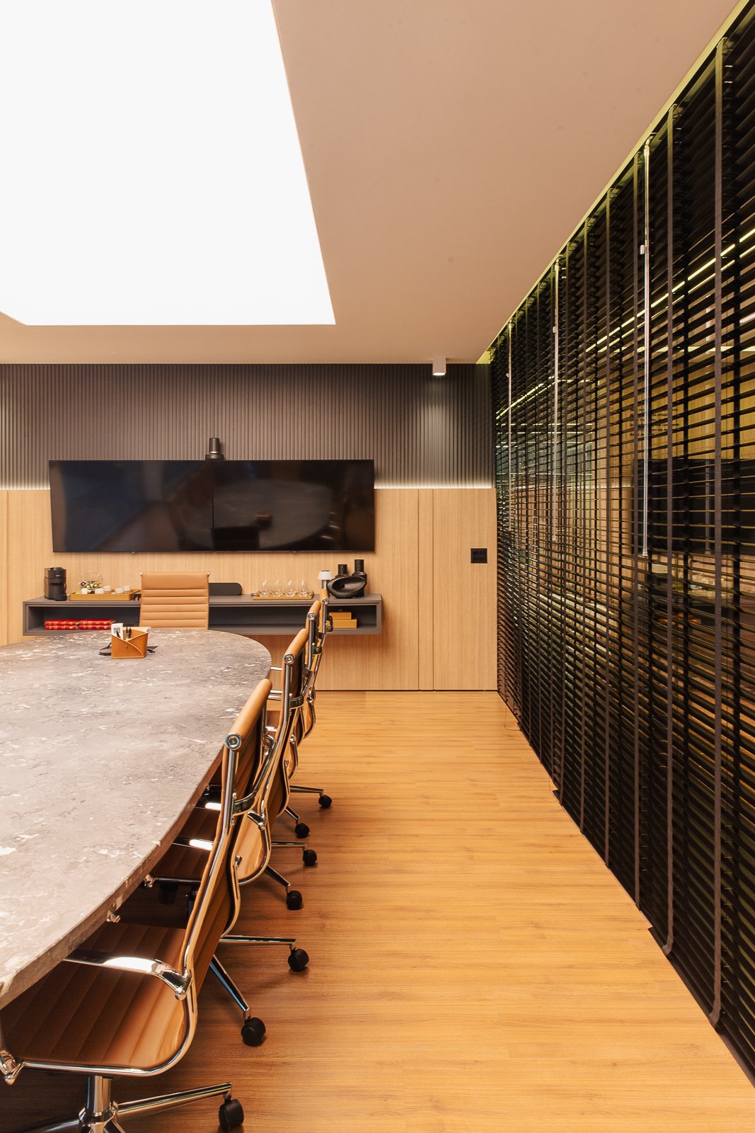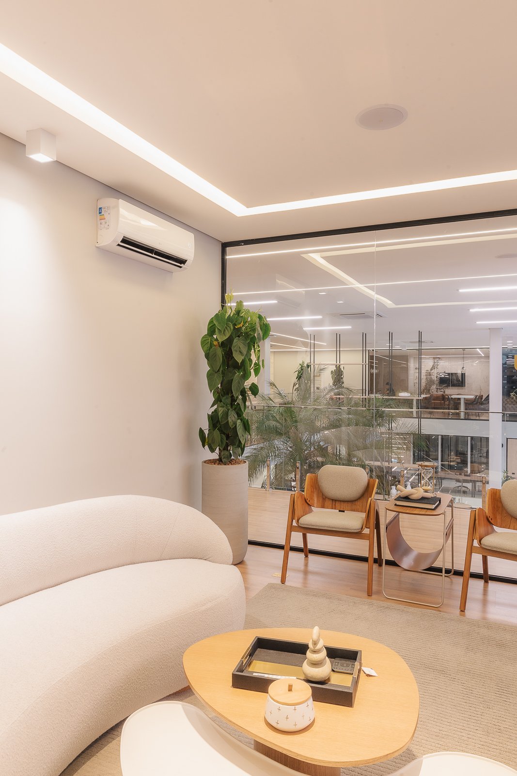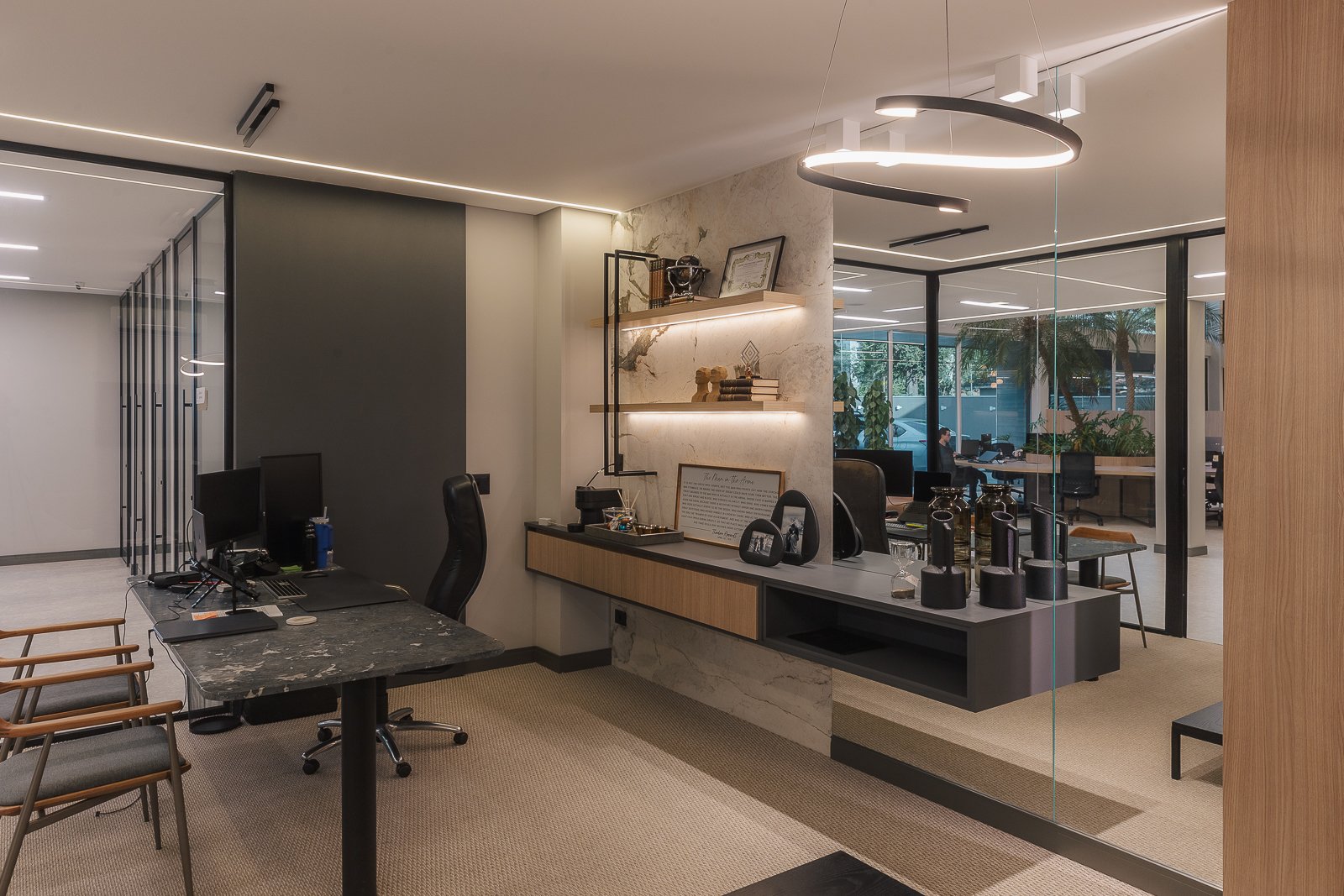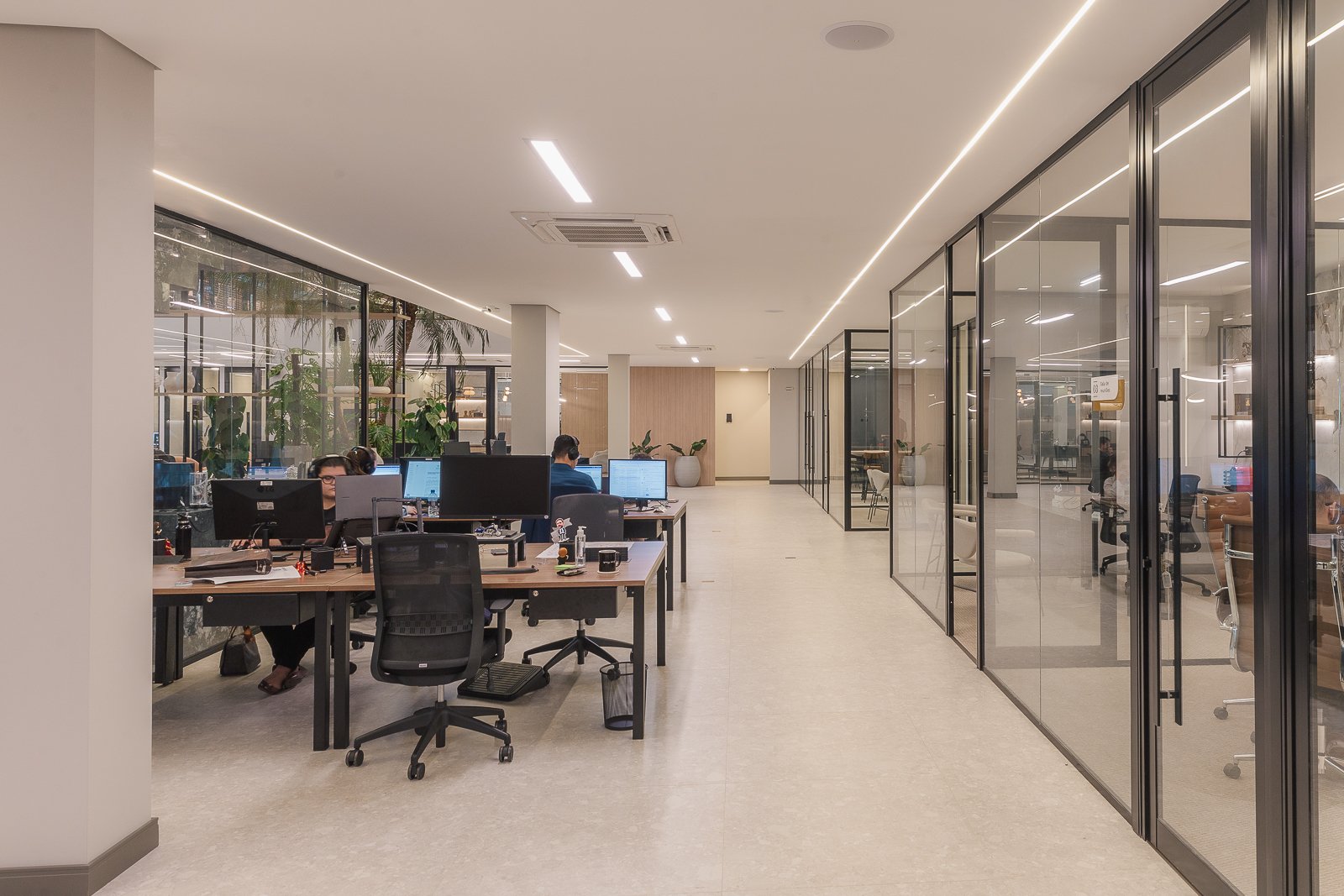 O projeto da nova sede do @meloadvogados.associados combina design biofílico e funcionalidade corporativa, refletindo inovação, confiança e bem-estar. A integração com a natureza, através de plantas como palmeiras e áreas envidraçadas que maximizam a luz natural, cria um ambiente agradável e reduz o estresse. O layout colaborativo, com mesas de formato orgânico e mobiliário que equilibra funcionalidade e estética, promove interação e harmonia entre os colaboradores em torno dos elementos verdes.