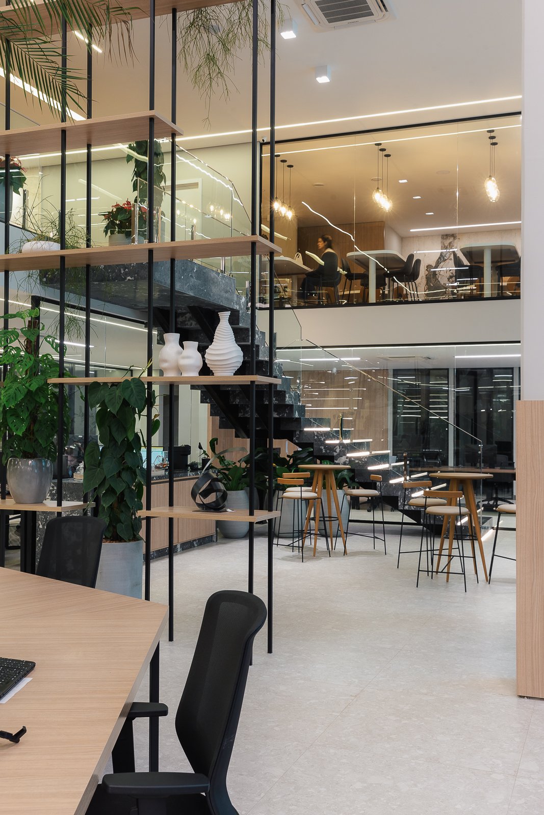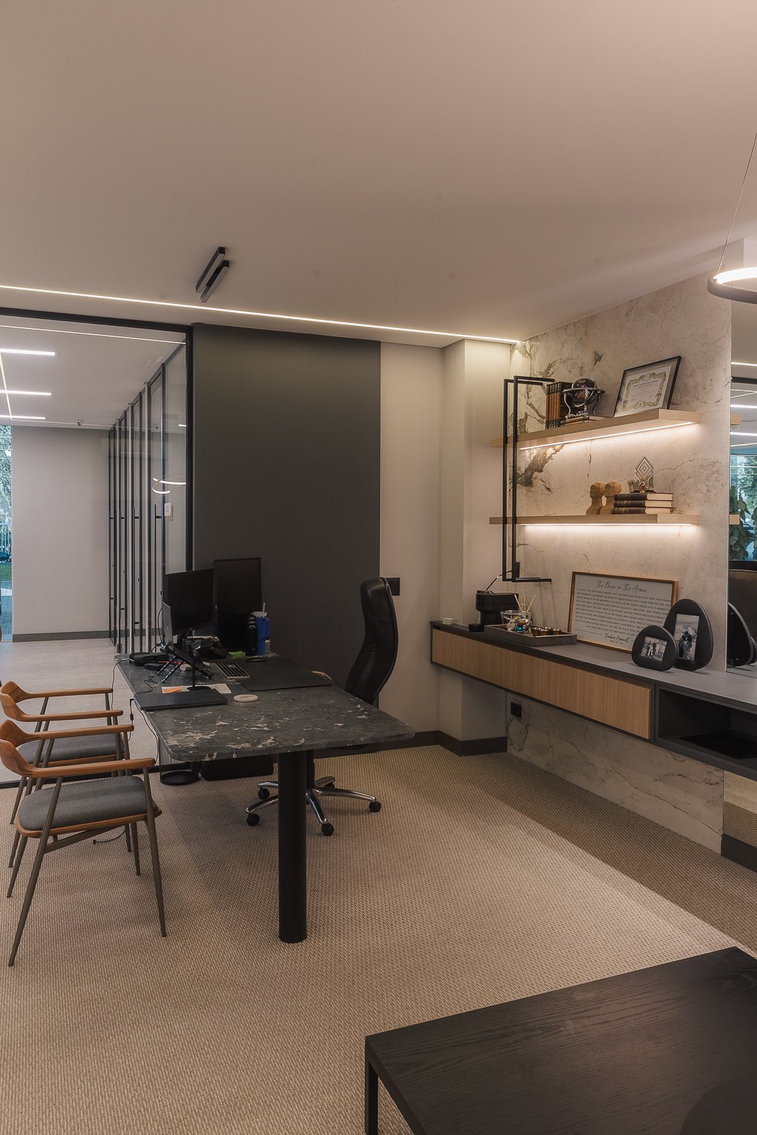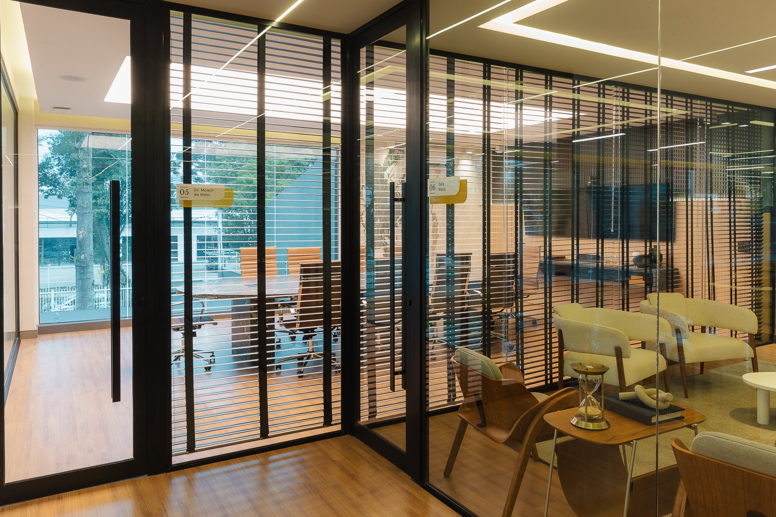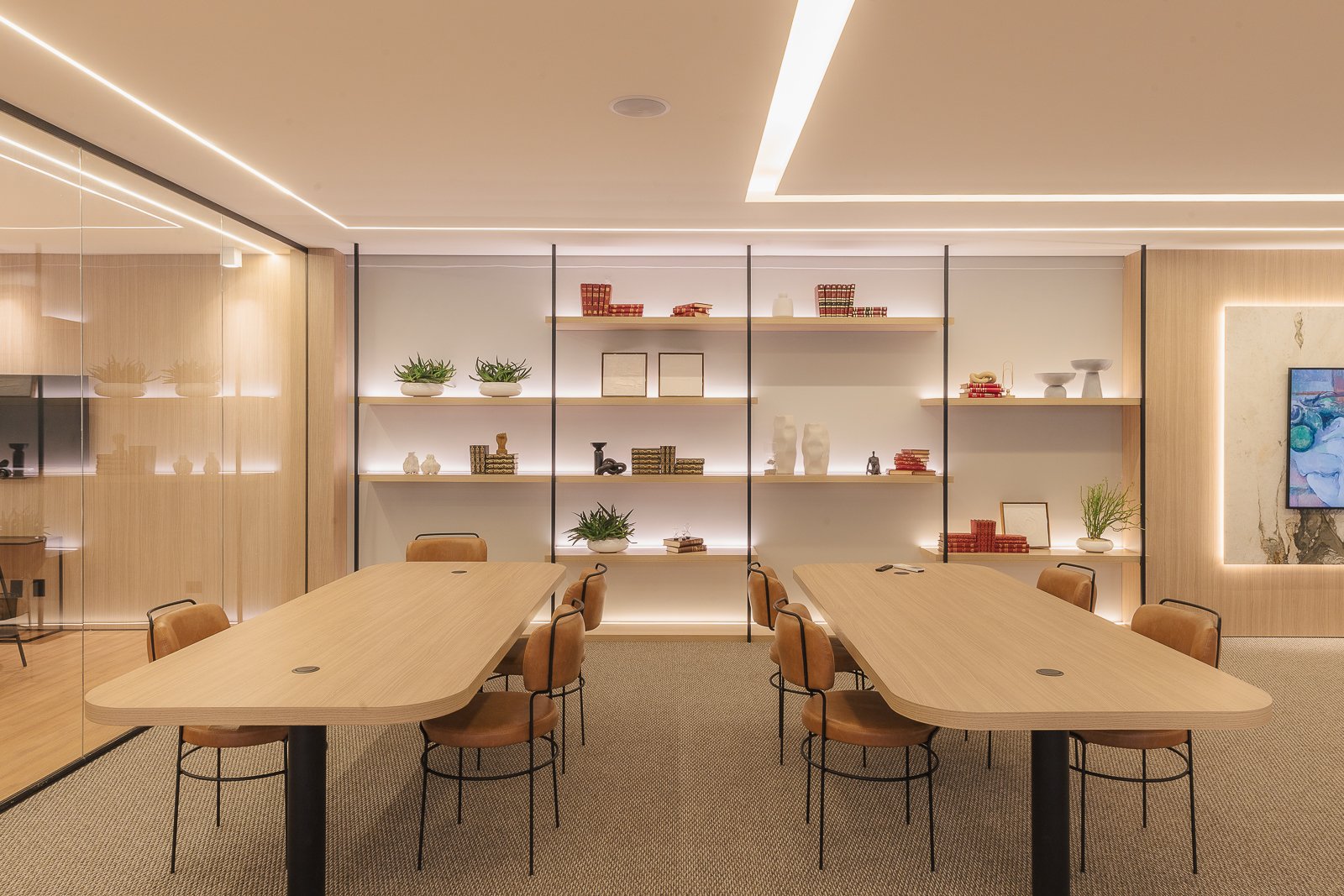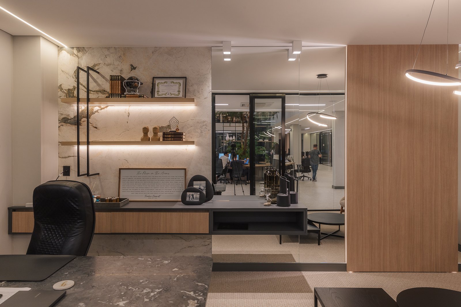 O projeto da nova sede do @meloadvogados.associados combina design biofílico e funcionalidade corporativa, refletindo inovação, confiança e bem-estar. A integração com a natureza, através de plantas como palmeiras e áreas envidraçadas que maximizam a luz natural, cria um ambiente agradável e reduz o estresse. O layout colaborativo, com mesas de formato orgânico e mobiliário que equilibra funcionalidade e estética, promove interação e harmonia entre os colaboradores em torno dos elementos verdes.