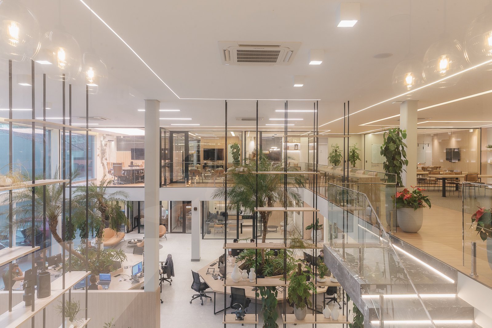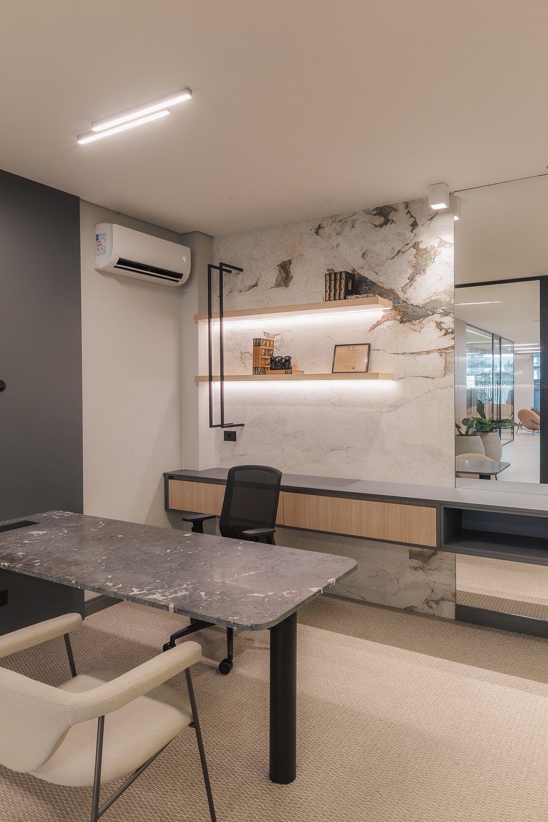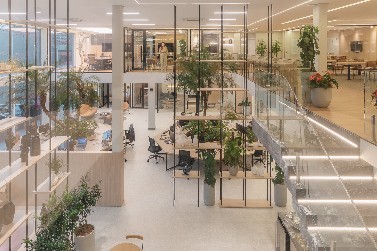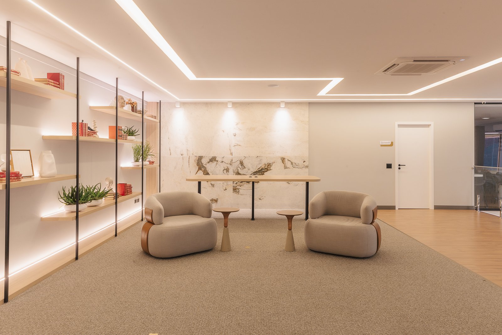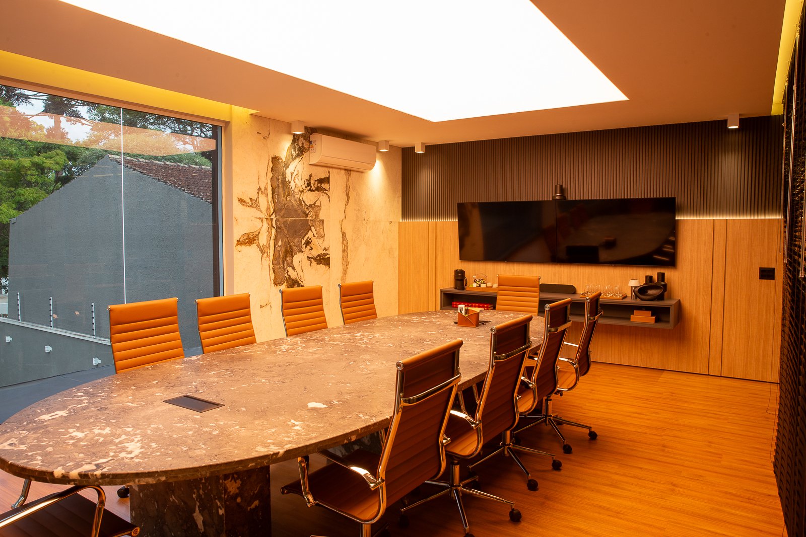 O projeto da nova sede do @meloadvogados.associados combina design biofílico e funcionalidade corporativa, refletindo inovação, confiança e bem-estar. A integração com a natureza, através de plantas como palmeiras e áreas envidraçadas que maximizam a luz natural, cria um ambiente agradável e reduz o estresse. O layout colaborativo, com mesas de formato orgânico e mobiliário que equilibra funcionalidade e estética, promove interação e harmonia entre os colaboradores em torno dos elementos verdes.