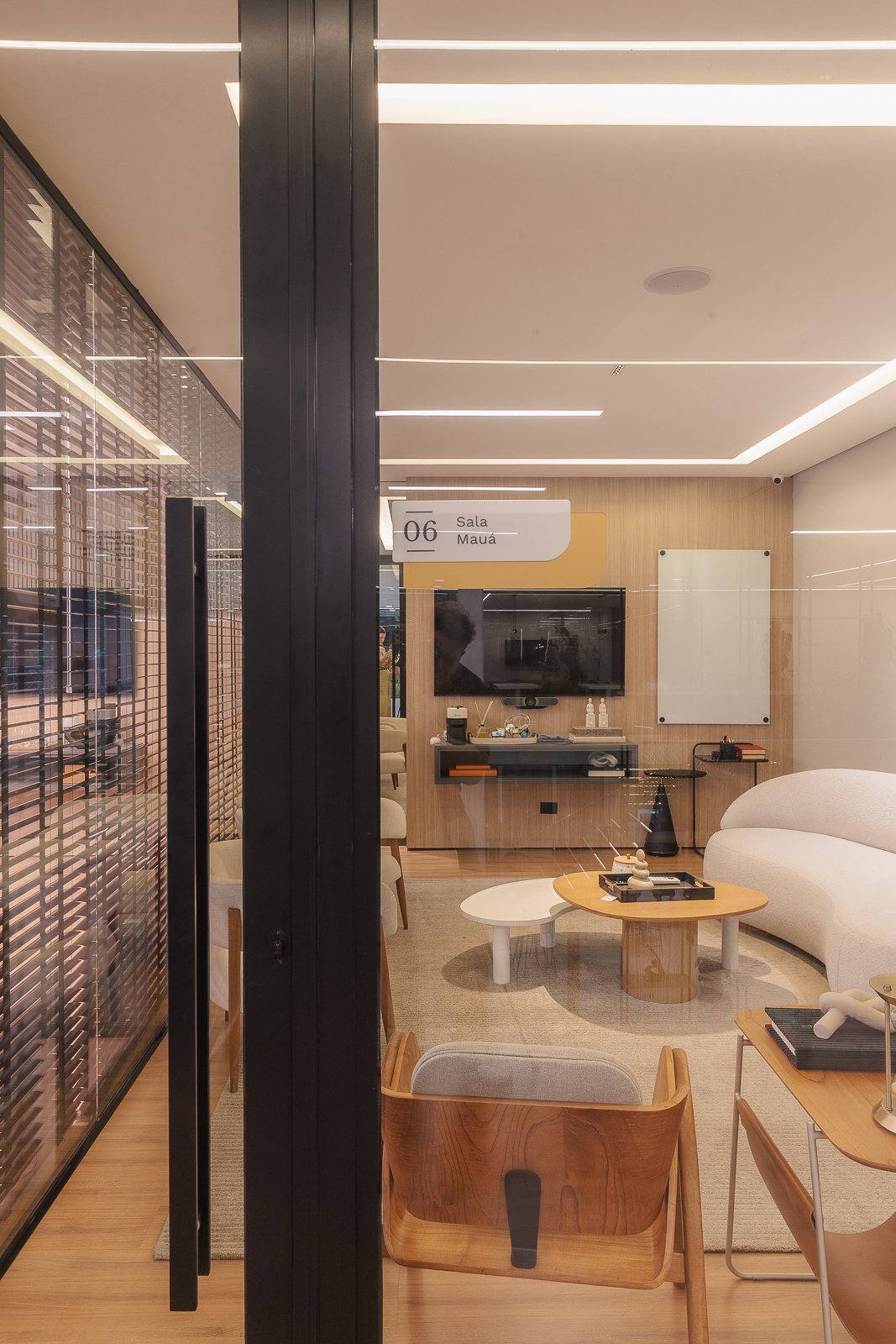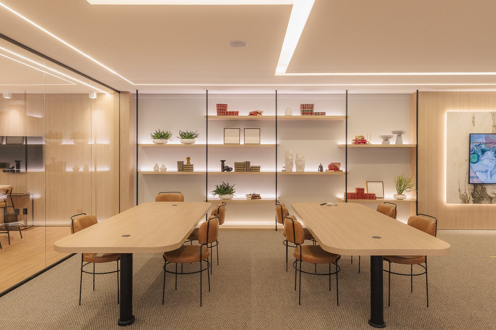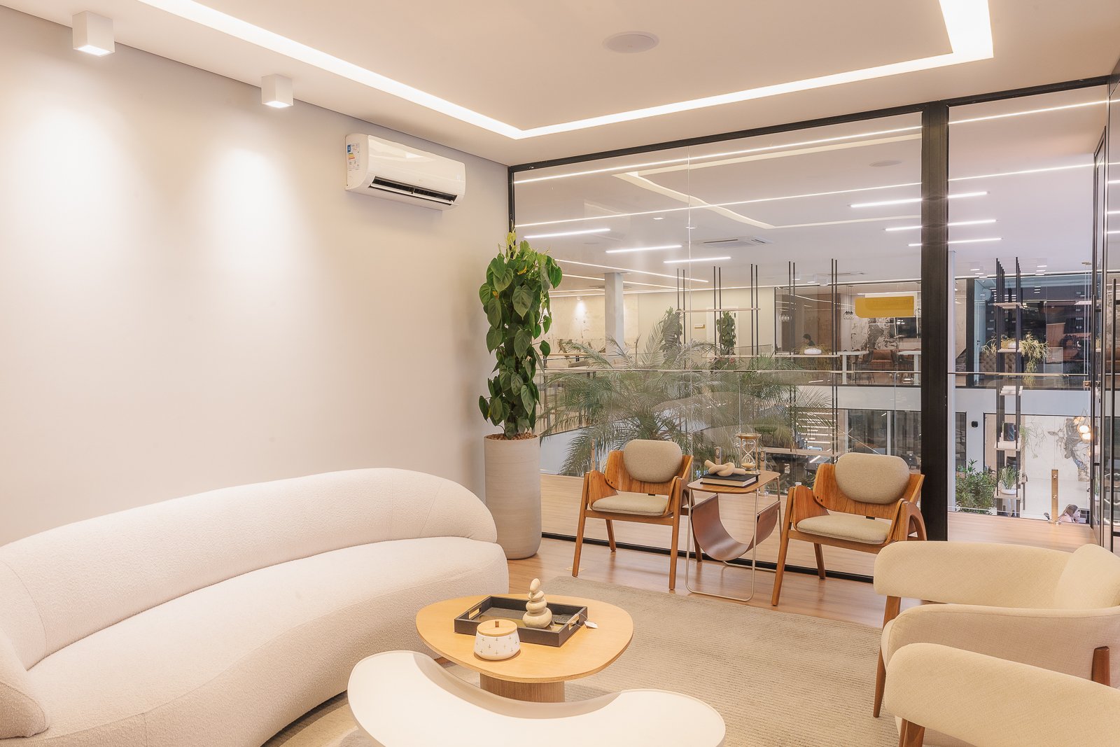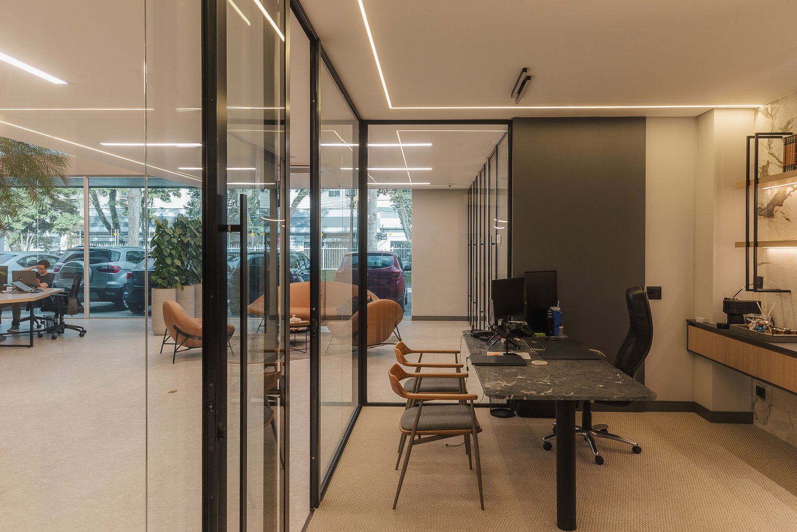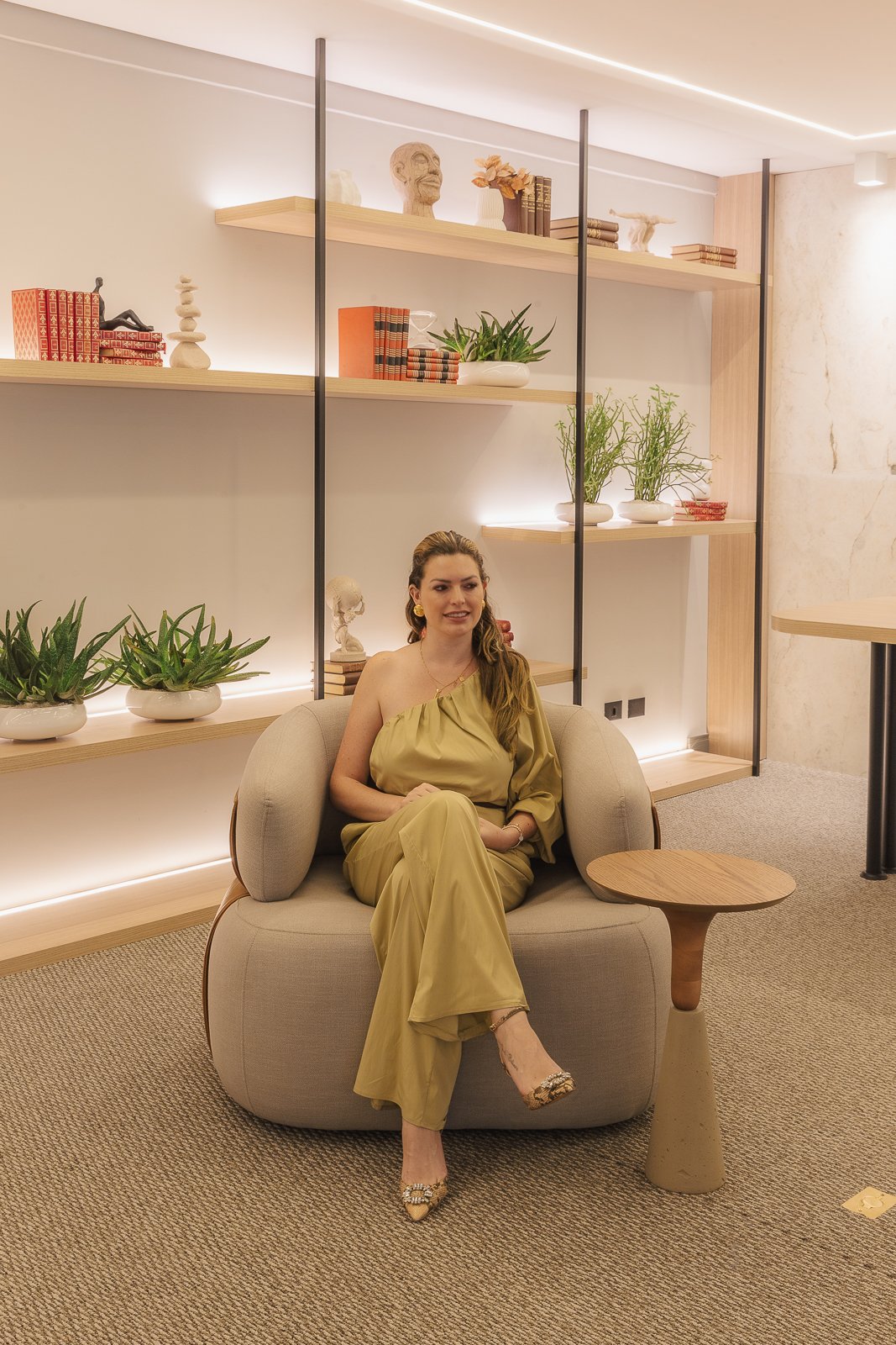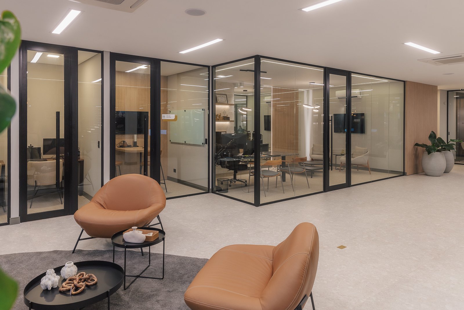 O projeto da nova sede do @meloadvogados.associados combina design biofílico e funcionalidade corporativa, refletindo inovação, confiança e bem-estar. A integração com a natureza, através de plantas como palmeiras e áreas envidraçadas que maximizam a luz natural, cria um ambiente agradável e reduz o estresse. O layout colaborativo, com mesas de formato orgânico e mobiliário que equilibra funcionalidade e estética, promove interação e harmonia entre os colaboradores em torno dos elementos verdes.