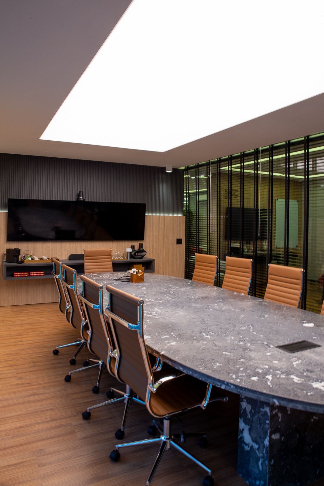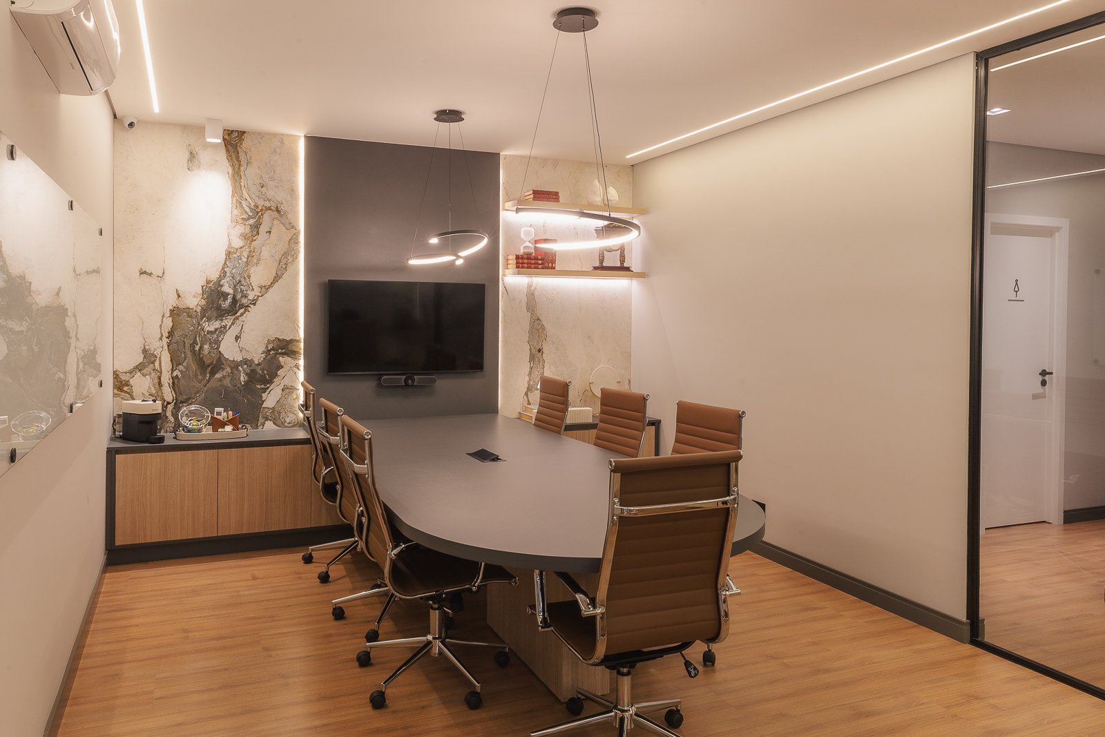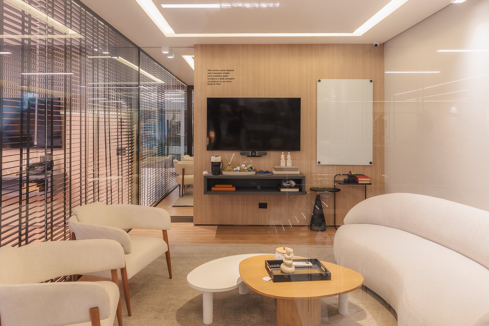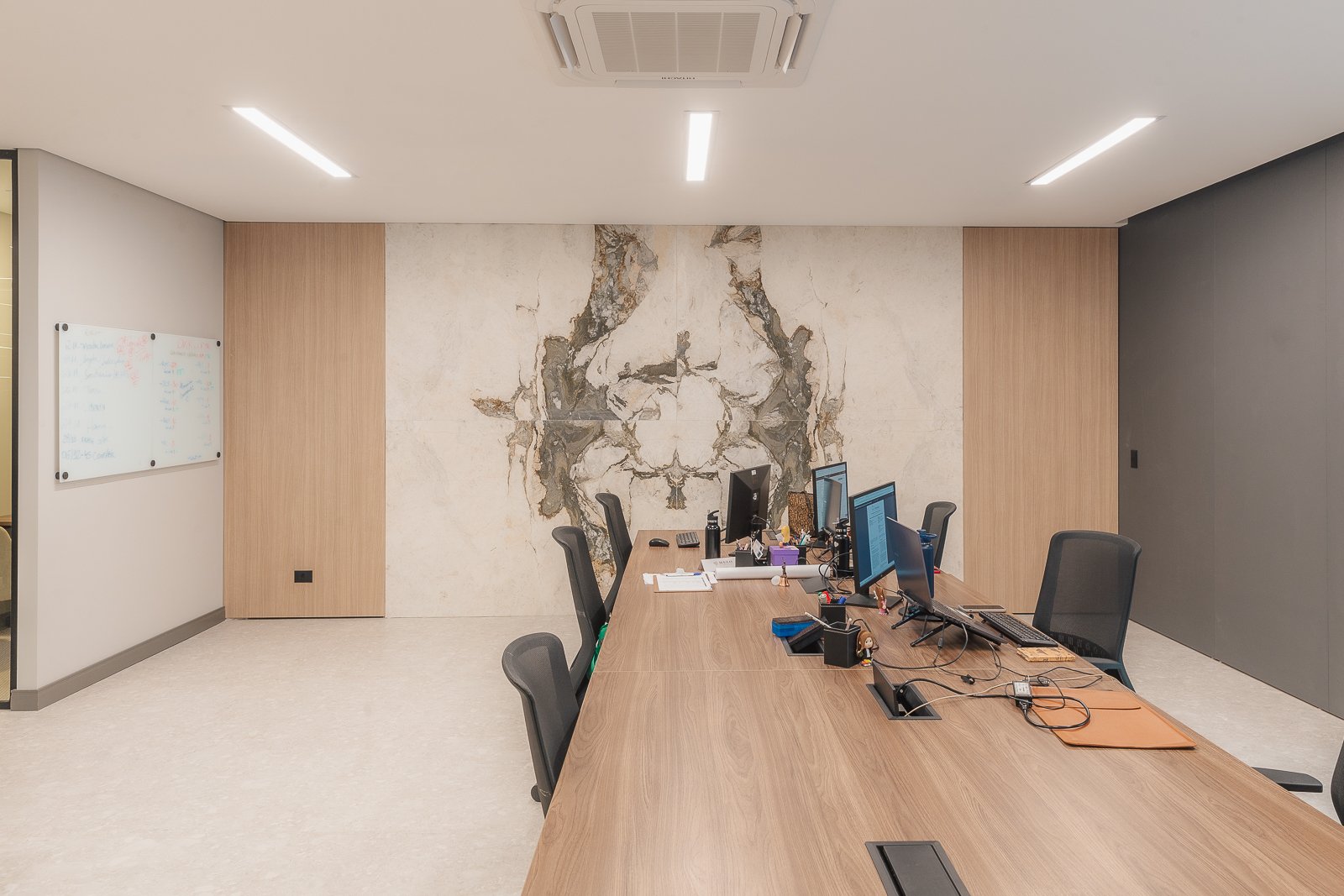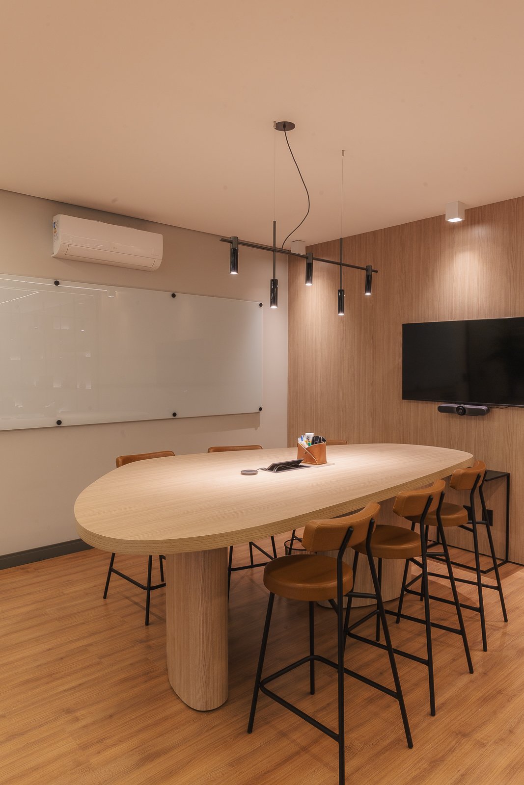 O projeto da nova sede do @meloadvogados.associados combina design biofílico e funcionalidade corporativa, refletindo inovação, confiança e bem-estar. A integração com a natureza, através de plantas como palmeiras e áreas envidraçadas que maximizam a luz natural, cria um ambiente agradável e reduz o estresse. O layout colaborativo, com mesas de formato orgânico e mobiliário que equilibra funcionalidade e estética, promove interação e harmonia entre os colaboradores em torno dos elementos verdes.