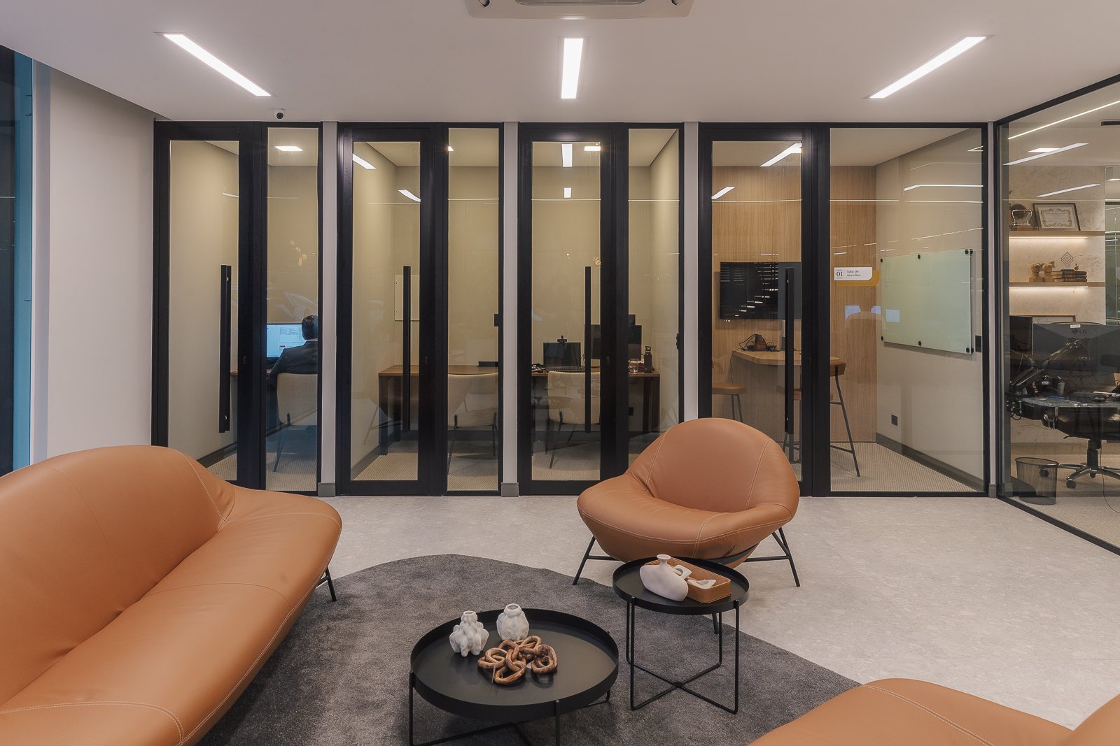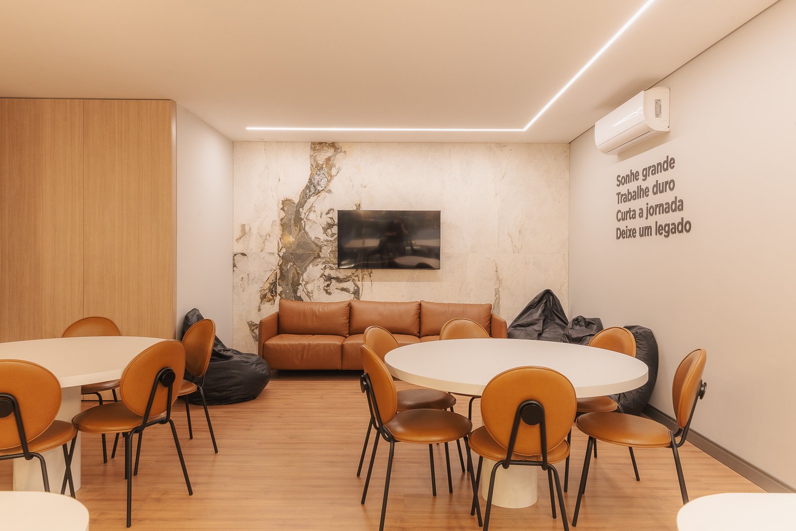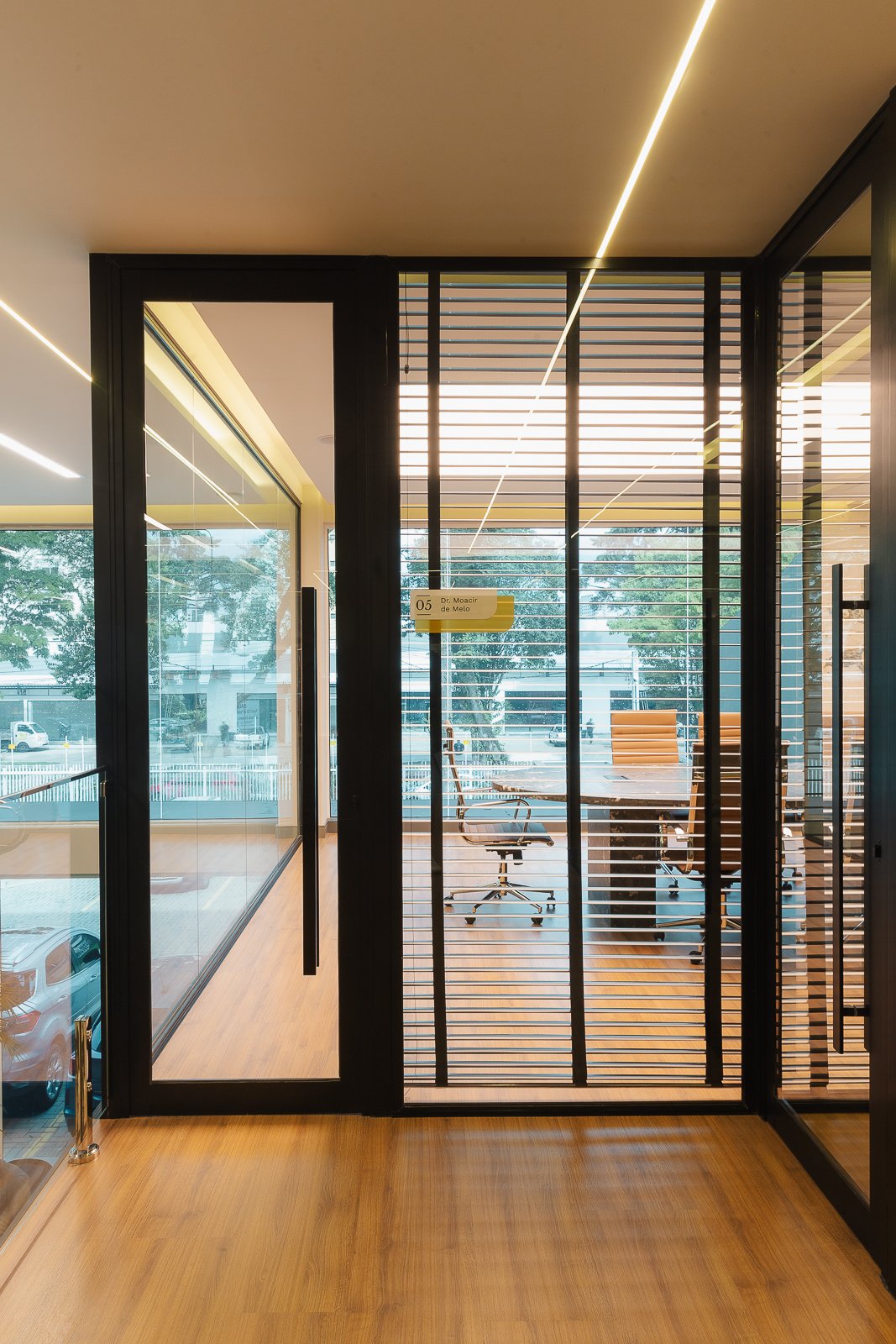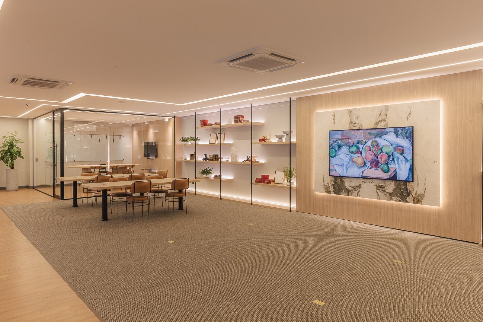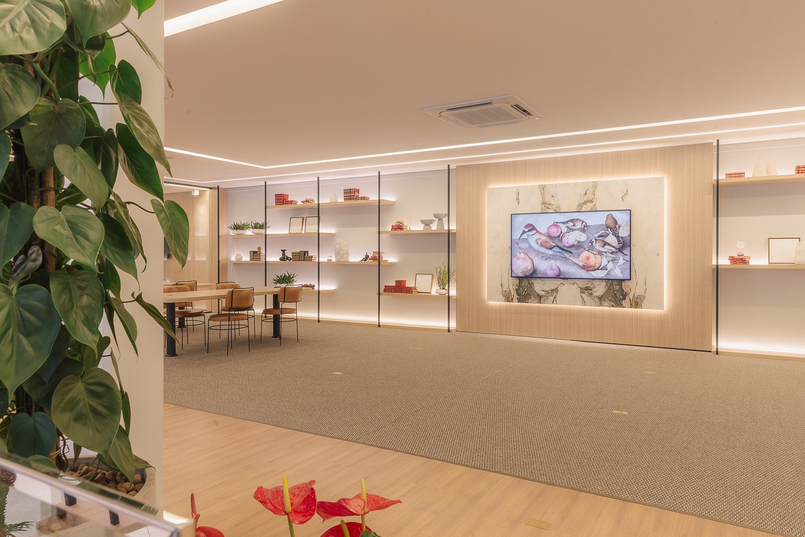 O projeto da nova sede do @meloadvogados.associados combina design biofílico e funcionalidade corporativa, refletindo inovação, confiança e bem-estar. A integração com a natureza, através de plantas como palmeiras e áreas envidraçadas que maximizam a luz natural, cria um ambiente agradável e reduz o estresse. O layout colaborativo, com mesas de formato orgânico e mobiliário que equilibra funcionalidade e estética, promove interação e harmonia entre os colaboradores em torno dos elementos verdes.