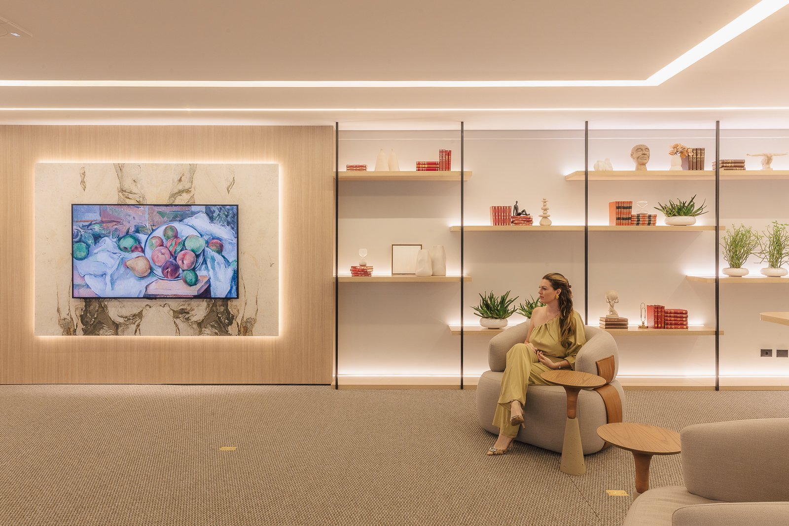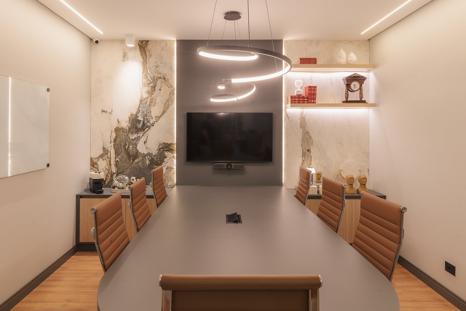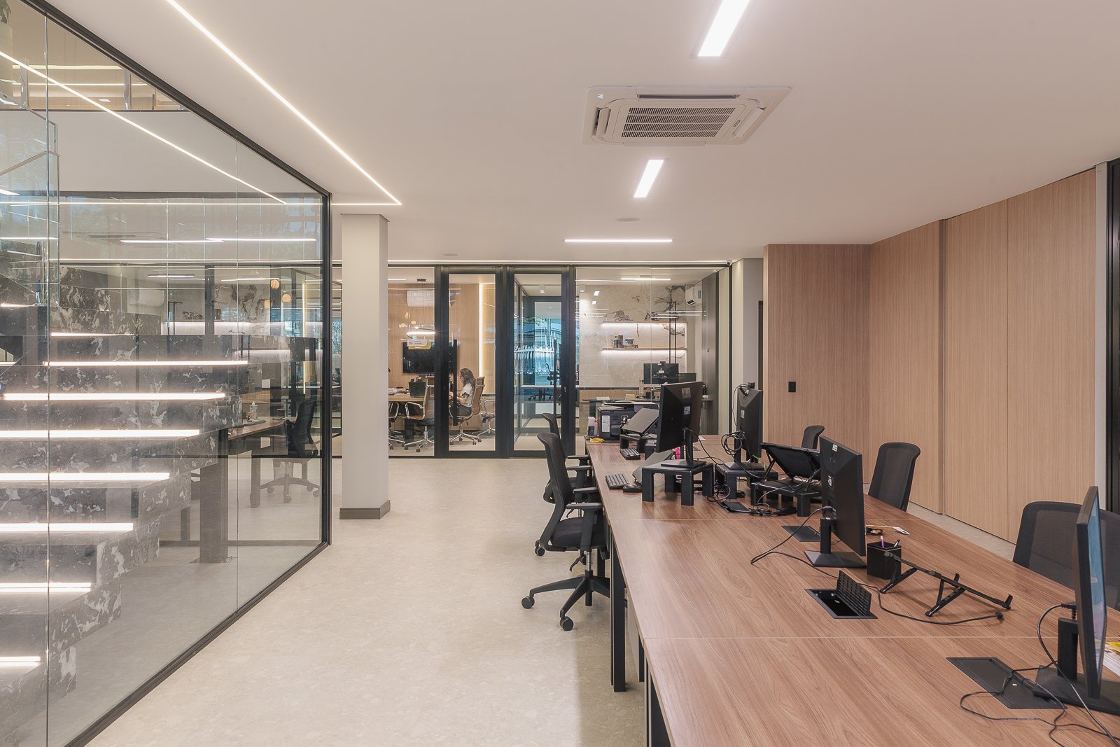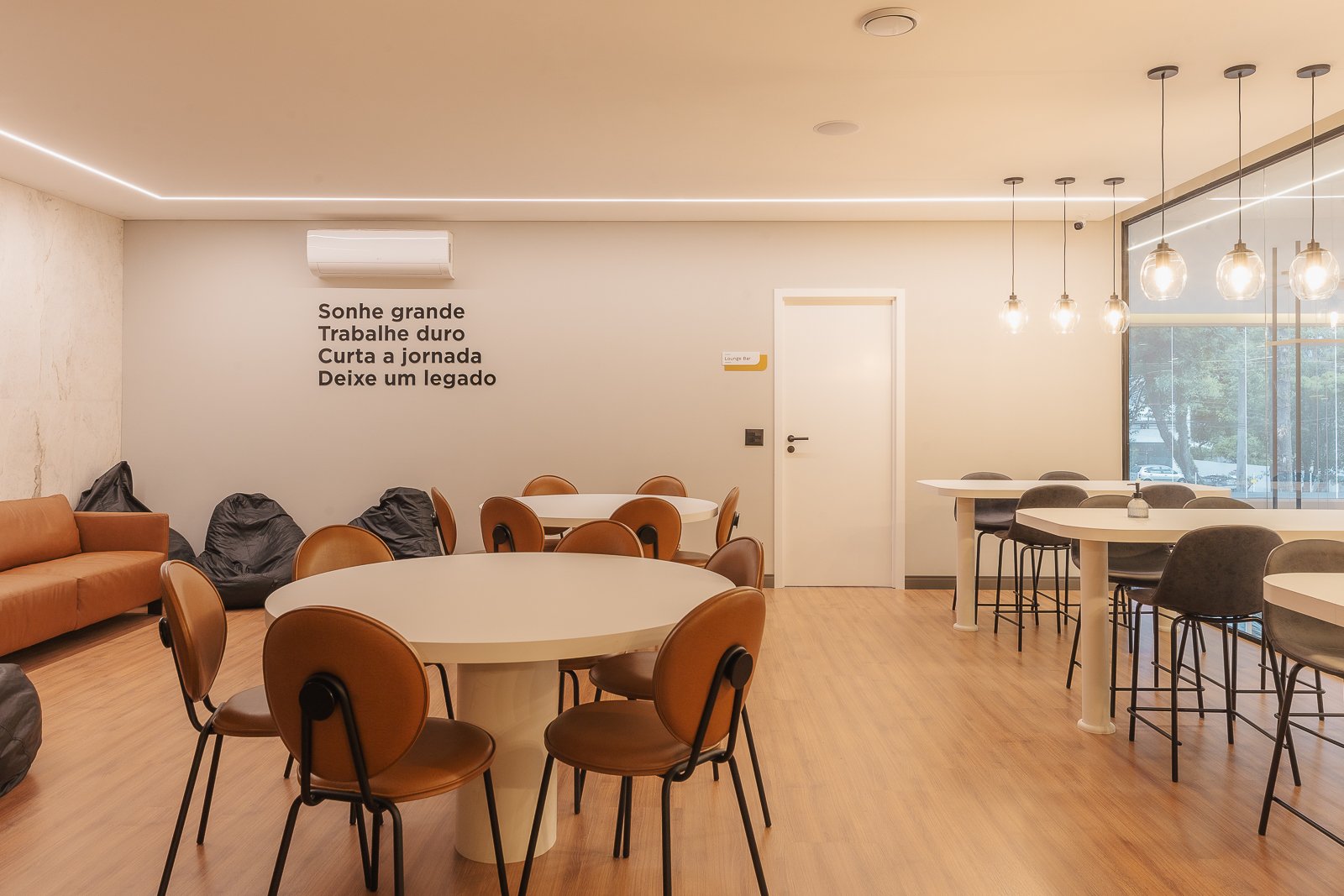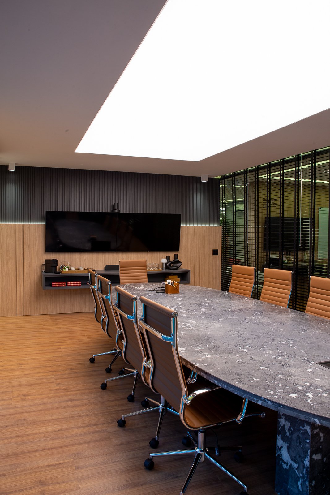 O projeto da nova sede do @meloadvogados.associados combina design biofílico e funcionalidade corporativa, refletindo inovação, confiança e bem-estar. A integração com a natureza, através de plantas como palmeiras e áreas envidraçadas que maximizam a luz natural, cria um ambiente agradável e reduz o estresse. O layout colaborativo, com mesas de formato orgânico e mobiliário que equilibra funcionalidade e estética, promove interação e harmonia entre os colaboradores em torno dos elementos verdes.